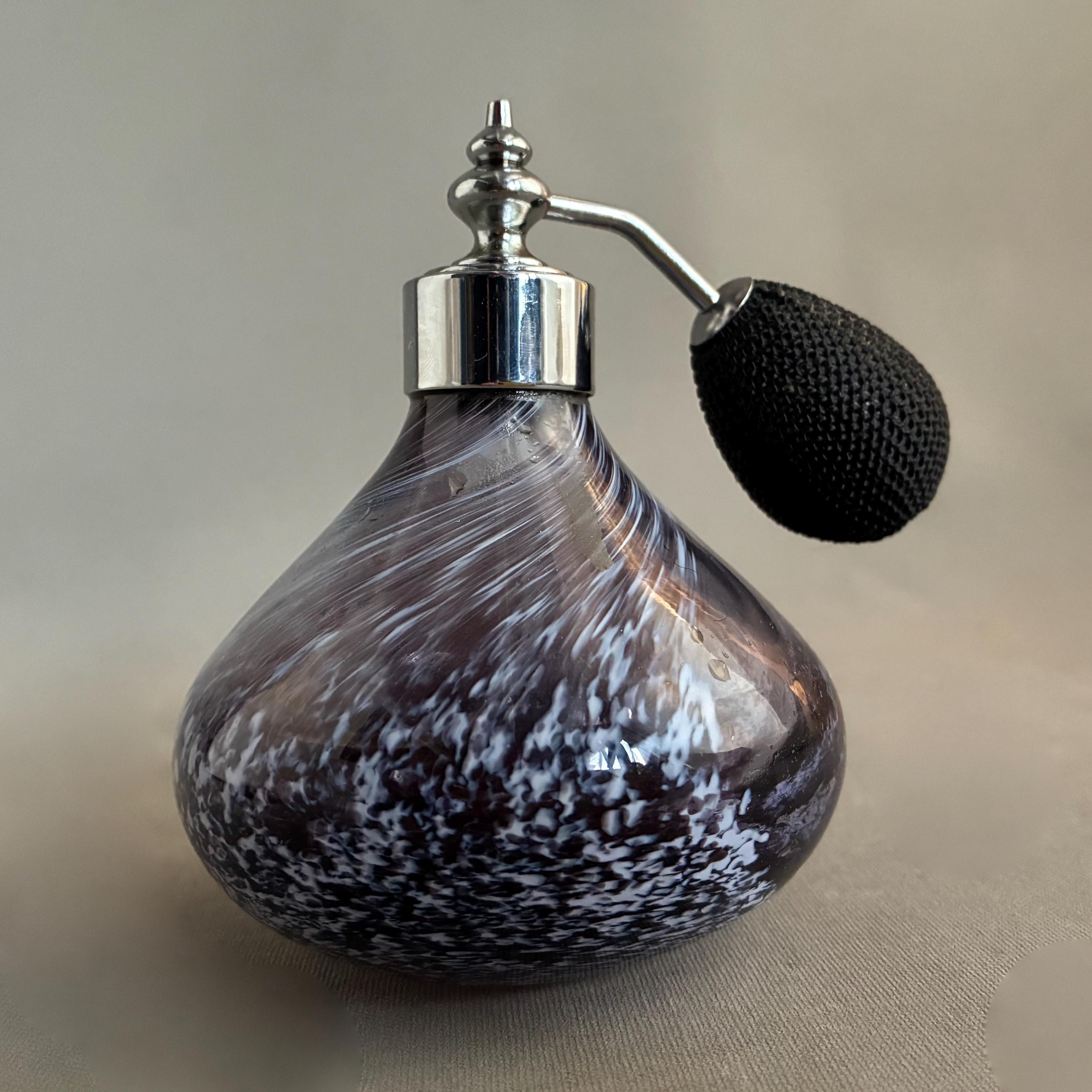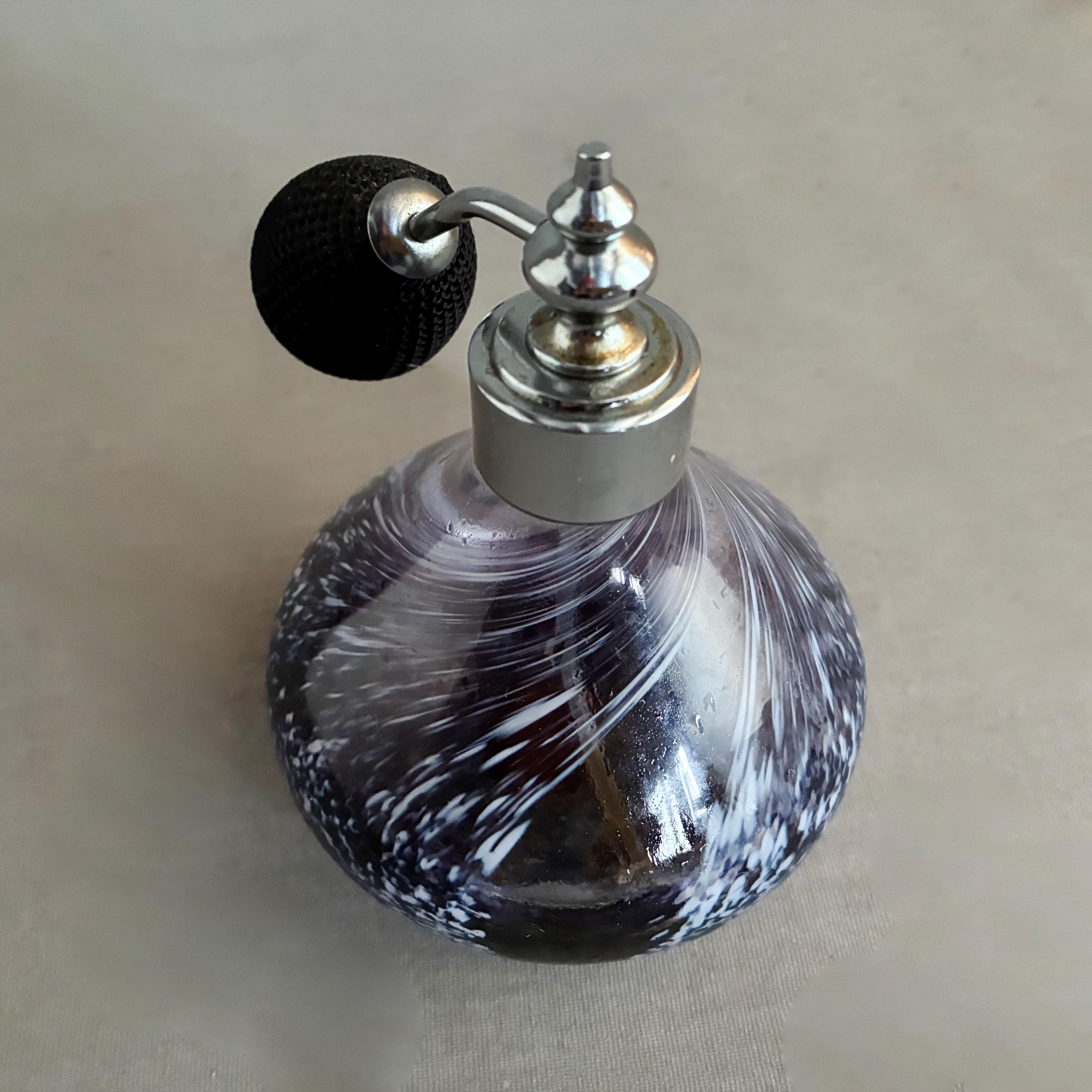 A vintage Caithness Glass perfume atomiser bottle featuring a dark purple/blue and white swirl or "speckled" design.