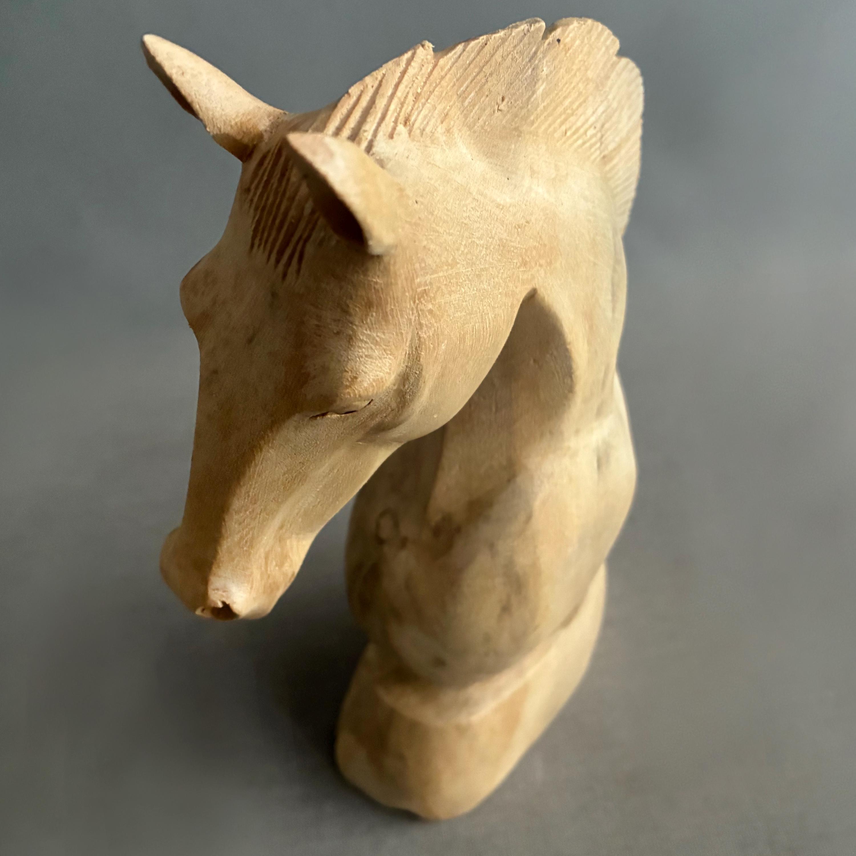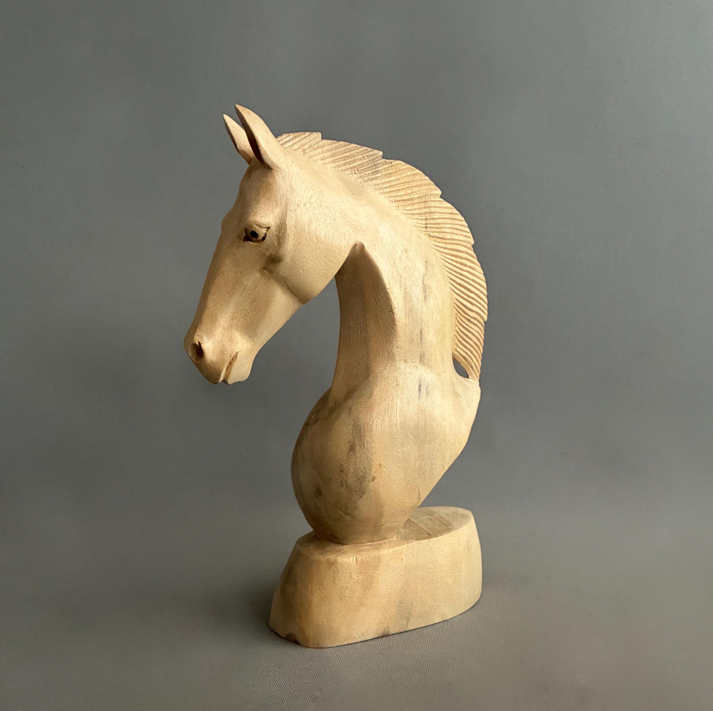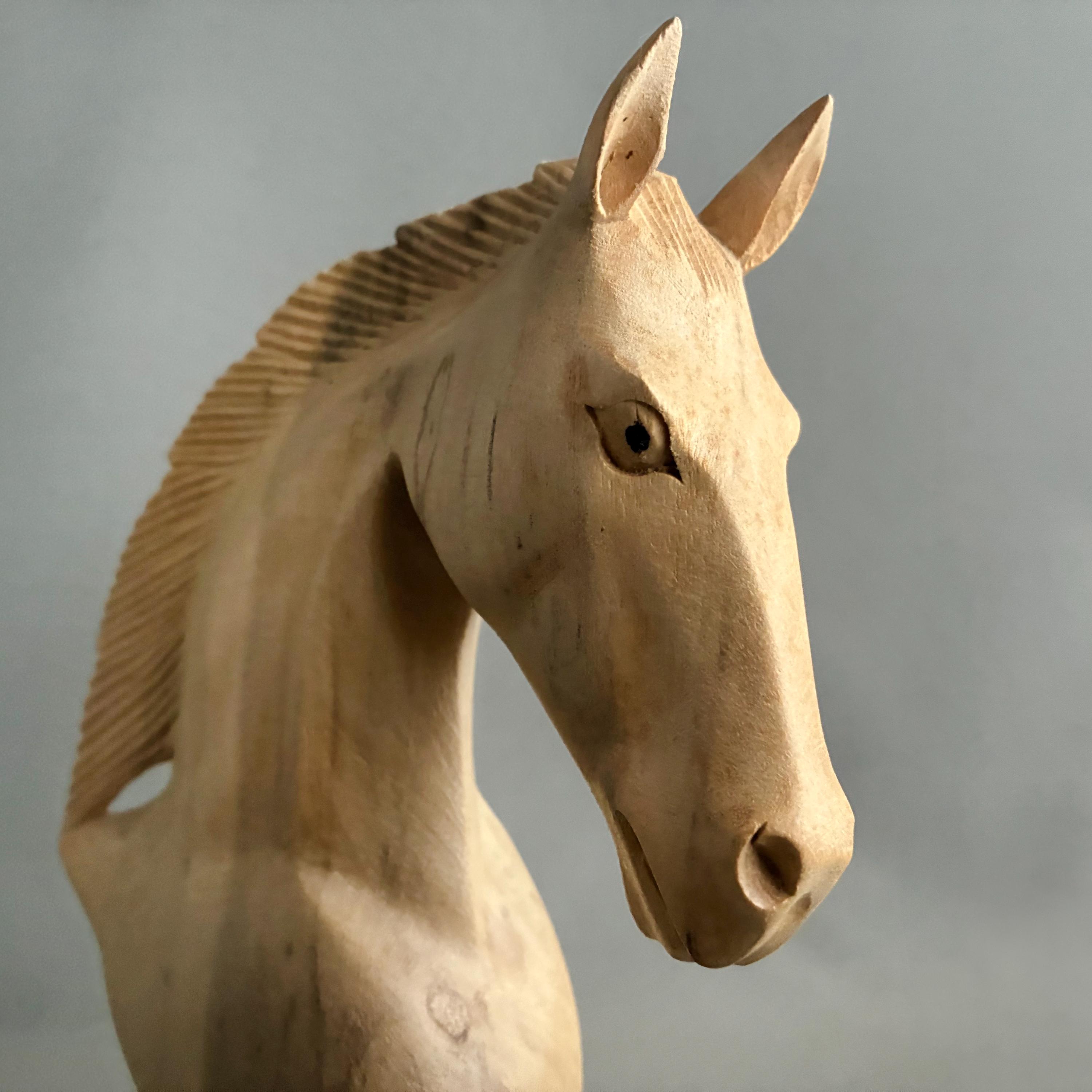A beautifully carved horse head. skillfully carved out of a light wood - it is unfinished as in no varnish or wax. A lovely item to display or gift - this being year of the horse