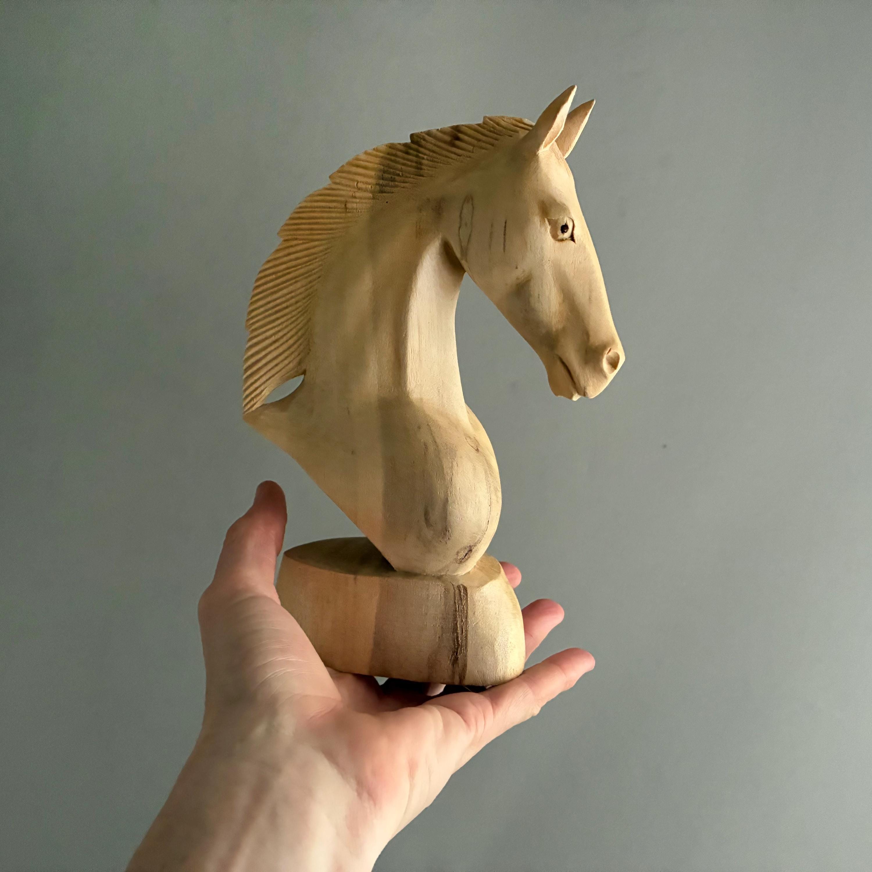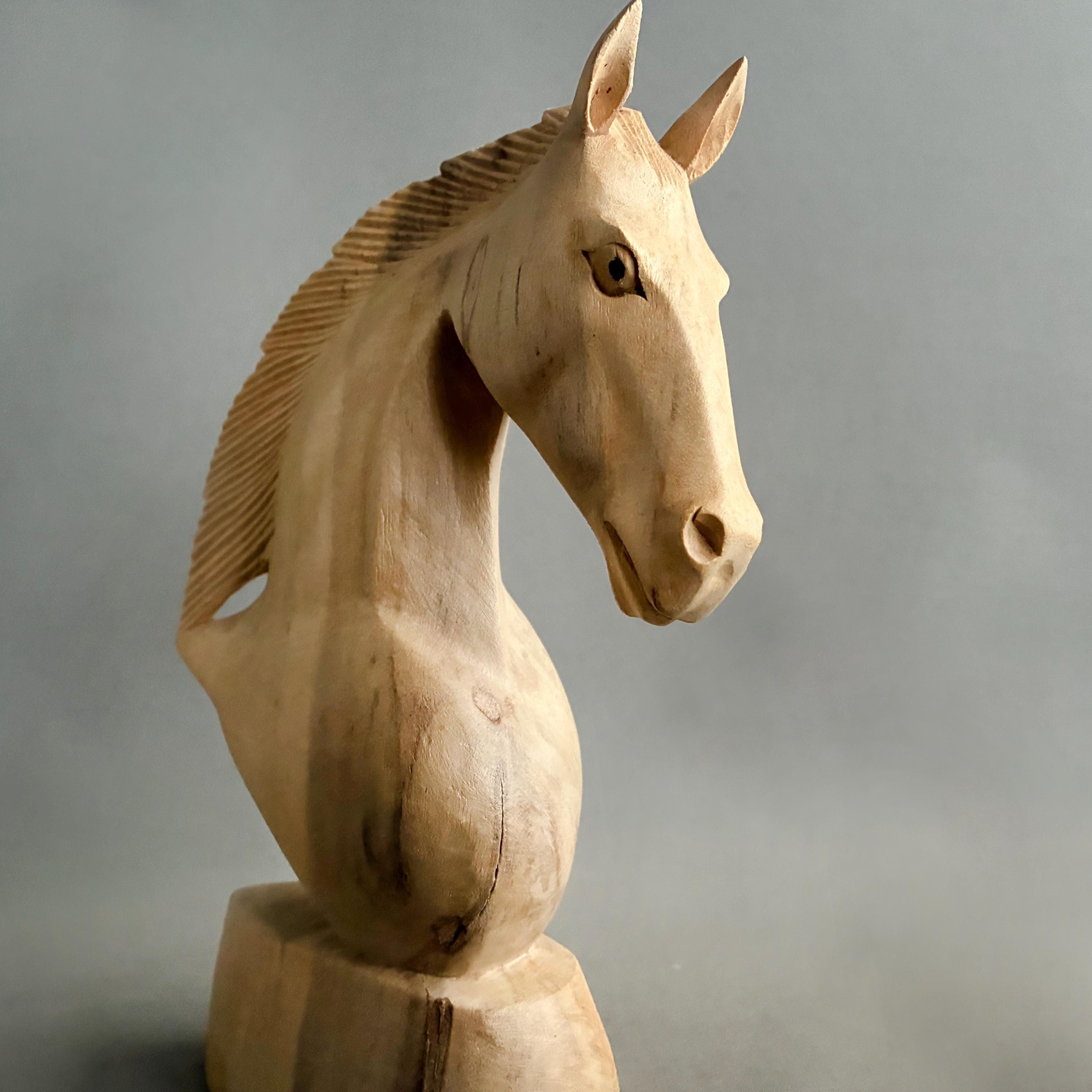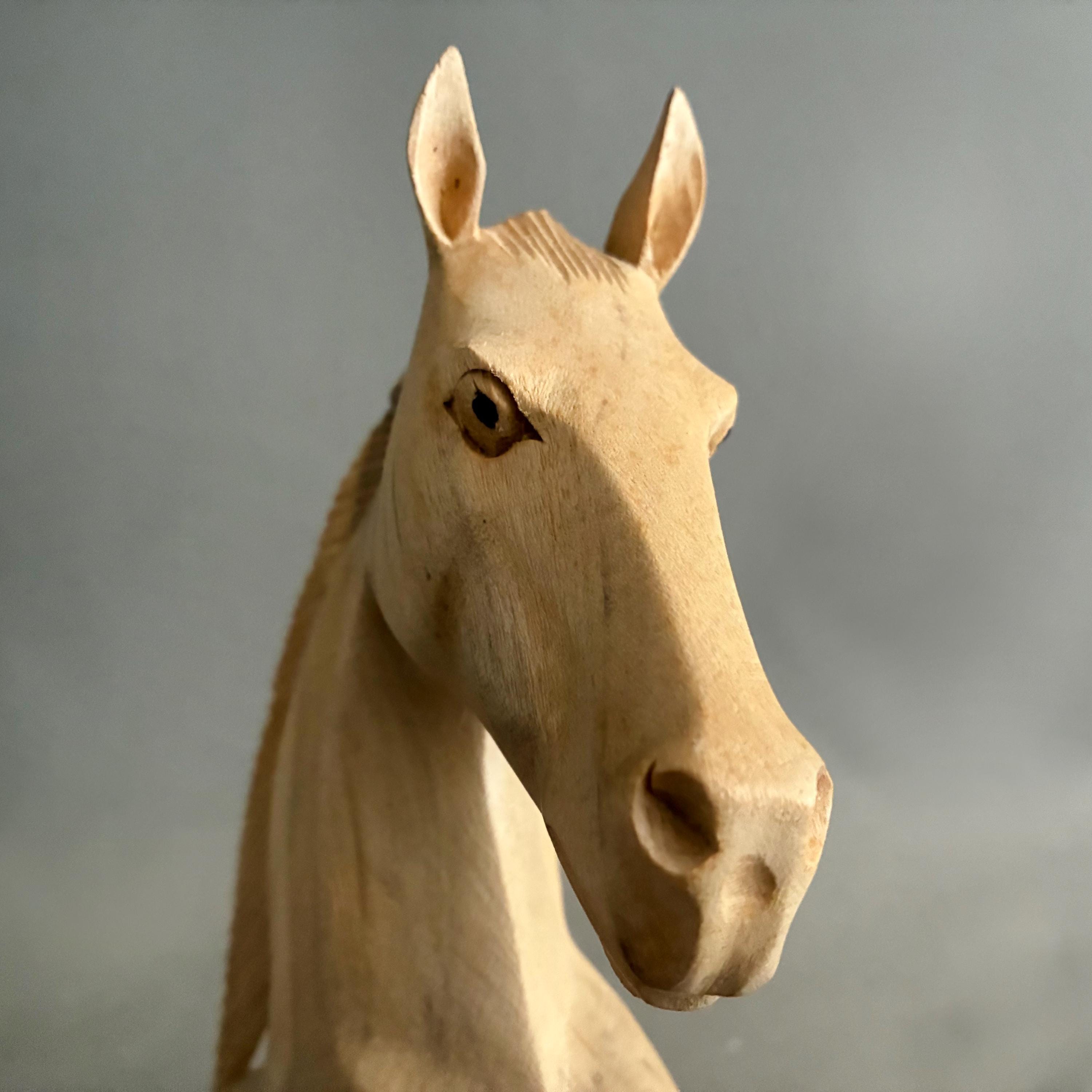 A beautifully carved horse head. skillfully carved out of a light wood - it is unfinished as in no varnish or wax. A lovely item to display or gift - this being year of the horse