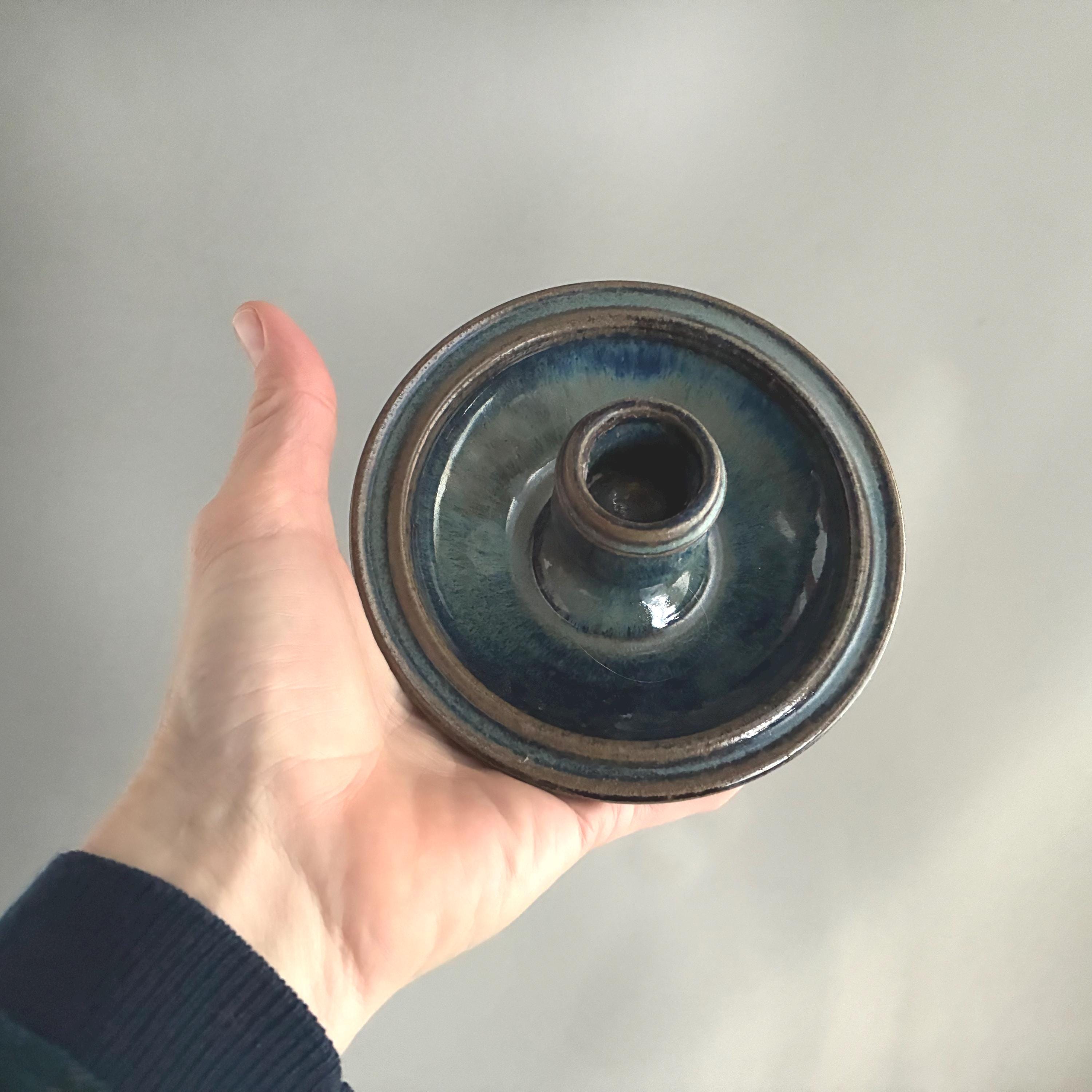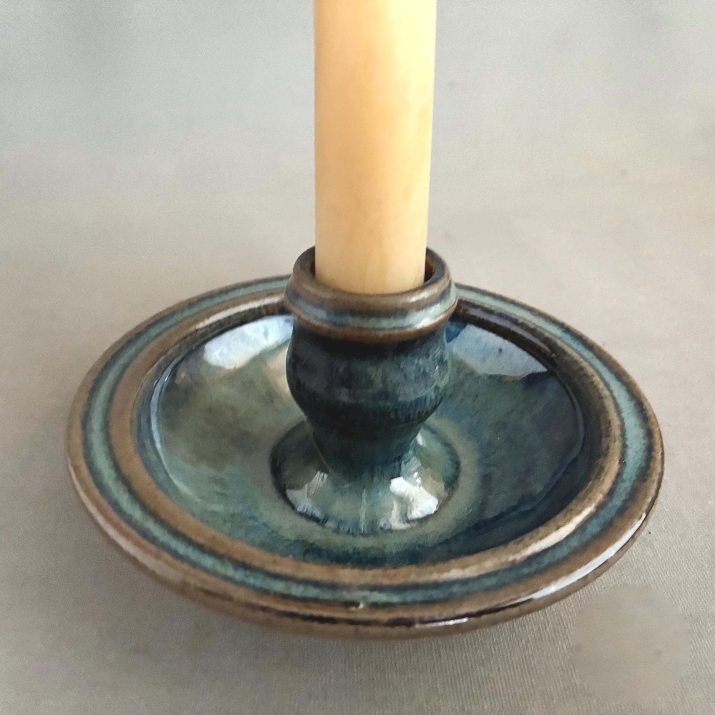 This is a beautiful made item with good weight in a lovely blue grey glaze. it fits a standard dinner candle. A quality item to gift or enjoy for a life time. Made in England. In perfect condition