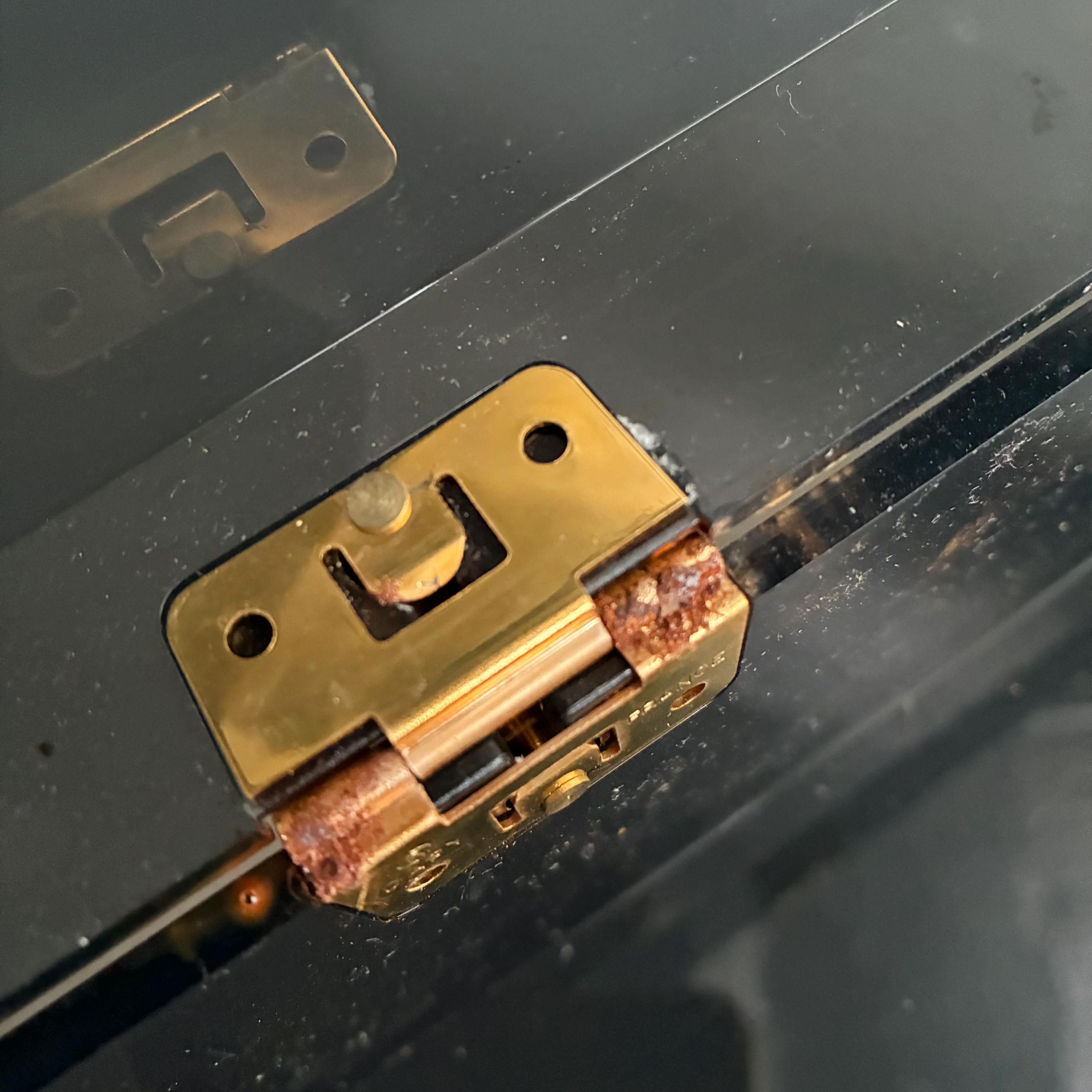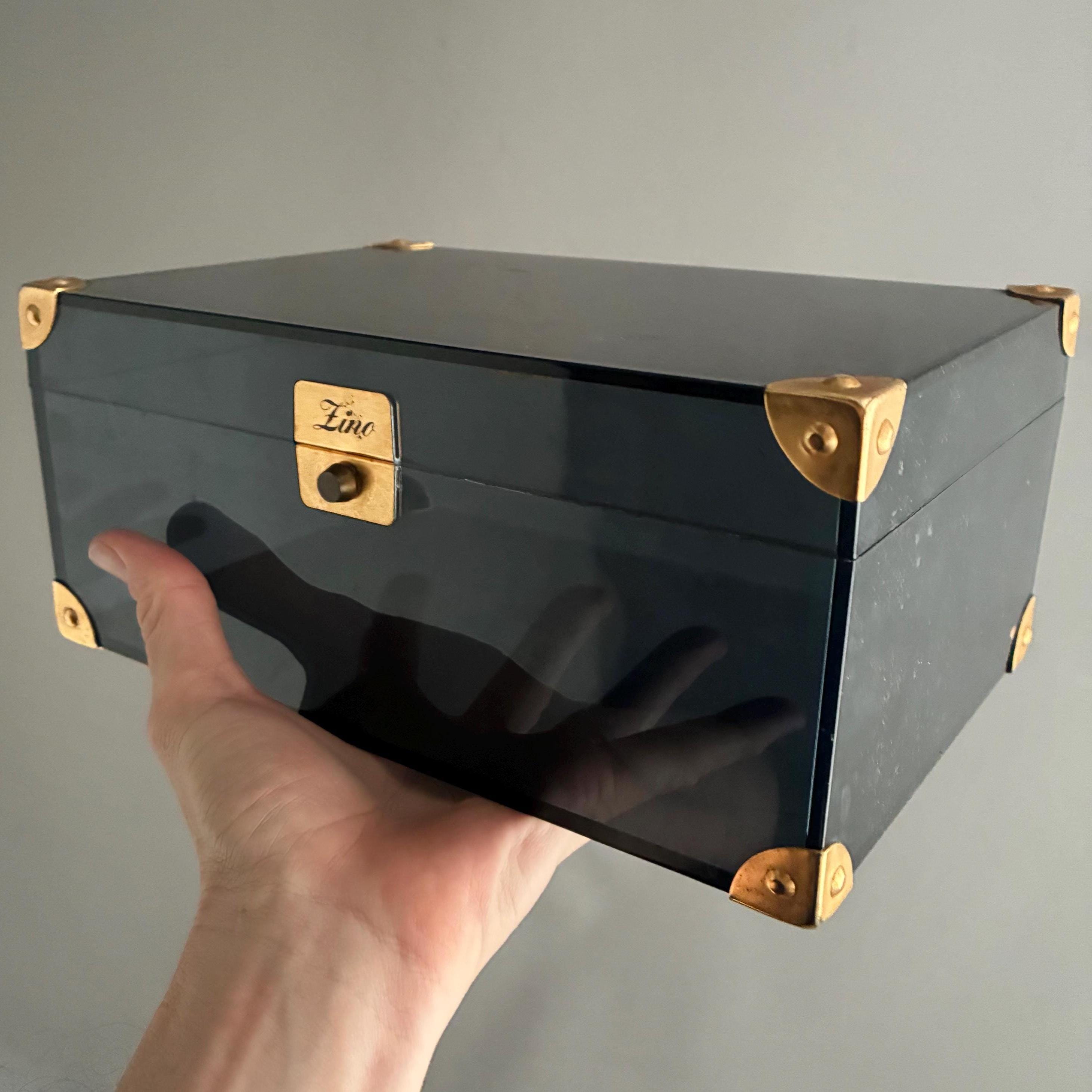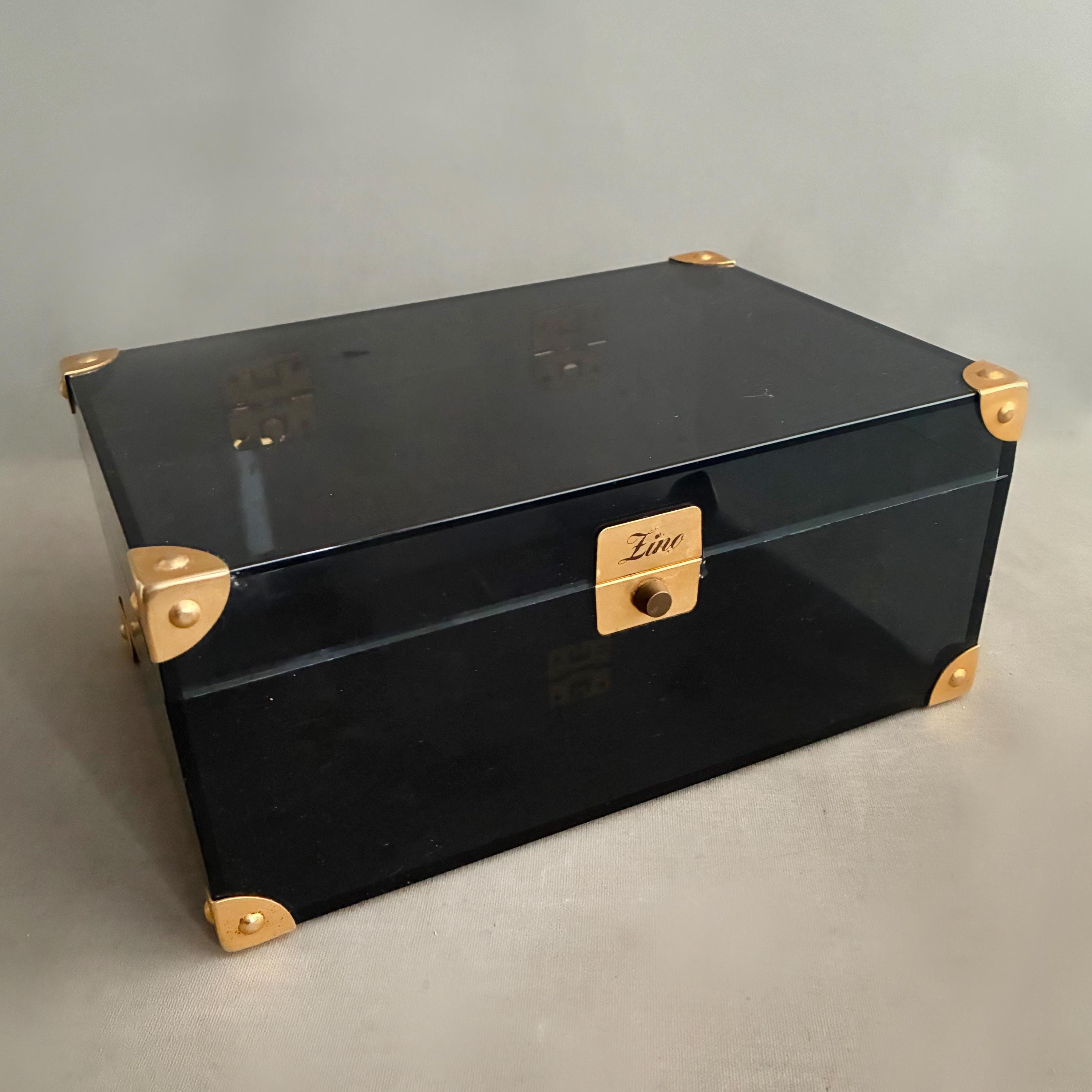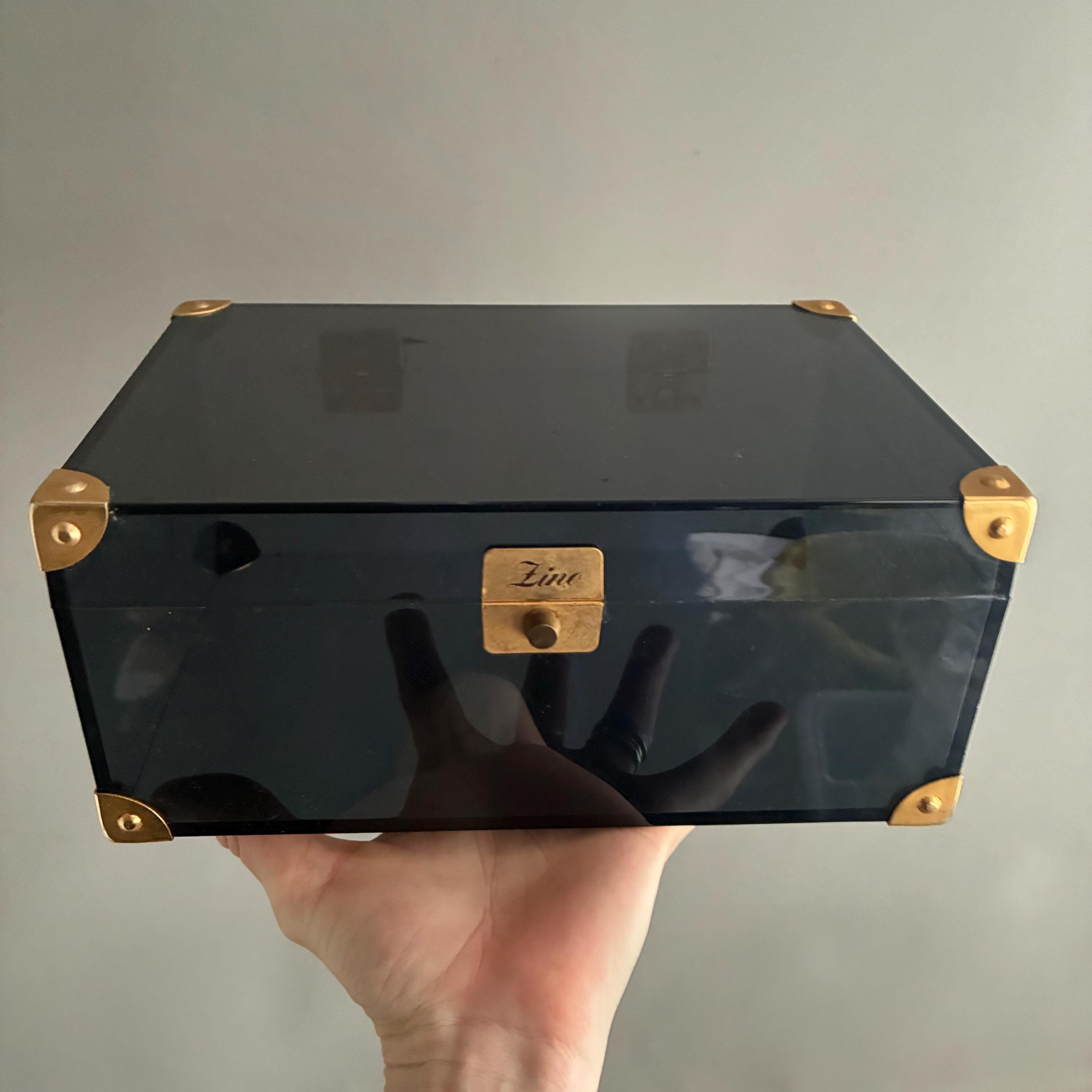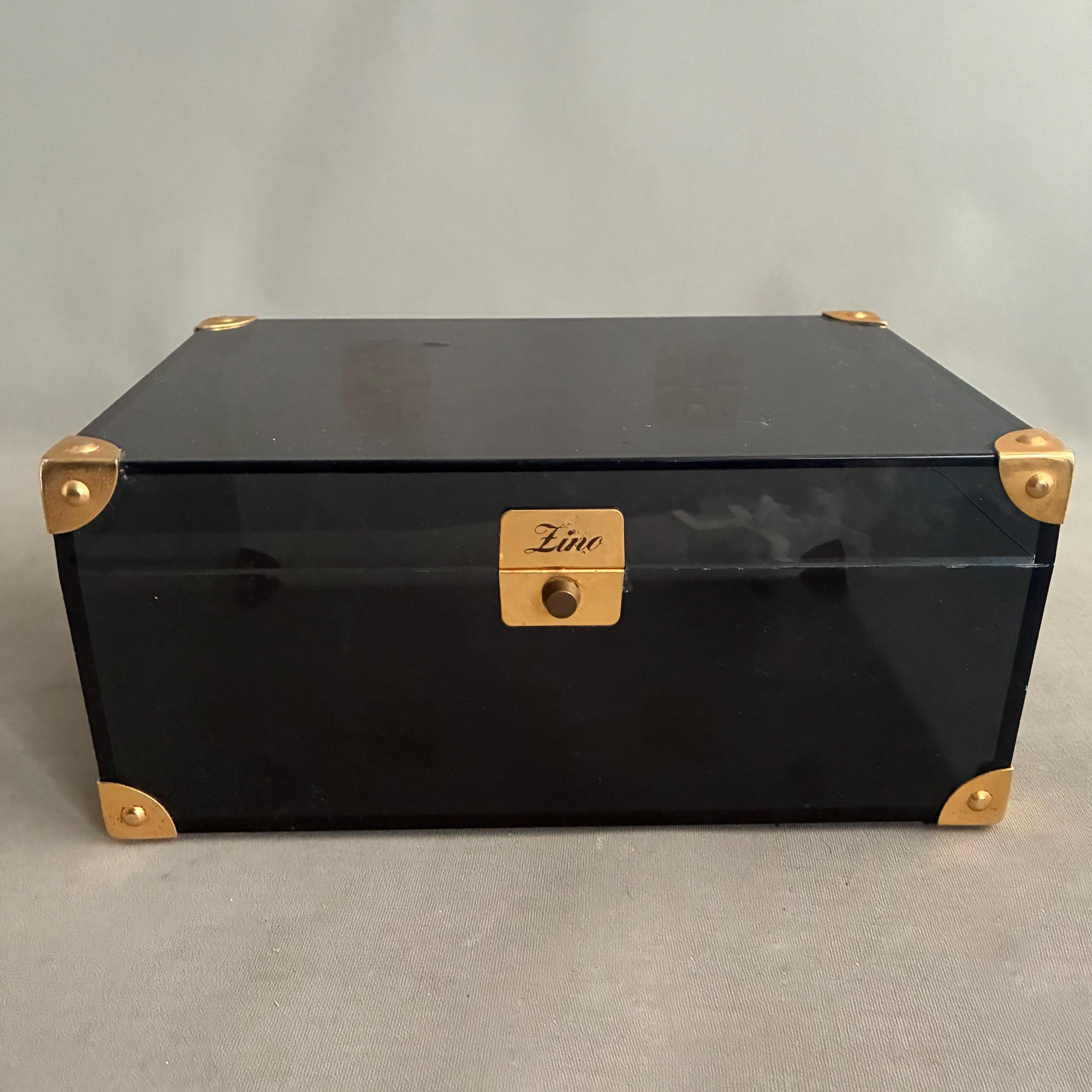 Genuine Davidoff Zino humidor in black smoke finish quality acrylic with quality brass fittings . The box dimensions are H110mm x W170mm x L250mm. Originally used to store cigars . It no longer has the humidifier tank that make it suitable for storing cigars .This would make a good jewellery box . A very cool looking box with many practical applications .Circa 1970s . One of the brass hinges is a bit rusted( see picture) but does not effect the movement and strength of the hinge . Made in France