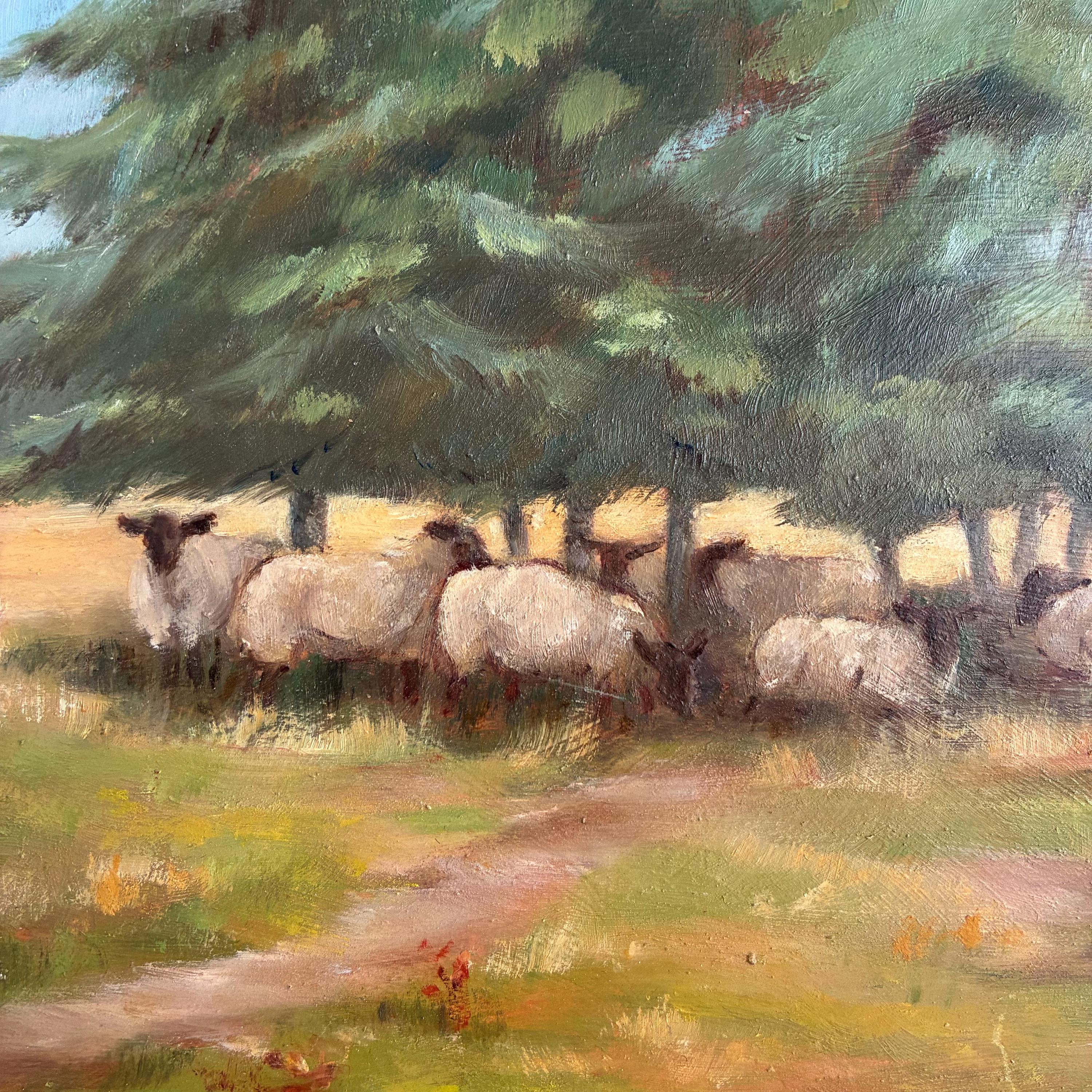 A charming little oil painting of sheep in a field under some trees in the shade. Signed P.R ( Pam Rawlins) titled In the shade -Chipperfield. Ready to hang