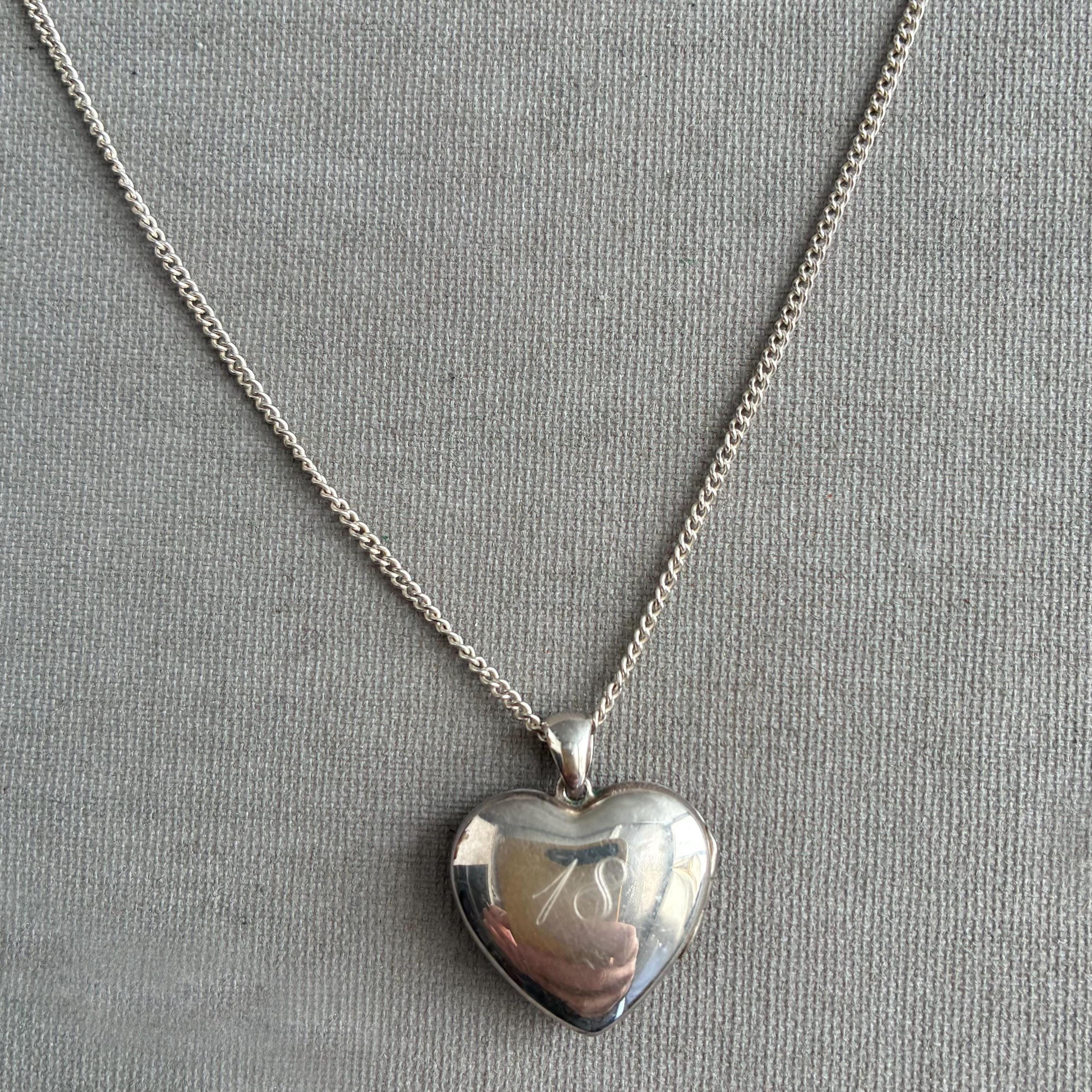 A little silver locket (925) with 18 engraved onto the heart . on a silver chain . It opens and holds a small picture in each side of the heart, supplied in a gift box