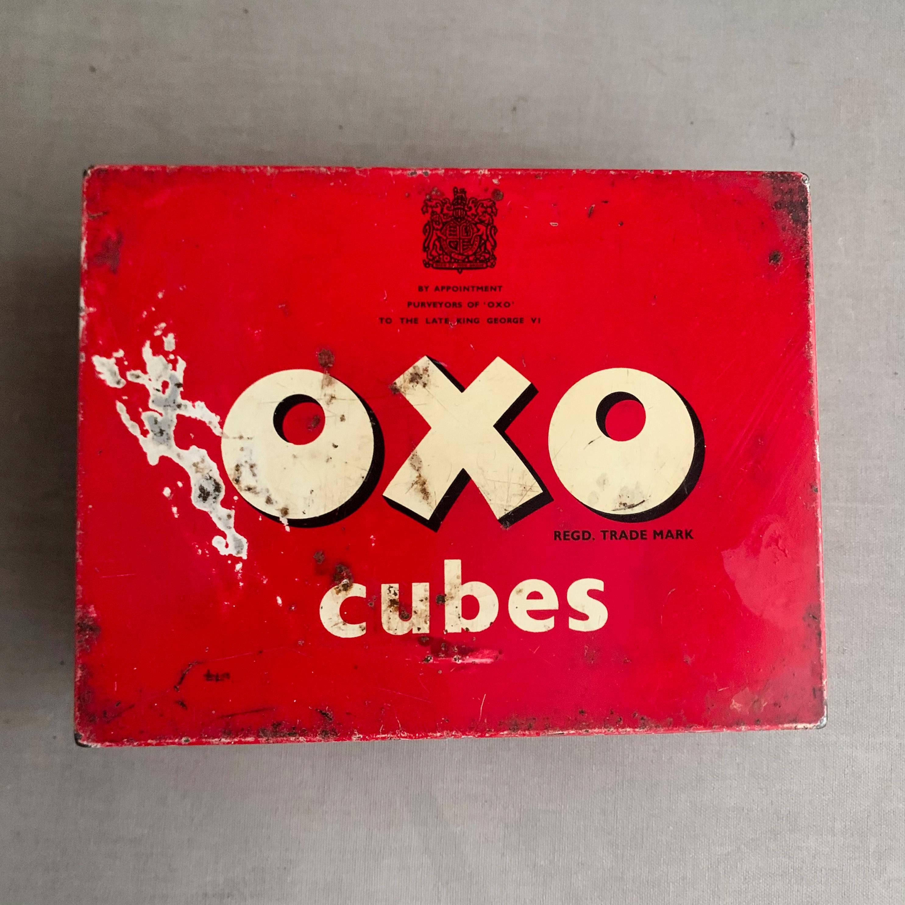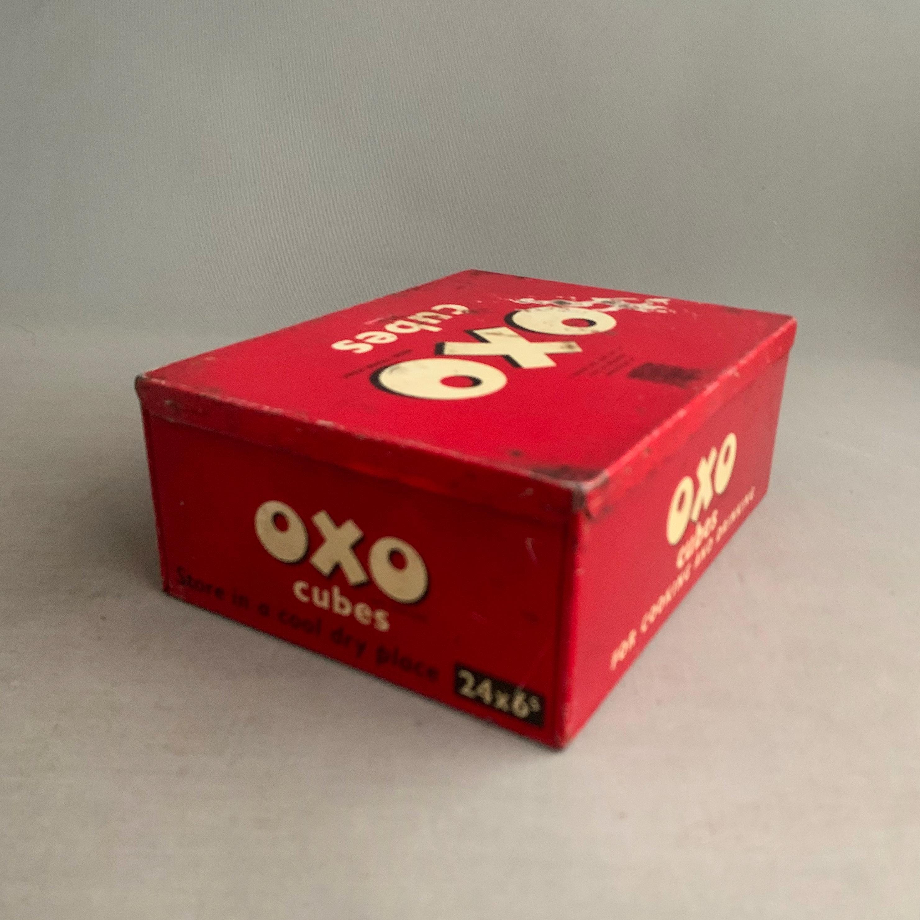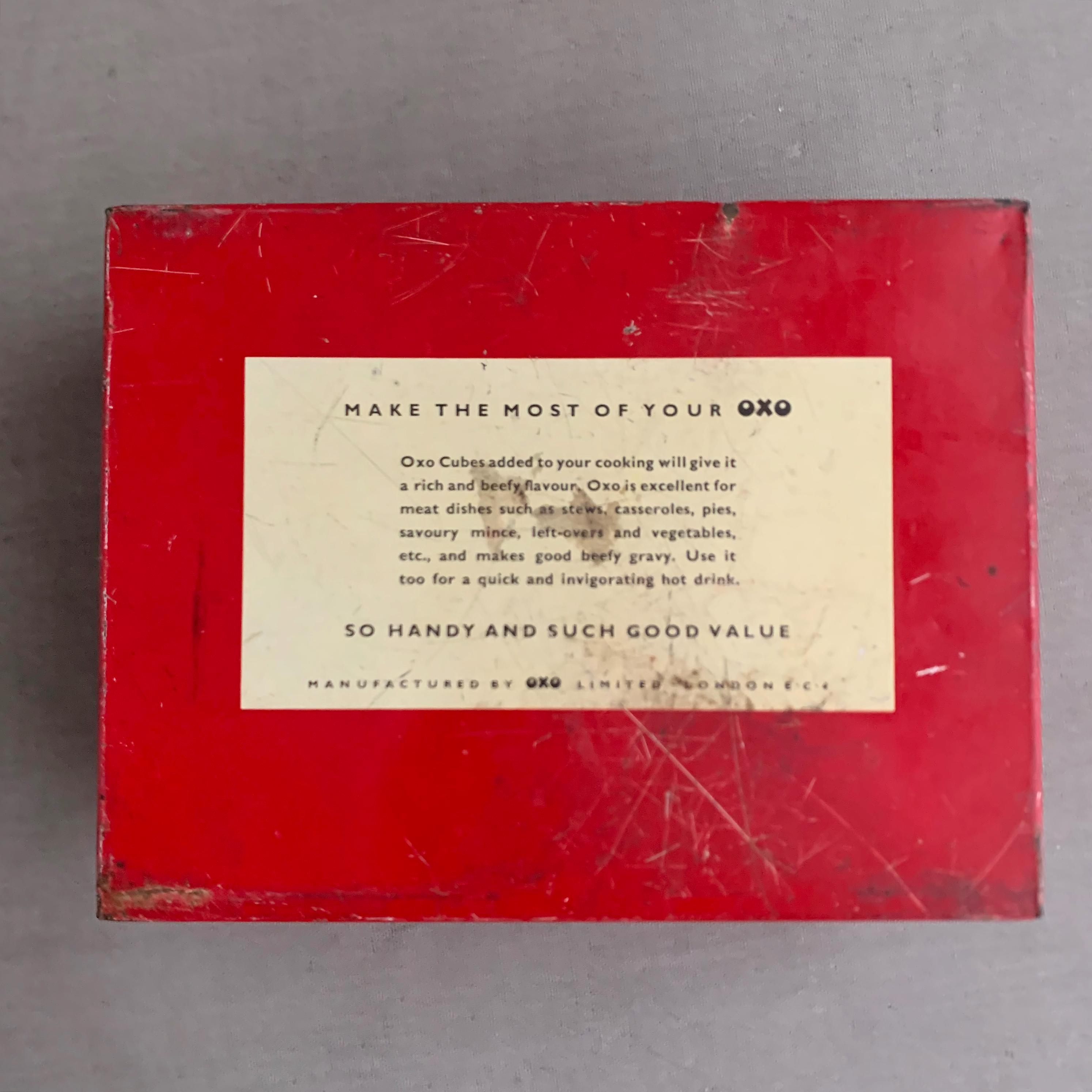 A vintage red OXO Cubes tin used for storing beef stock cubes.
