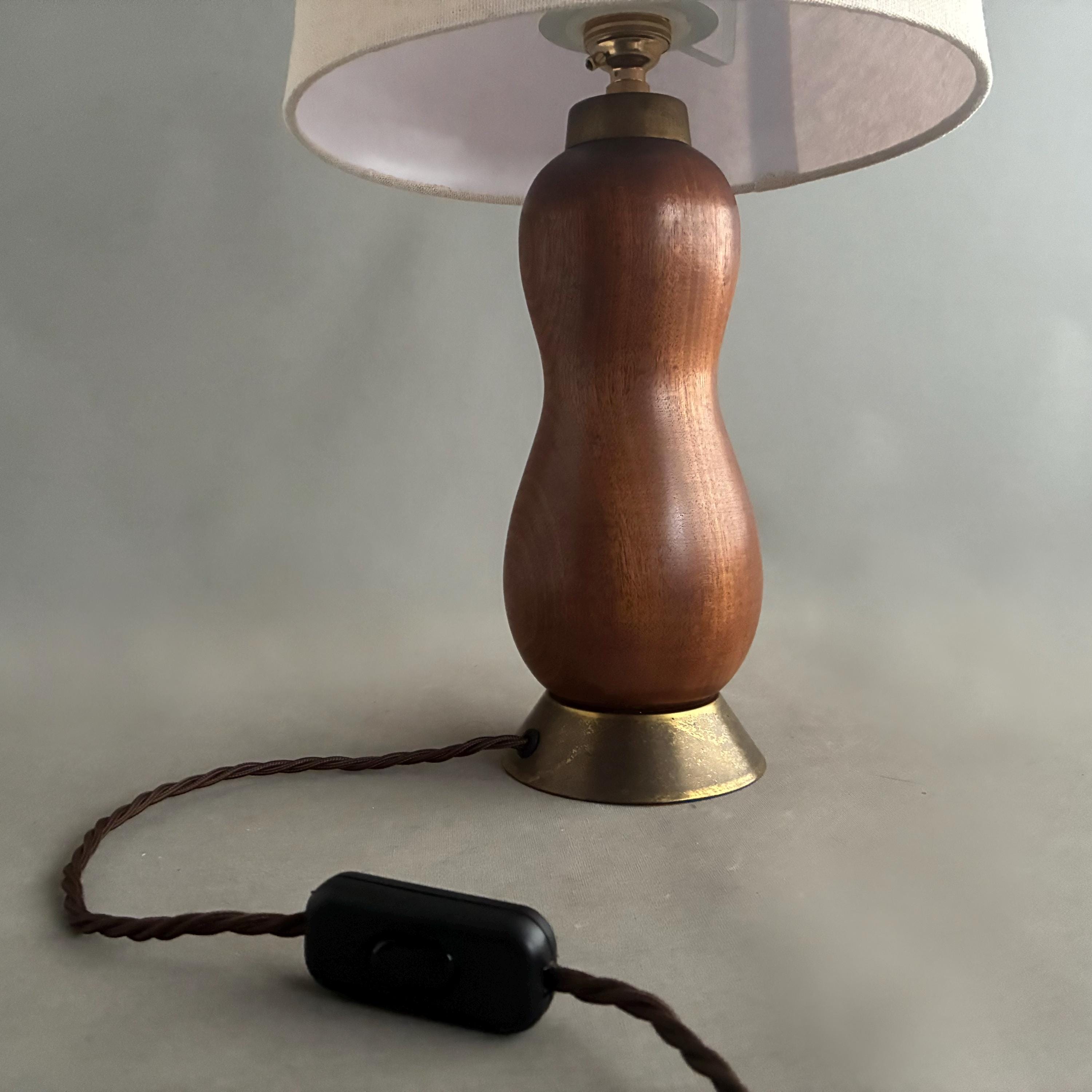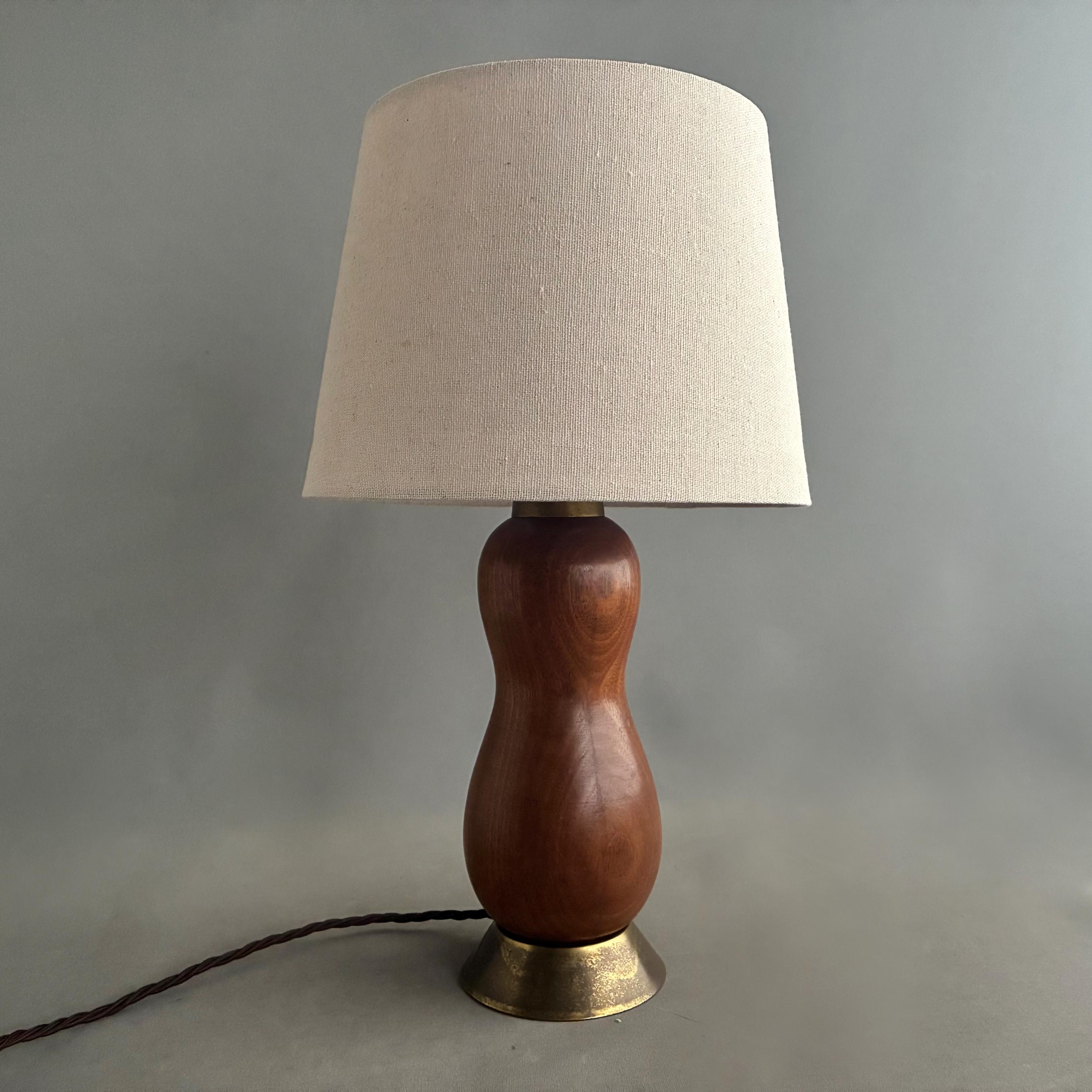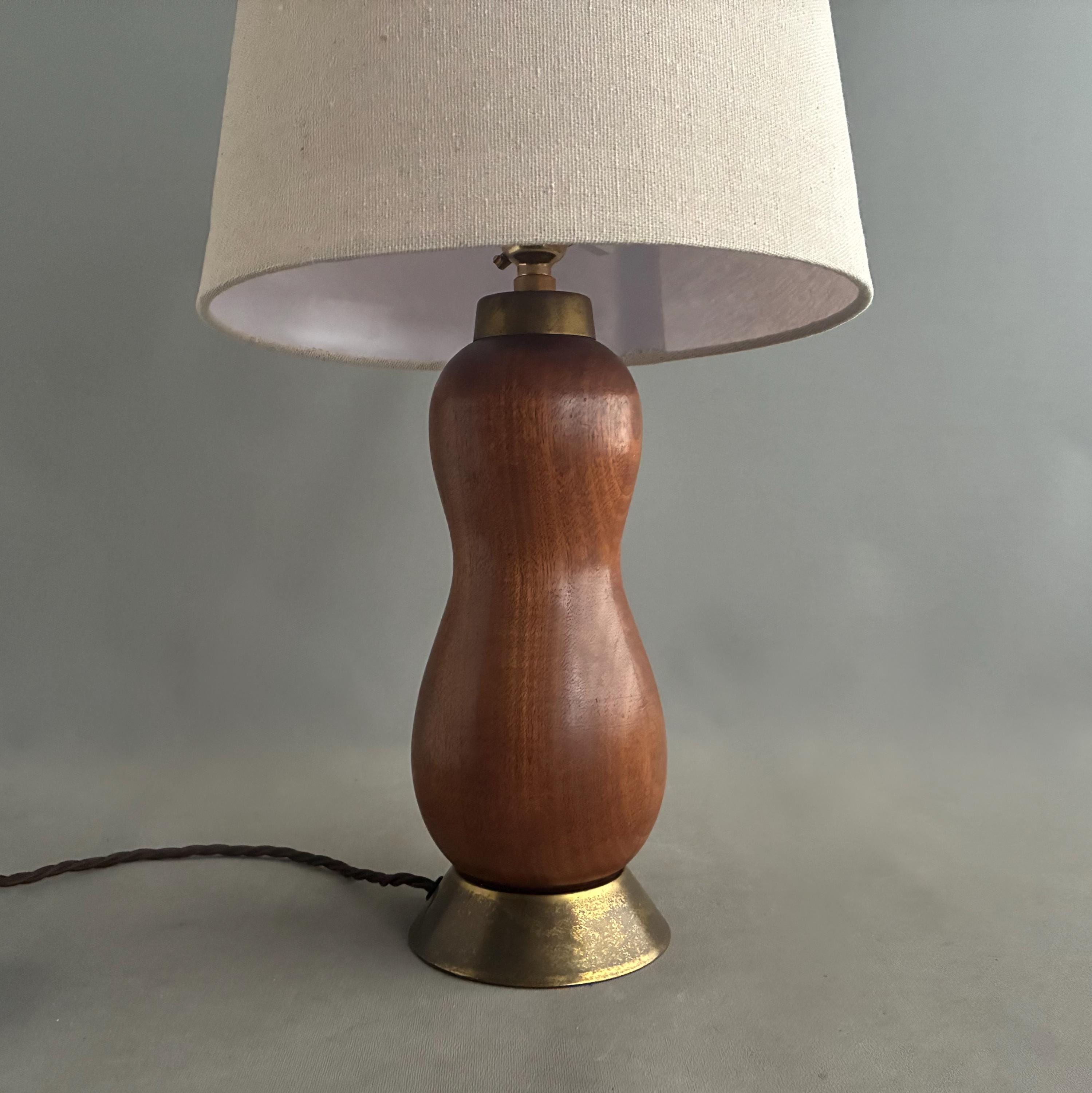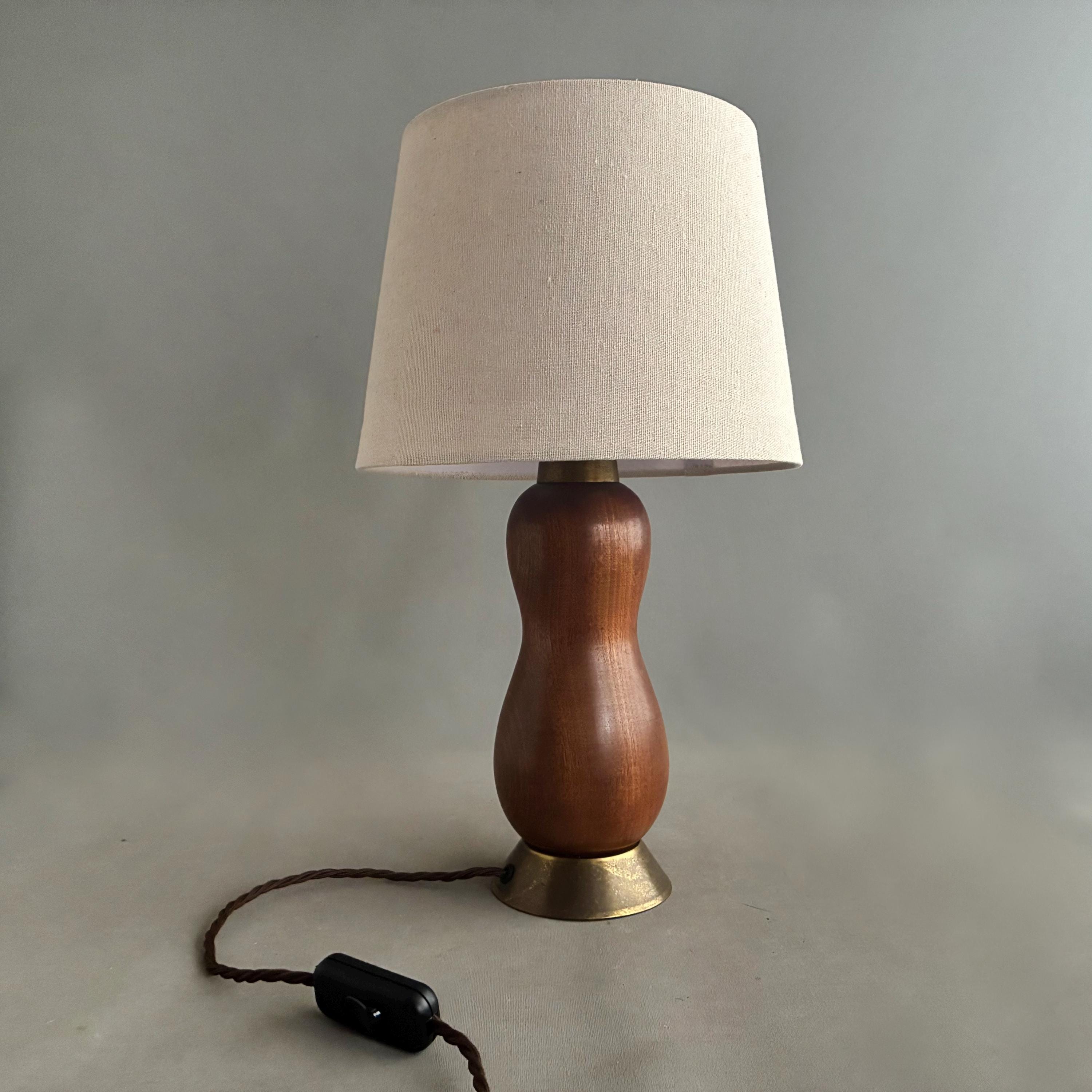Scandinavian Mid-Century Modern with a sculptural, organic, hourglass-like form paired with a simple linen lampshade. Professionally rewired with brown textile braided flex and on cable switch with uk Plug and brass bayonet lamp holder .