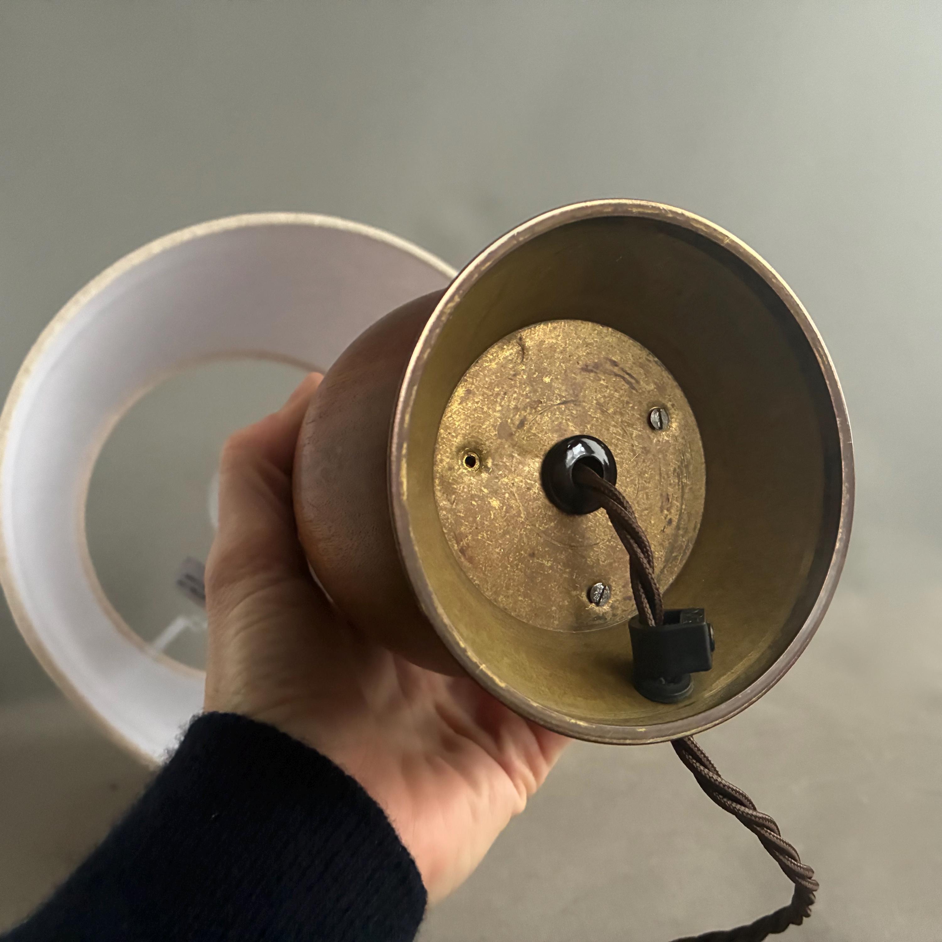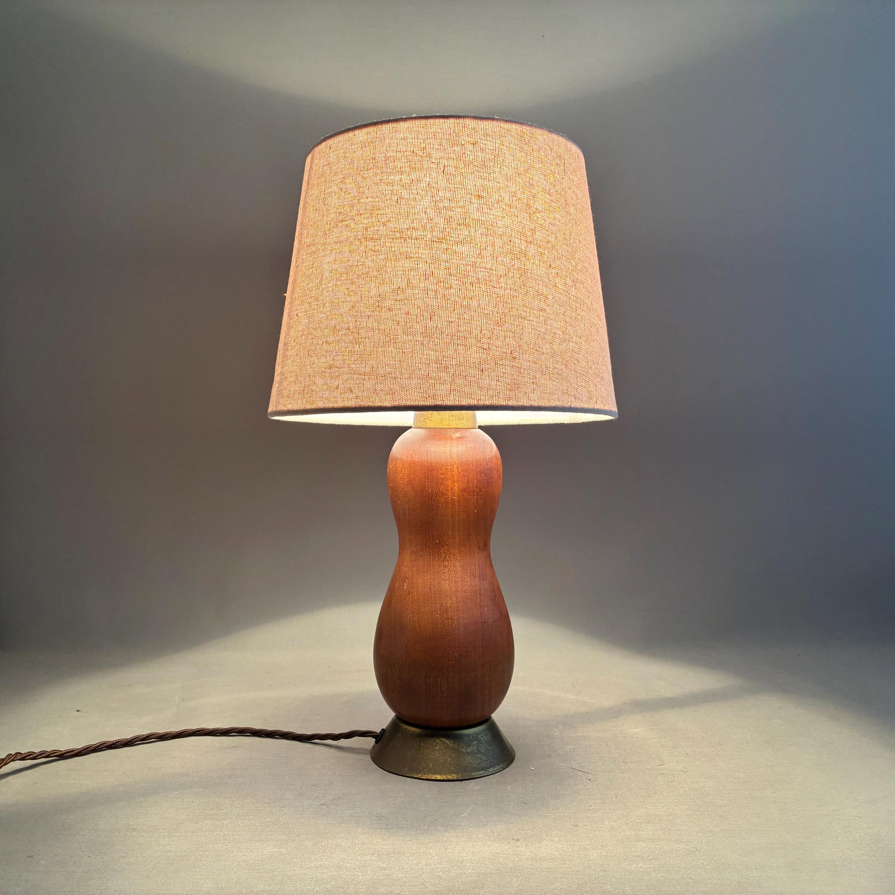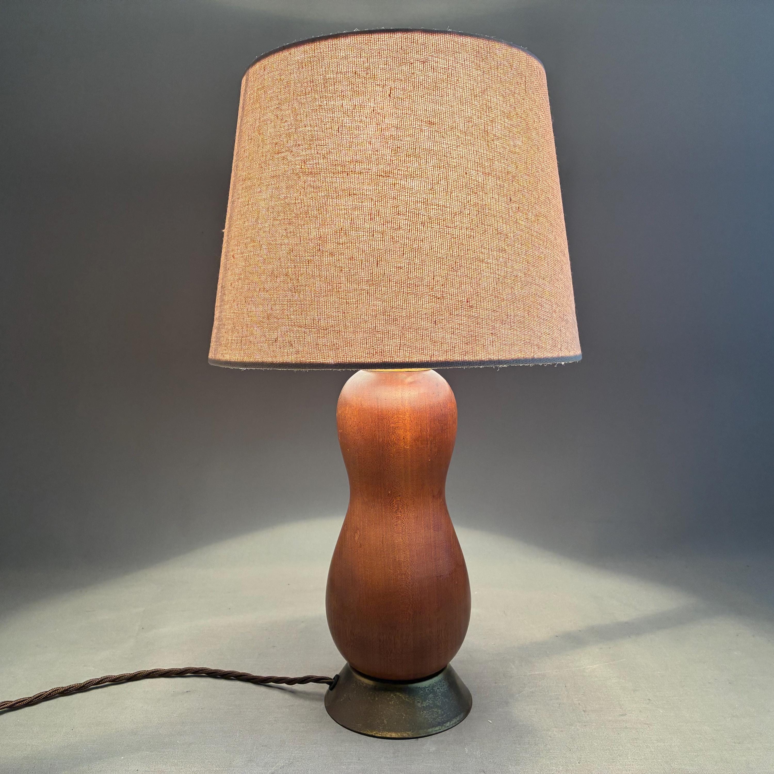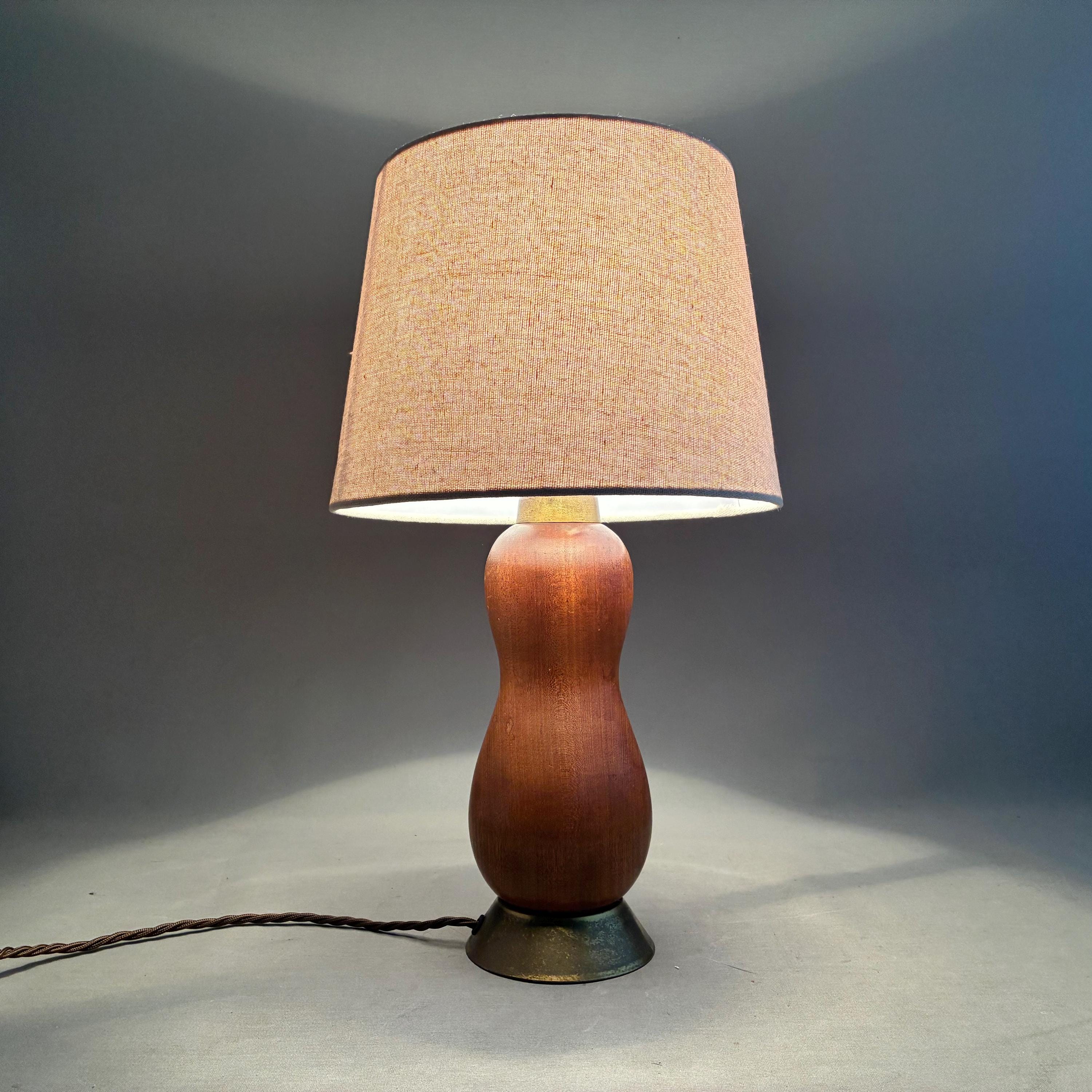 Scandinavian Mid-Century Modern with a sculptural, organic, hourglass-like form paired with a simple linen lampshade. Professionally rewired with brown textile braided flex and on cable switch with uk Plug and brass bayonet lamp holder .