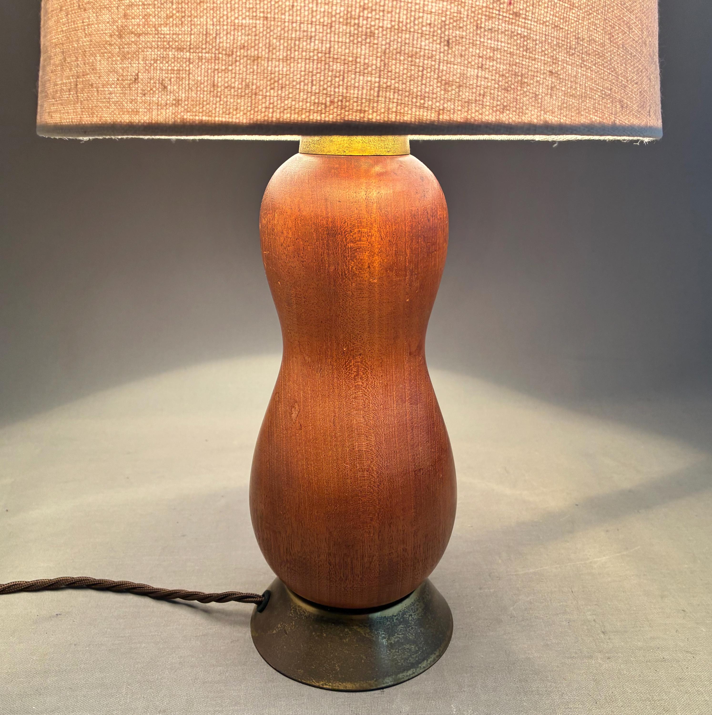 A mid-century modern sculptural teak table lamp, likely Danish in origin and dating from the 1960s. The design features an hourglass-shaped, solid teak wood base with a warm patina, with a brass foot on the base and fittings at the top
