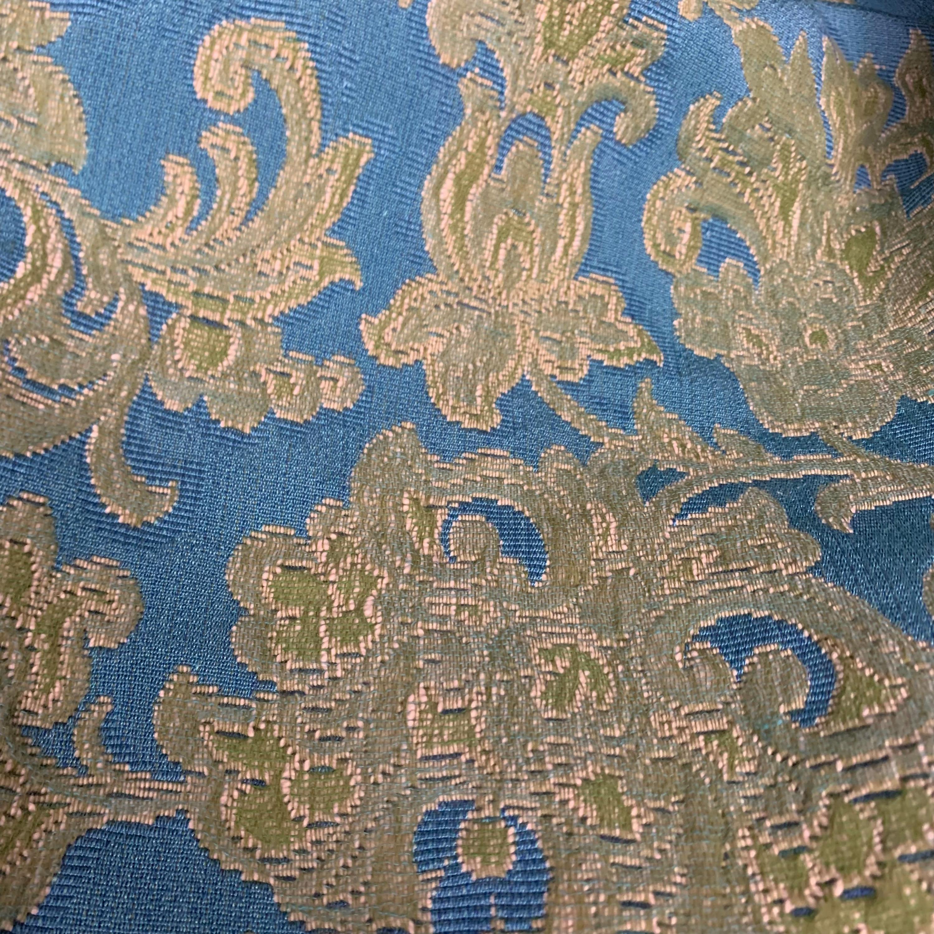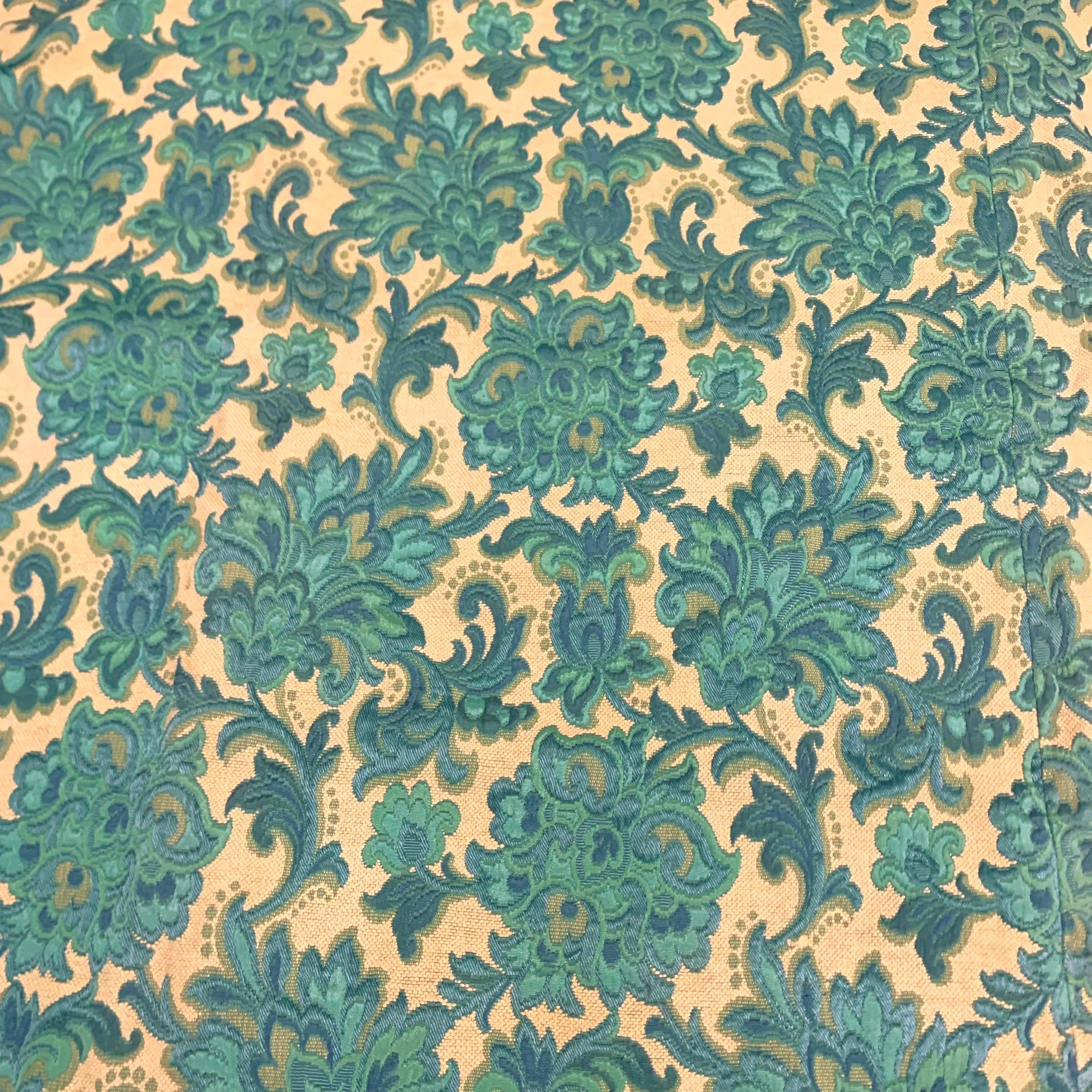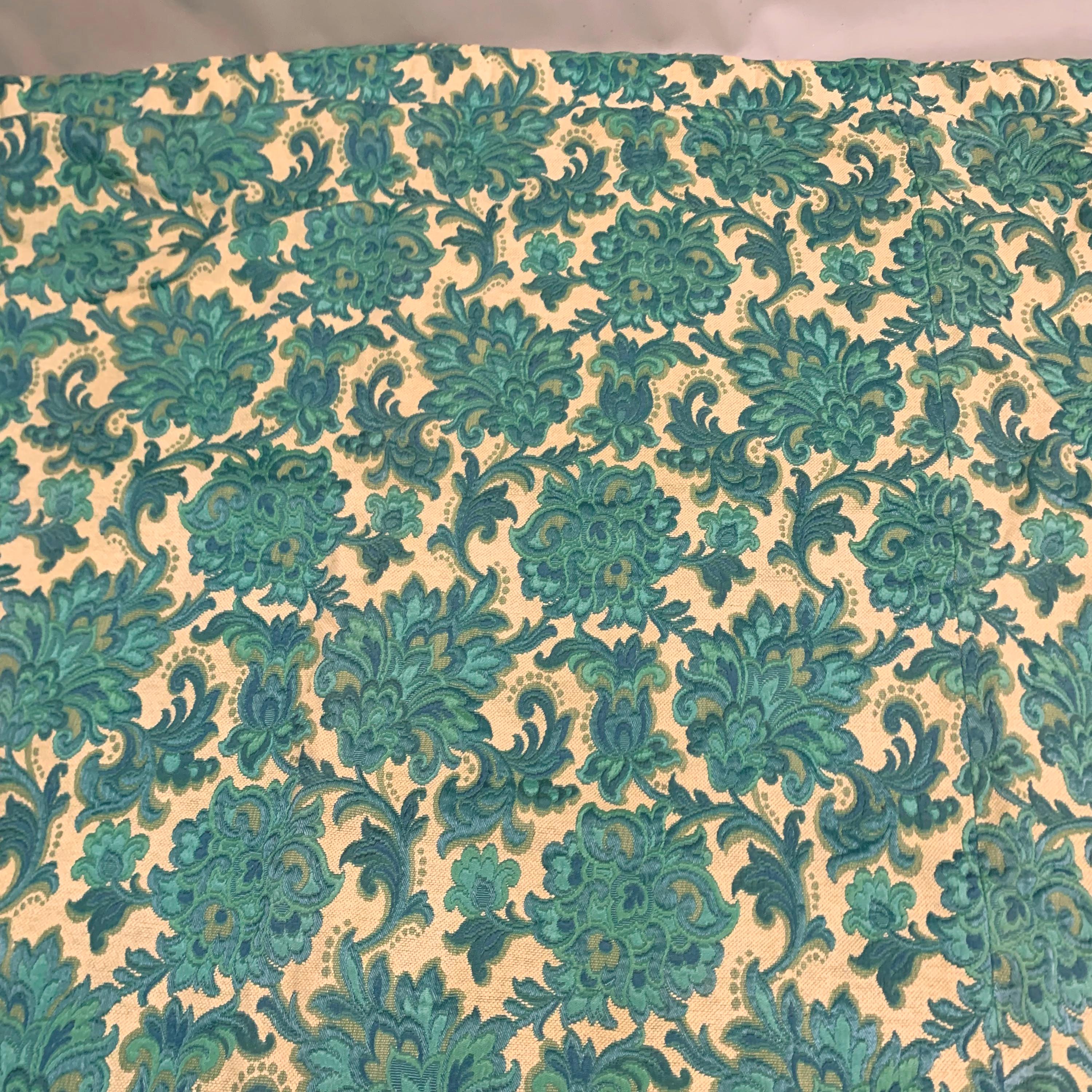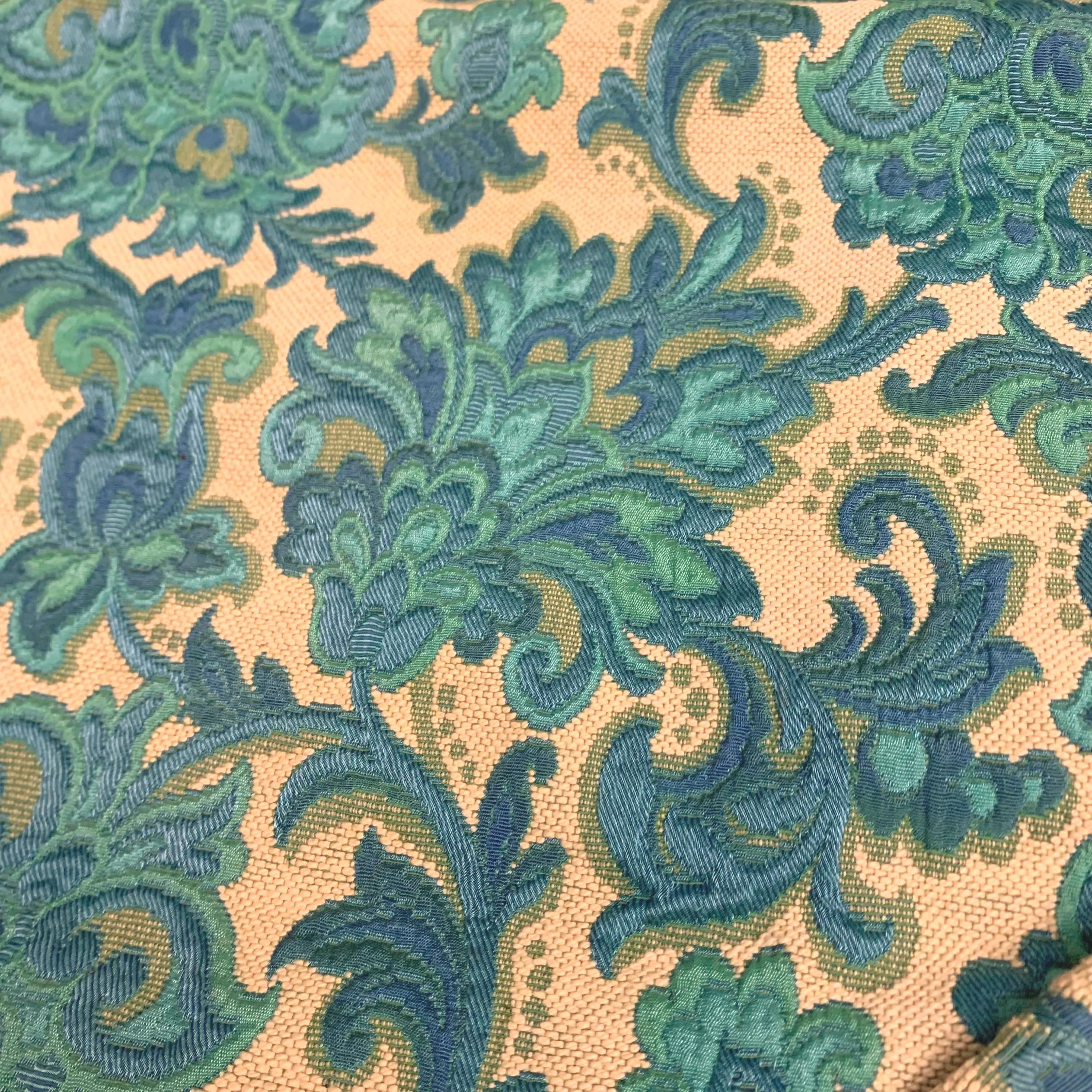 A good amount of vintage heavy damask / brocade upholstery fabric with a decorative floral pattern circa 1970s. The raised teal blue floral designs, has a silky sheen, contrast against a lighter, beige woven textured background. The ornate, scrolling floral pattern is typical of a damask / Jacquard or brocade weave, which is created using a jacquard loom process. In vibrant shades of teal and blue-green on a neutral, light-coloured base.