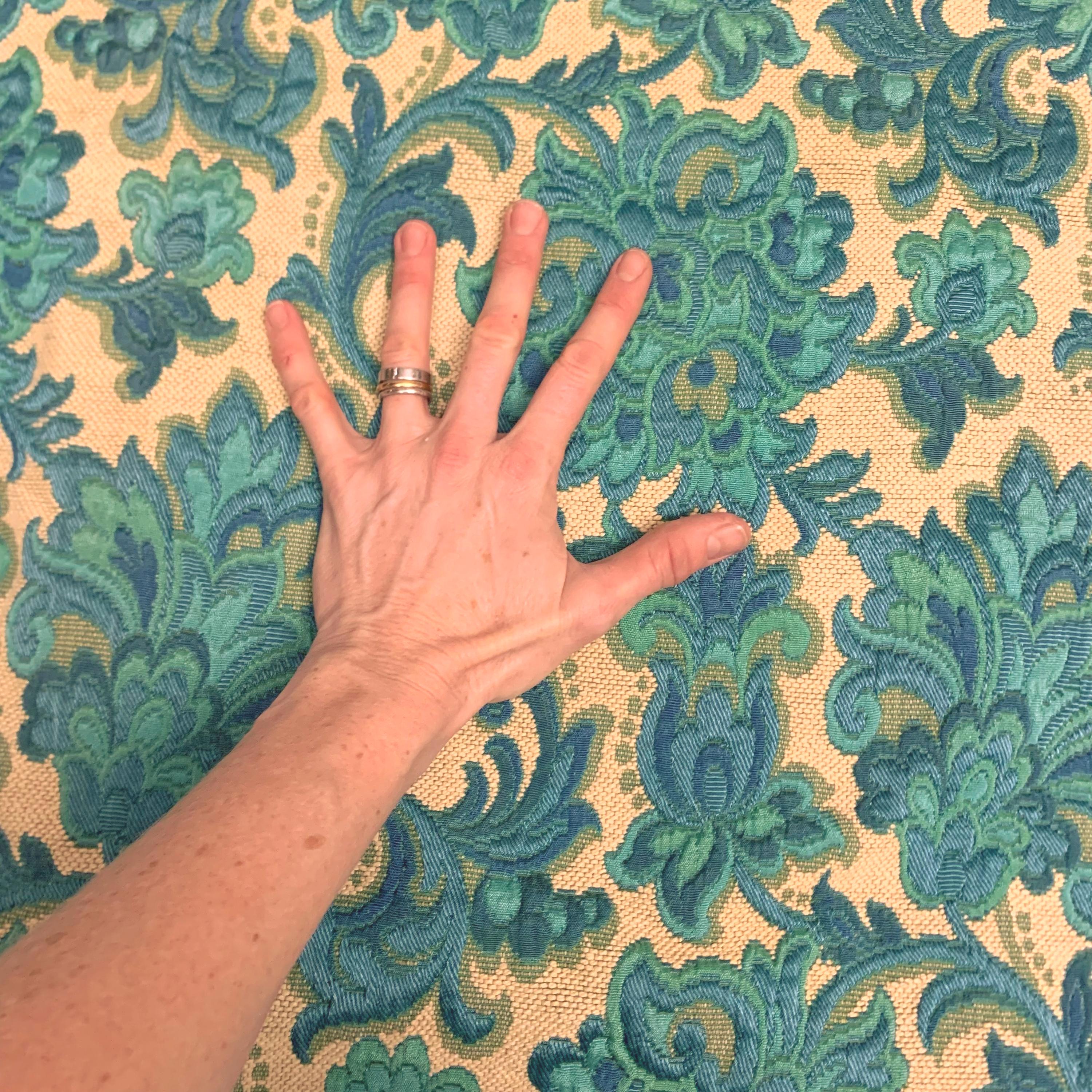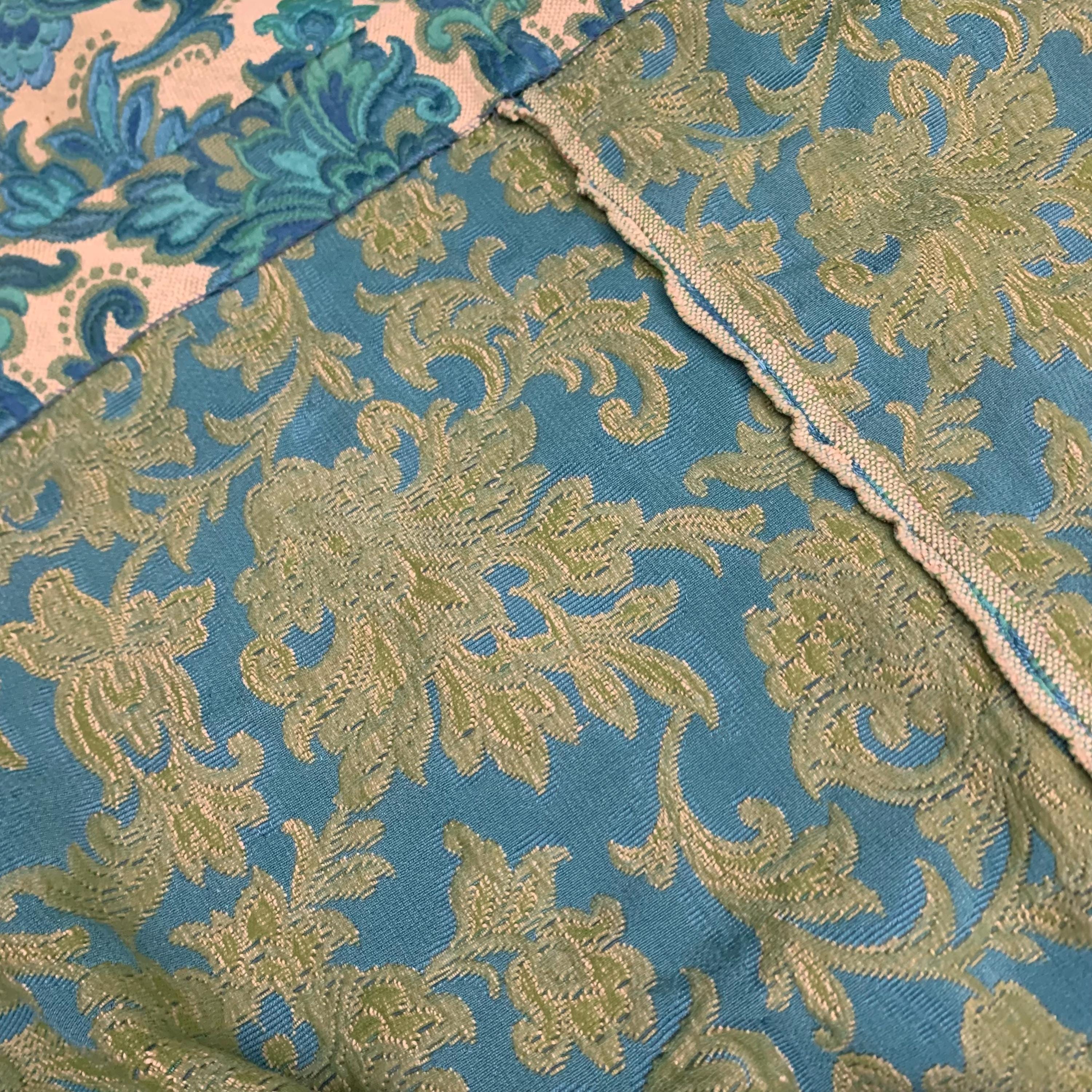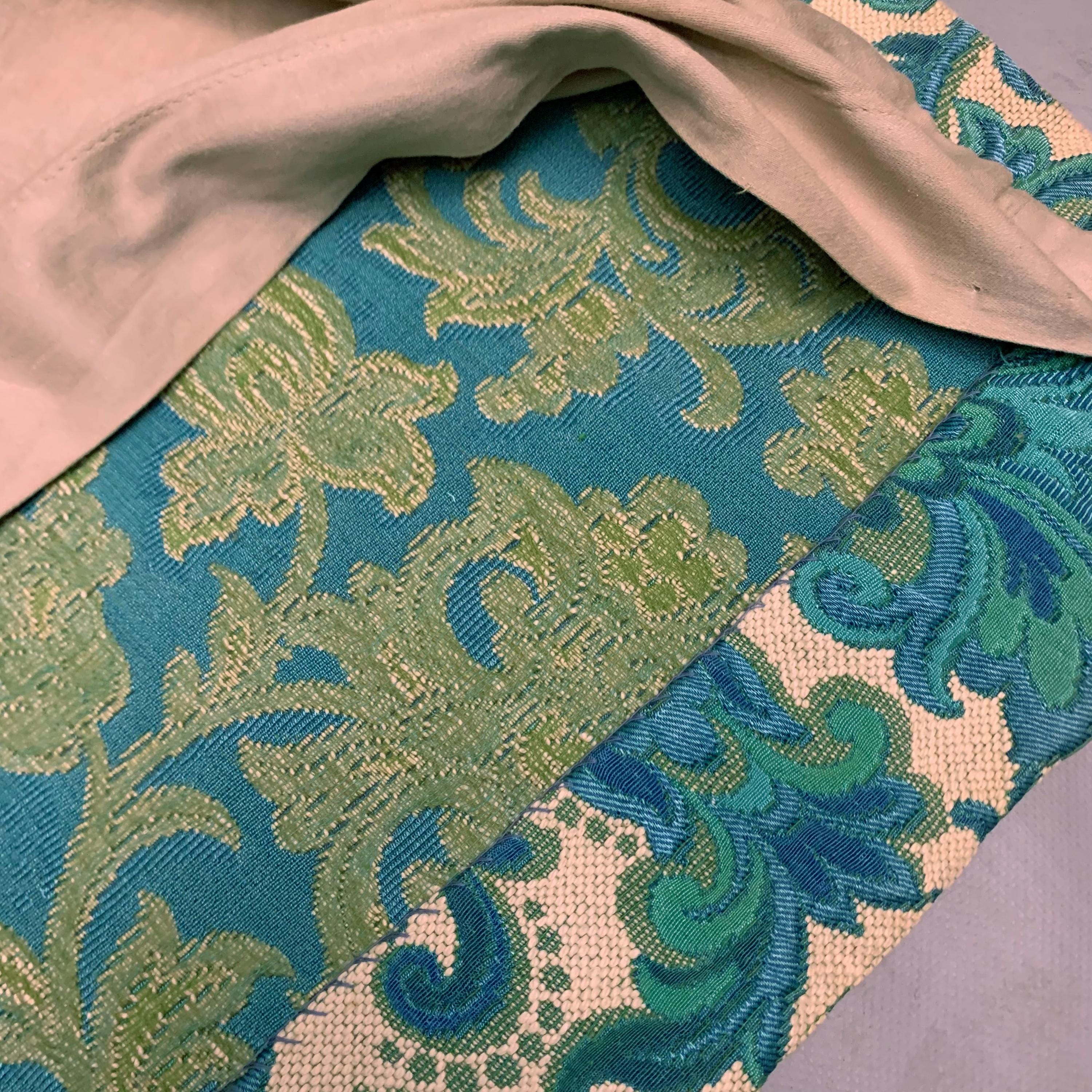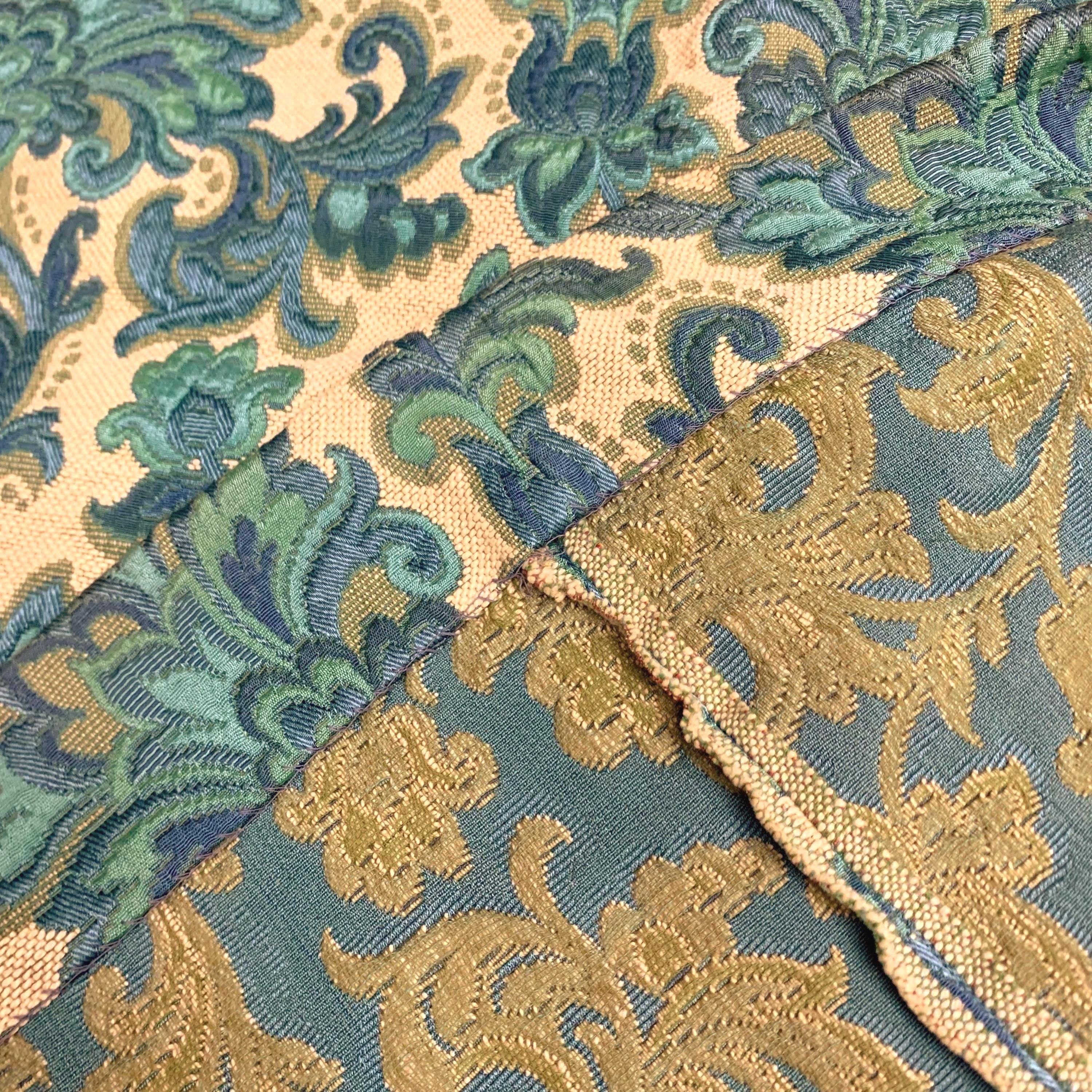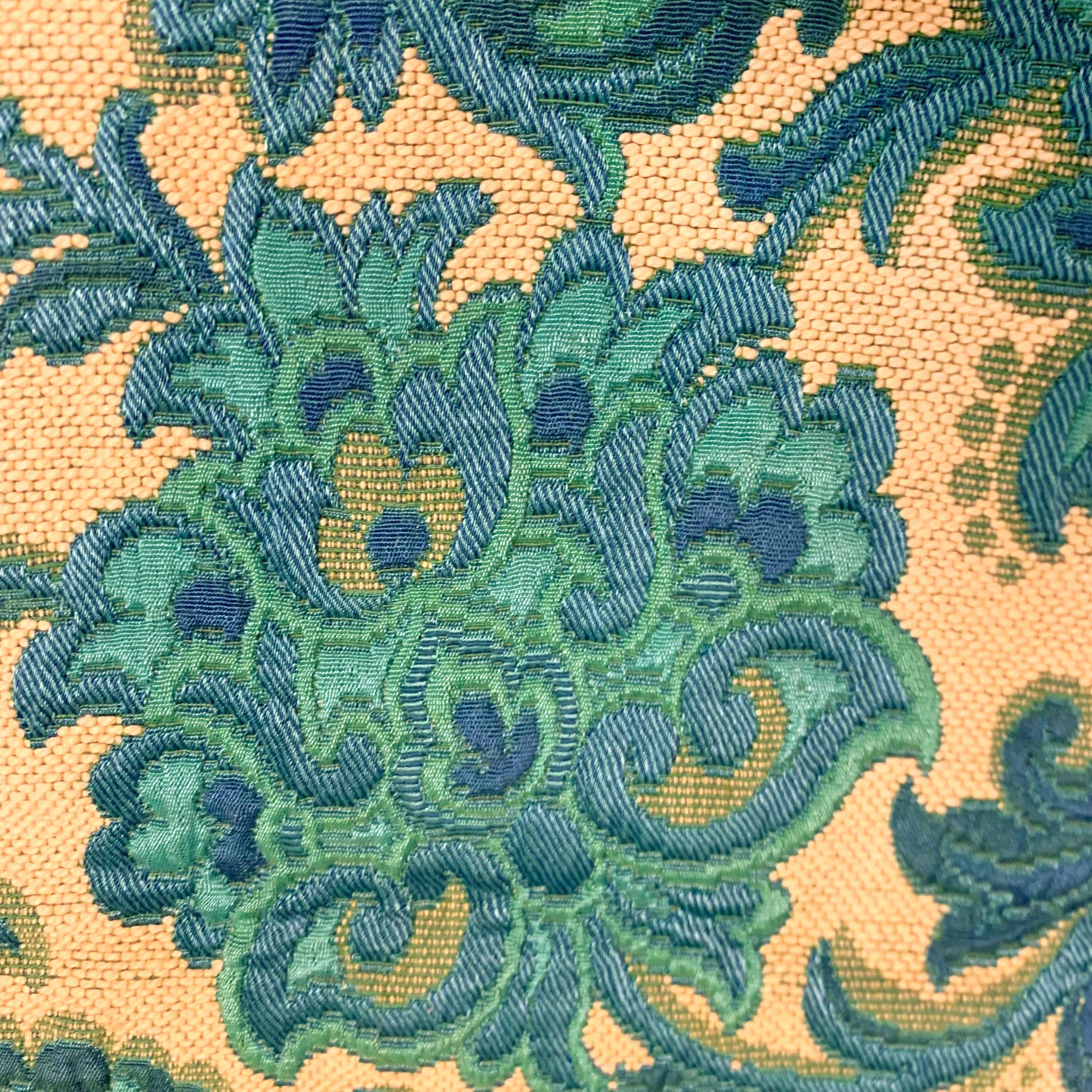 A good amount of vintage heavy damask / brocade upholstery fabric with a decorative floral pattern circa 1970s. The raised teal blue floral designs, has a silky sheen, contrast against a lighter, beige woven textured background. The ornate, scrolling floral pattern is typical of a damask / Jacquard or brocade weave, which is created using a jacquard loom process. In vibrant shades of teal and blue-green on a neutral, light-coloured base.