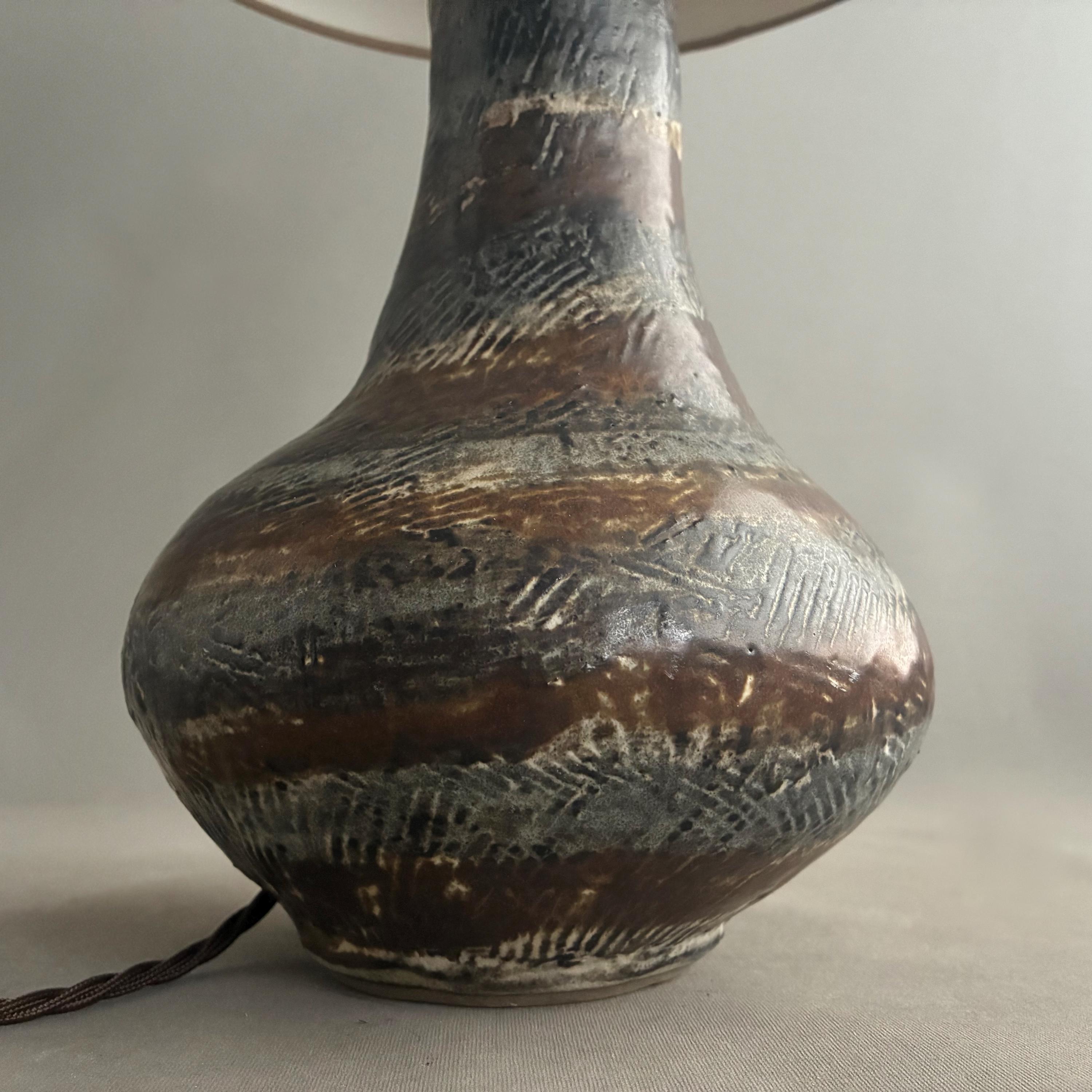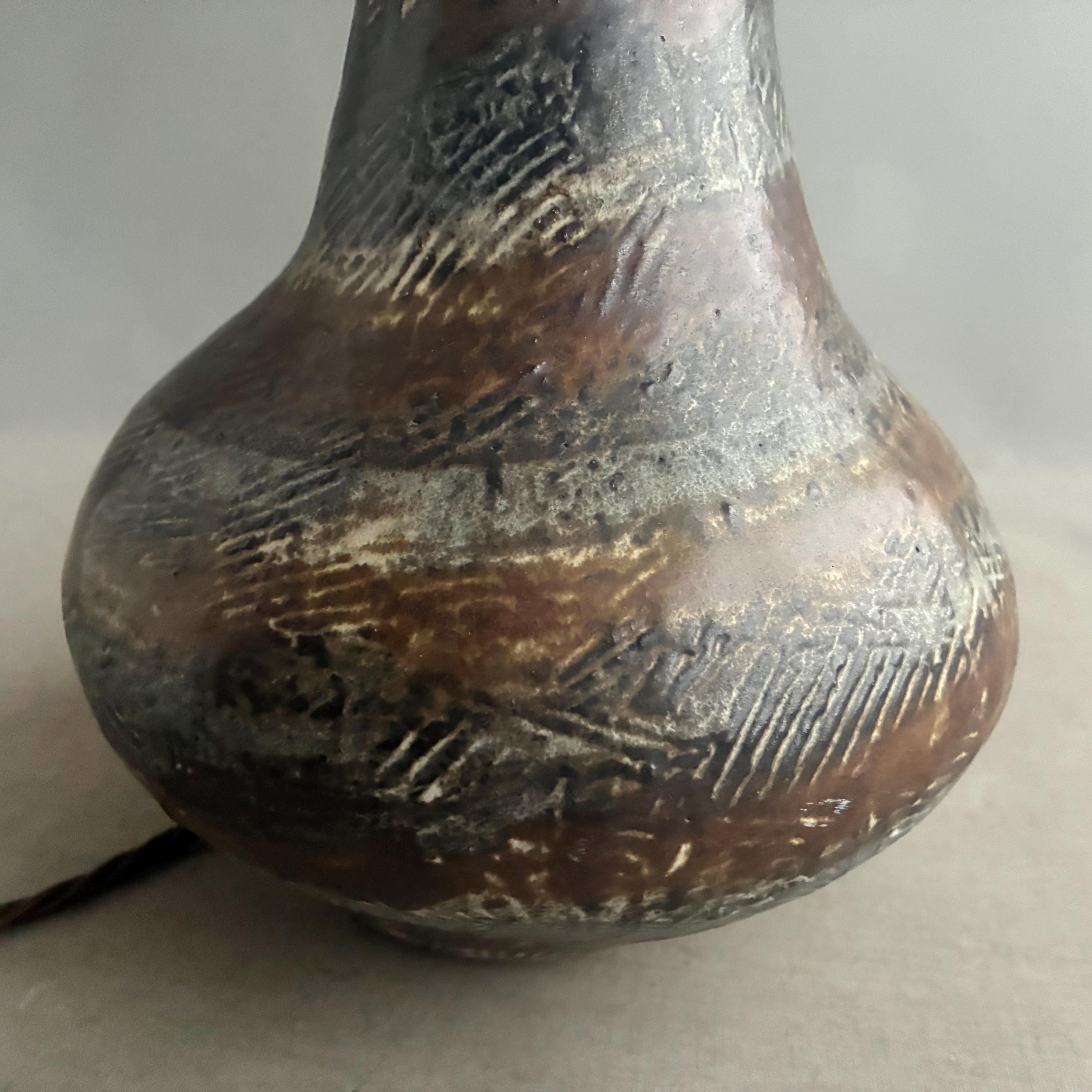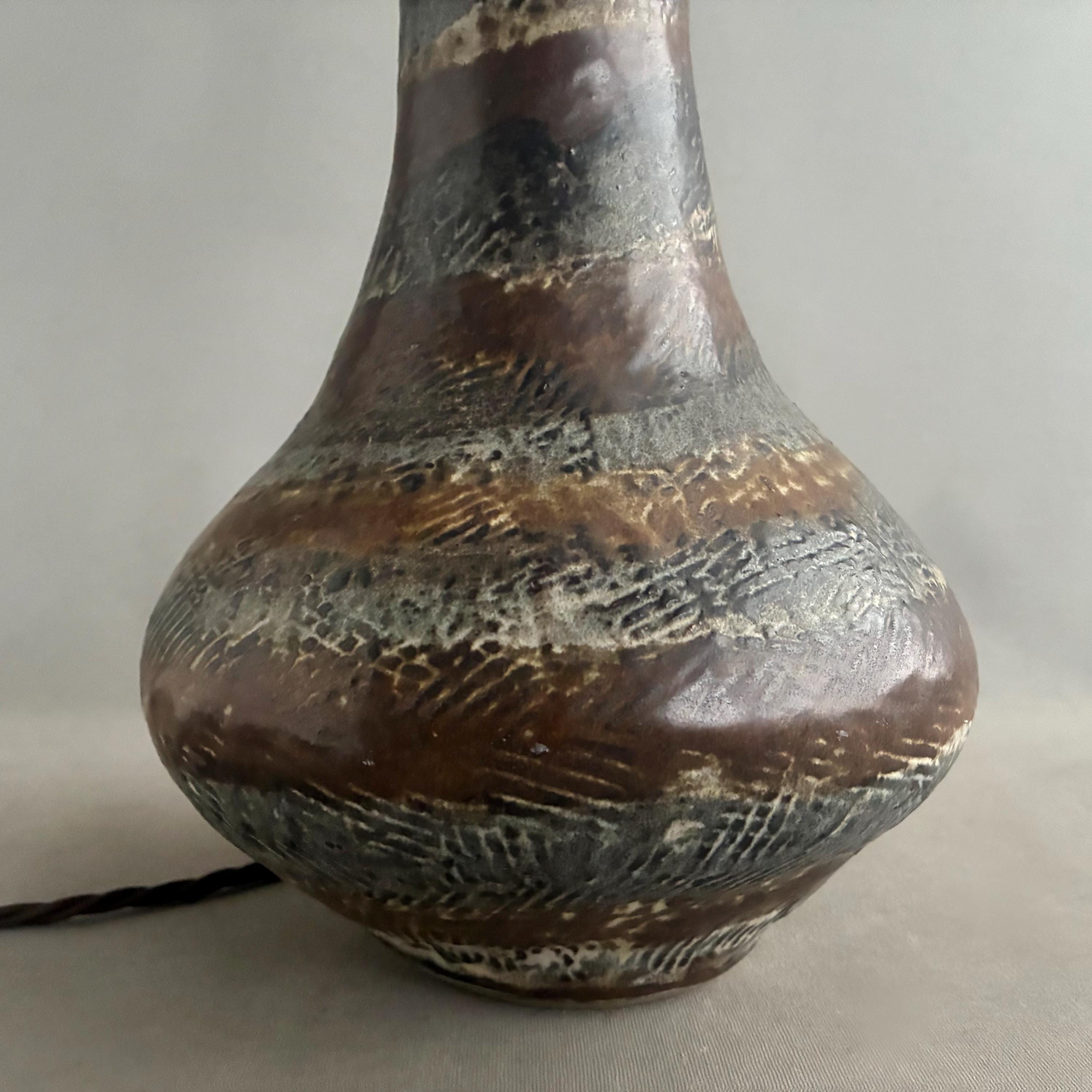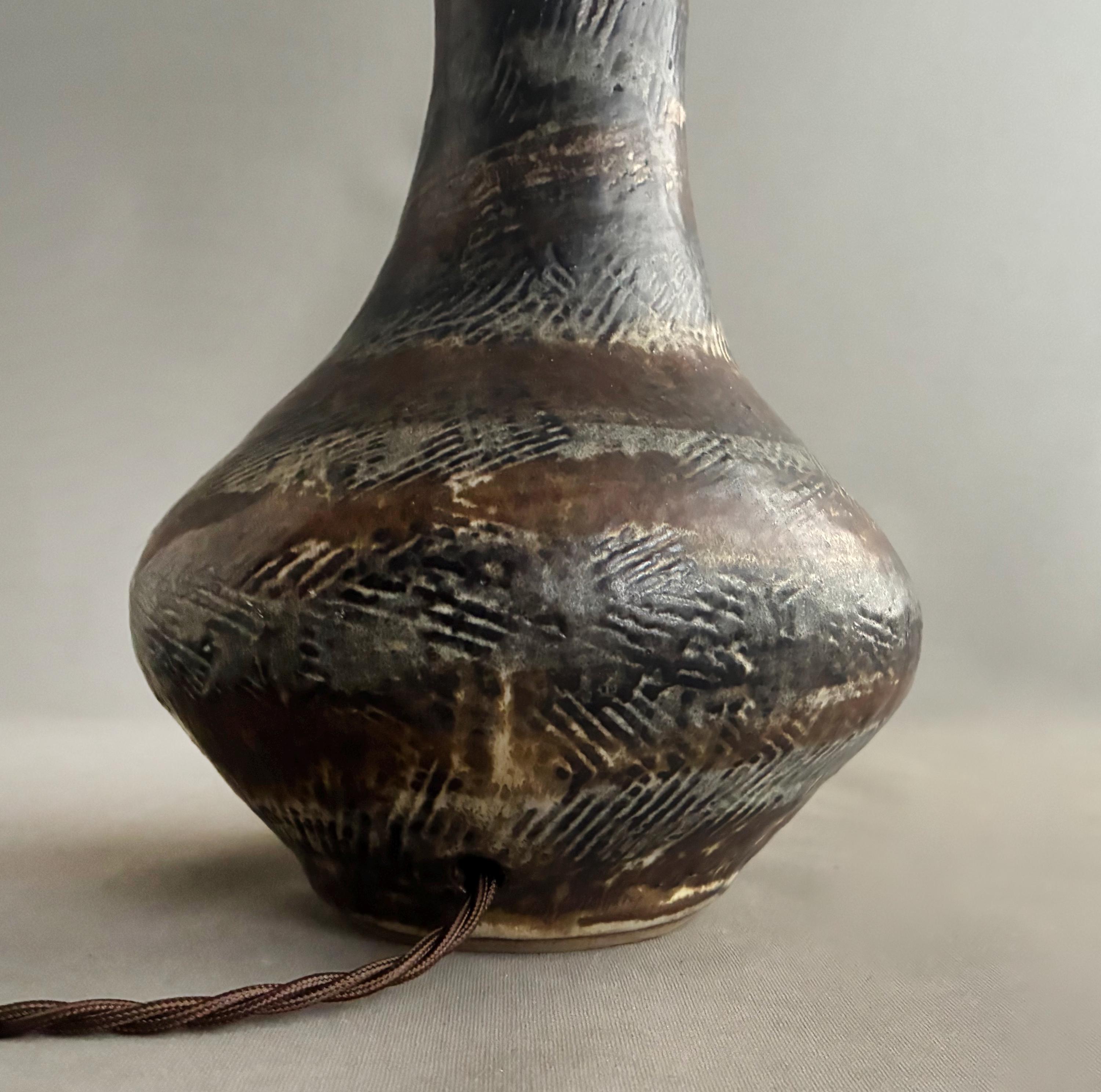 Featuring a textured, handcrafted ceramic base likely dating from the mid-20th century. The lamp has a bulbous lower section that tapers into a tall neck, adorned with horizontal incised lines and finished with a rich, multi-tonal glaze in earthy browns, greyish-blues, and cream highlights. Mid-Century Modern/Organic Modern, often associated with Brutalist ceramic art from the 1960s or 1970s.