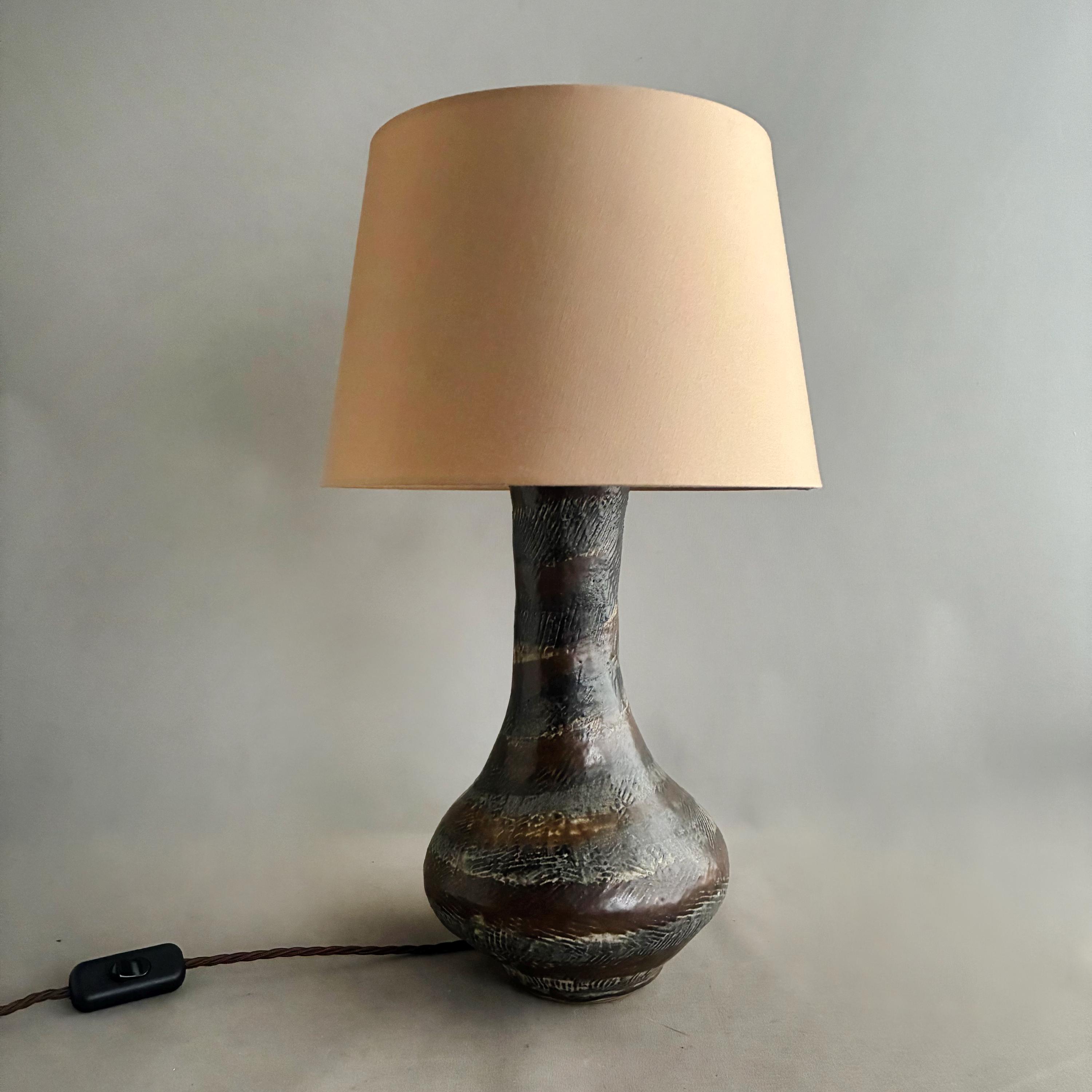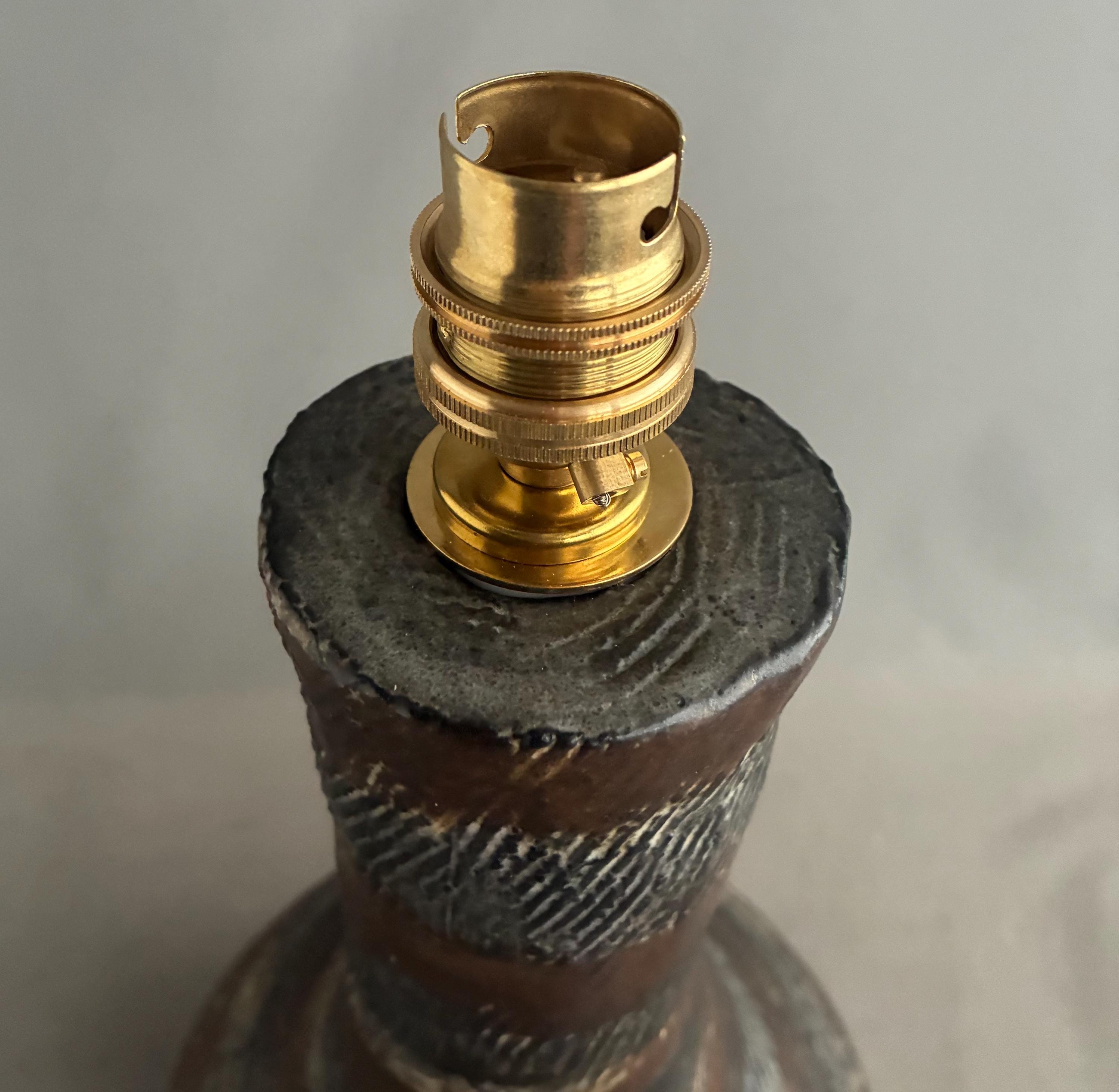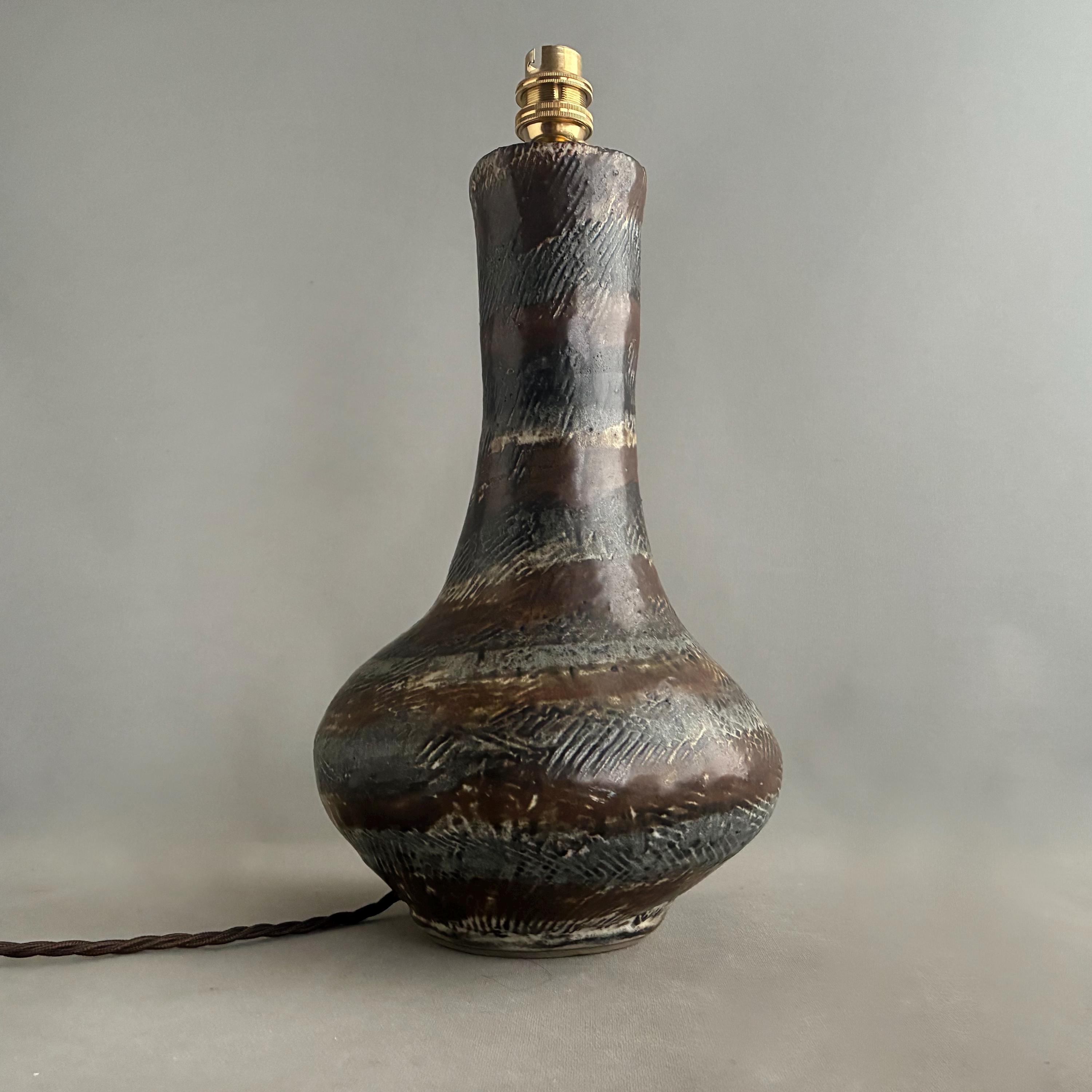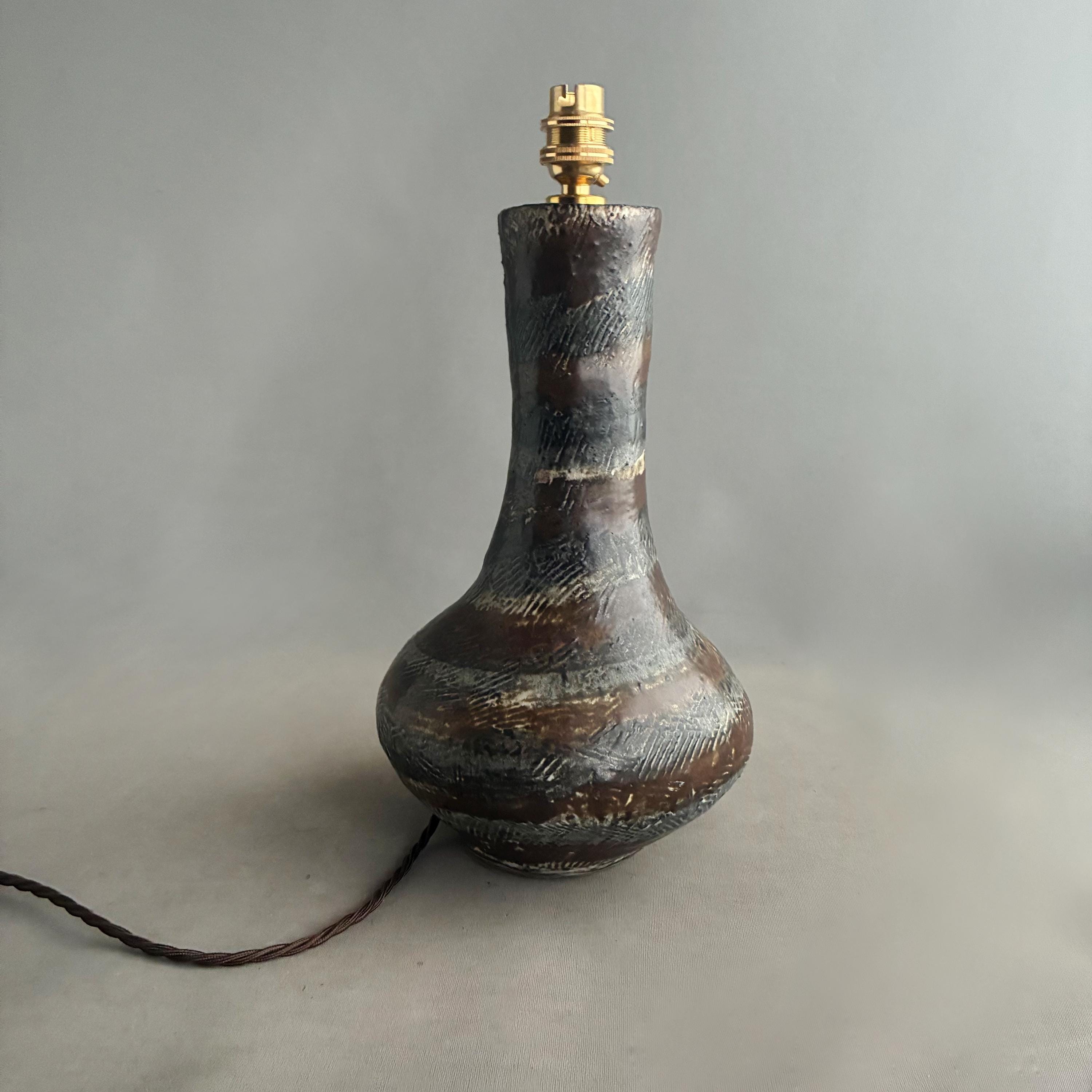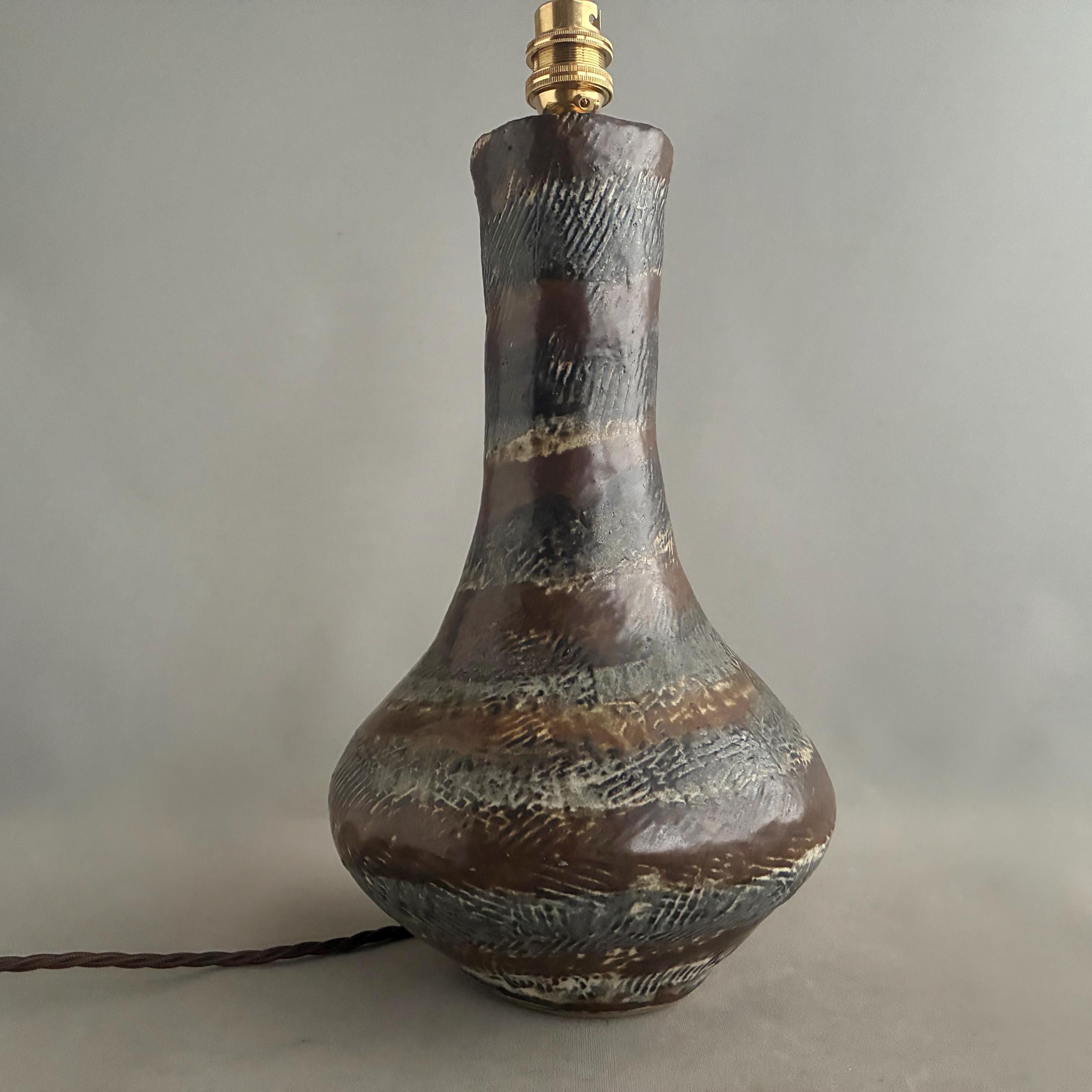 Featuring a textured, handcrafted ceramic base likely dating from the mid-20th century. The lamp has a bulbous lower section that tapers into a tall neck, adorned with horizontal incised lines and finished with a rich, multi-tonal glaze in earthy browns, greyish-blues, and cream highlights. Mid-Century Modern/Organic Modern, often associated with Brutalist ceramic art from the 1960s or 1970s.