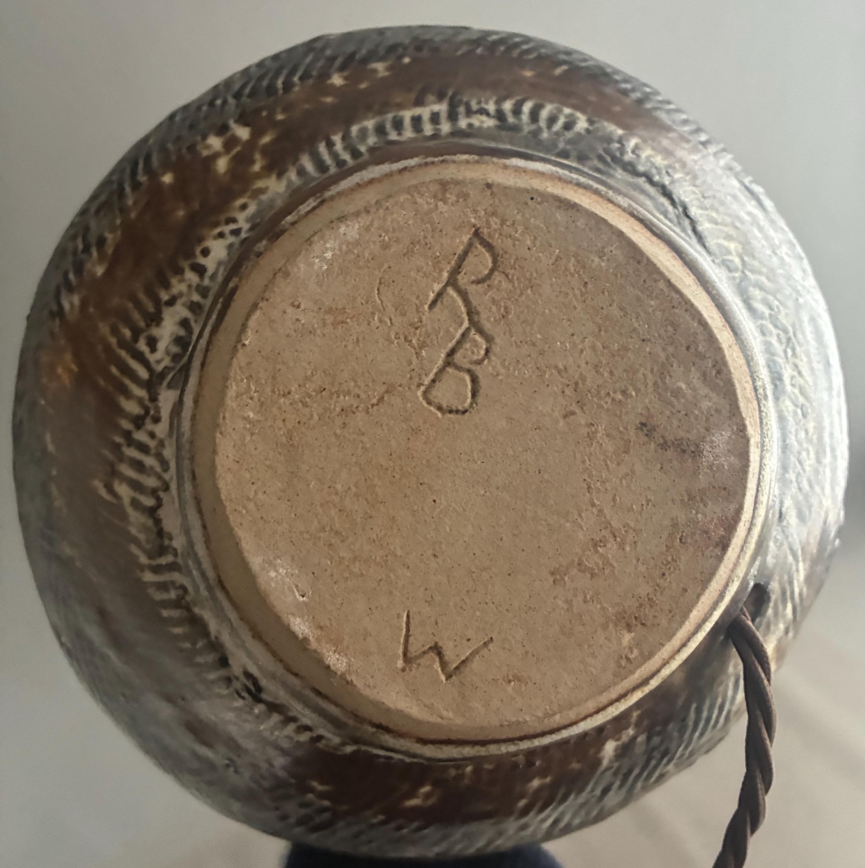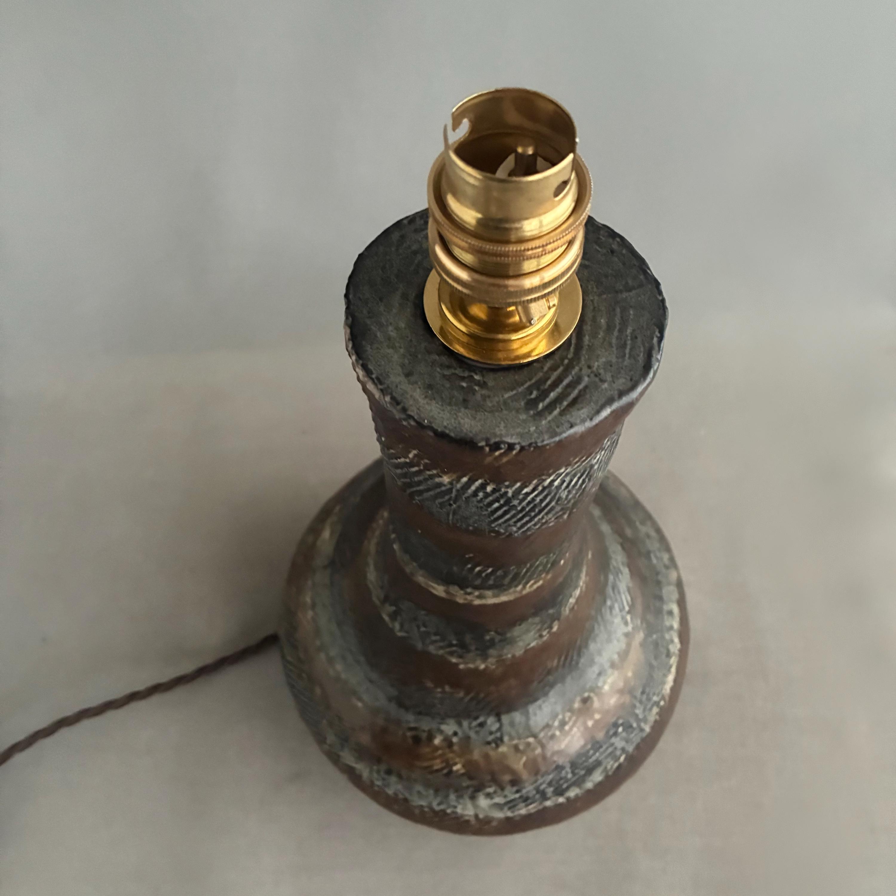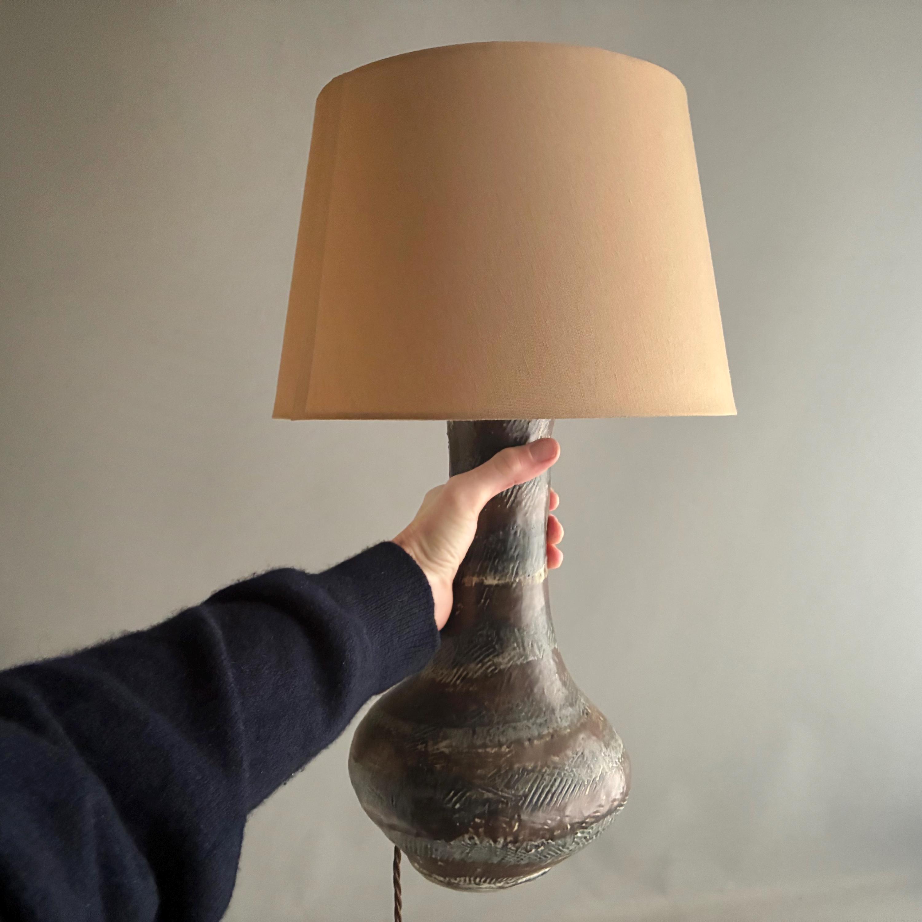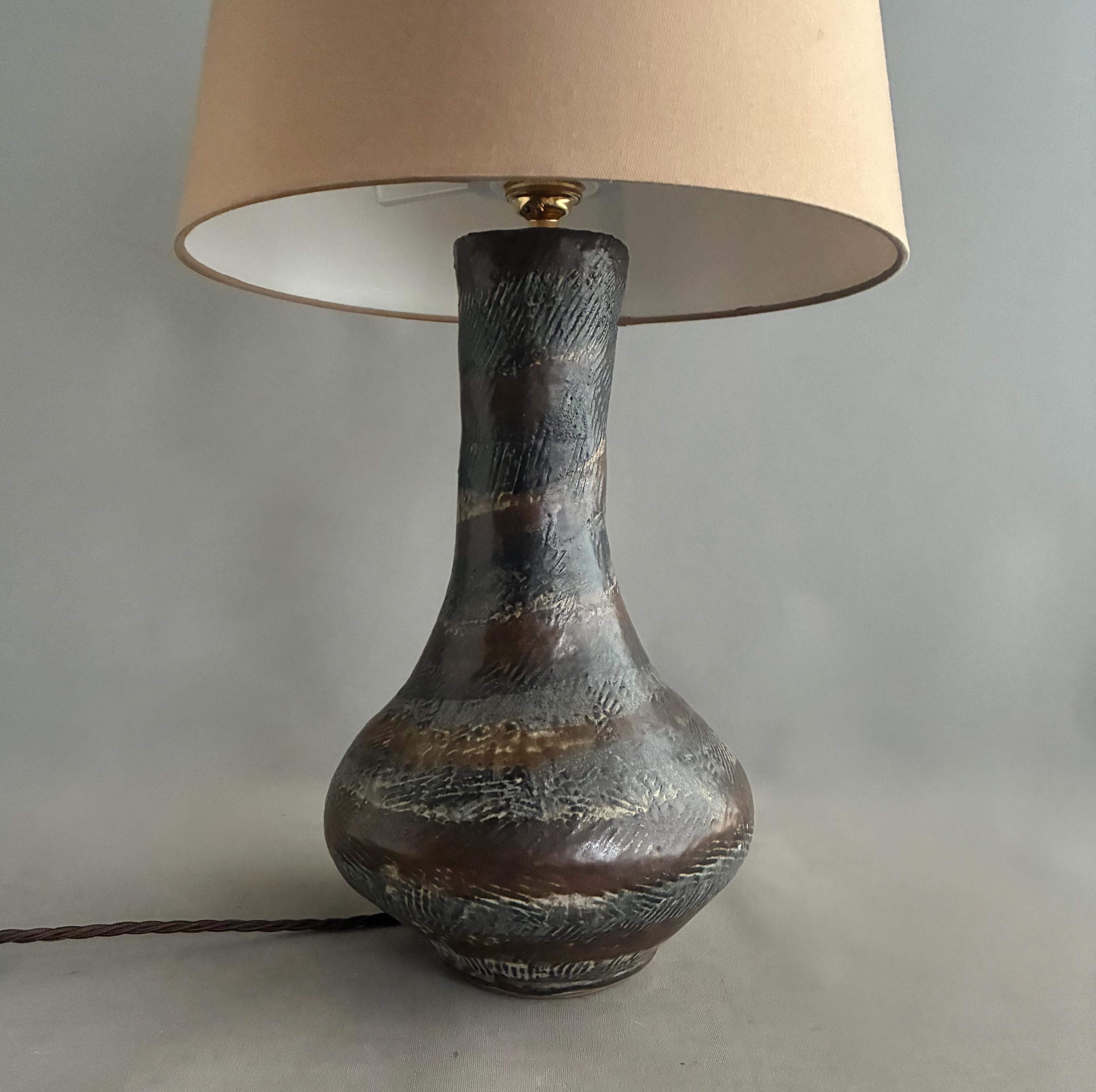 Featuring a textured, handcrafted ceramic base likely dating from the mid-20th century. The lamp has a bulbous lower section that tapers into a tall neck, adorned with horizontal incised lines and finished with a rich, multi-tonal glaze in earthy browns, greyish-blues, and cream highlights. Mid-Century Modern/Organic Modern, often associated with Brutalist ceramic art from the 1960s or 1970s.
