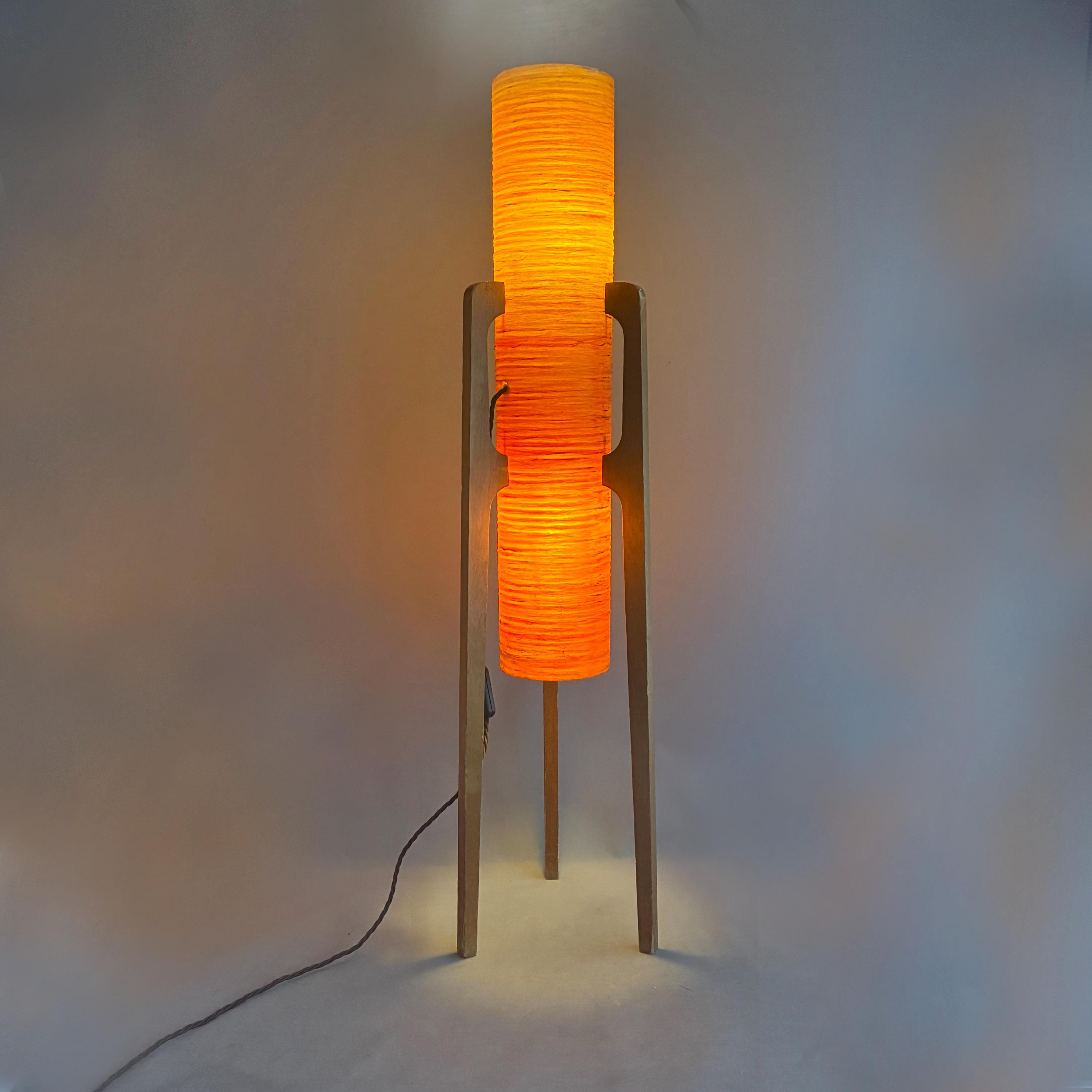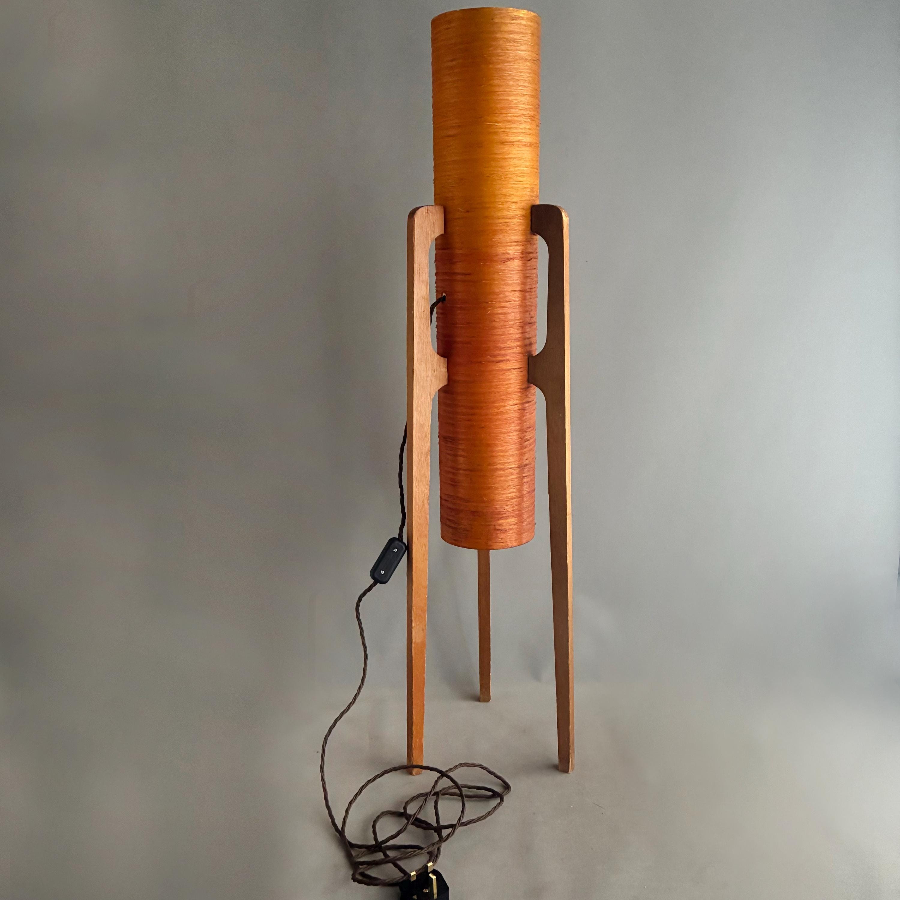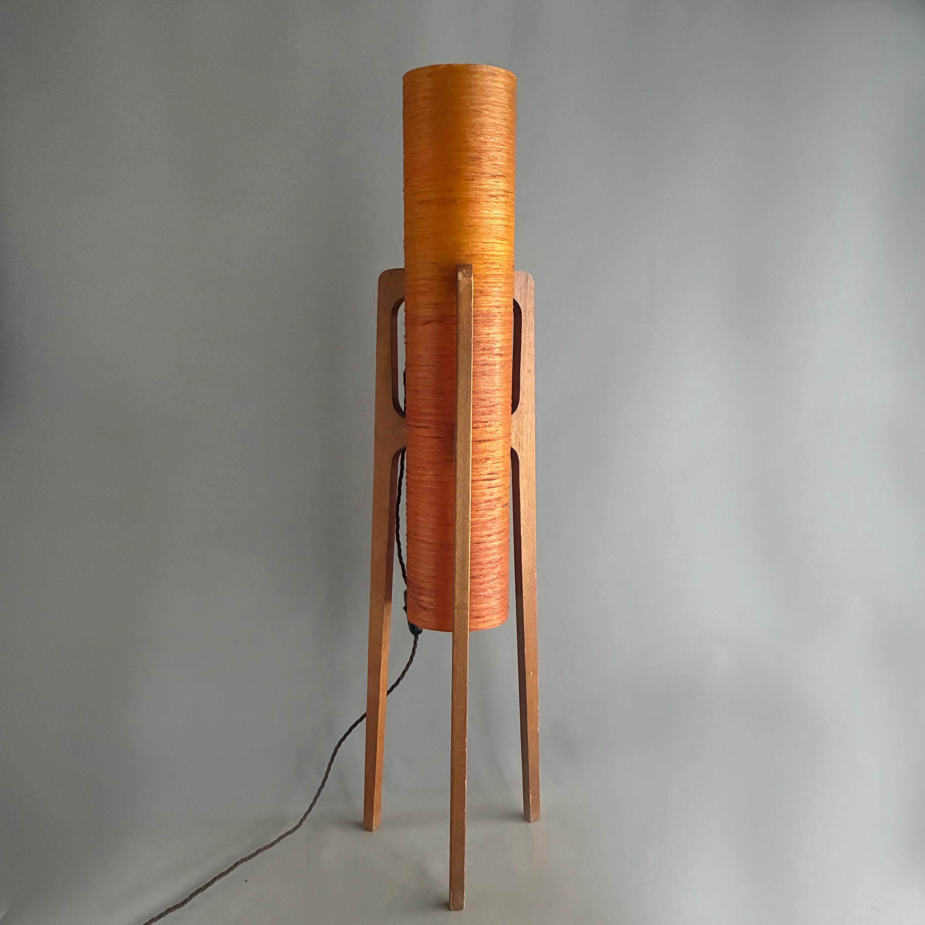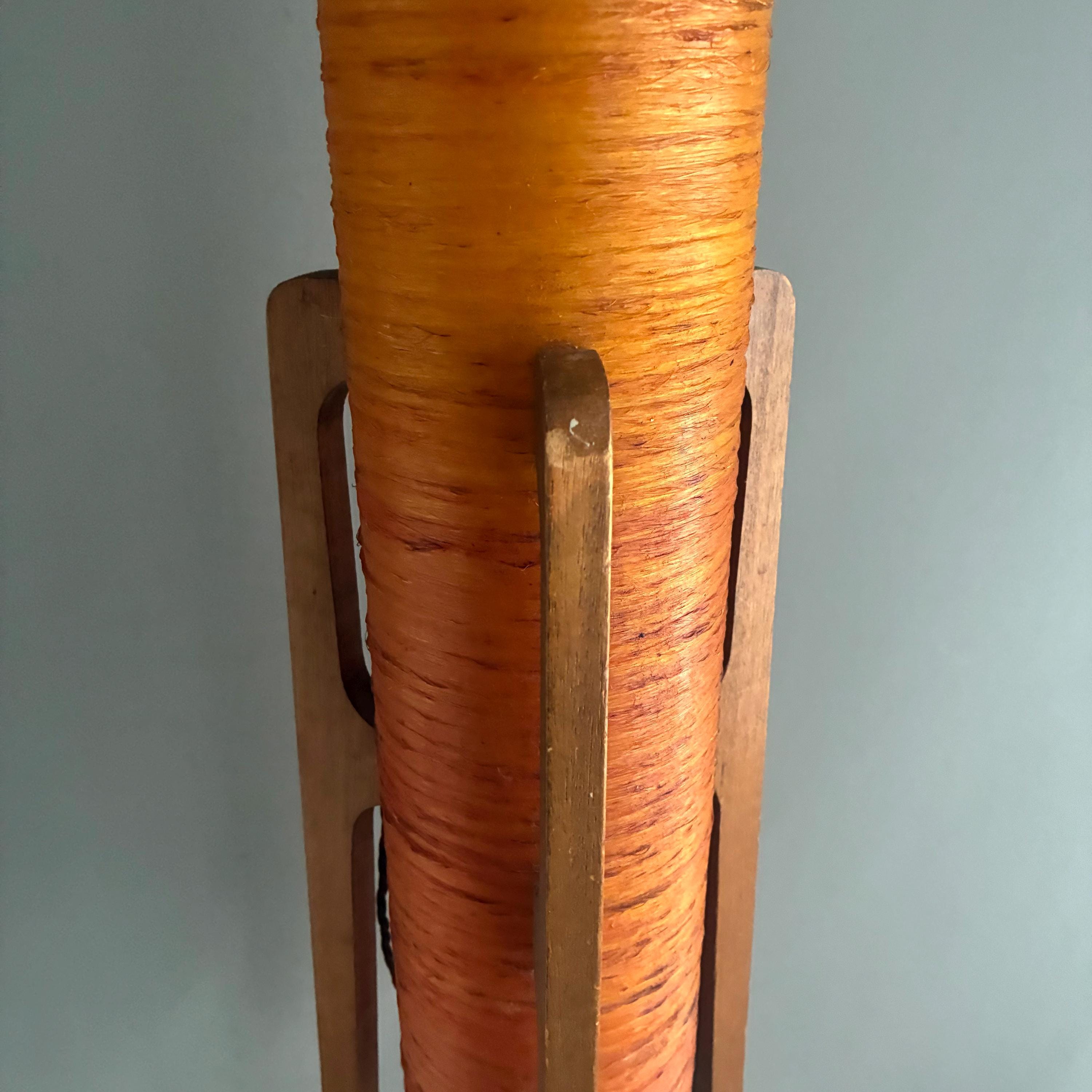 A iconic mid-century "rocket" floor lamp. The futuristic design was inspired by the beginning of space exploration in the 1950s. Featuring an orange spun fiberglass or string-wrapped cylindrical shade and wooden tripod base. Popular in the 1960s and 1970s and are associated with the Space Age and Danish Modern design movements.