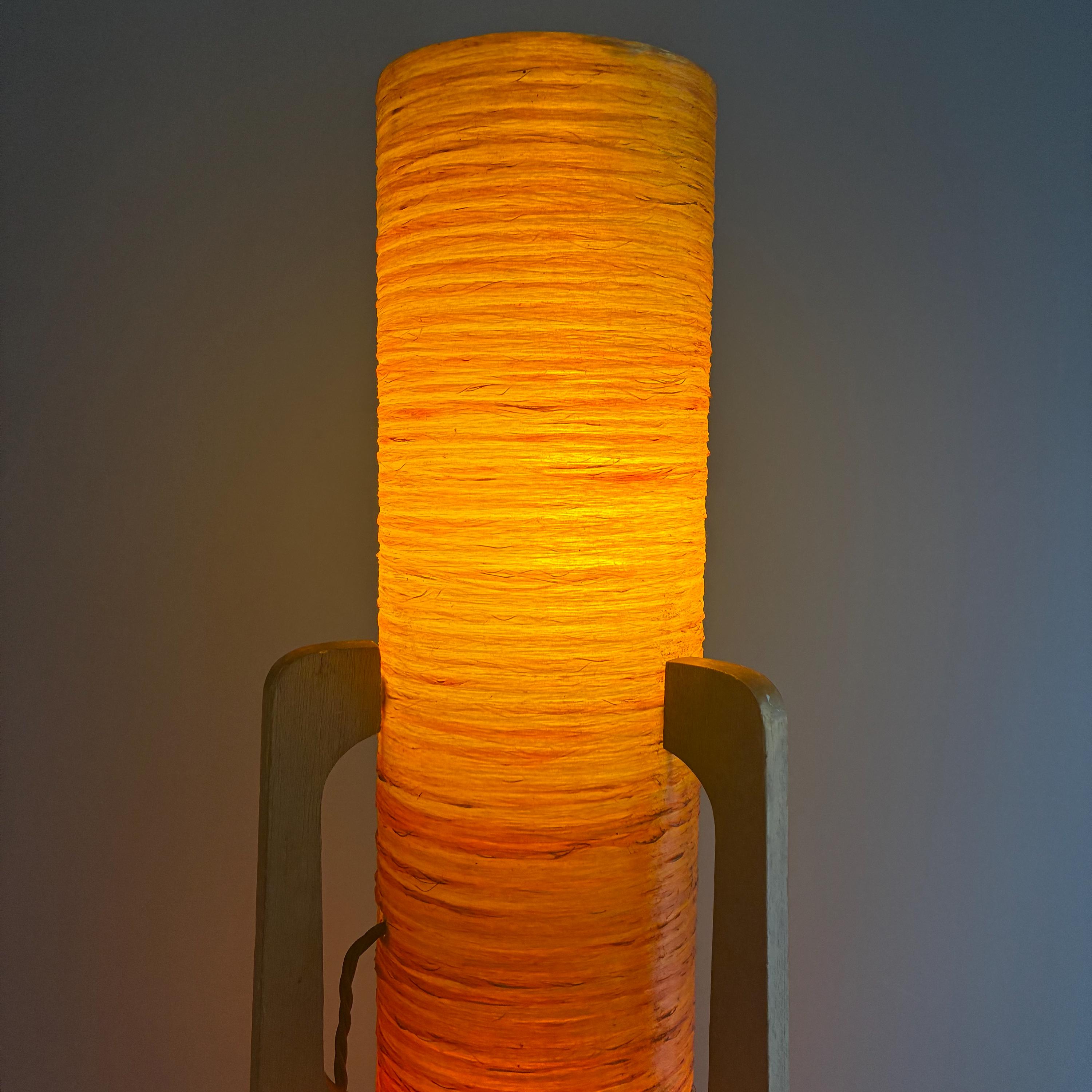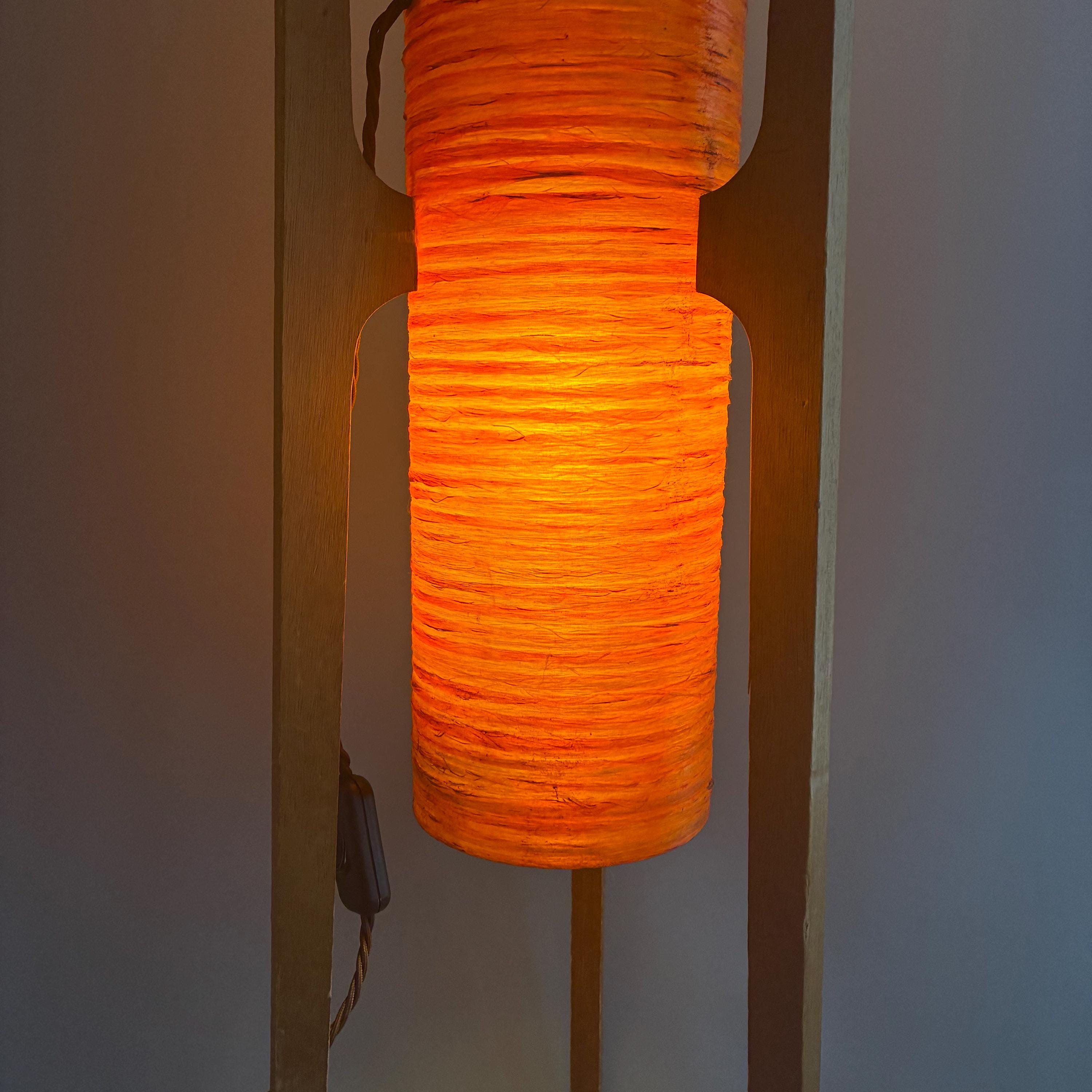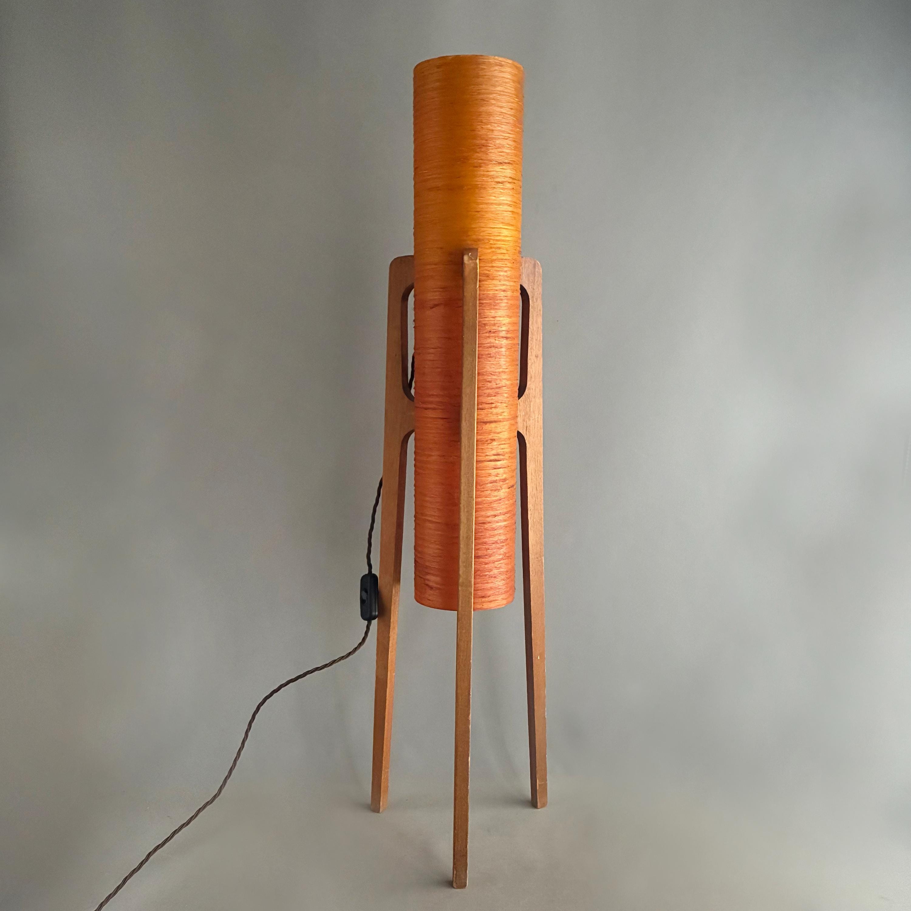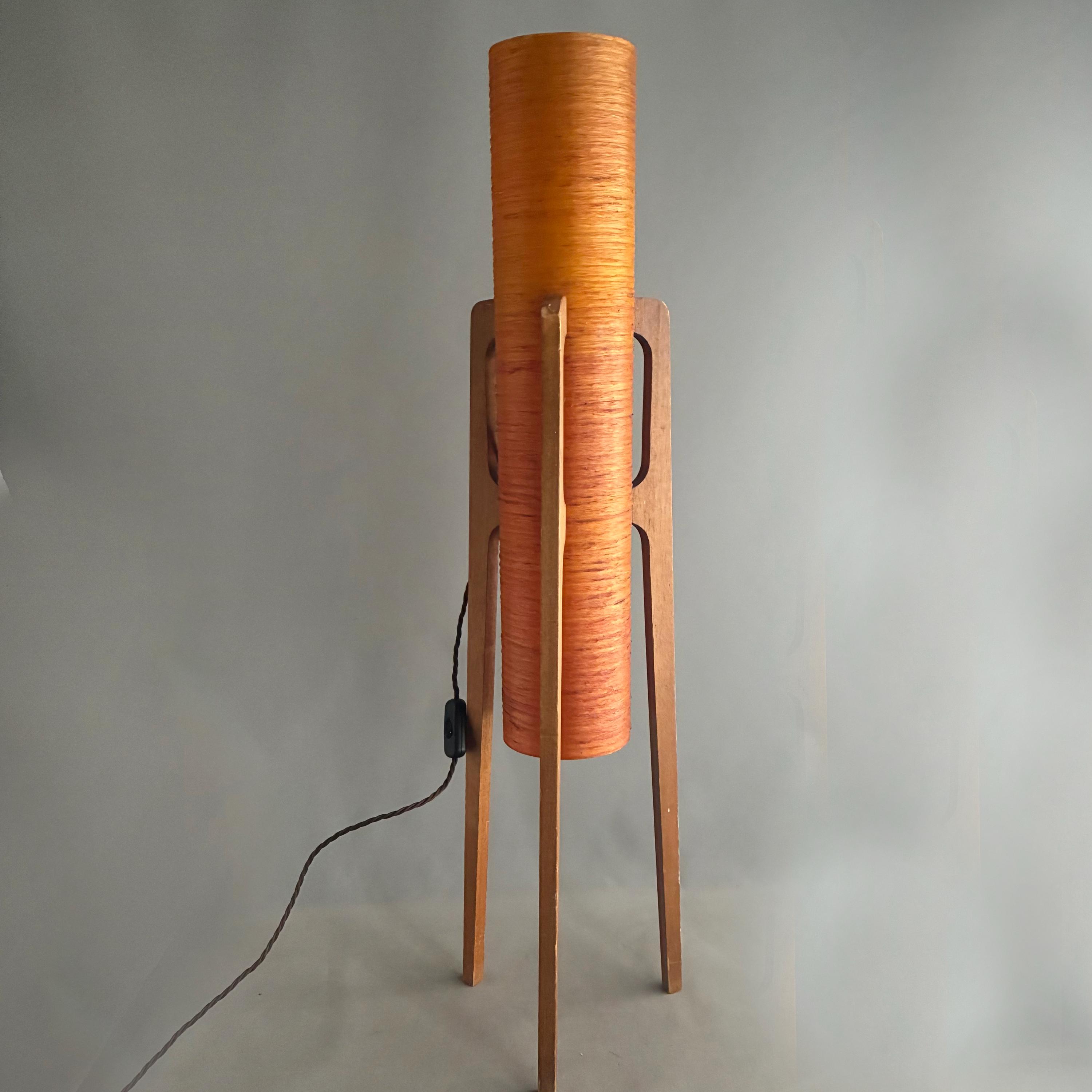 A iconic mid-century "rocket" floor lamp. The futuristic design was inspired by the beginning of space exploration in the 1950s. Featuring an orange spun fiberglass or string-wrapped cylindrical shade and wooden tripod base. Popular in the 1960s and 1970s and are associated with the Space Age and Danish Modern design movements.