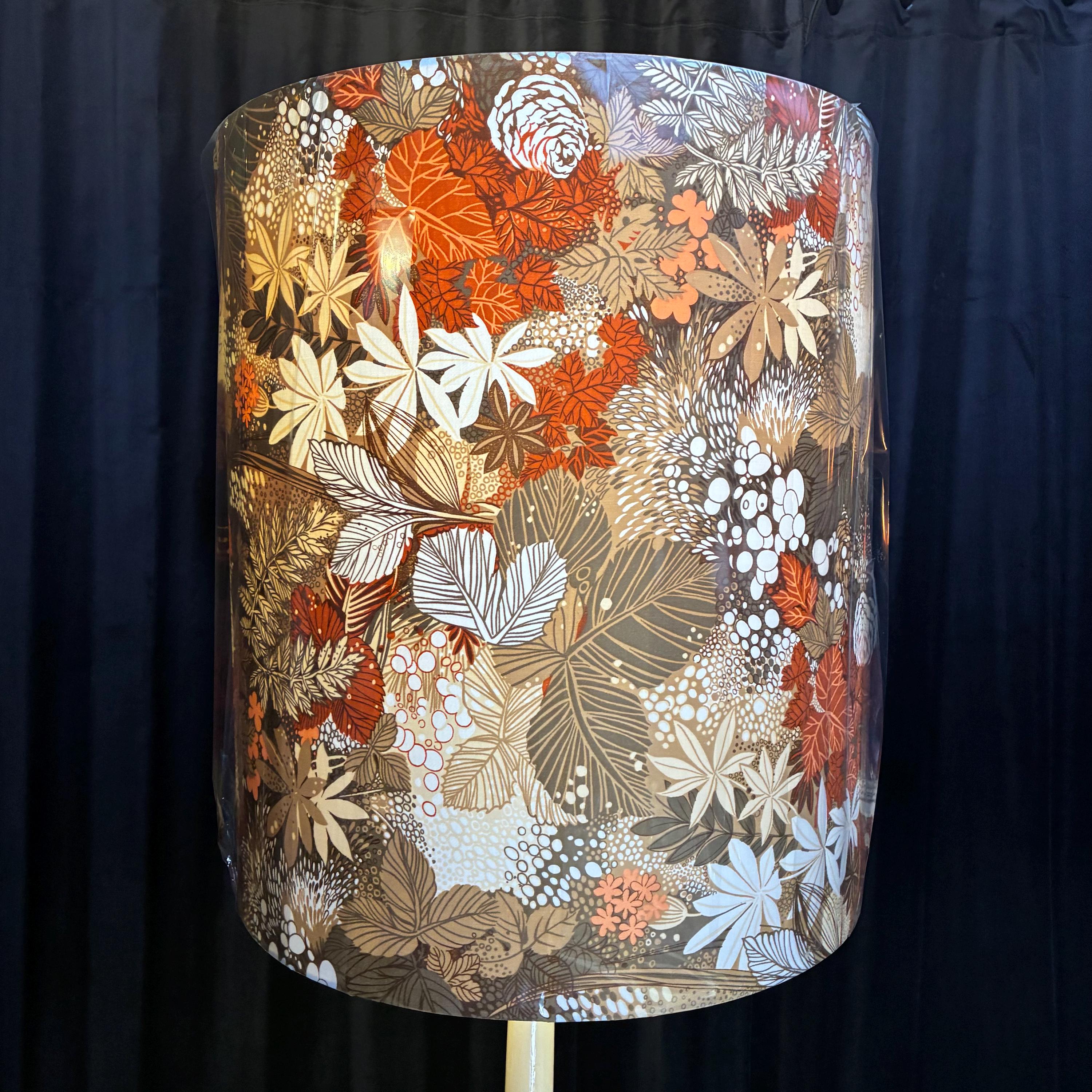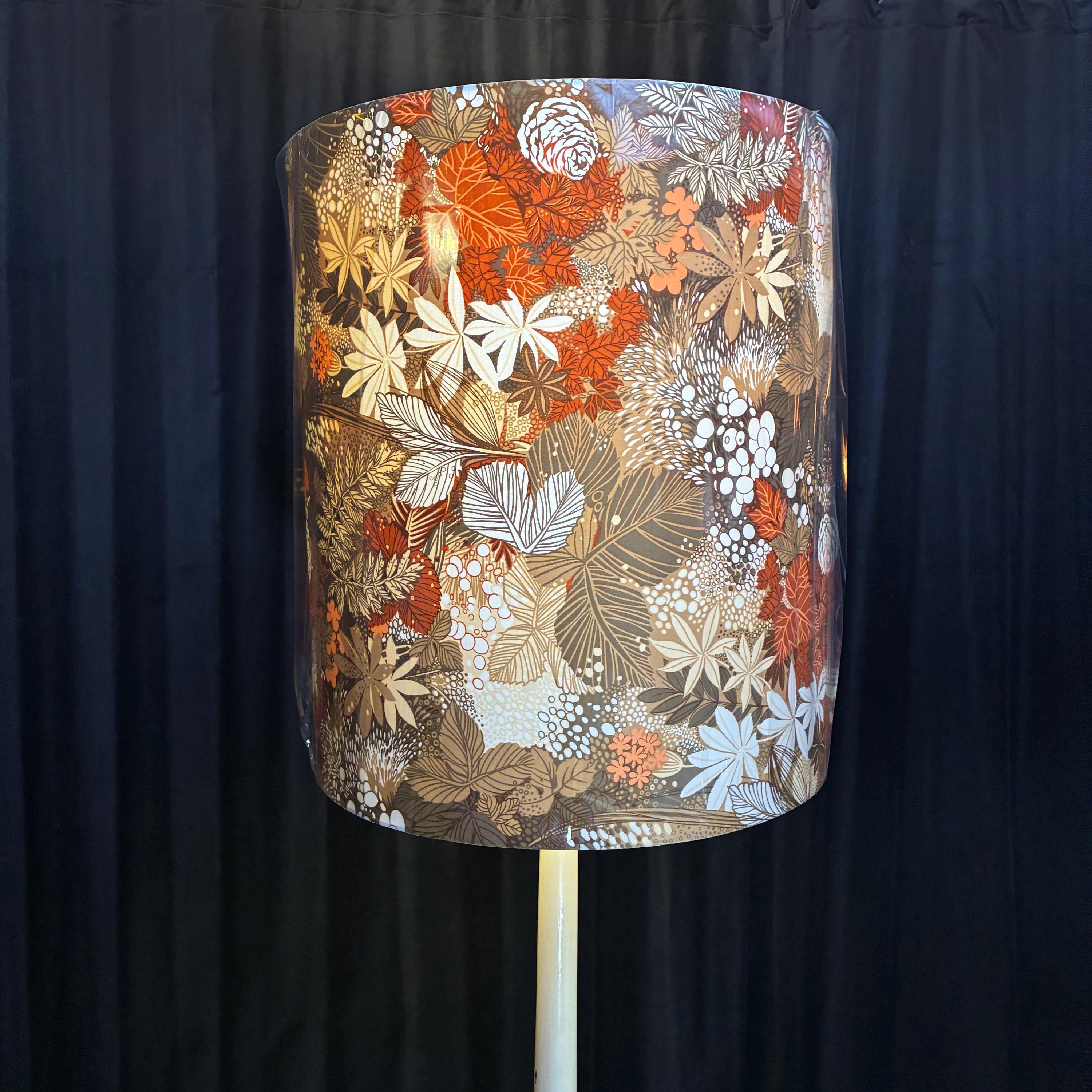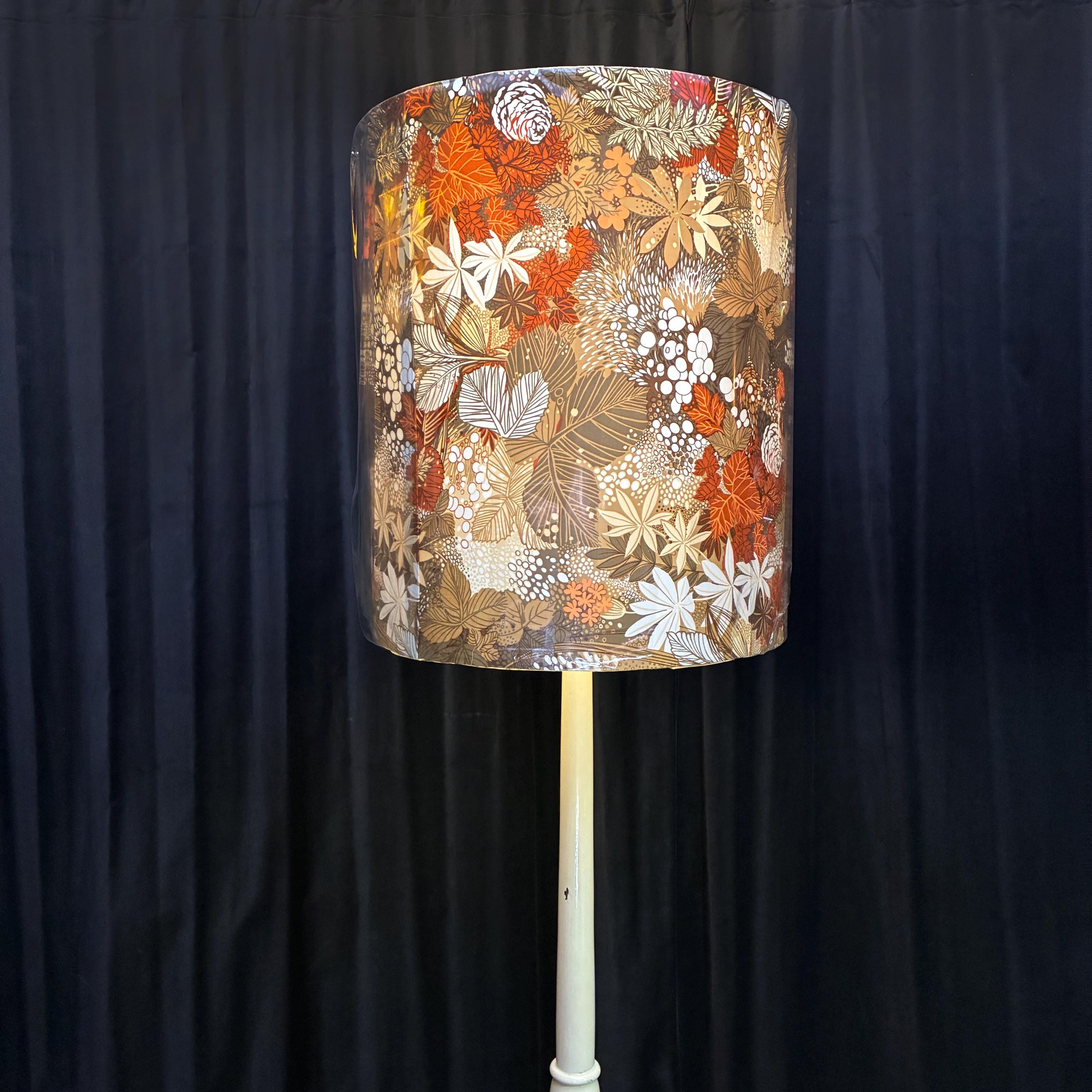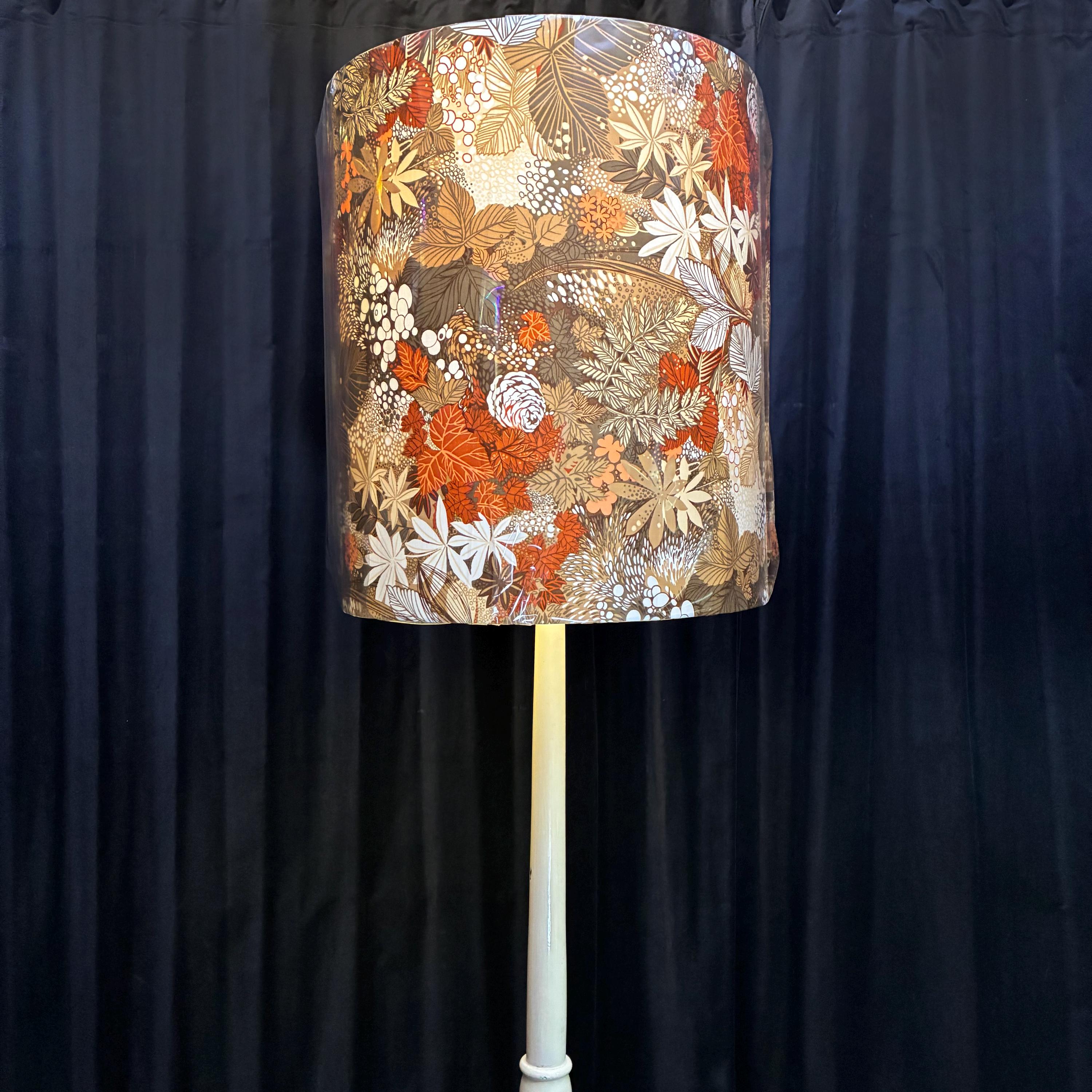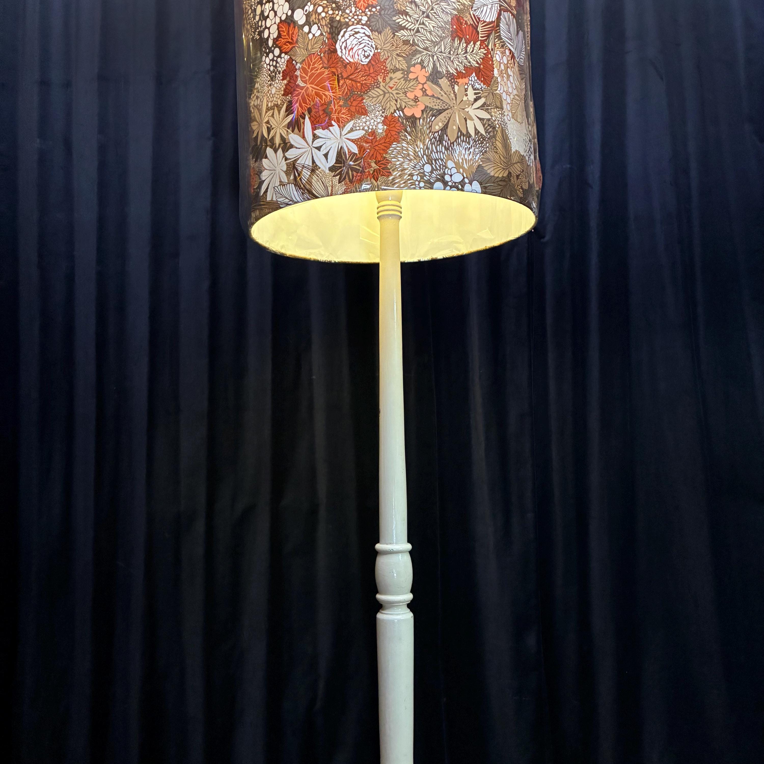A vintage Standard lamp with large floral patterned drum lampshade. Painted solid turned wood base, with A large fabric shade made from 1970s cotton textile featuring an autumnal , warm-toned floral / botanical pattern ( Autumn Leaf Foliage Lyndhurst by Grafton vintage fabric in orange and brown tones ) Which lights up beautifully and illuminates the colours in the textiles print