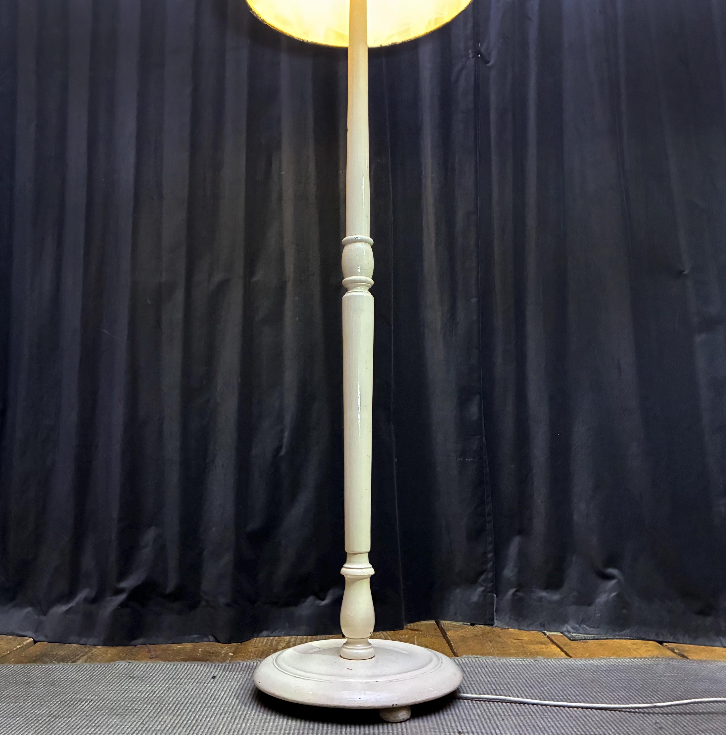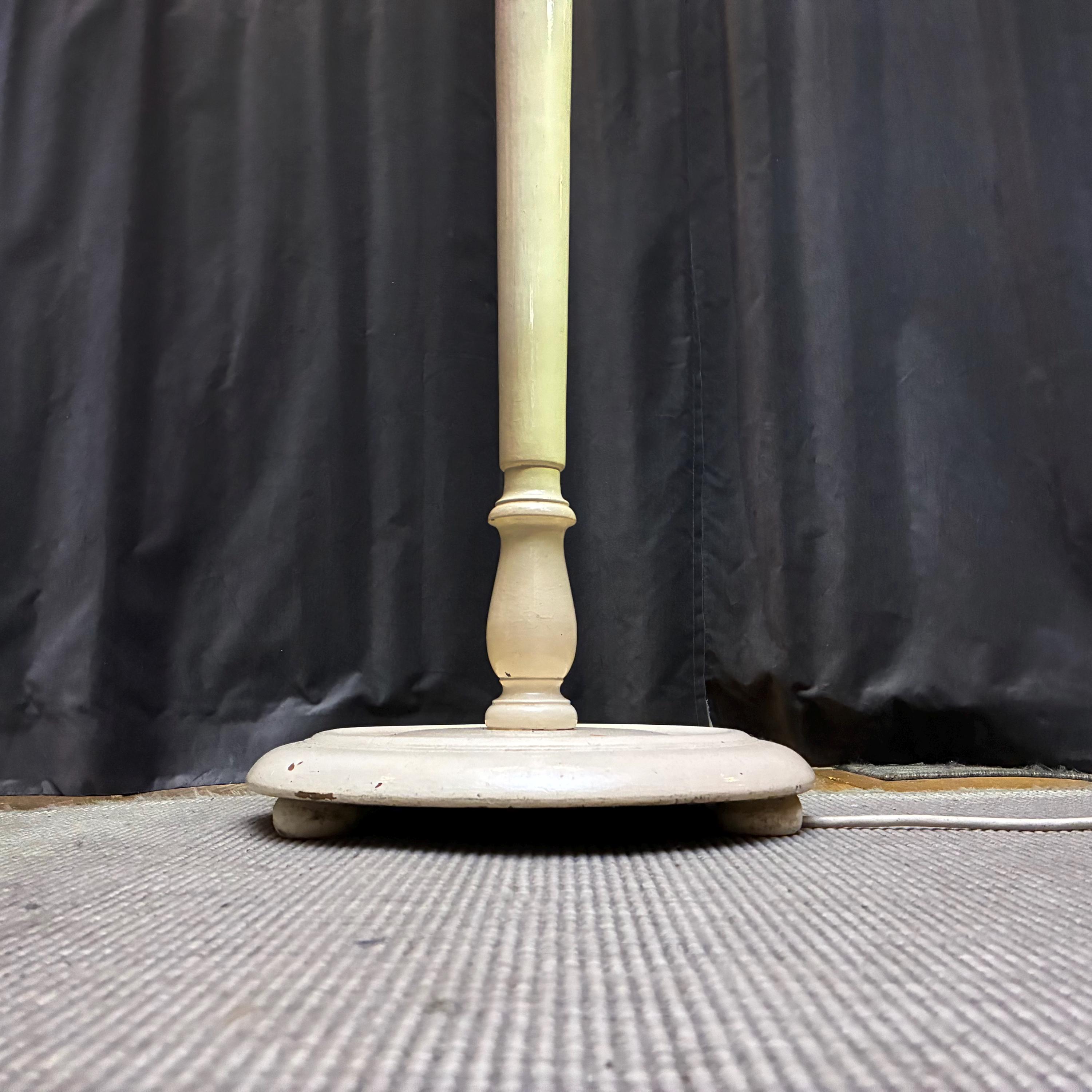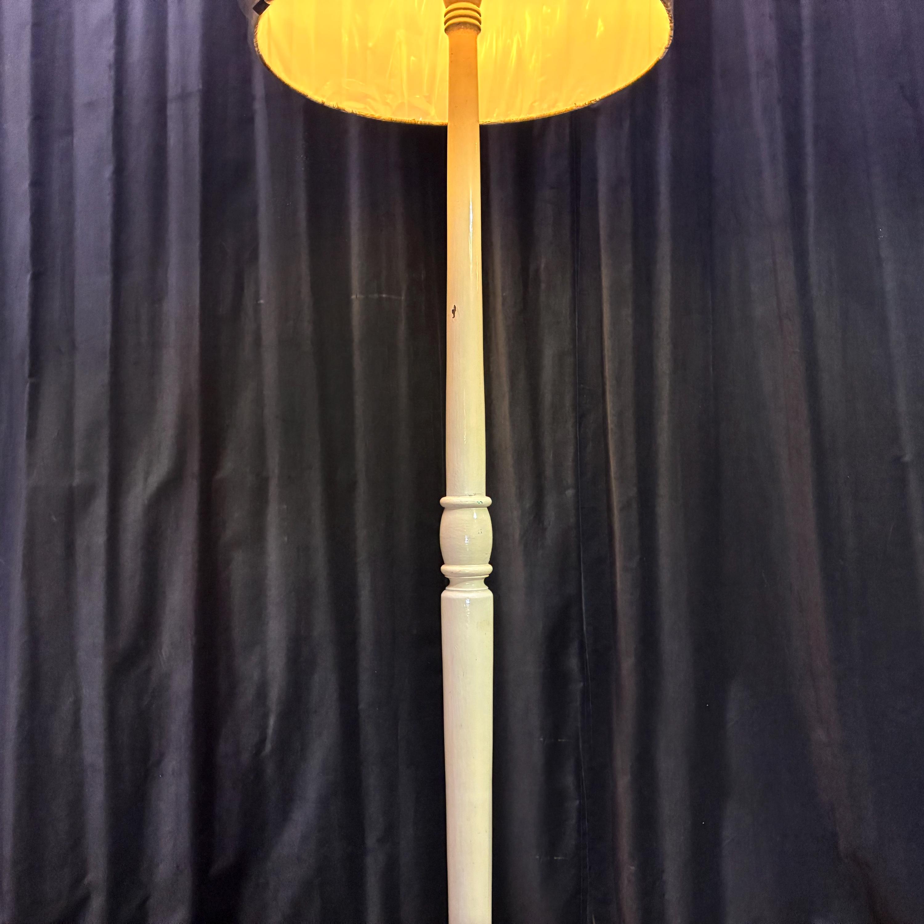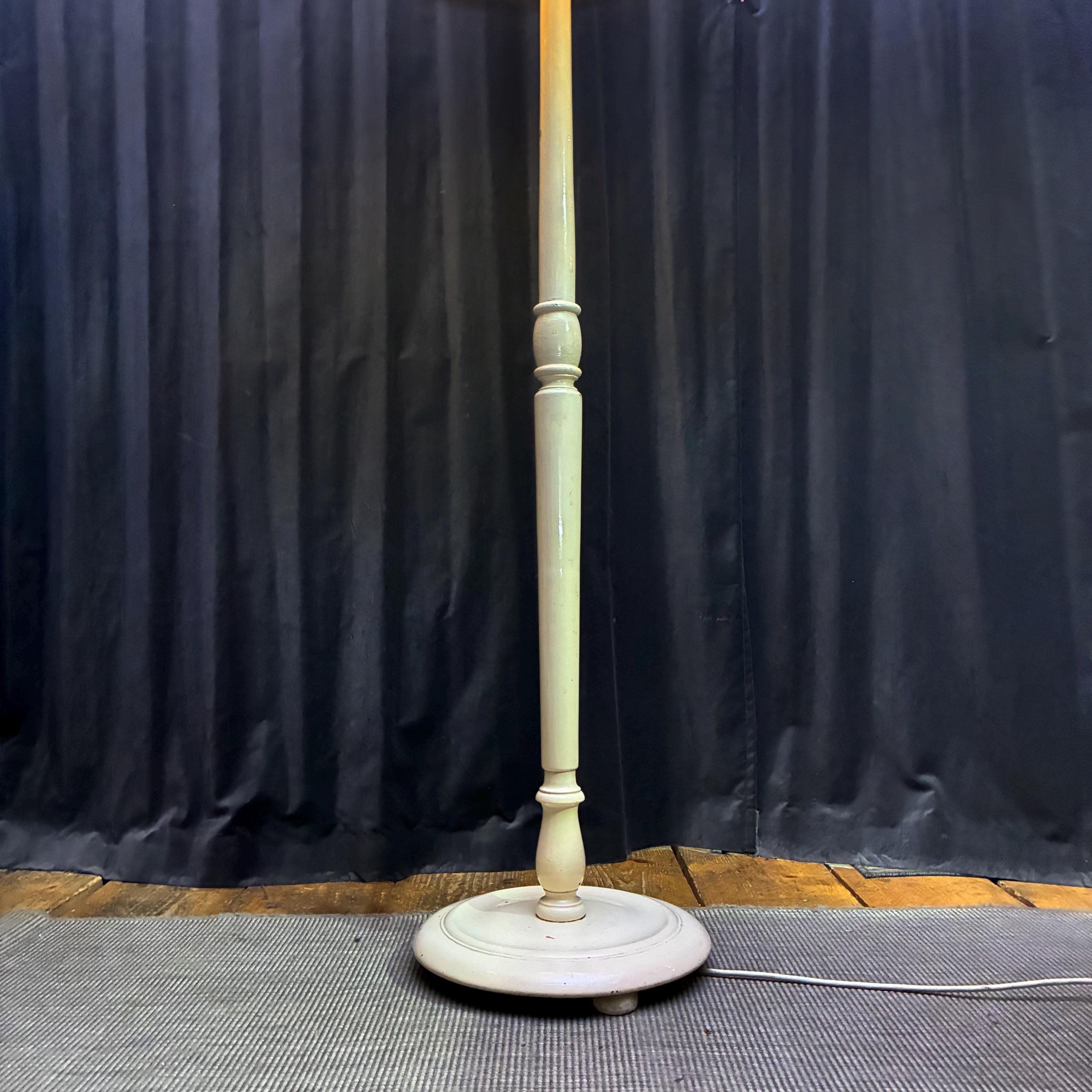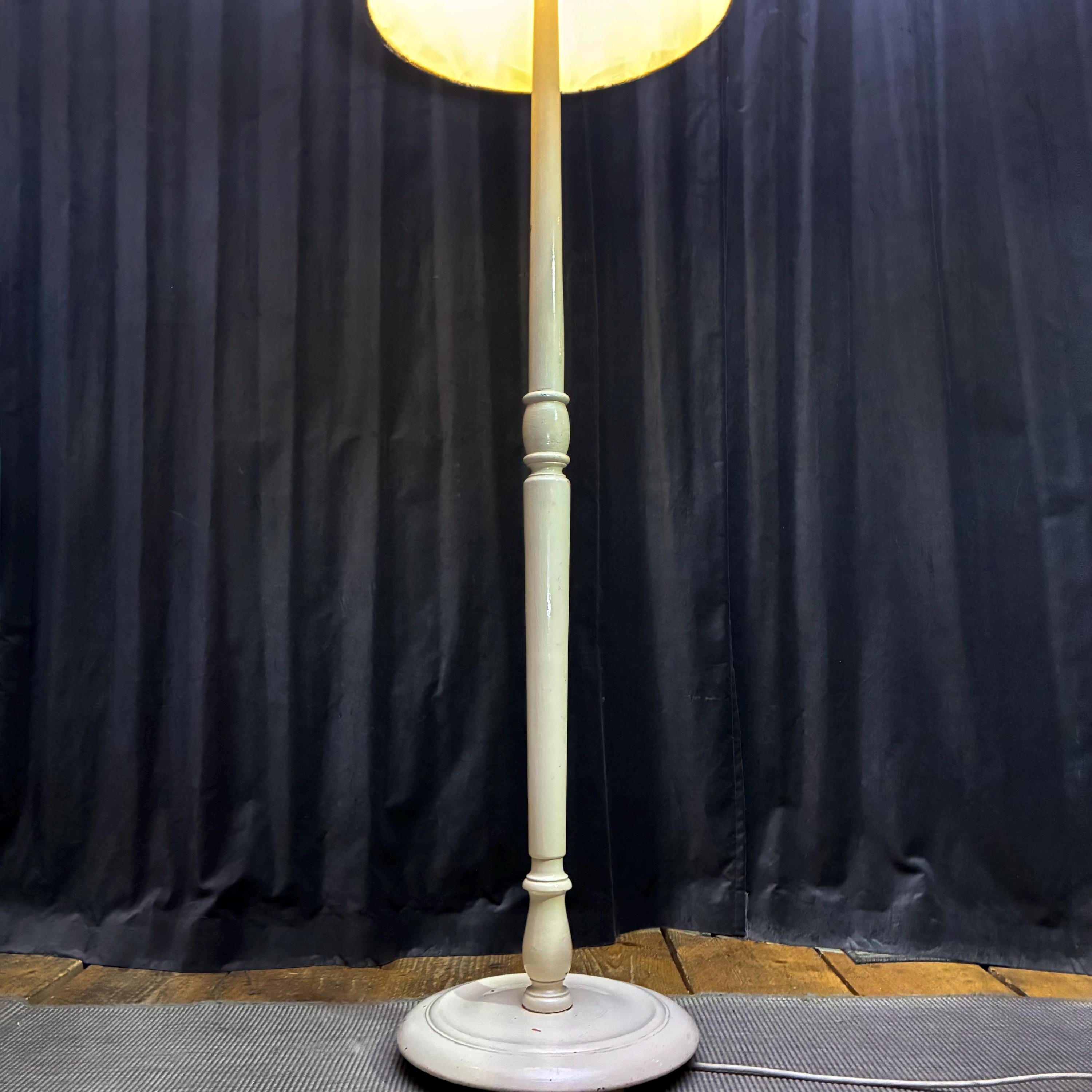 The base is a turned wooden post, painted in a cream or off-white color. with shabby chic scuffs to the paint work . A classic floor lamp that will light up a corner. Postage is an estimate please send your address for acurate cost . Due to size this is U.K only