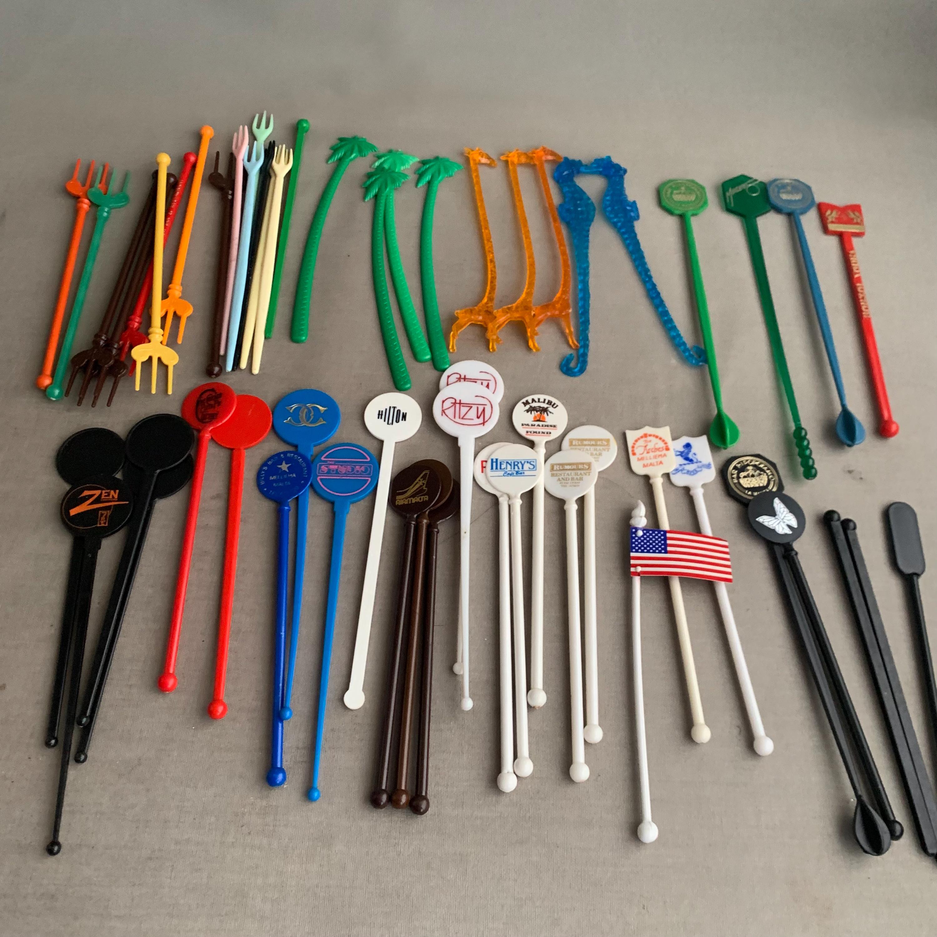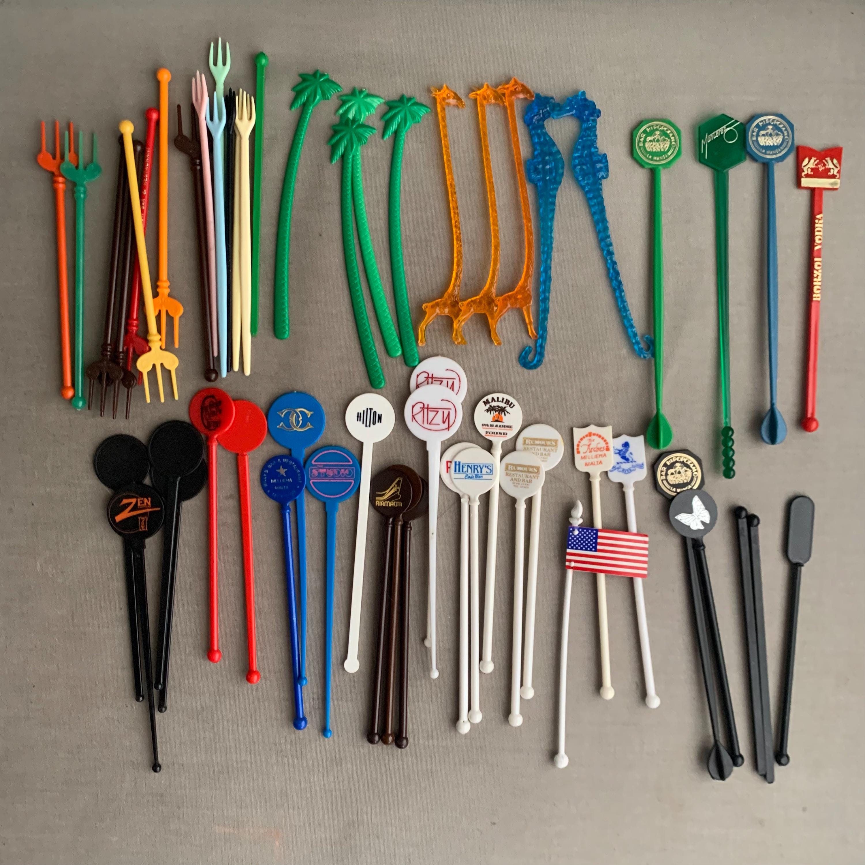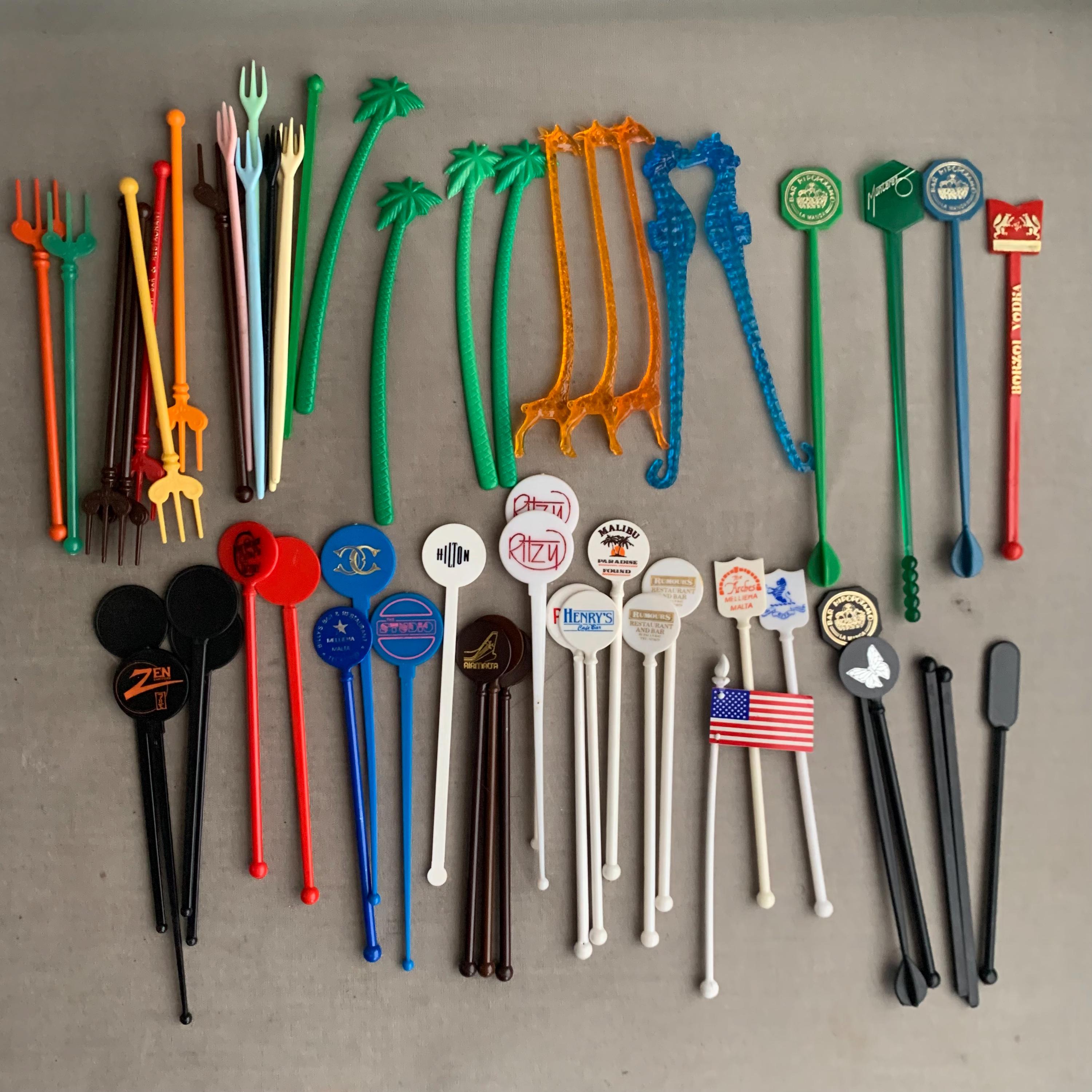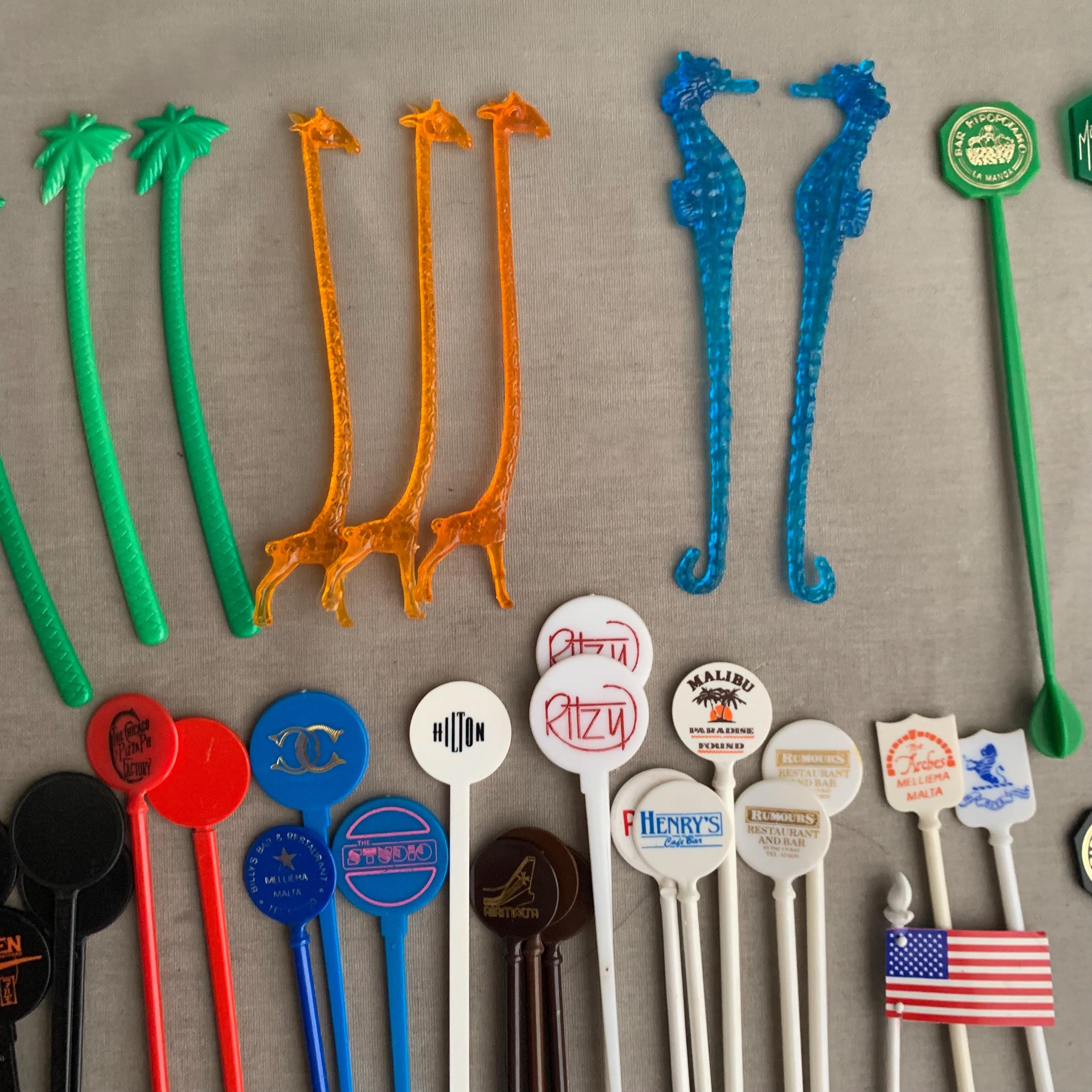 These plastic drink stirrers are quirky collectible barware, dating from the 1960s to 1980s.