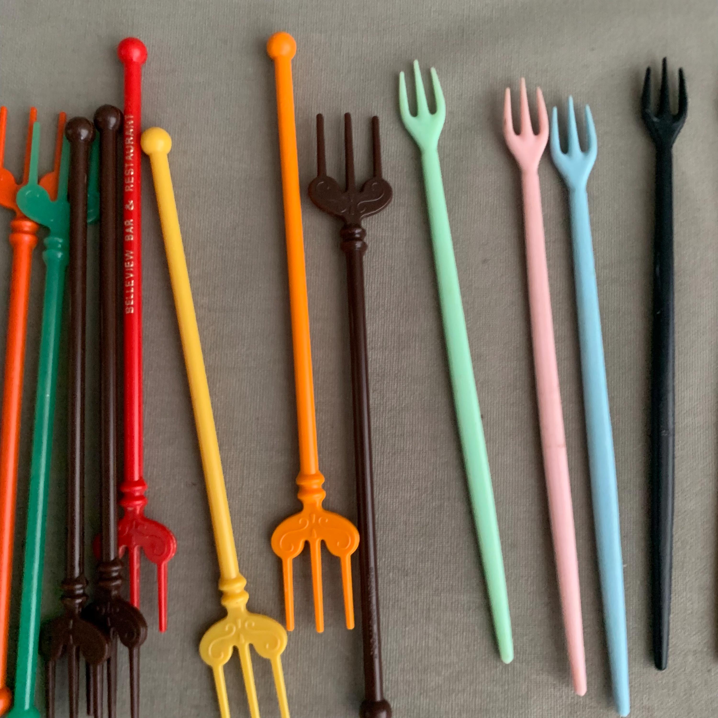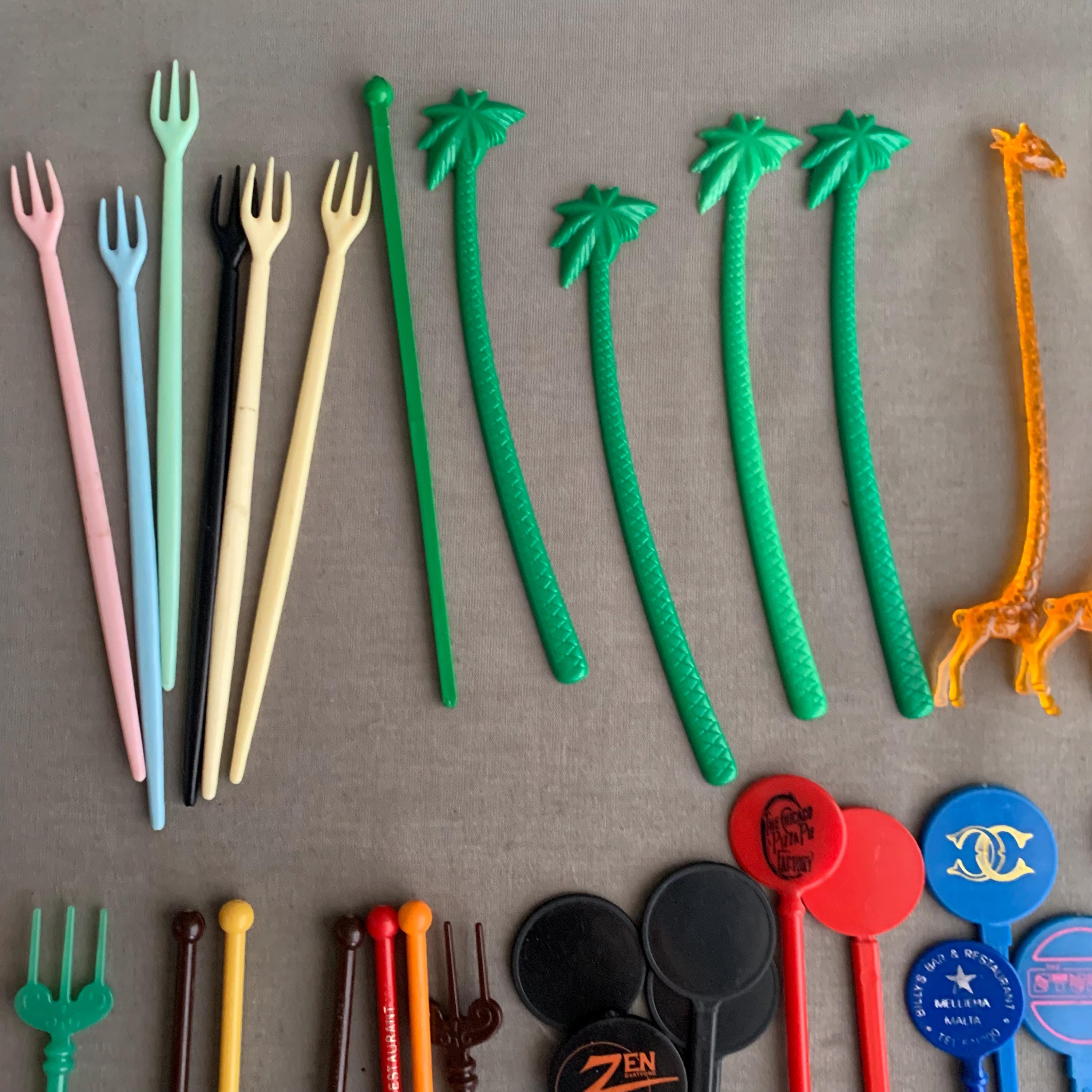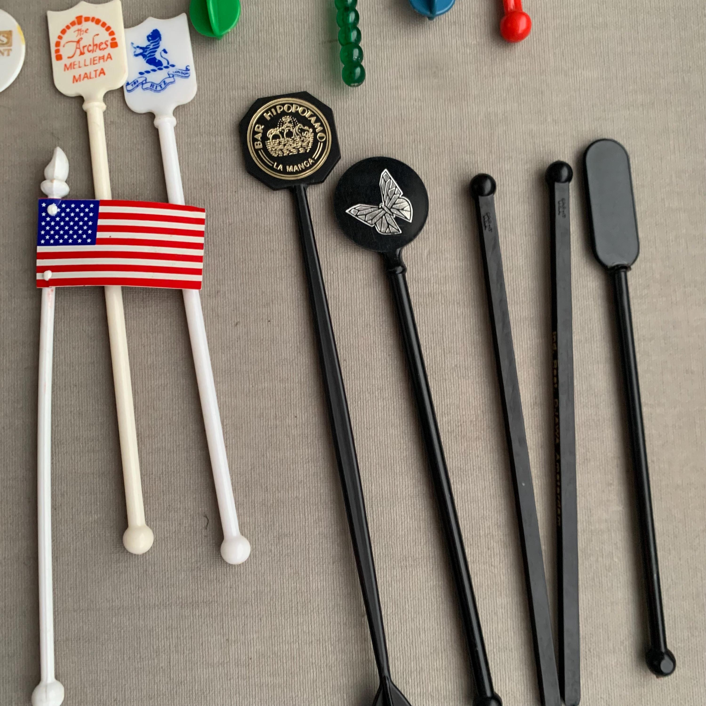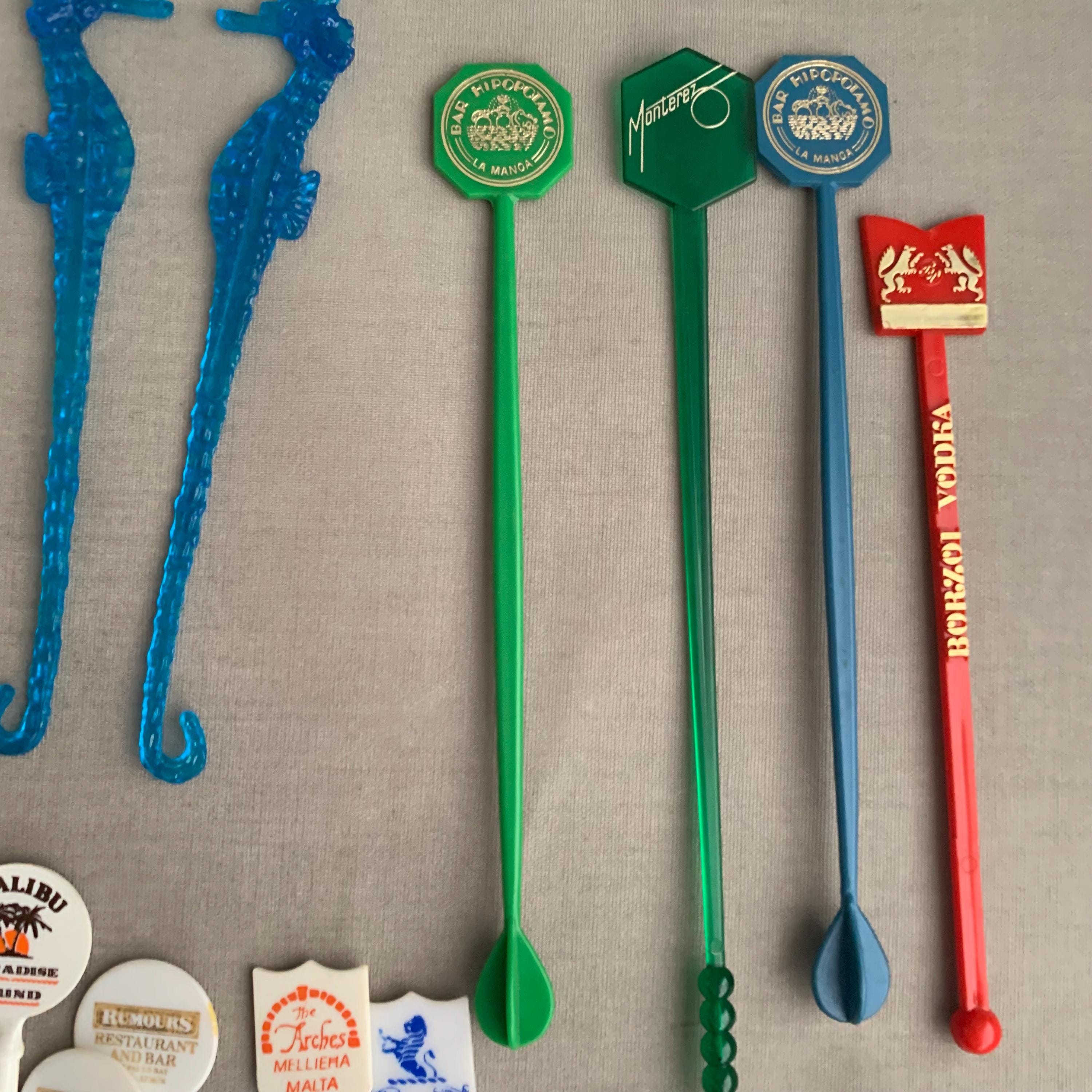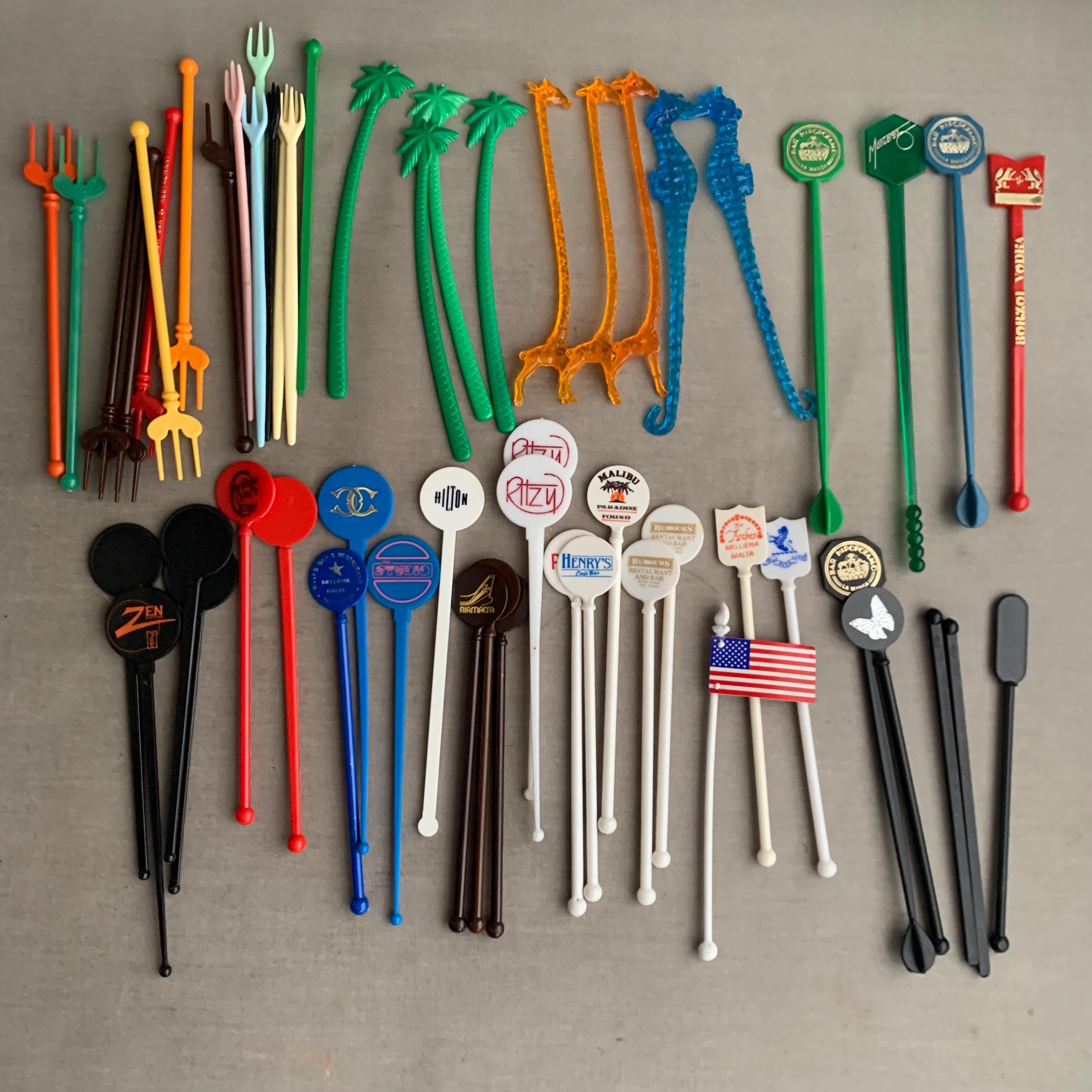 These plastic drink stirrers are quirky collectible barware, dating from the 1960s to 1980s.