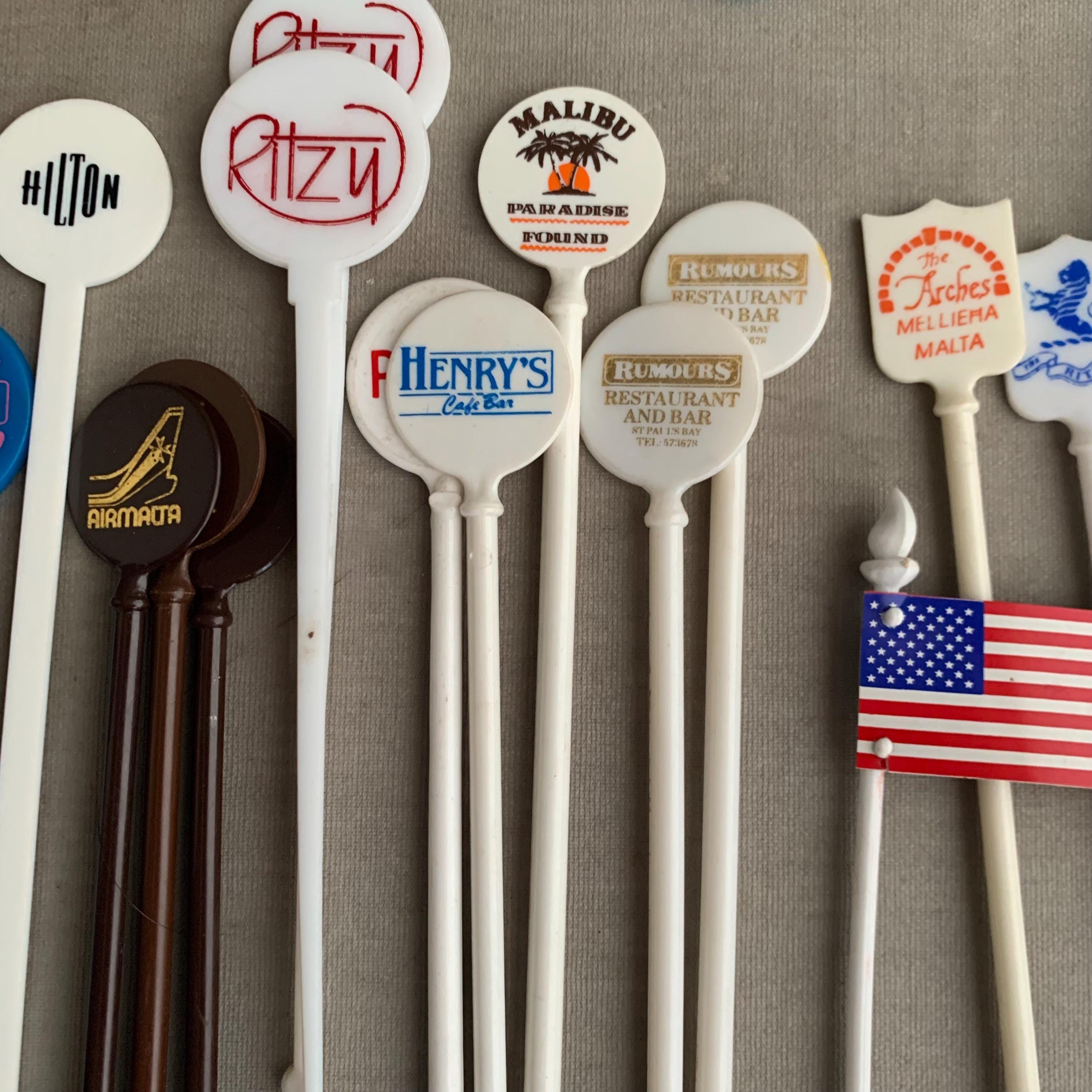 Many of the sticks feature branding from different venues, hotels, and liquor companies, such as Hilton, Henry's, Malibu, and Borzoi Vodka.