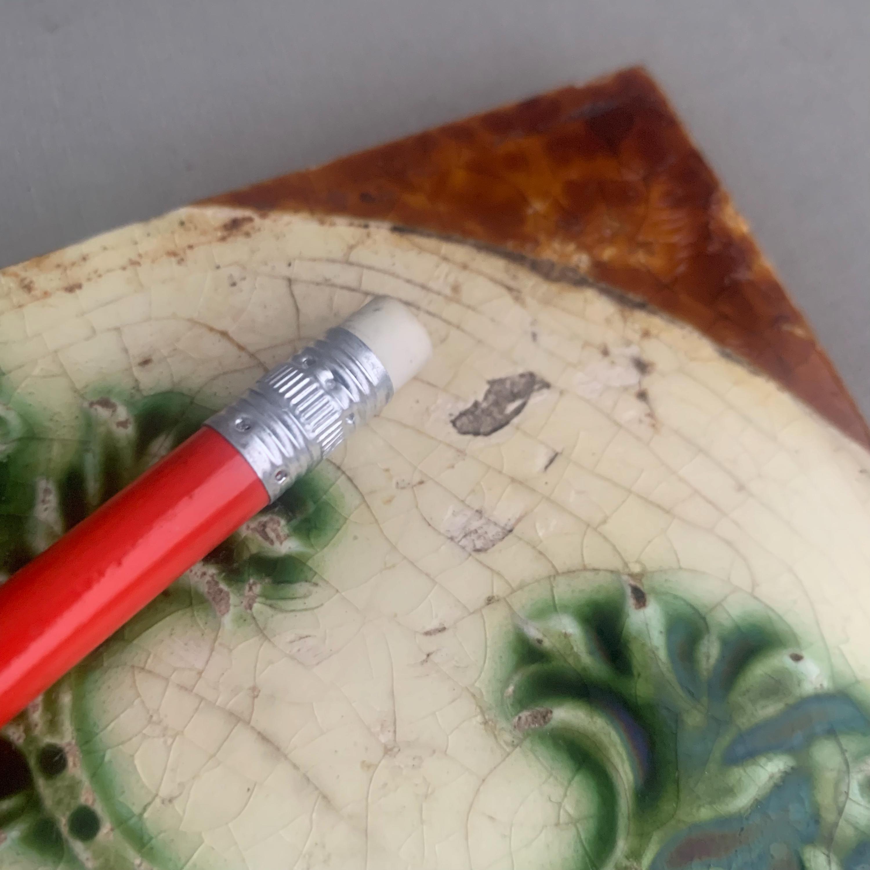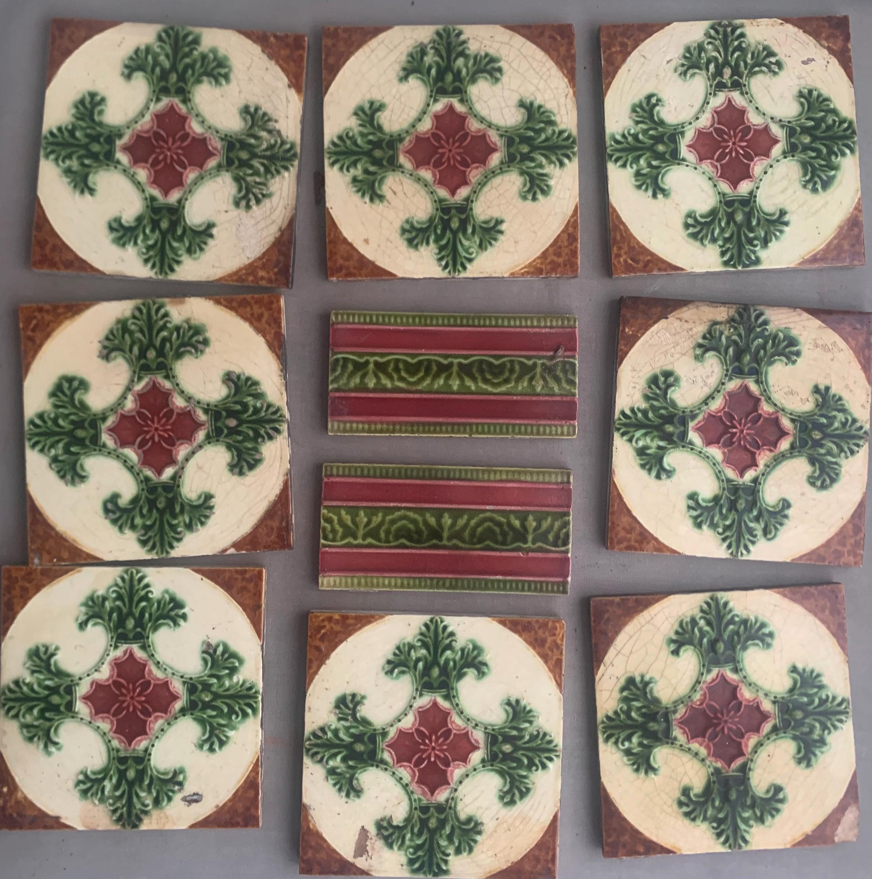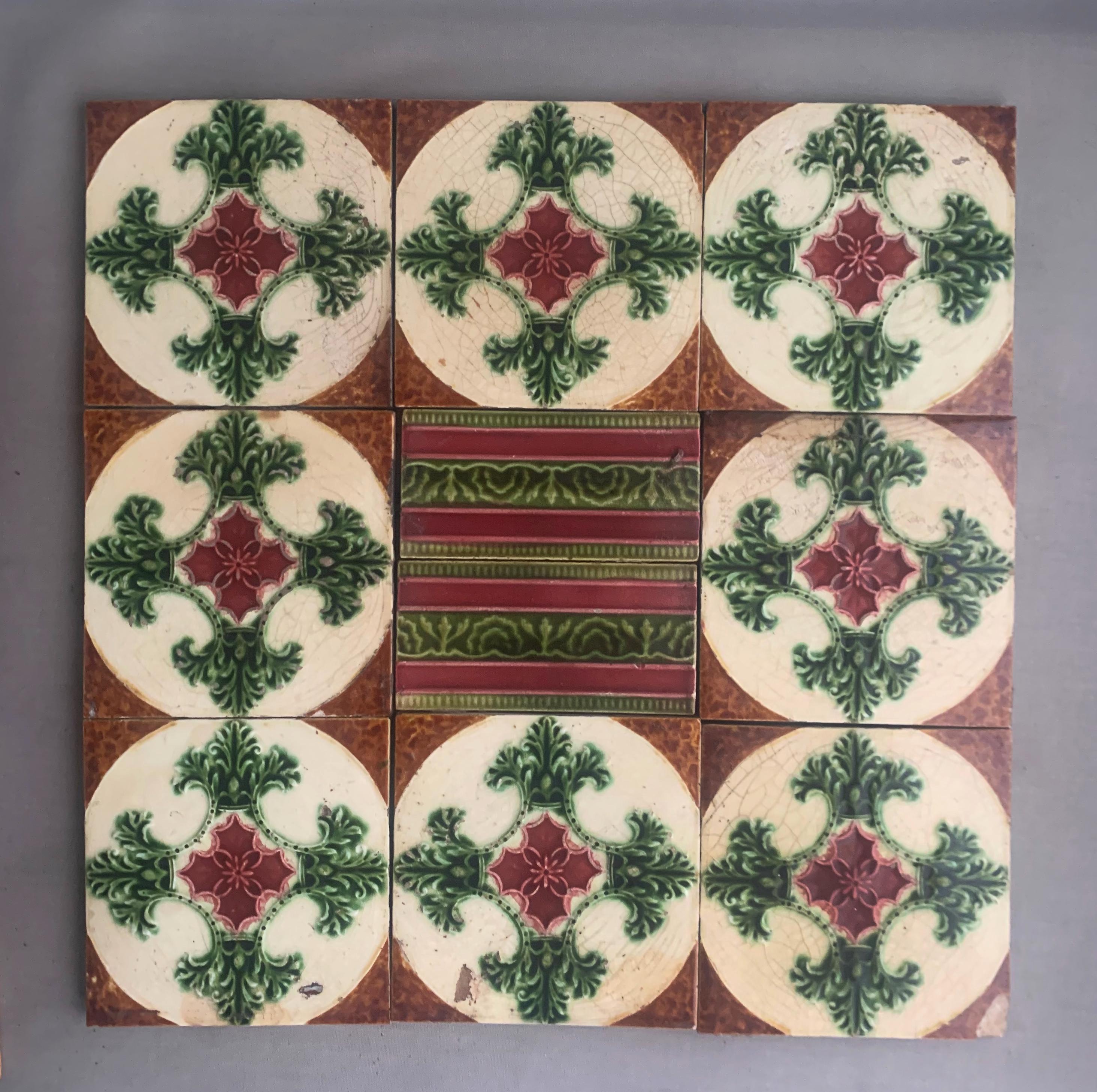Each tile is approximately 6 inches (15 cm) square. Some tiles have damage to the glaze ( see photos ) given their age this is no surprise , they are still solid and very usable and perfect for a victorian home restoration. * square tiles and 2 boarder tiles