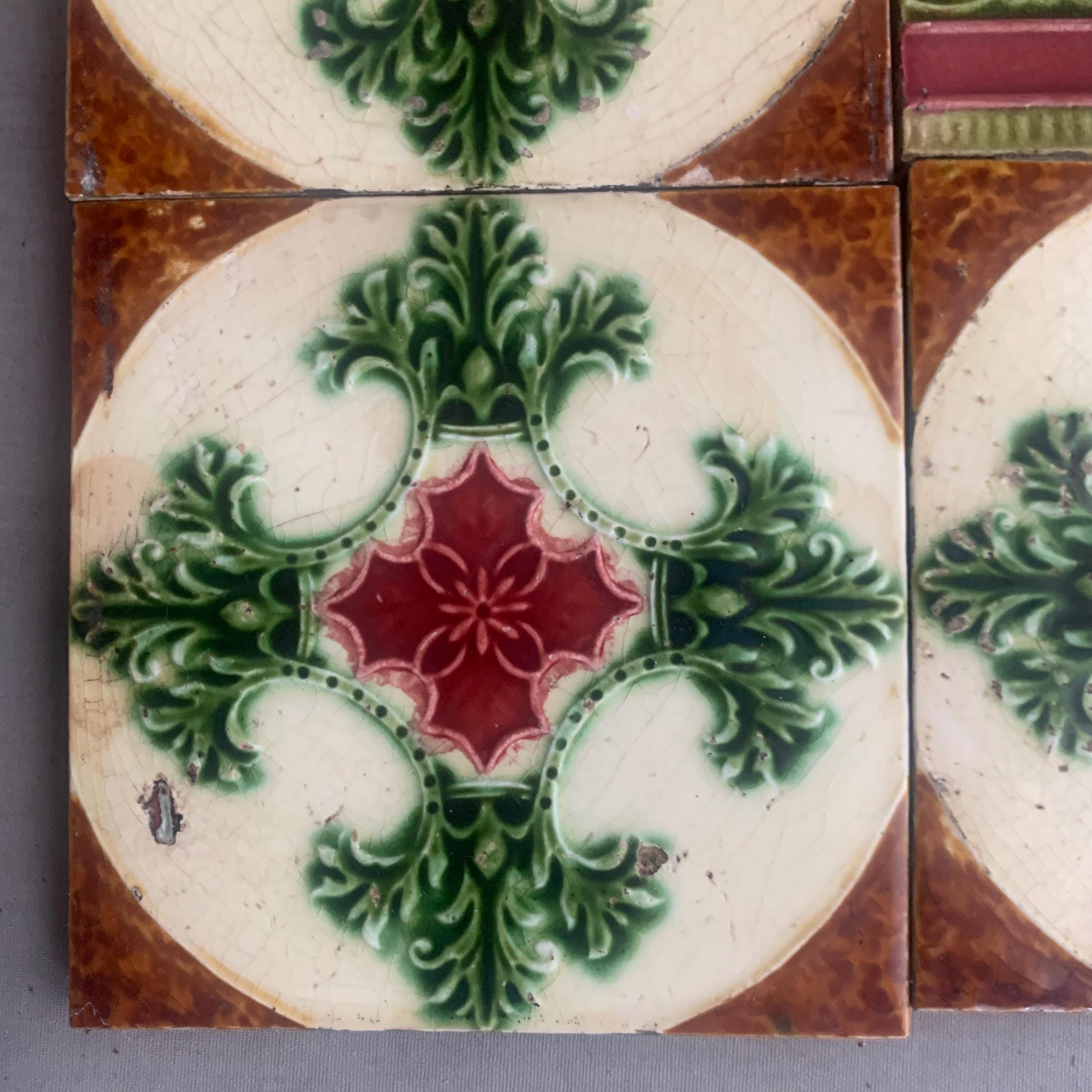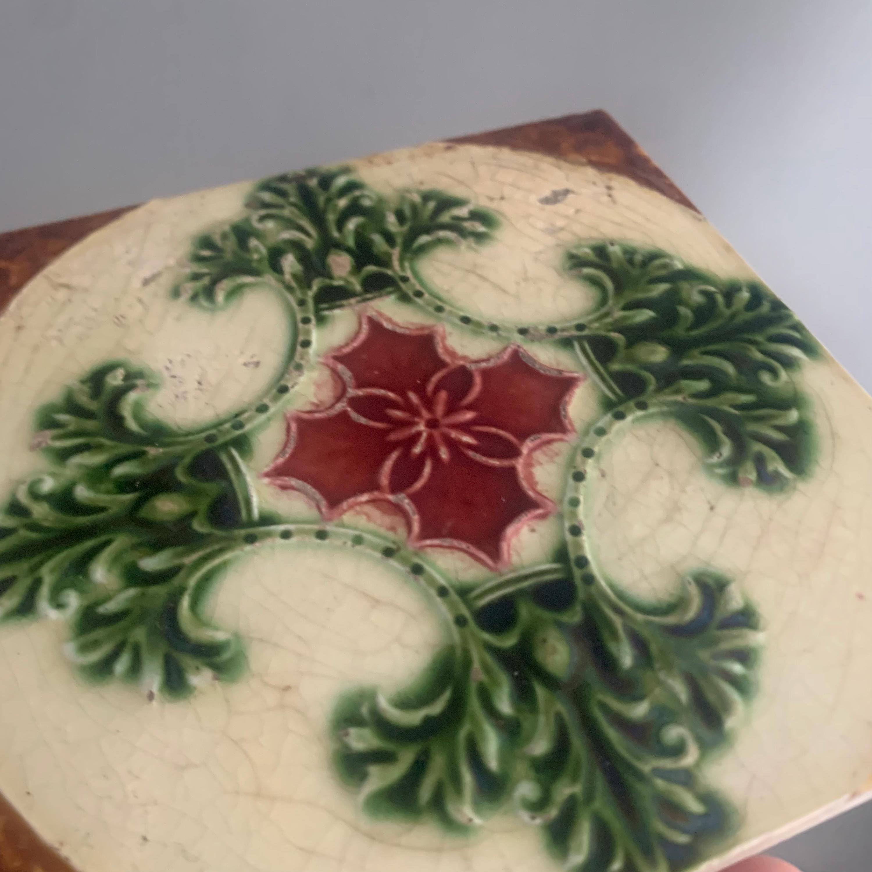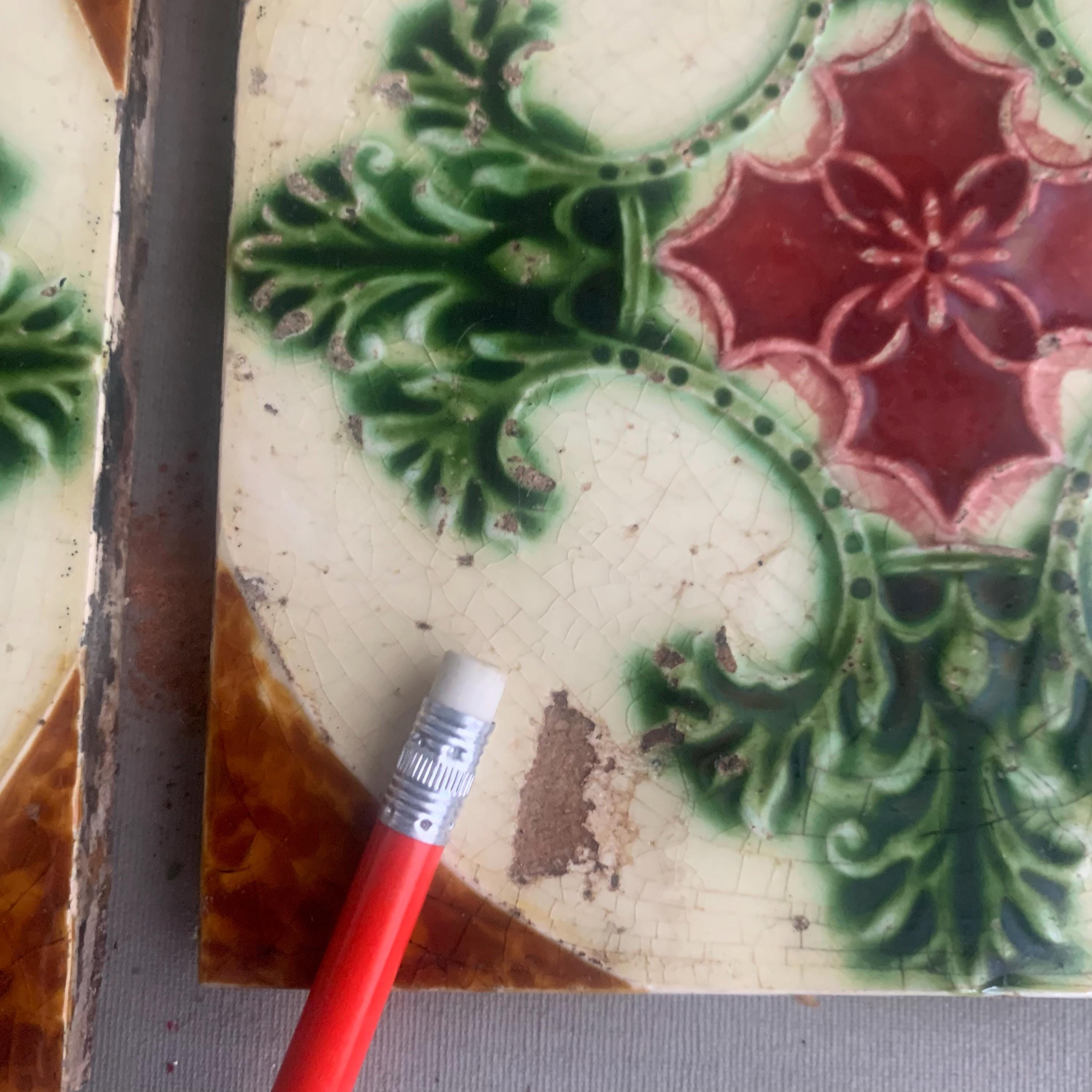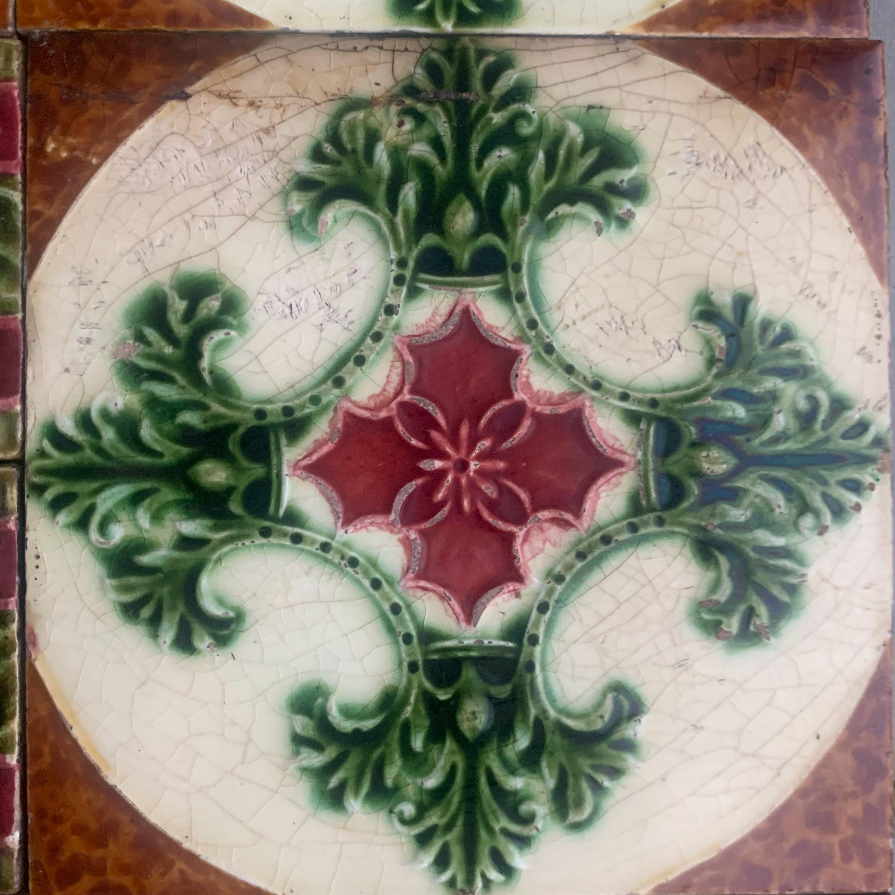 The tiles feature a red and green floral design on a cream-colored background, with a brown border. Majolica style Ceramic Tiles with raised floral details.