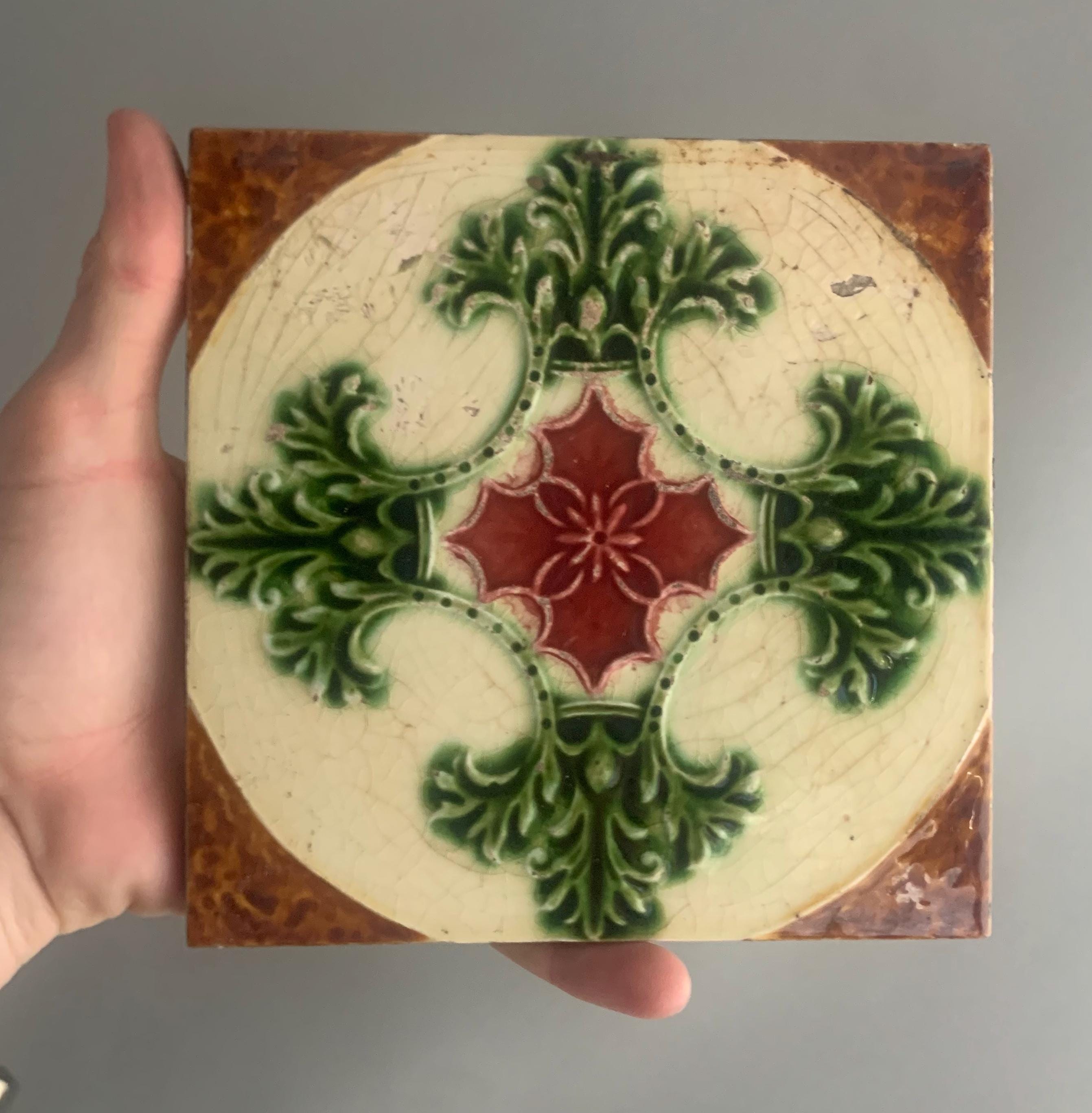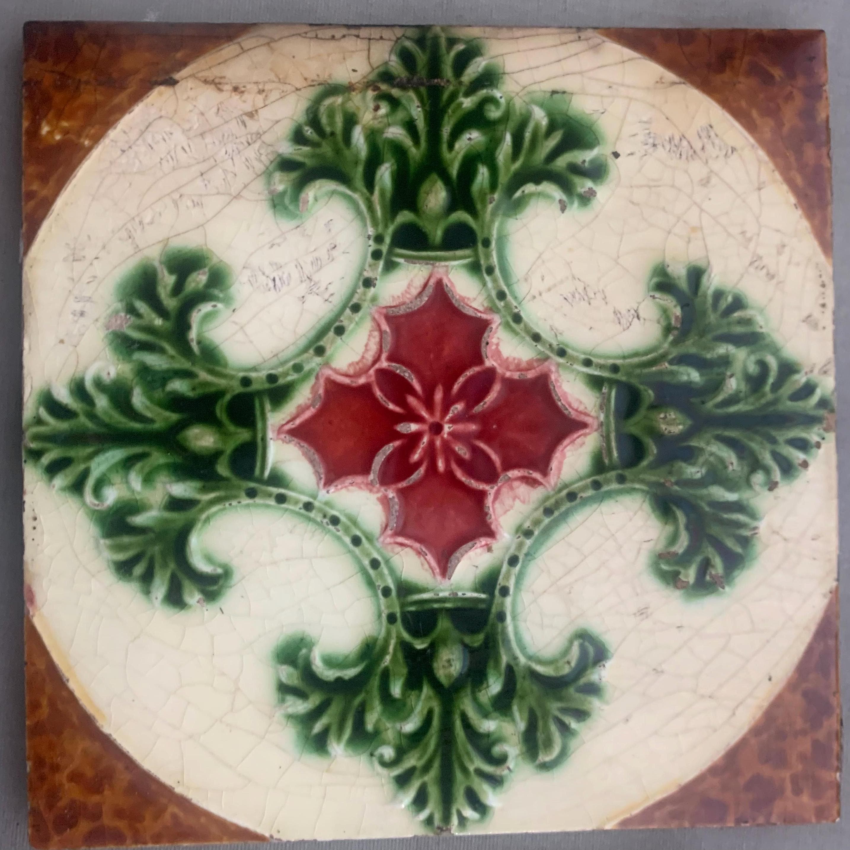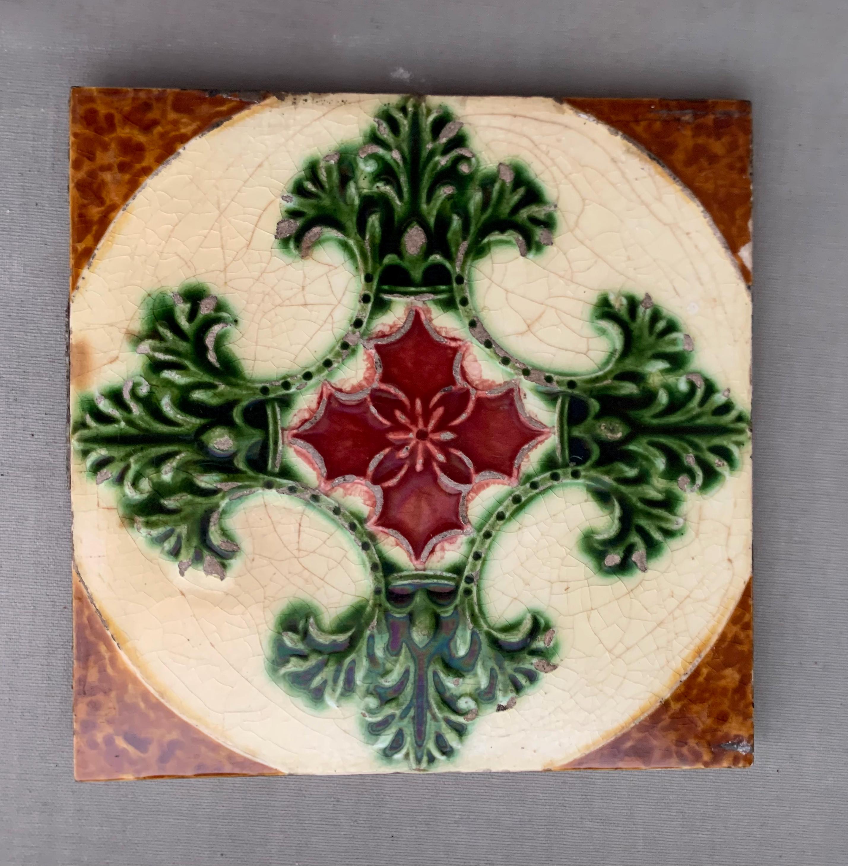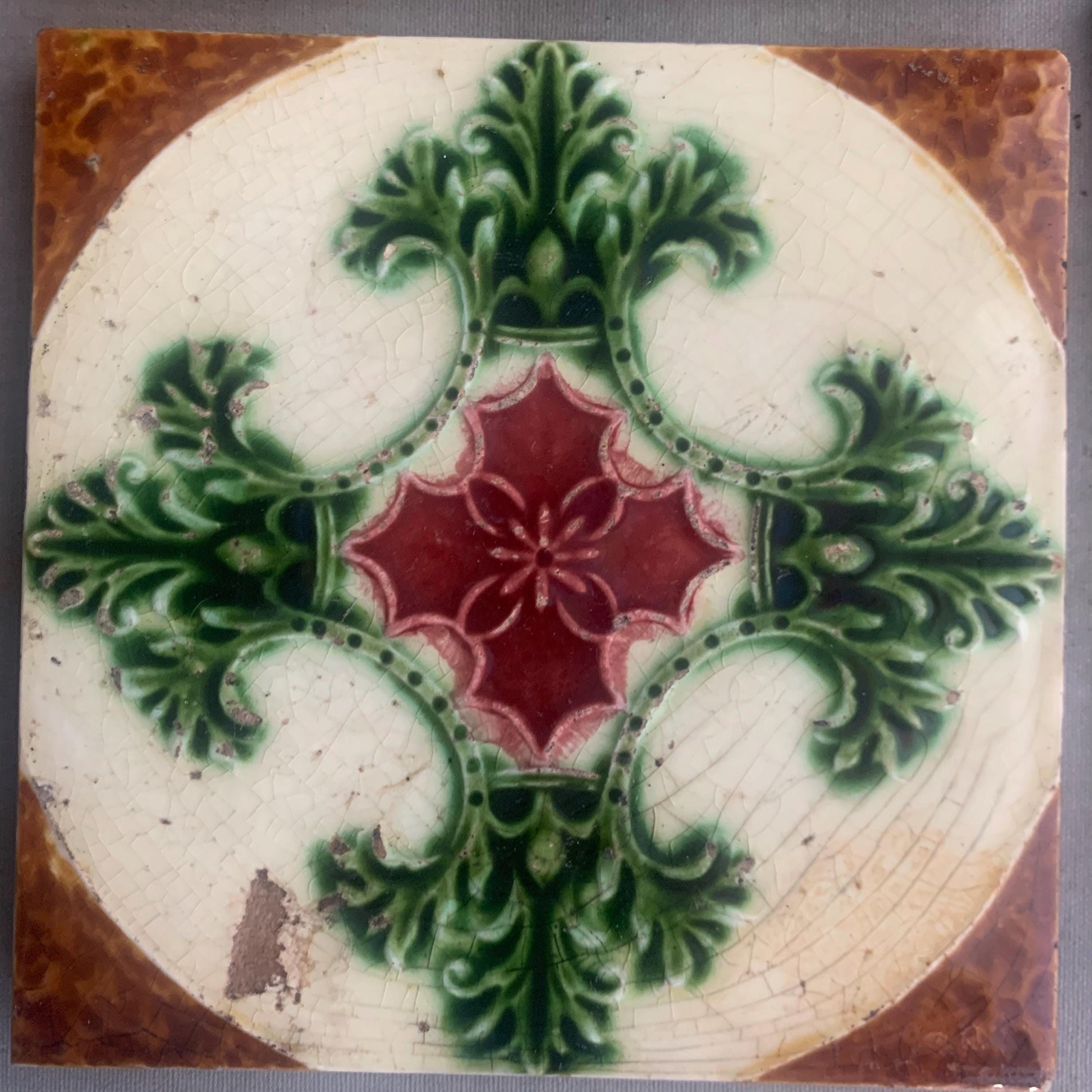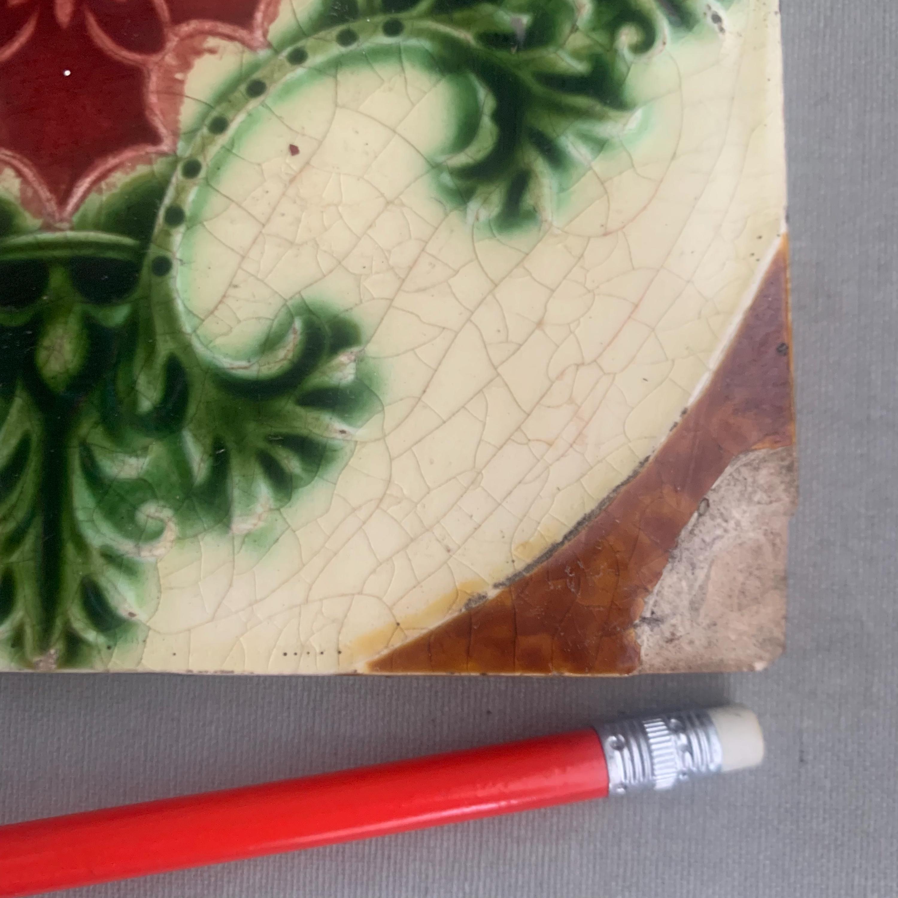 The tiles feature a red and green floral design on a cream-colored background, with a brown border. Majolica style Ceramic Tiles with raised floral details.