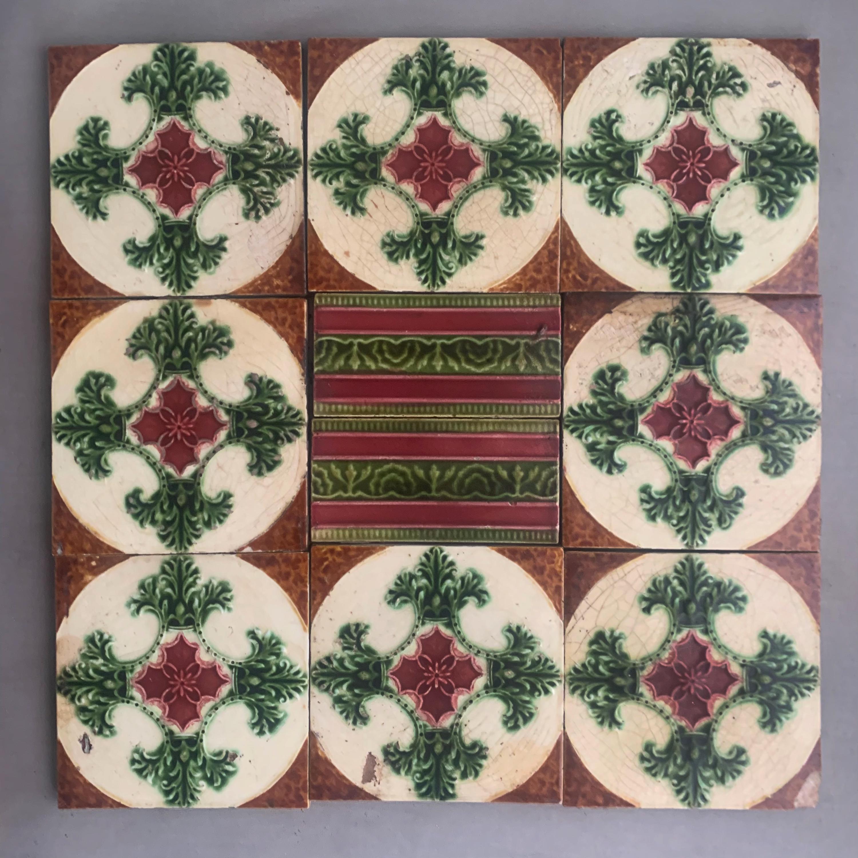 A collection of antique ceramic tiles, made in England circa 1900. Originally off a cast iron victorian fire place .
