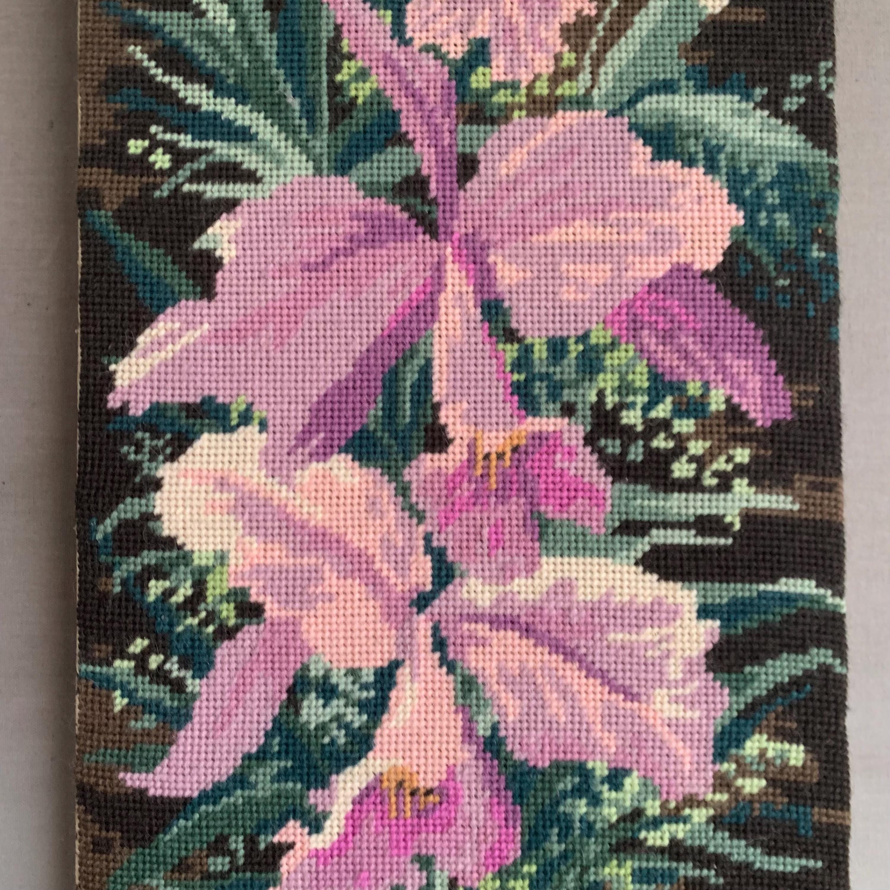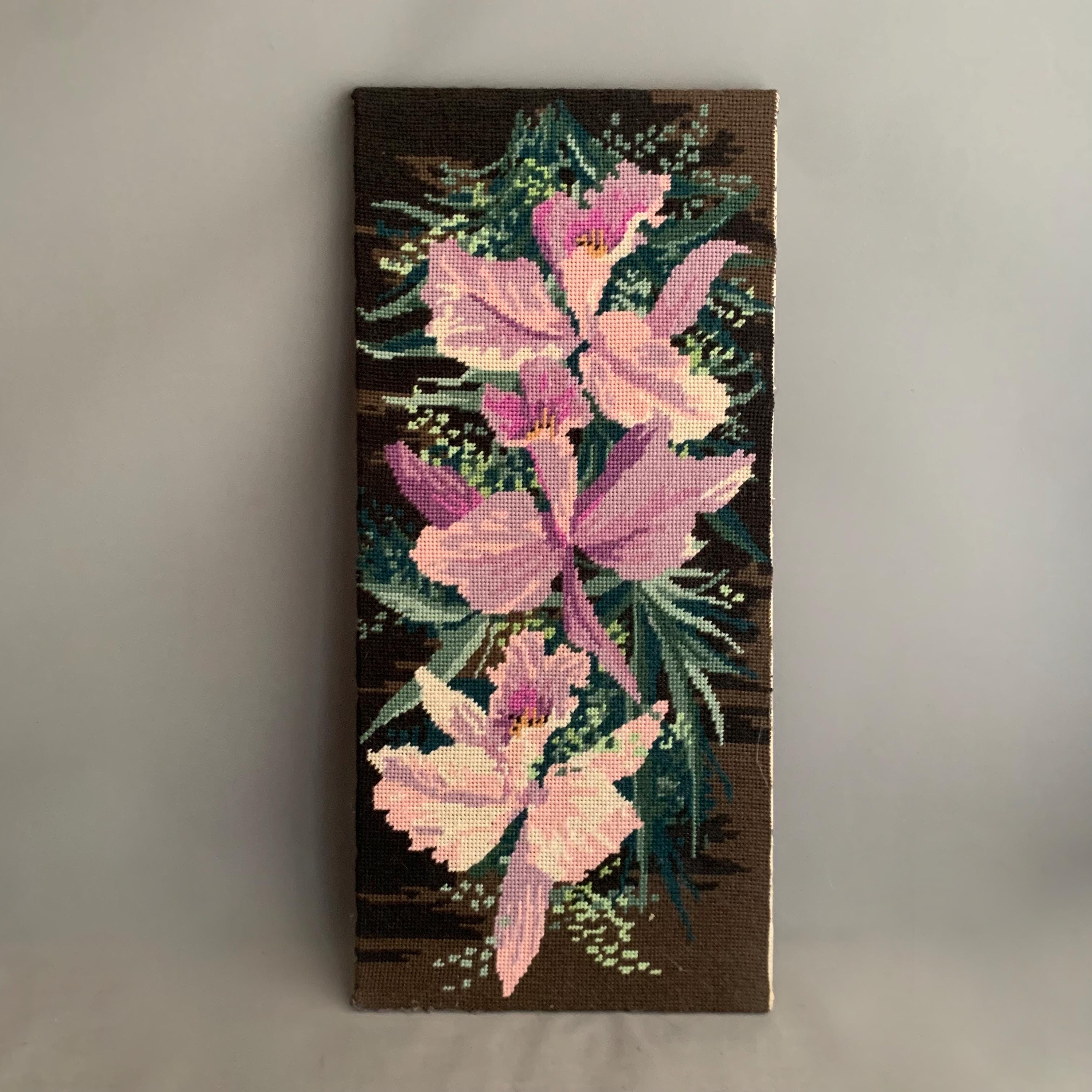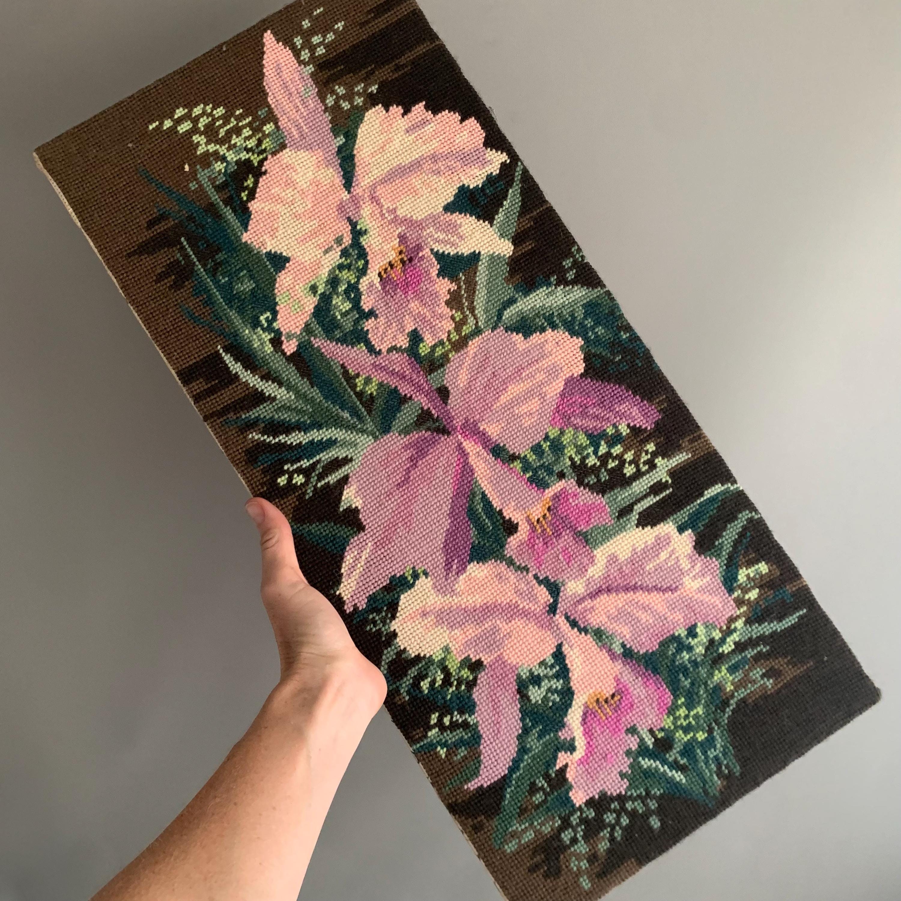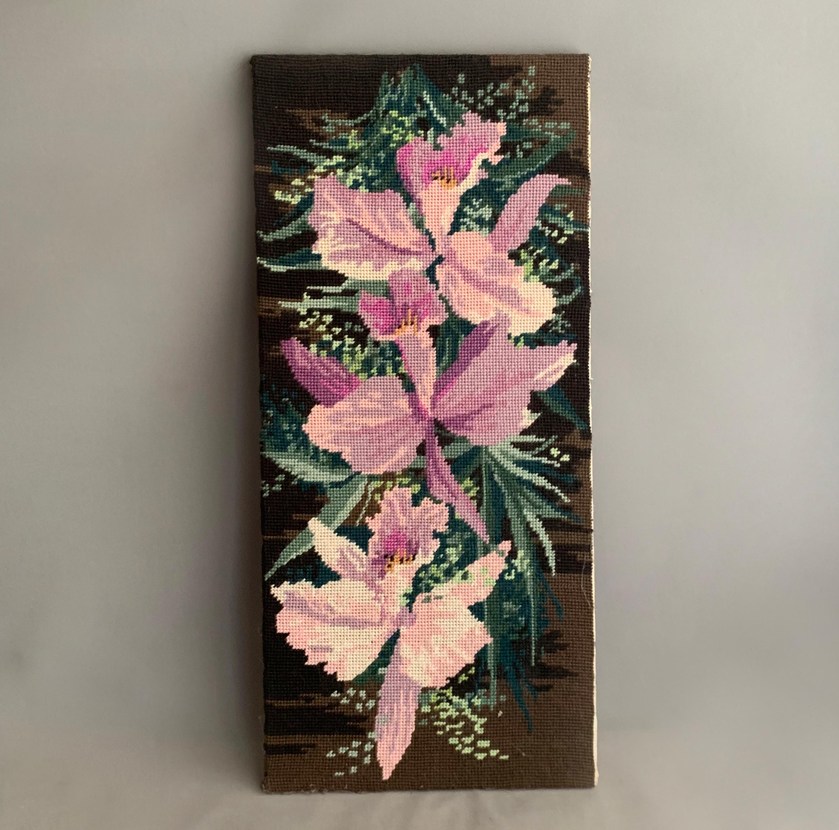 A 1950s/1960s handmade needlepoint / tapestry wall art featuring pink orchids on a dark brown and black background.