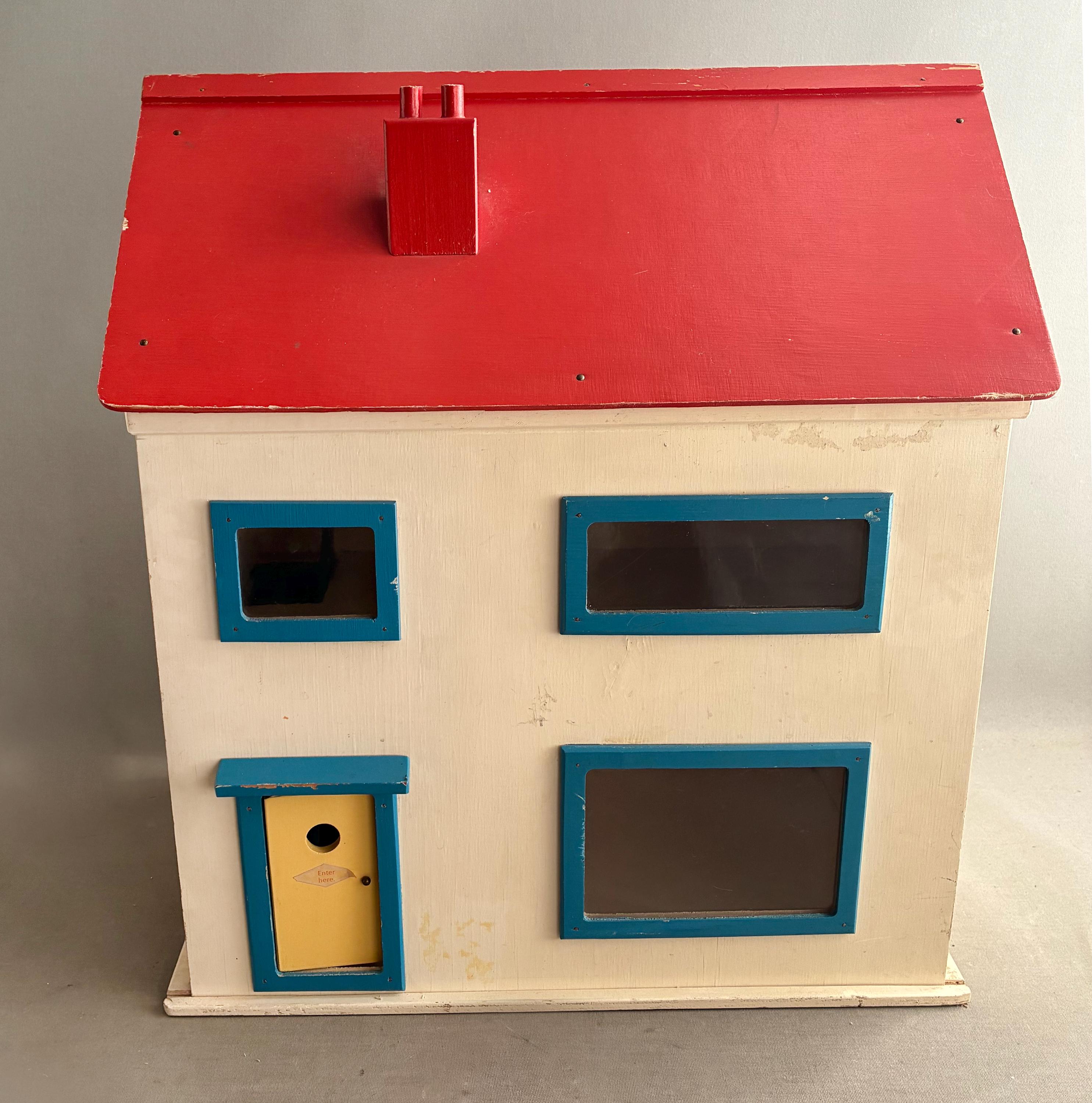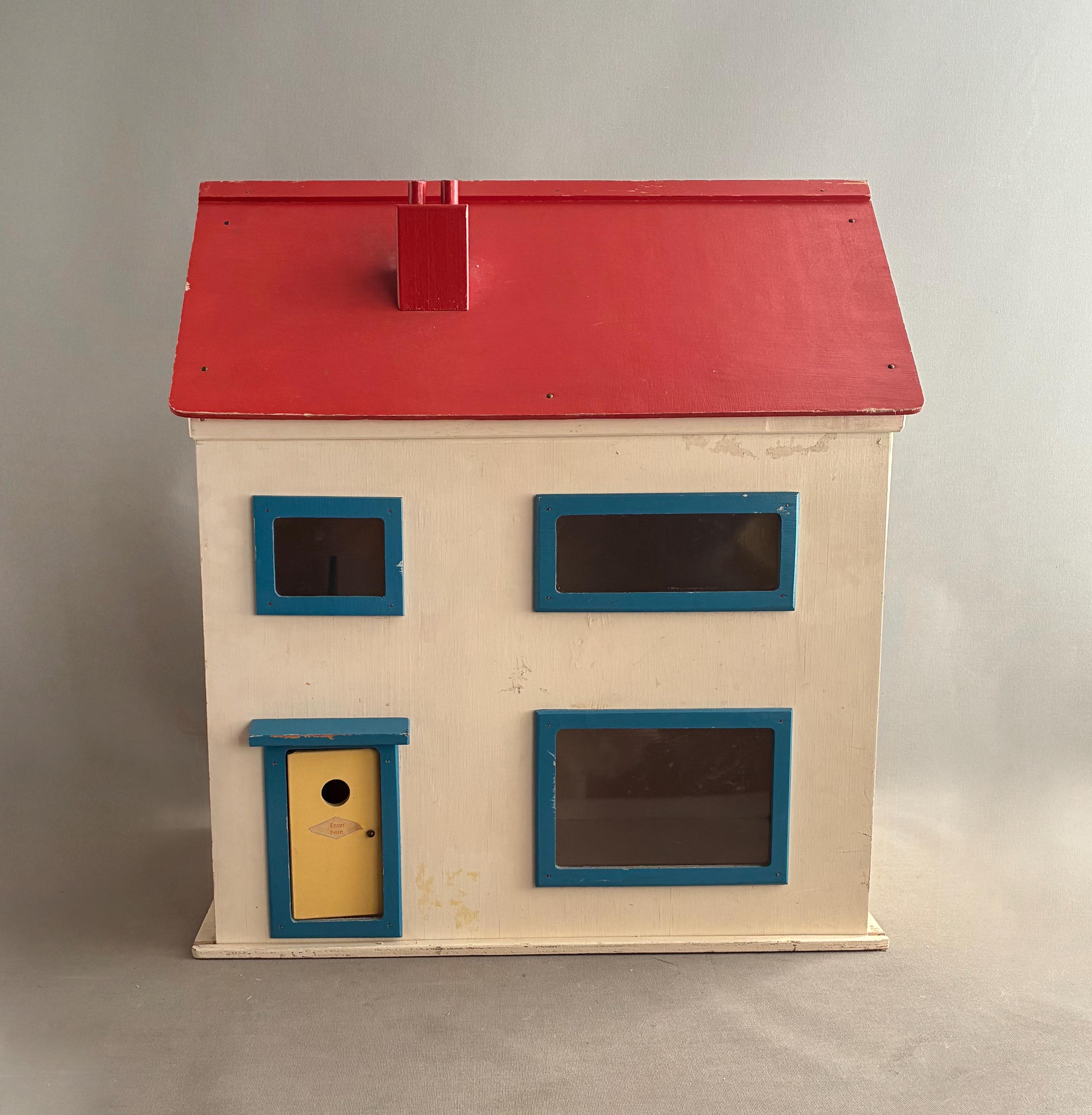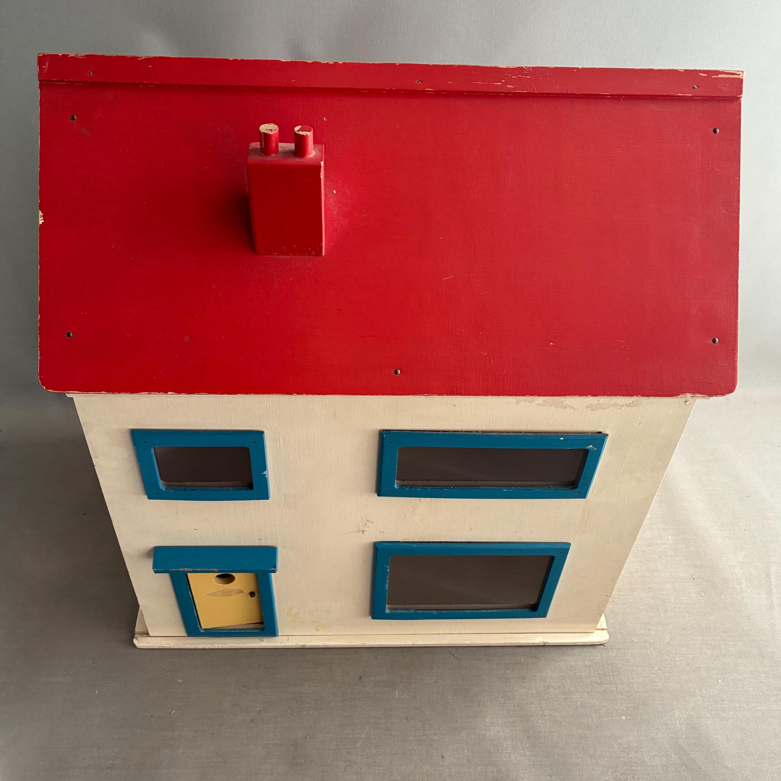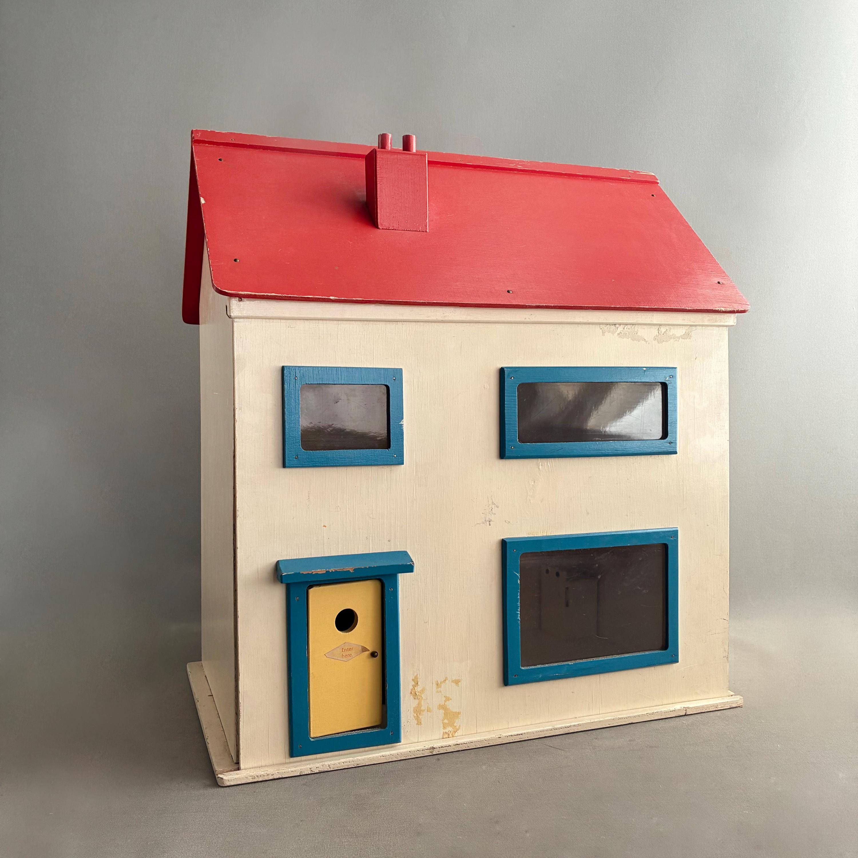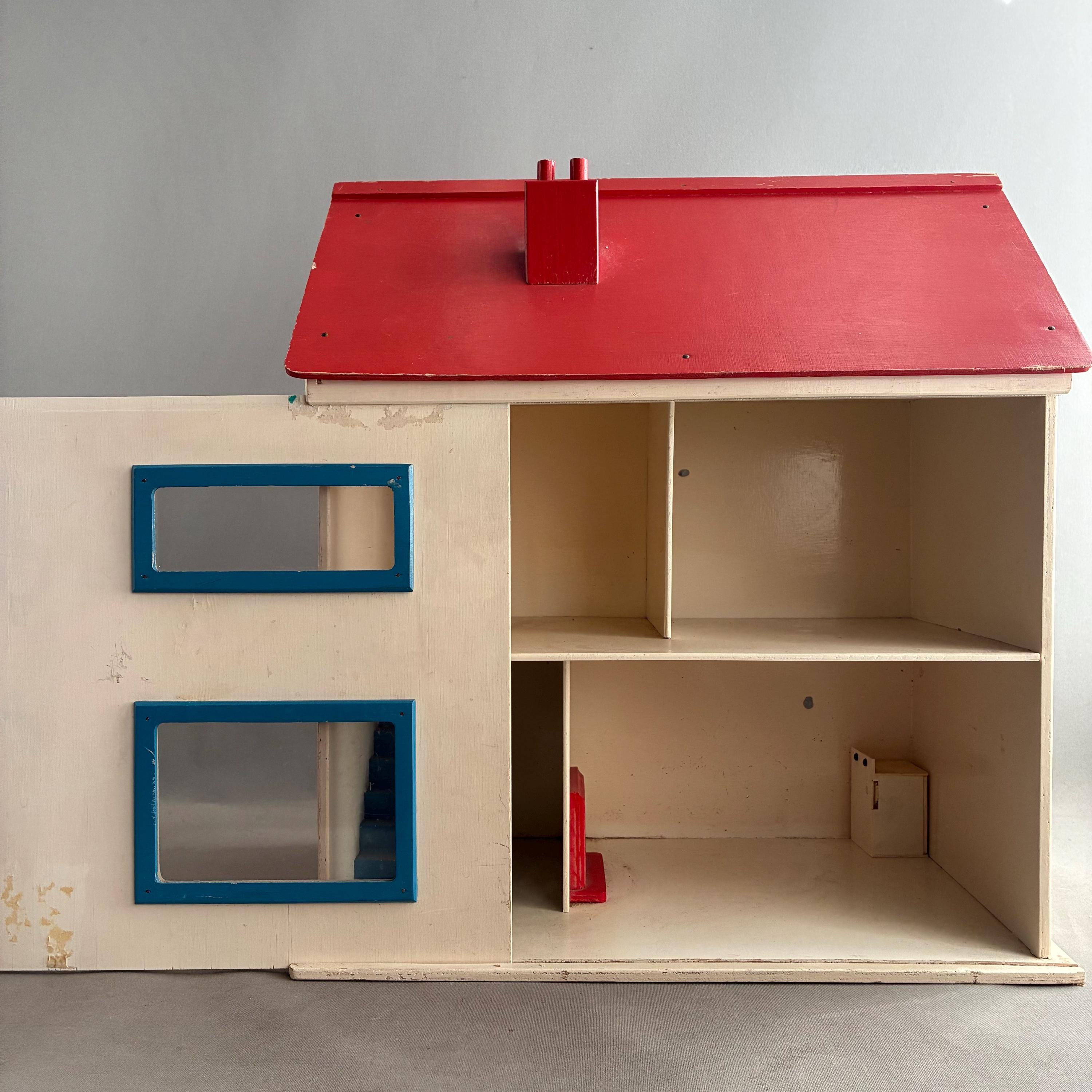 The construction is simple and sturdy, suggesting it was built to last for play. The front focade of the house slides open to access the rooms inside .In good condition despite being played with.