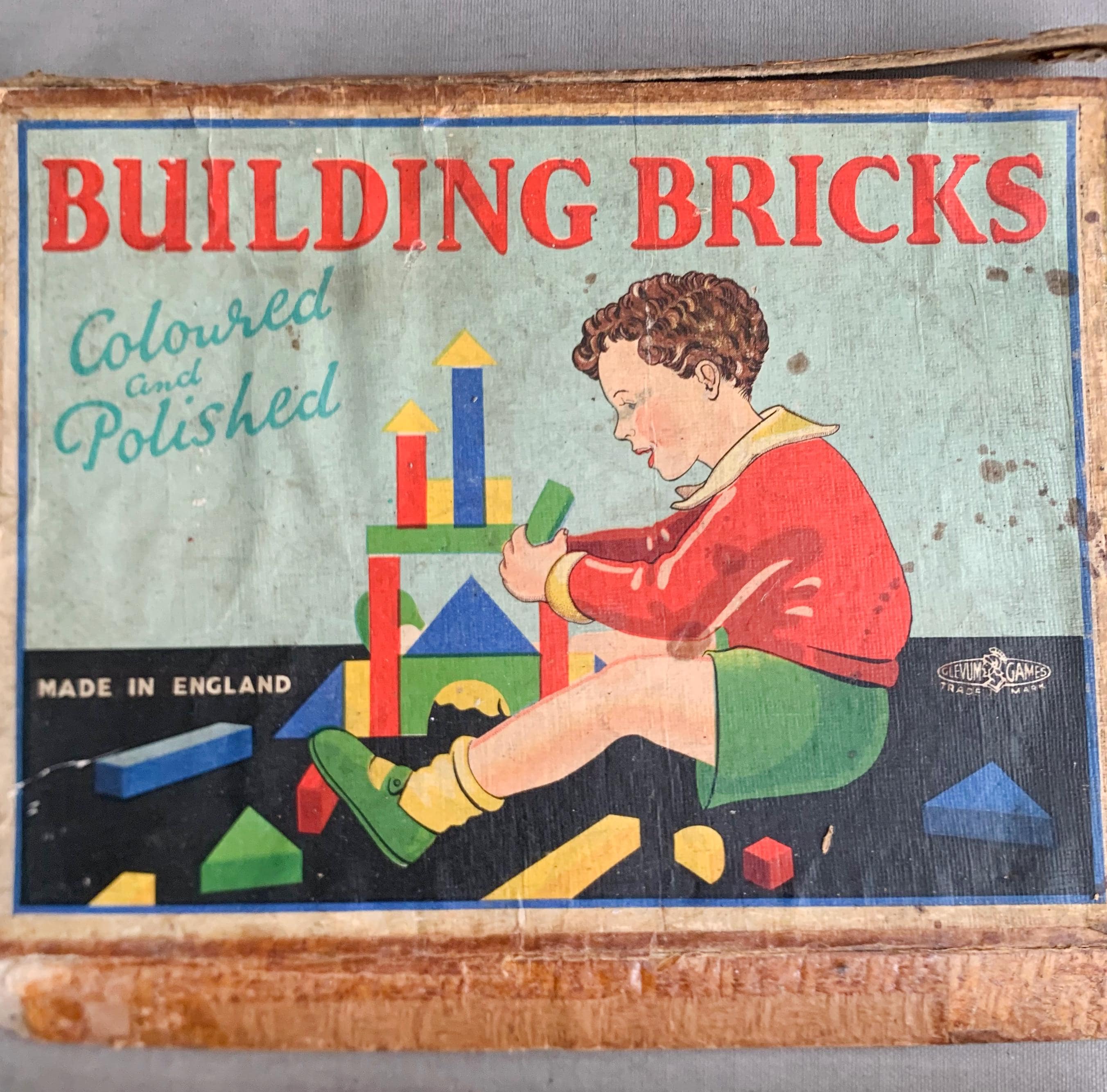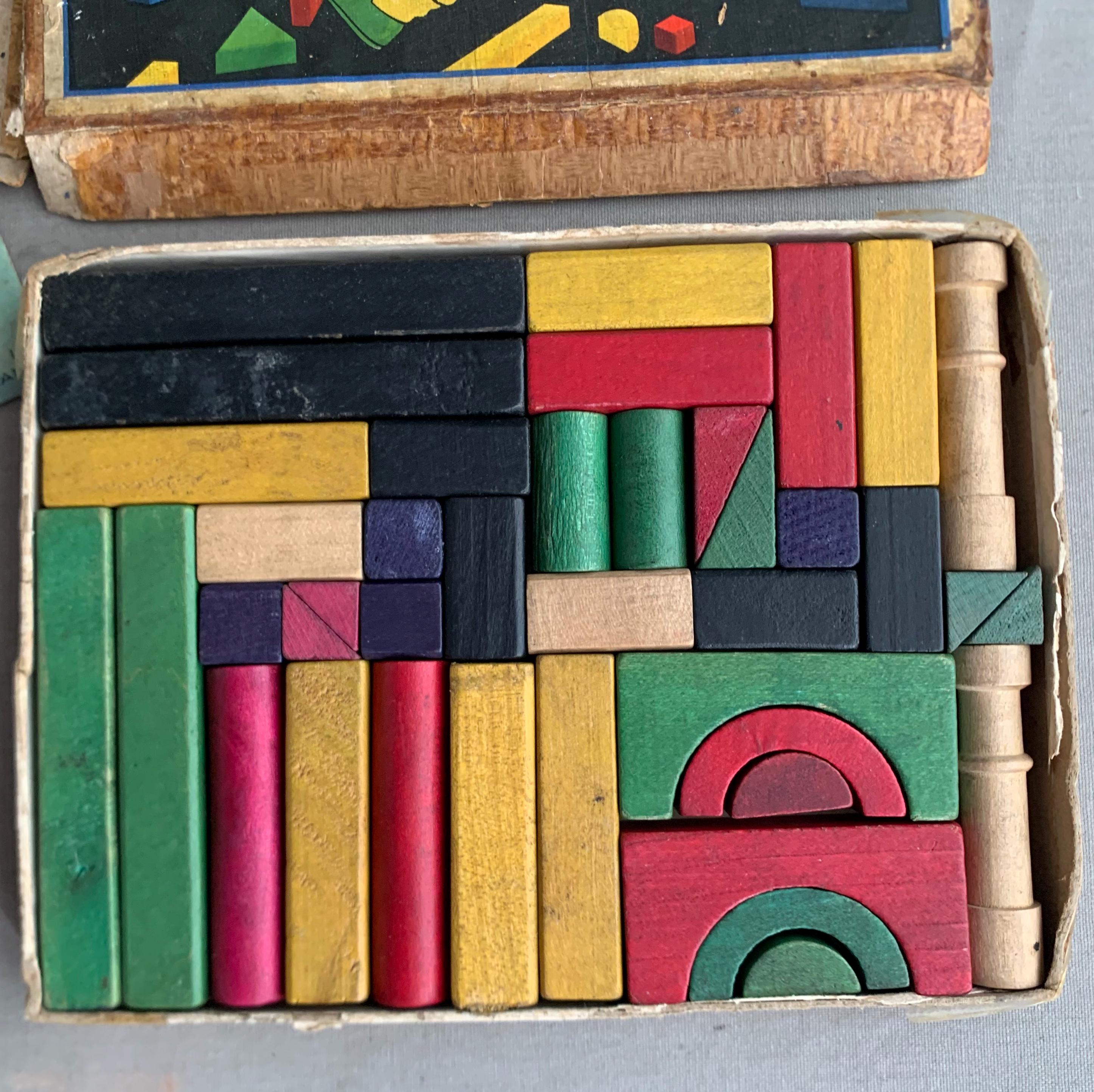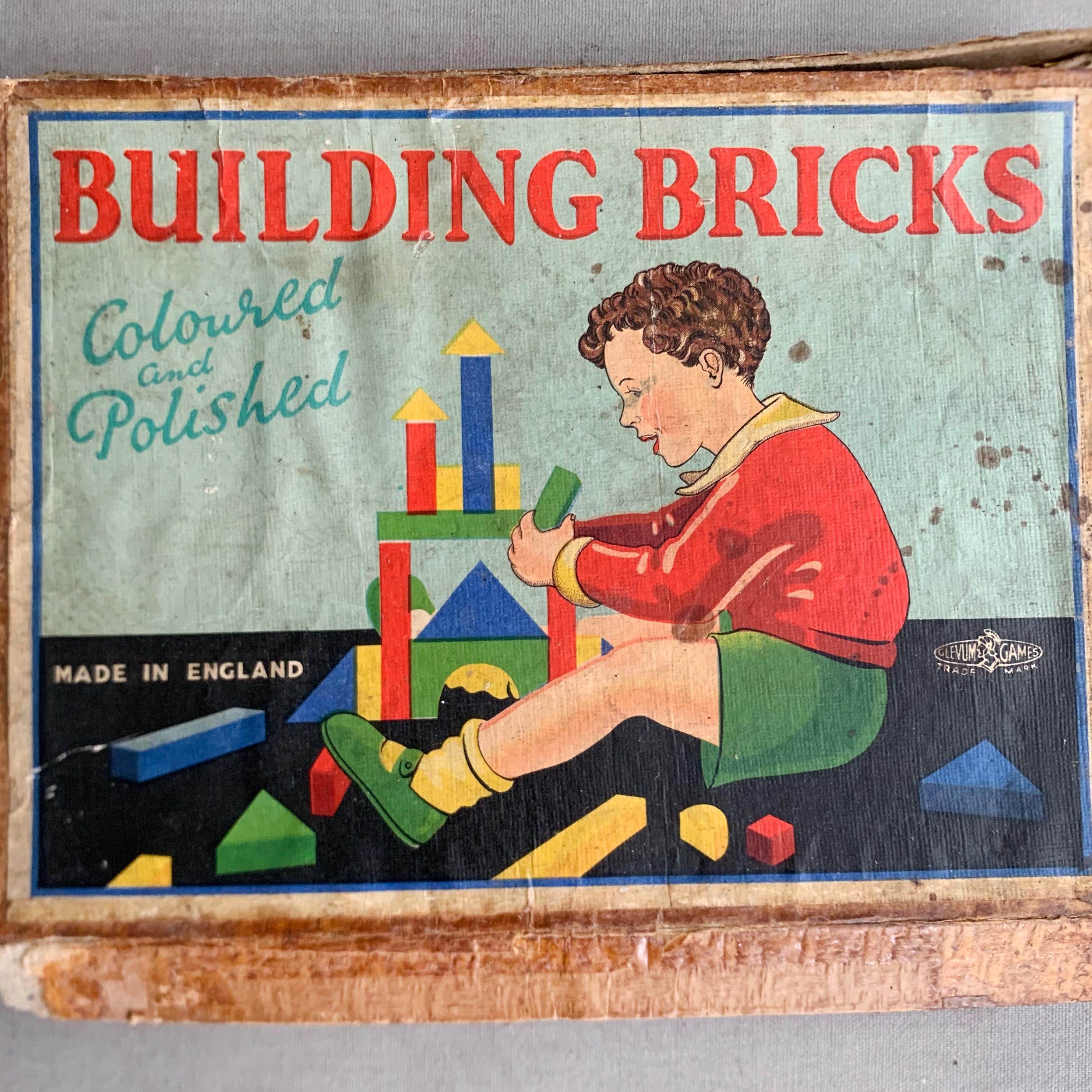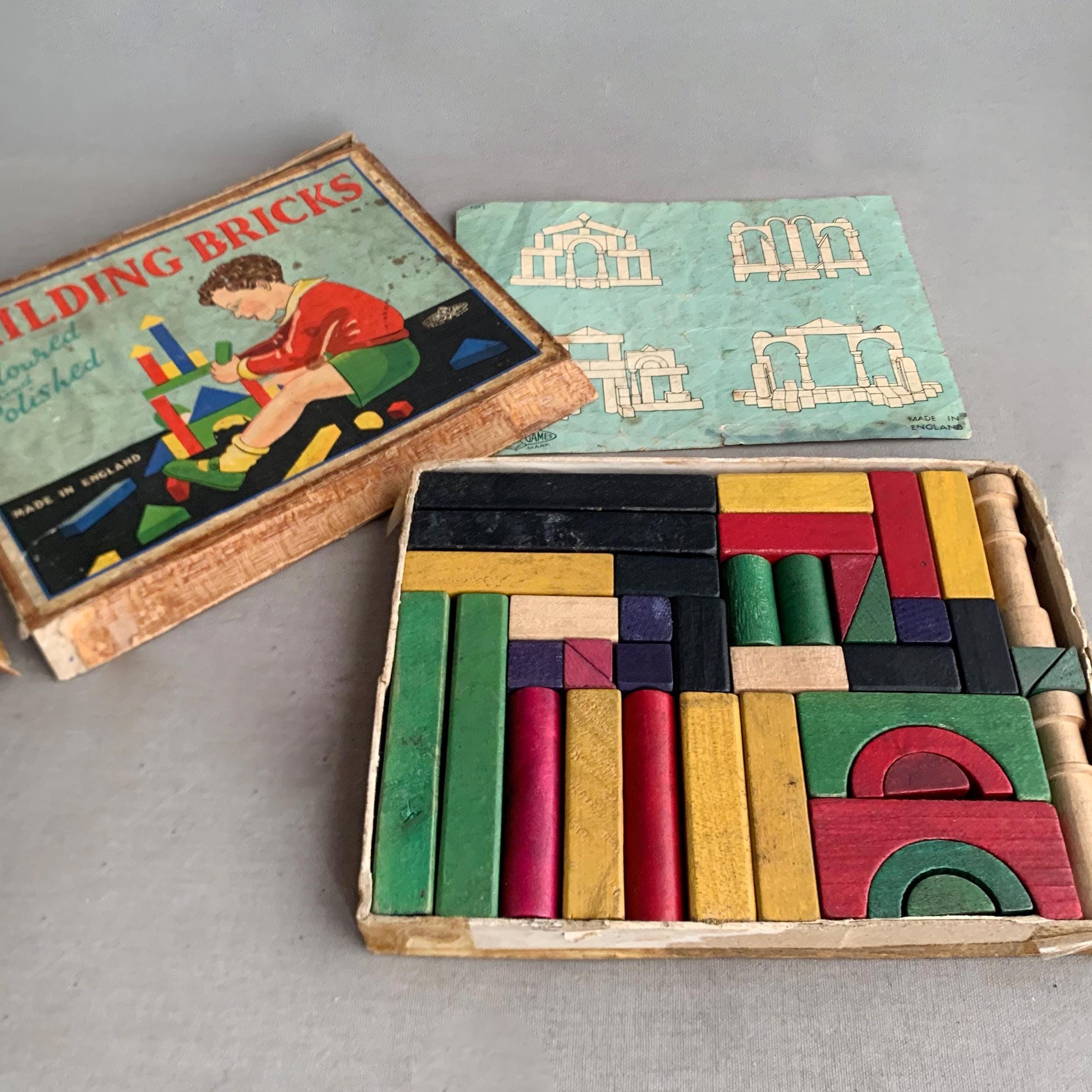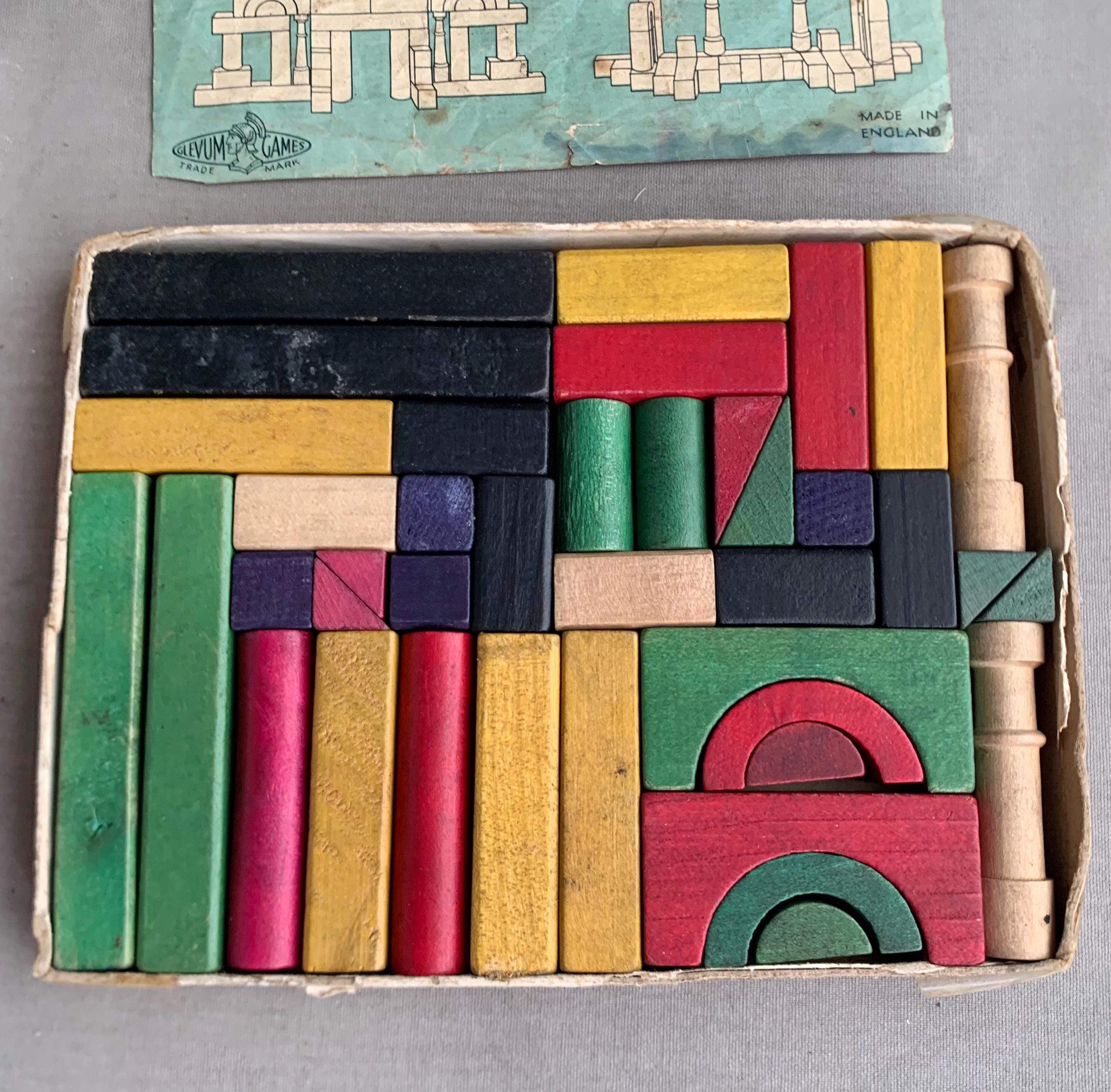 A lovely complete set of antique wooden Building Bricks dating from the early twentieth century. The set was made in England by Roberts Brothers of Gloucester under their famous “Glevum Games” brand. It was retailed by H Wiles Ltd. (Viking Toys), Manchester. This would have been a more expensive variant of the game with coloured bricks. A cheaper set was produced with plain bricks. The original sheets with suggested designs are still present as shown. This game has survived in remarkable condition given its age. The box is a bit shabby .