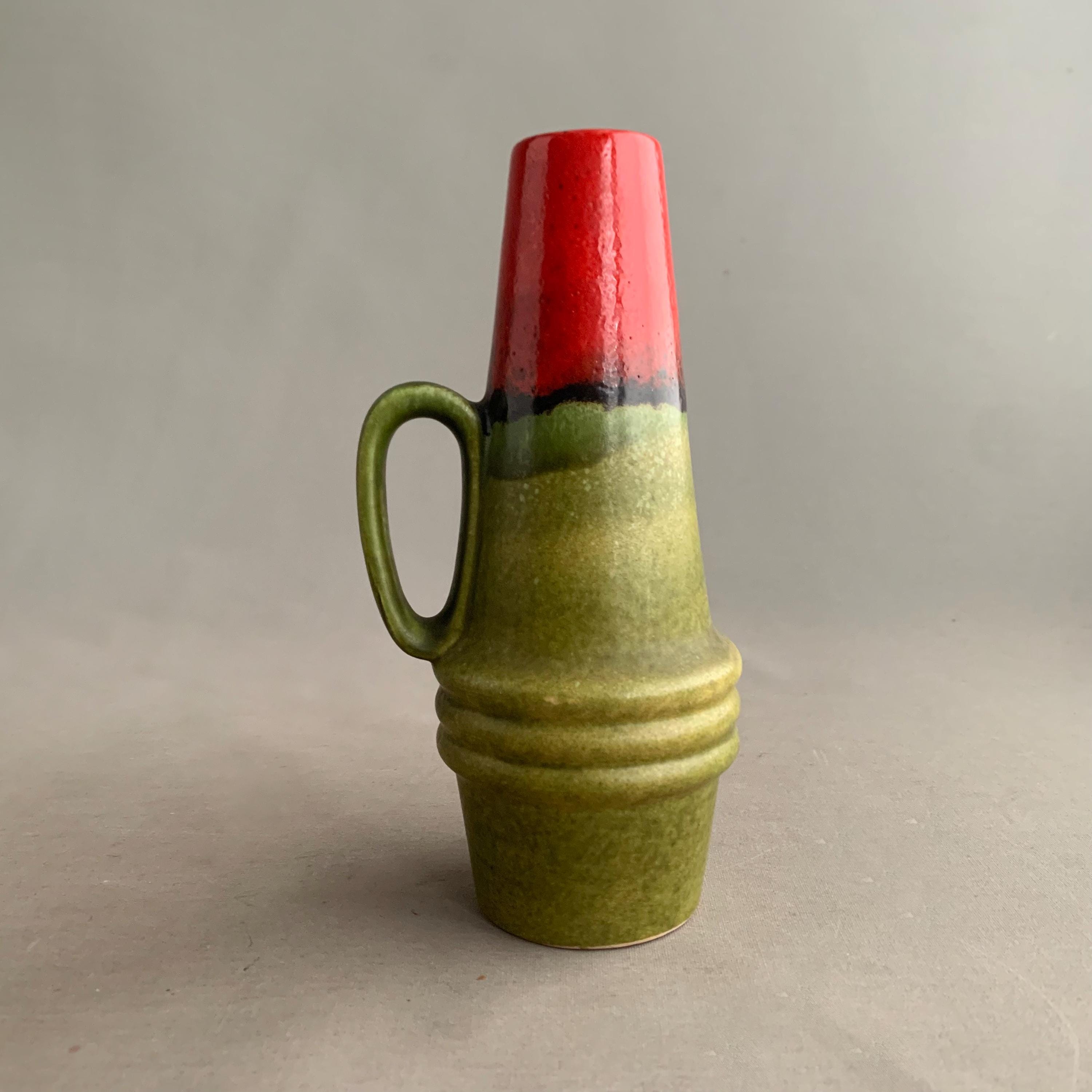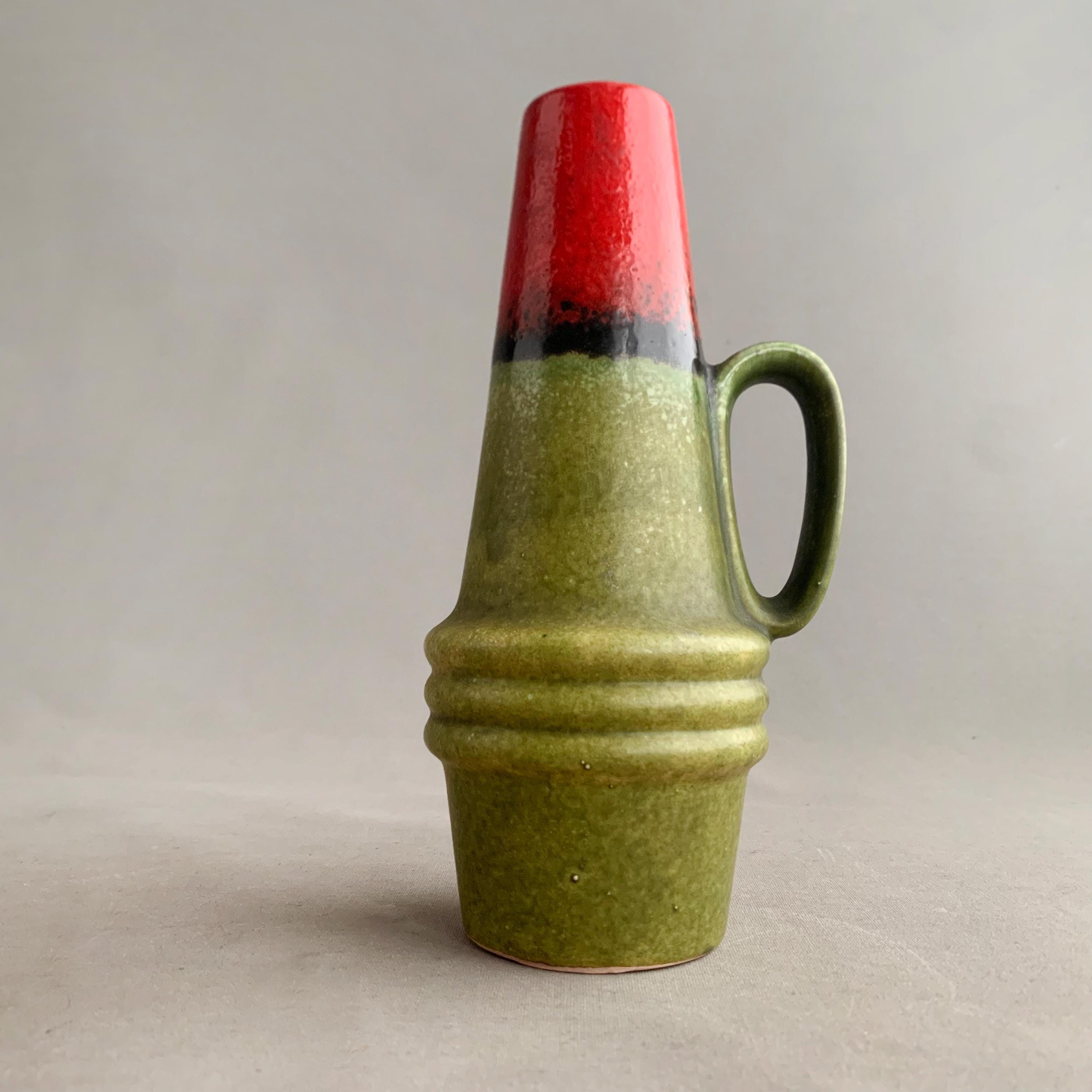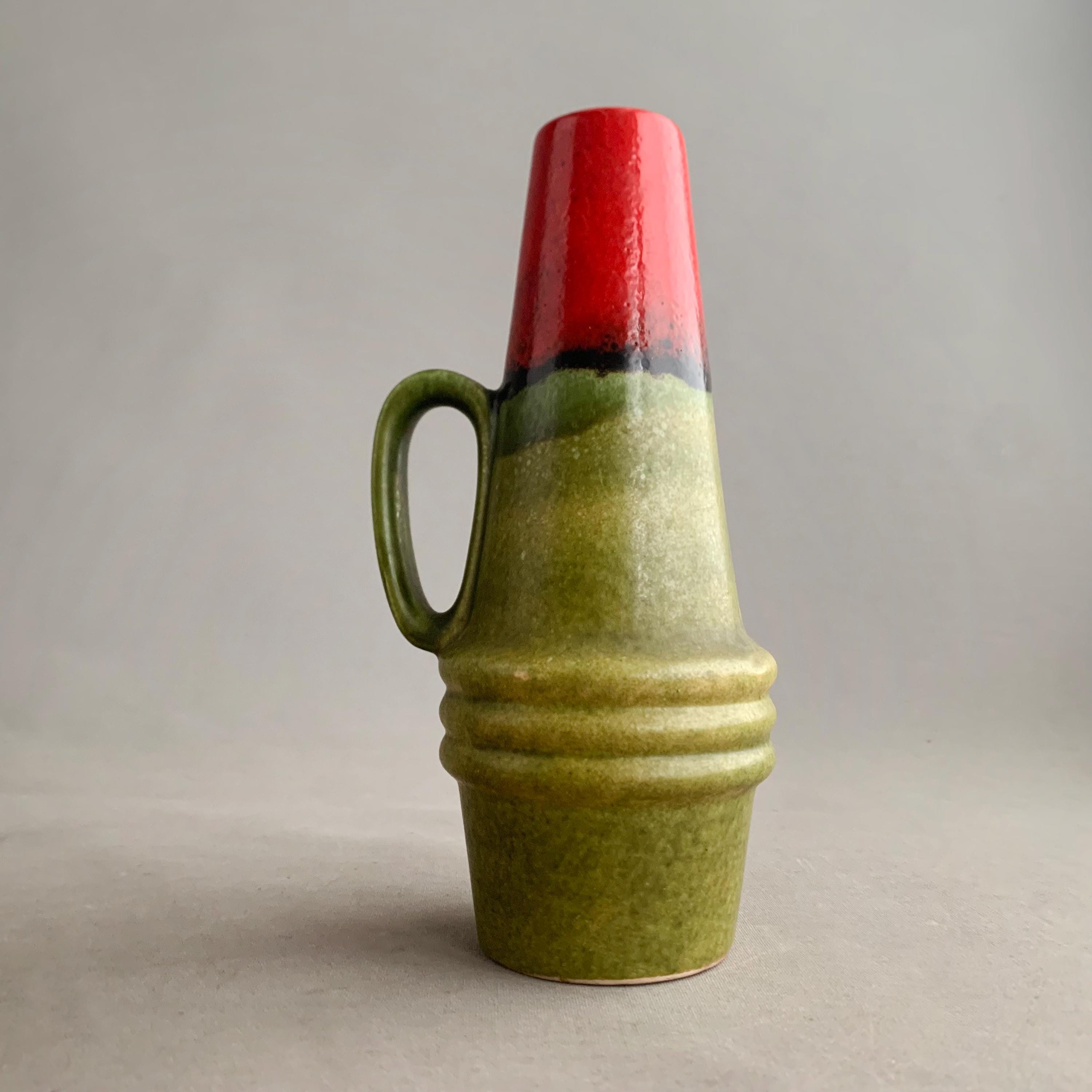 A Scheurich West German Pottery vase, model number 209-18, with a green, black, and red glaze.