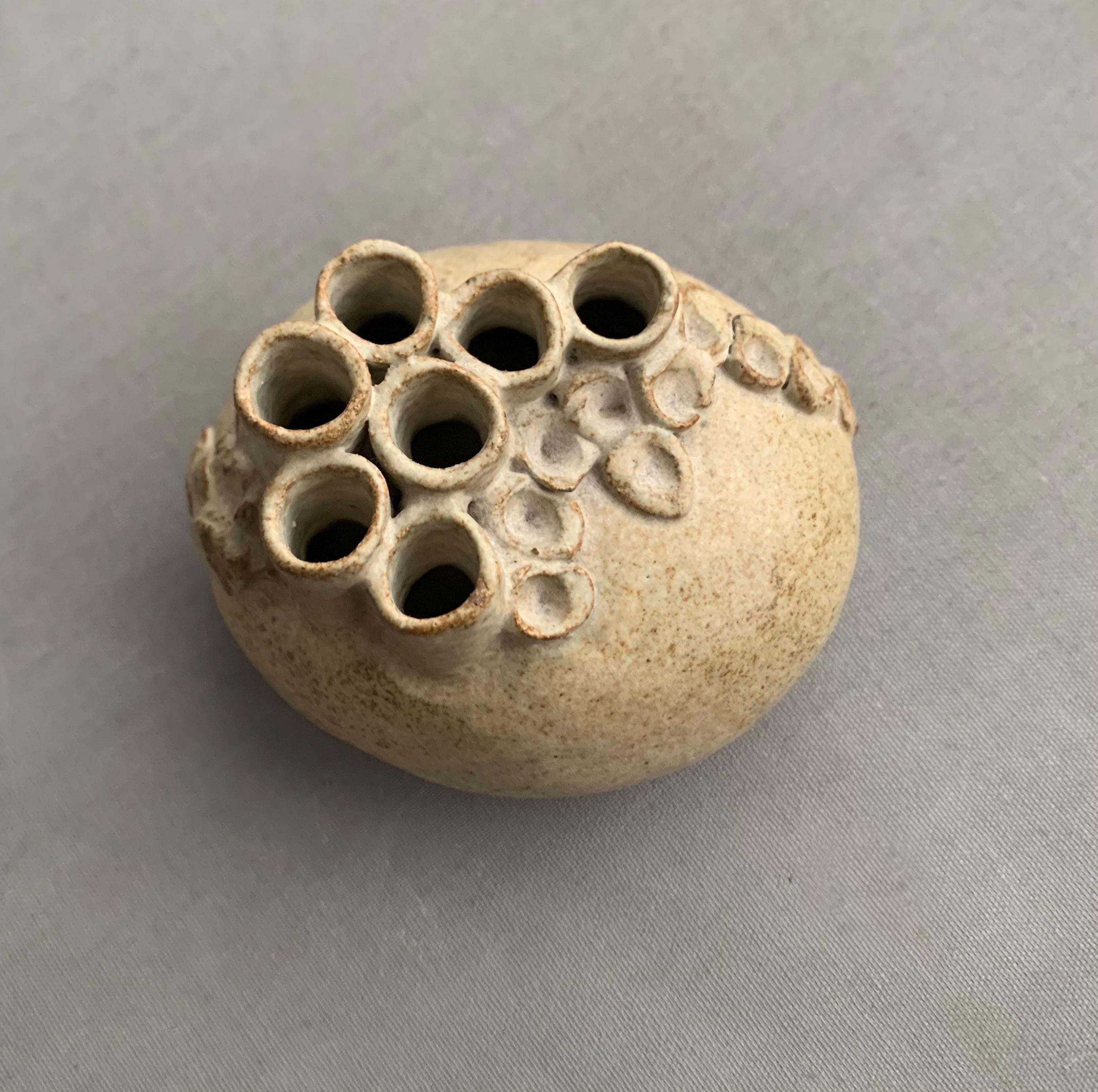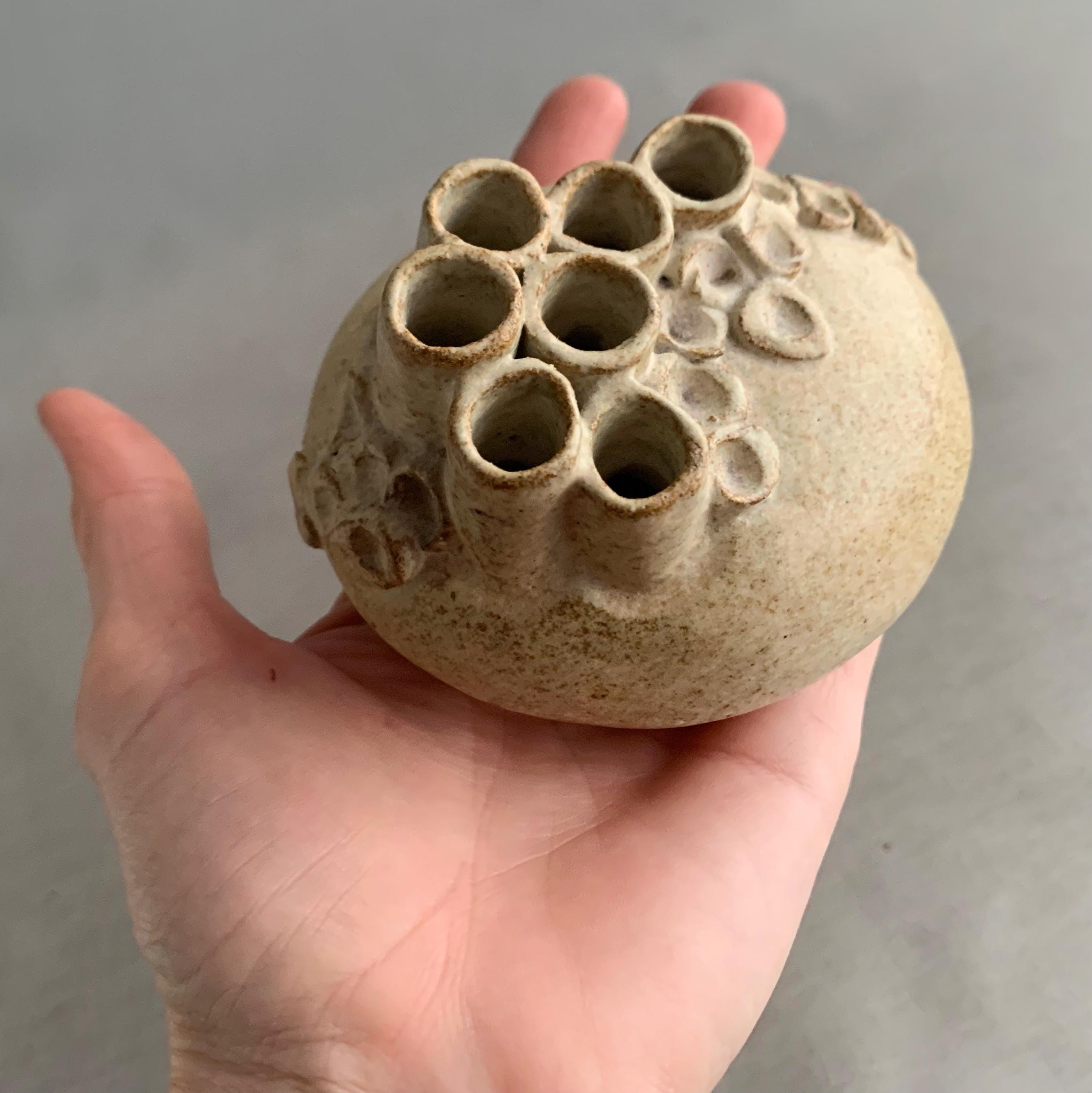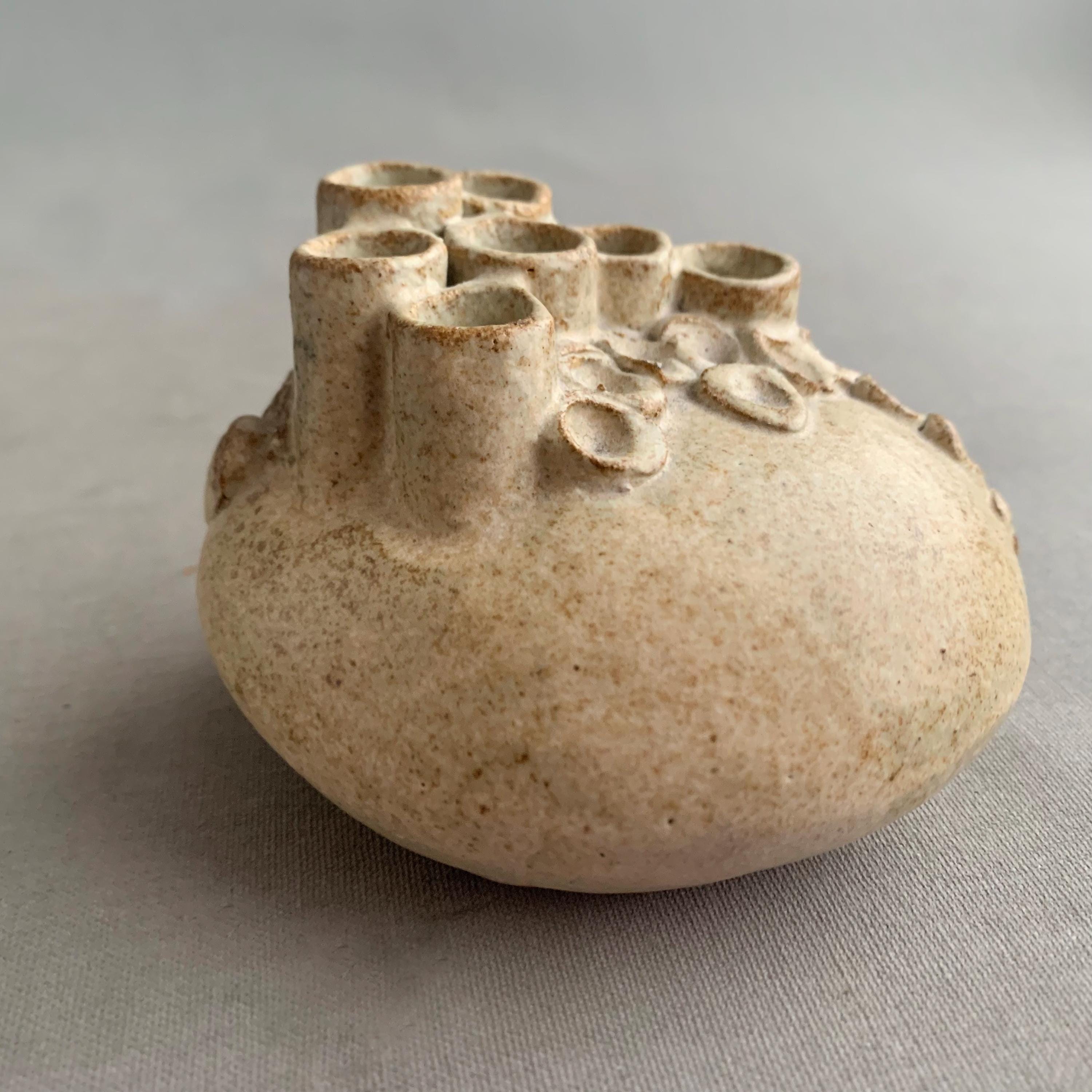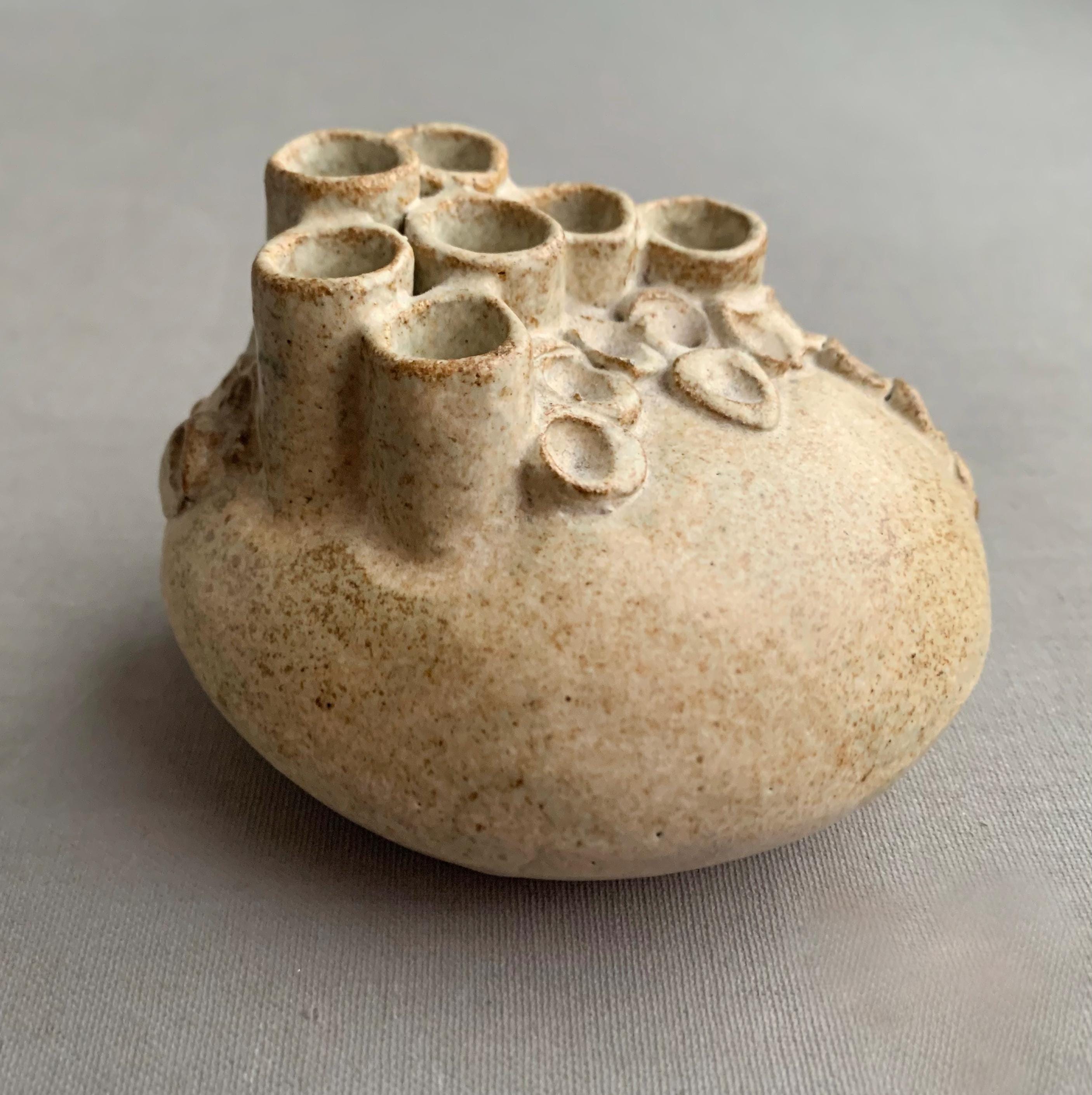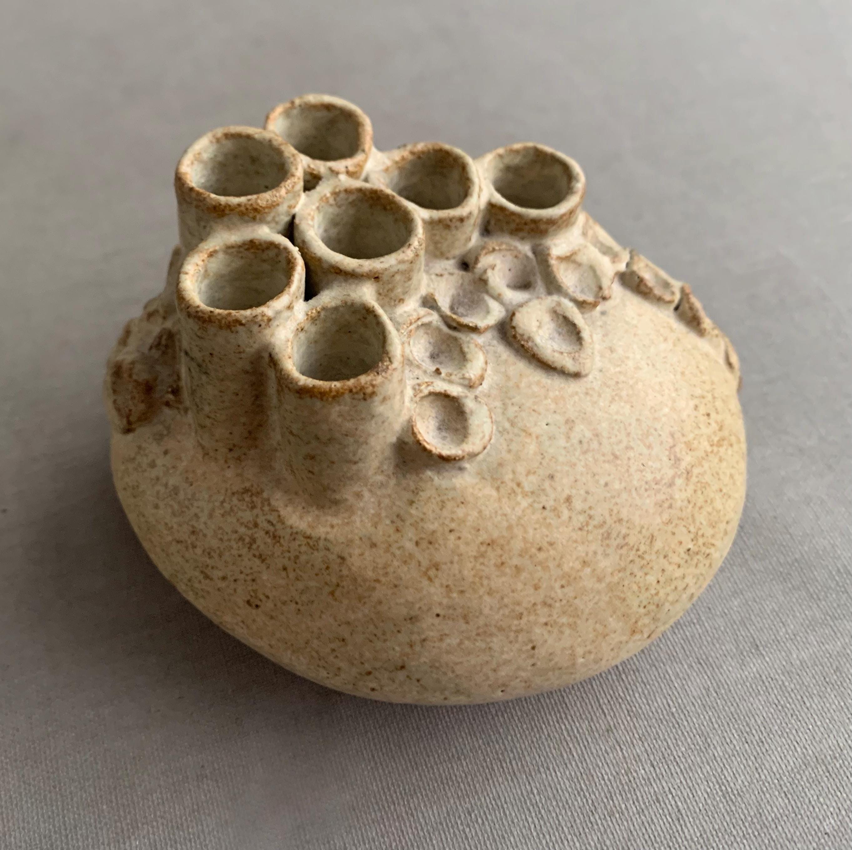 Design: The vase features a unique, organic shape resembling a smooth, rounded pebble. It is characterized by multiple open tubes or apertures on top, designed to hold small flowers or act as a "floral frog" for arrangements.