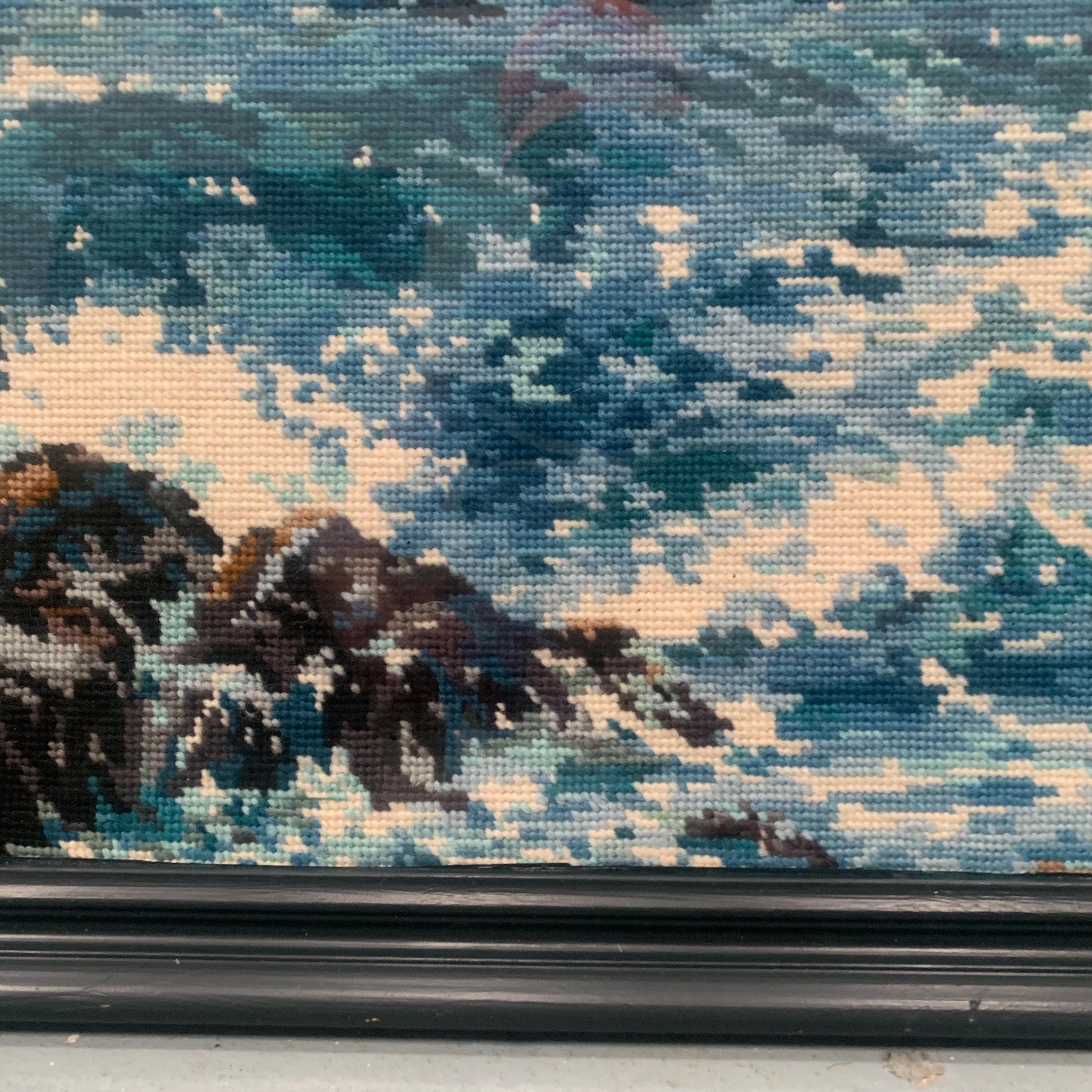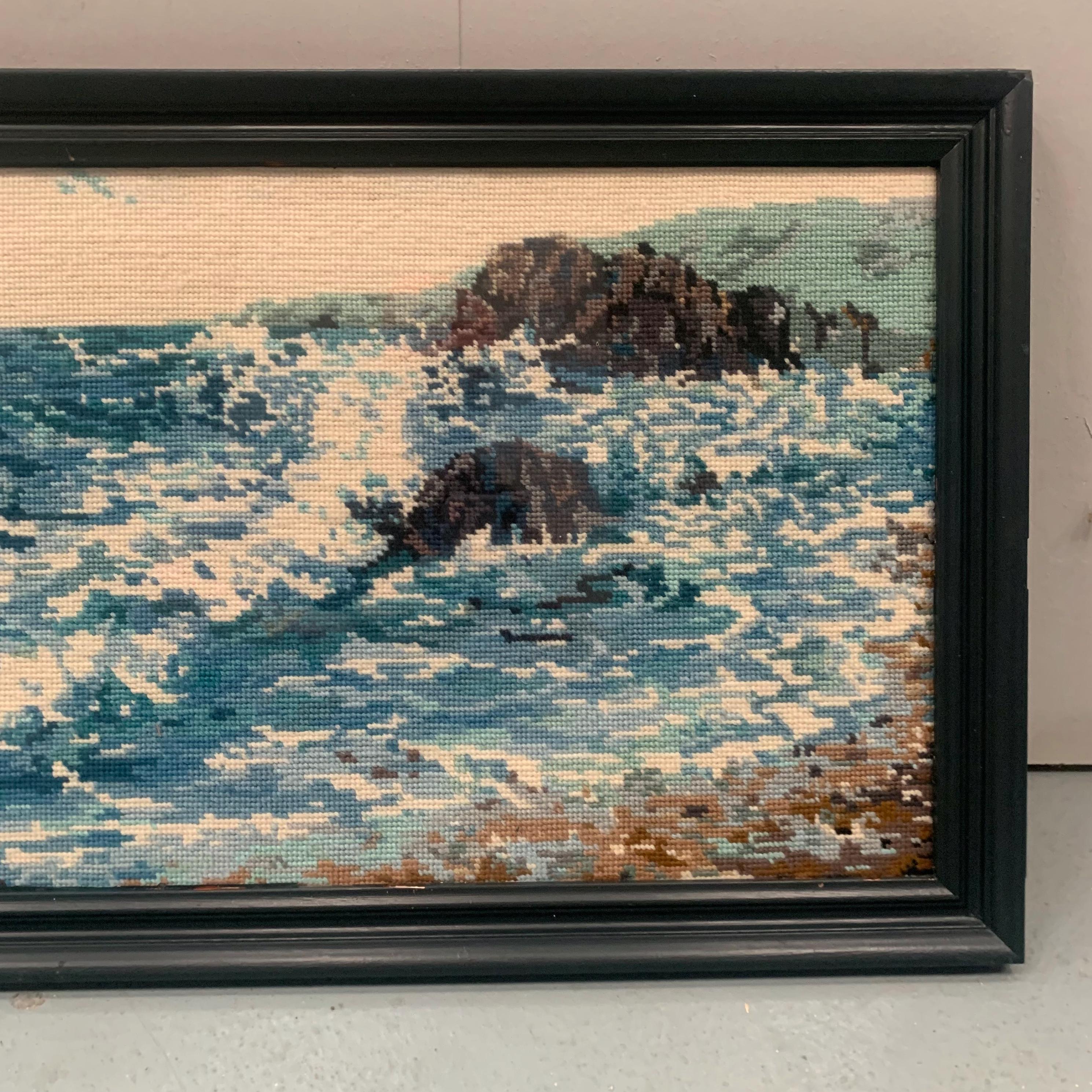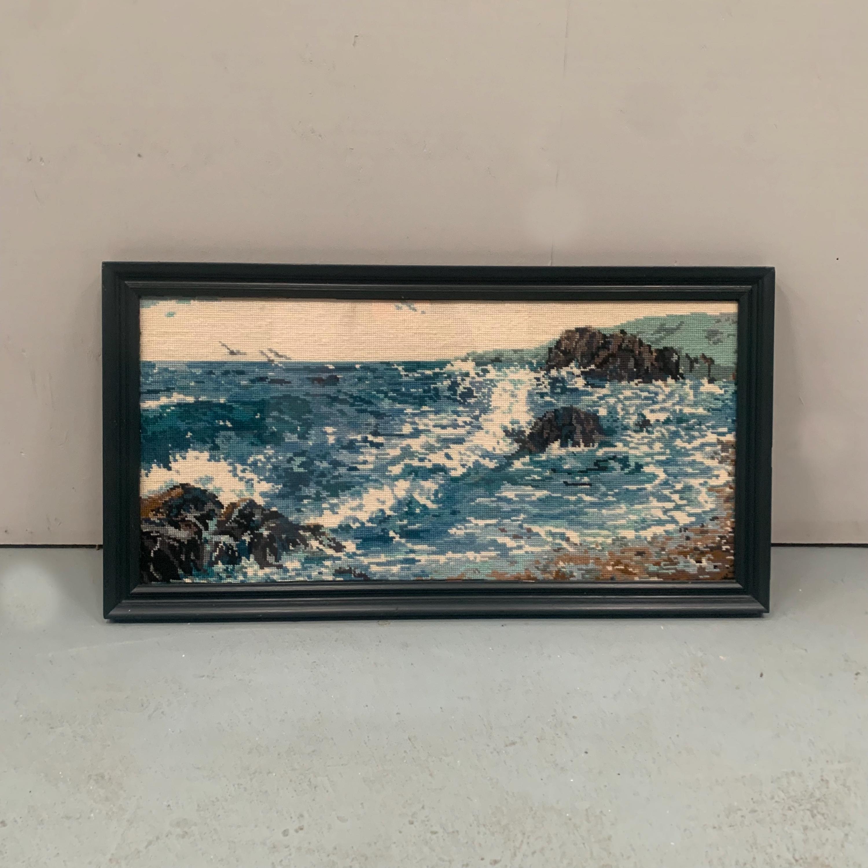 A vintage framed needlepoint /tapestry artwork depicting a coastal seascape scene.