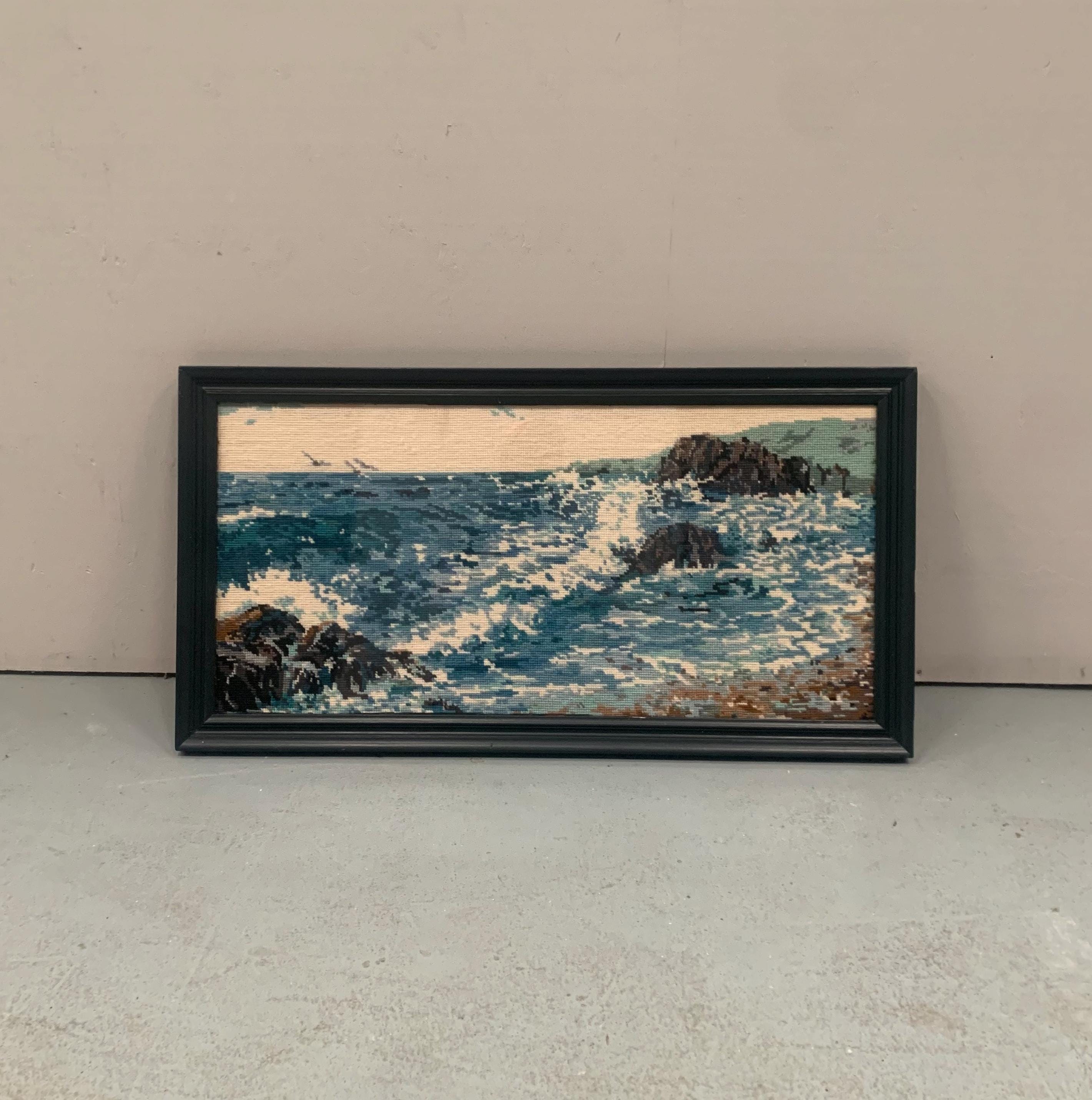 Featuring the texture and stitching characteristic of needlework. The artwork itself focuses on a dynamic ocean scene with blue and white waves crashing against dark rocks on the shore.