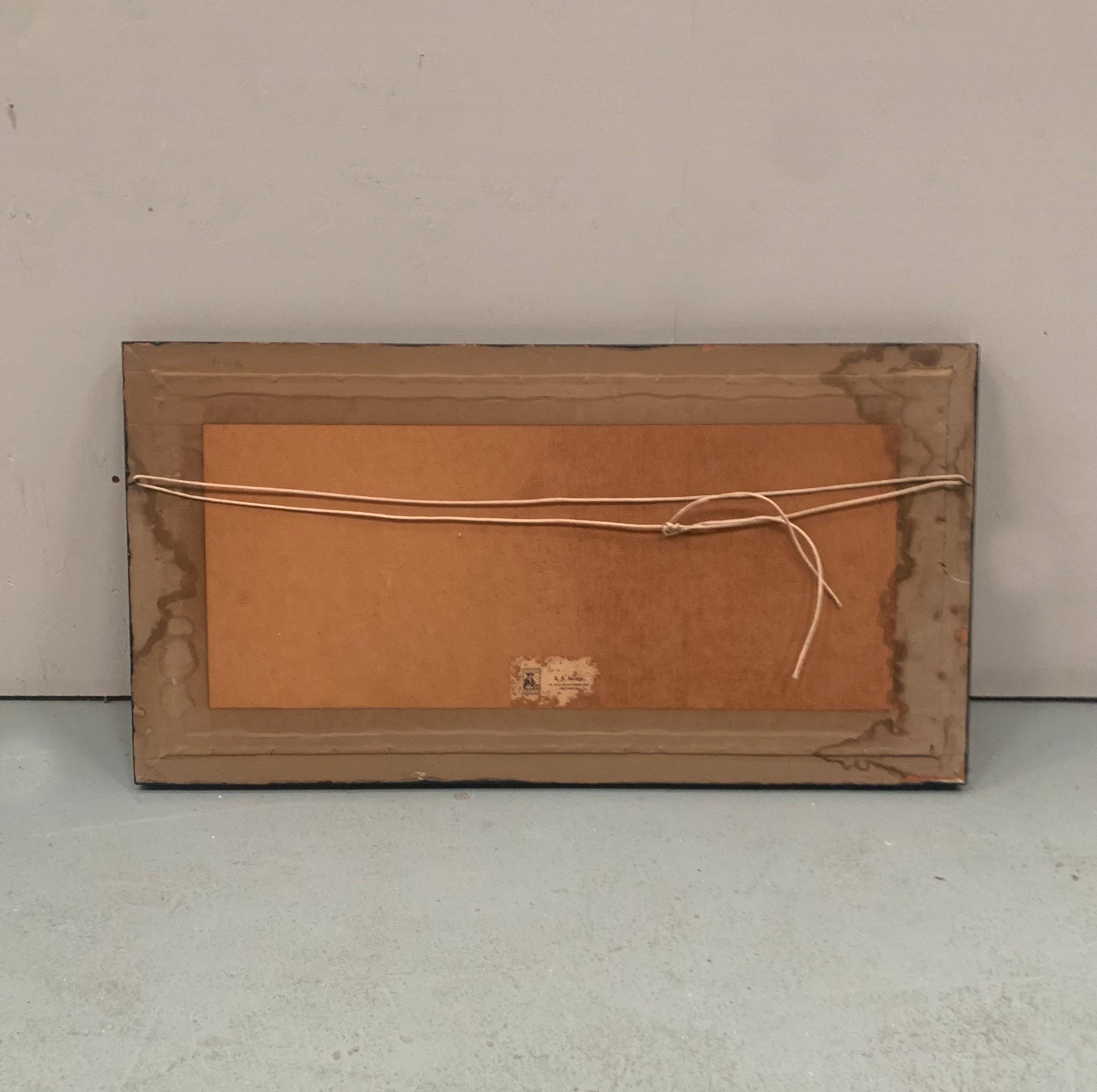 framed in a wood frame that has been painted a very dark blue. Measures 82 cm wide x 43 cm tall