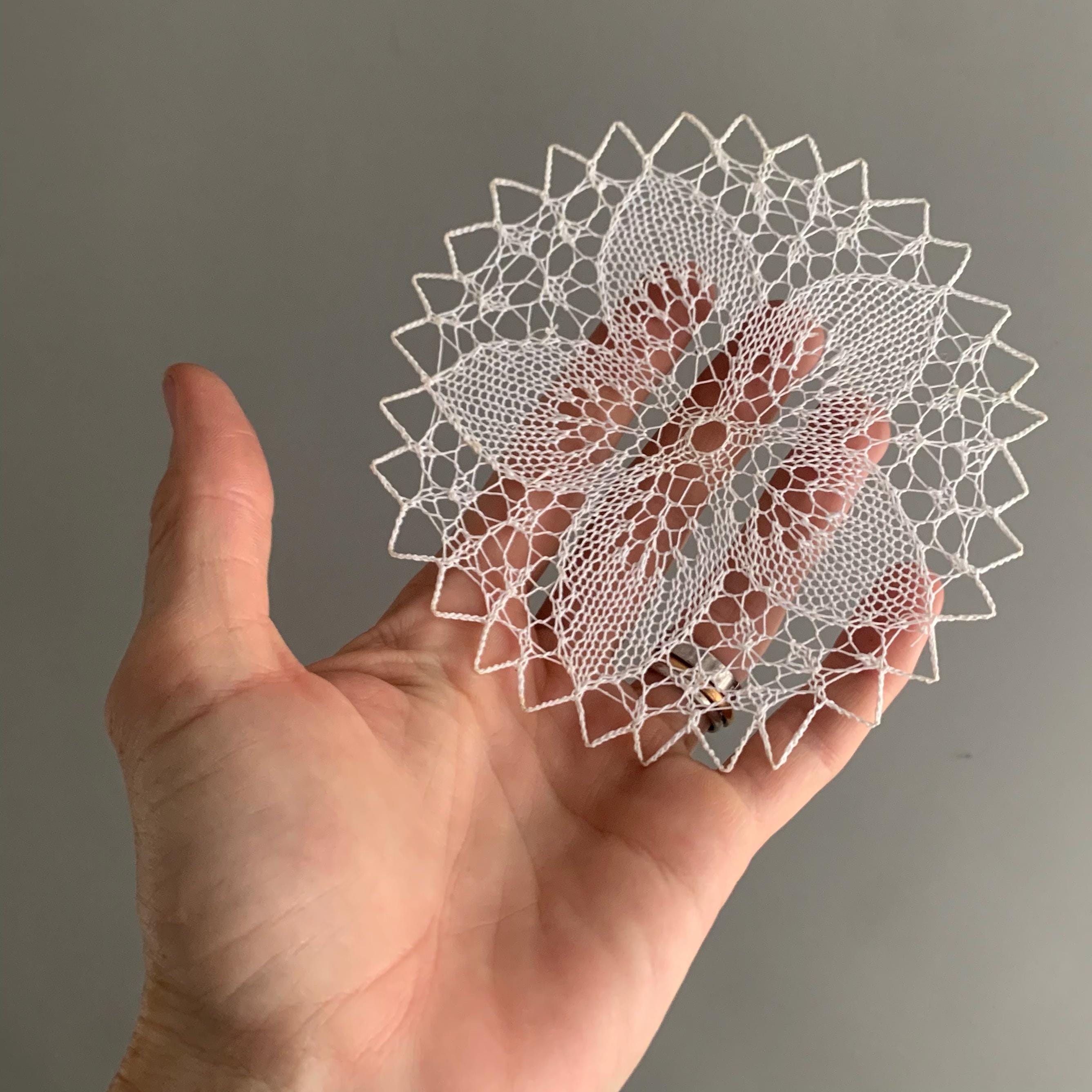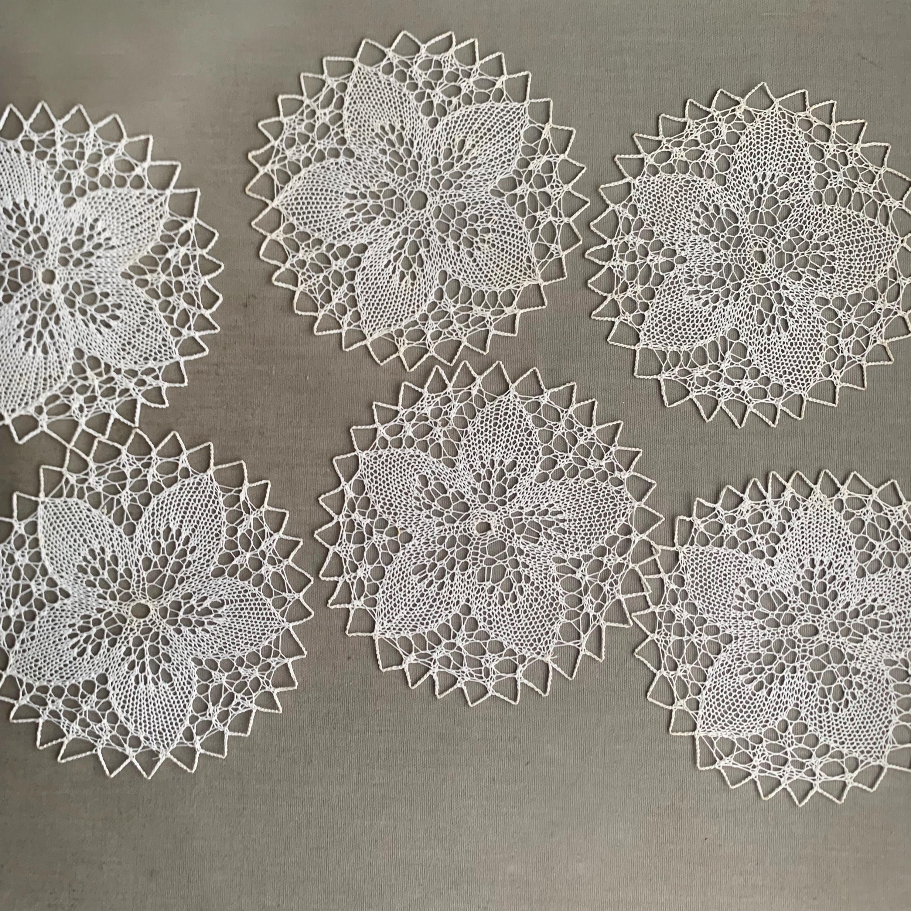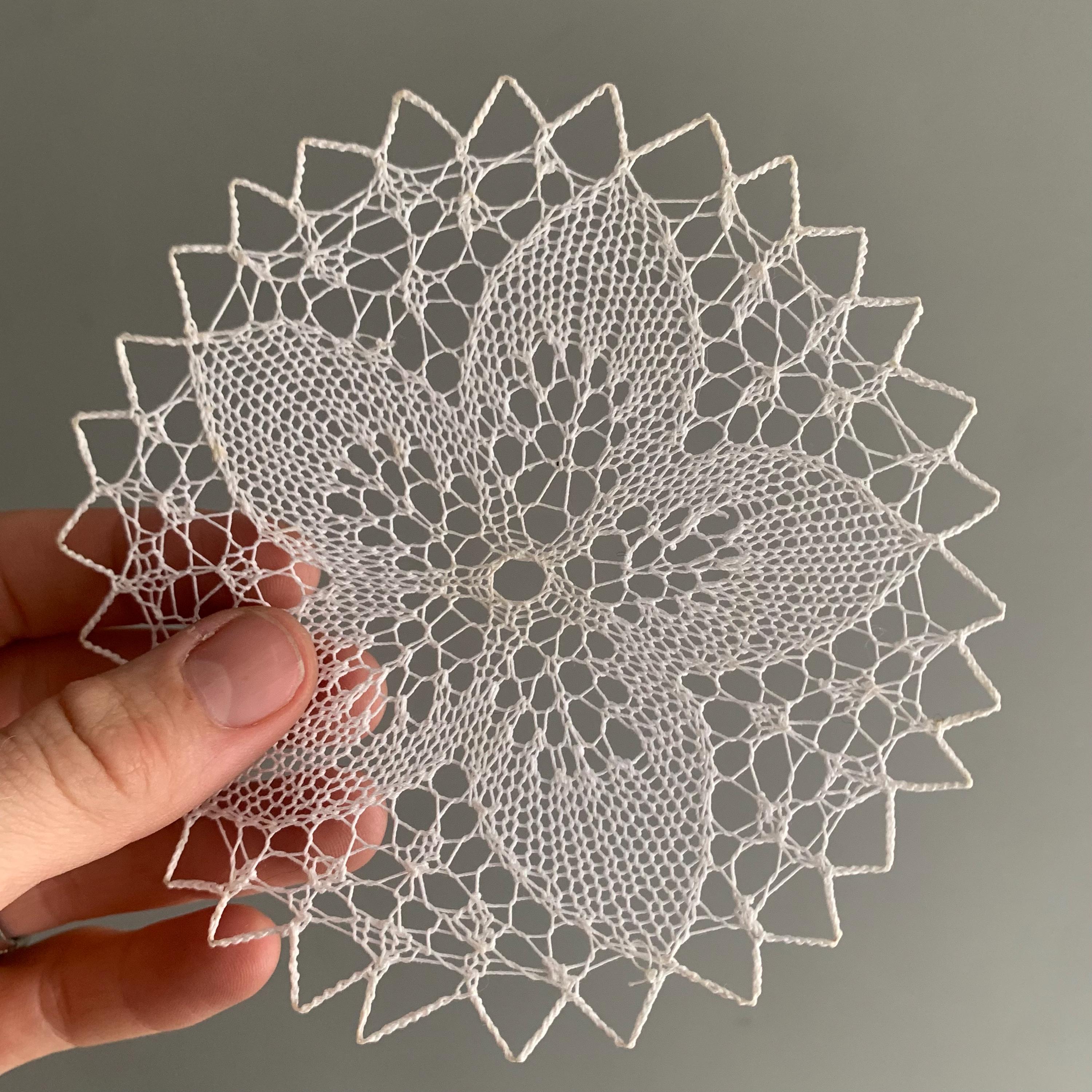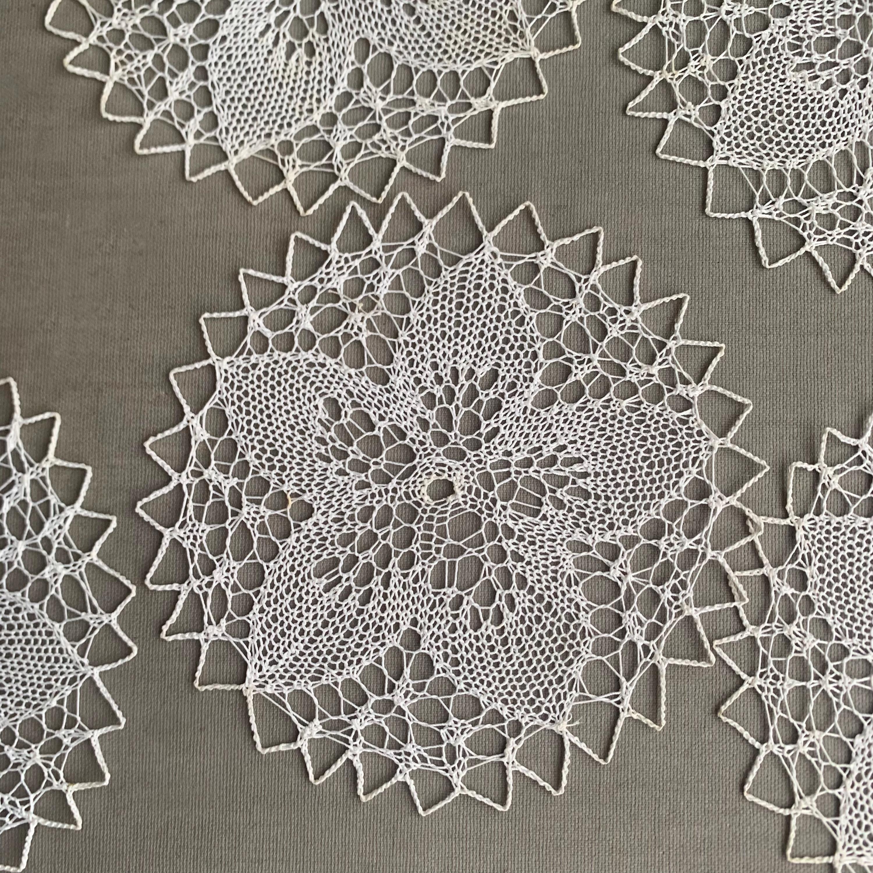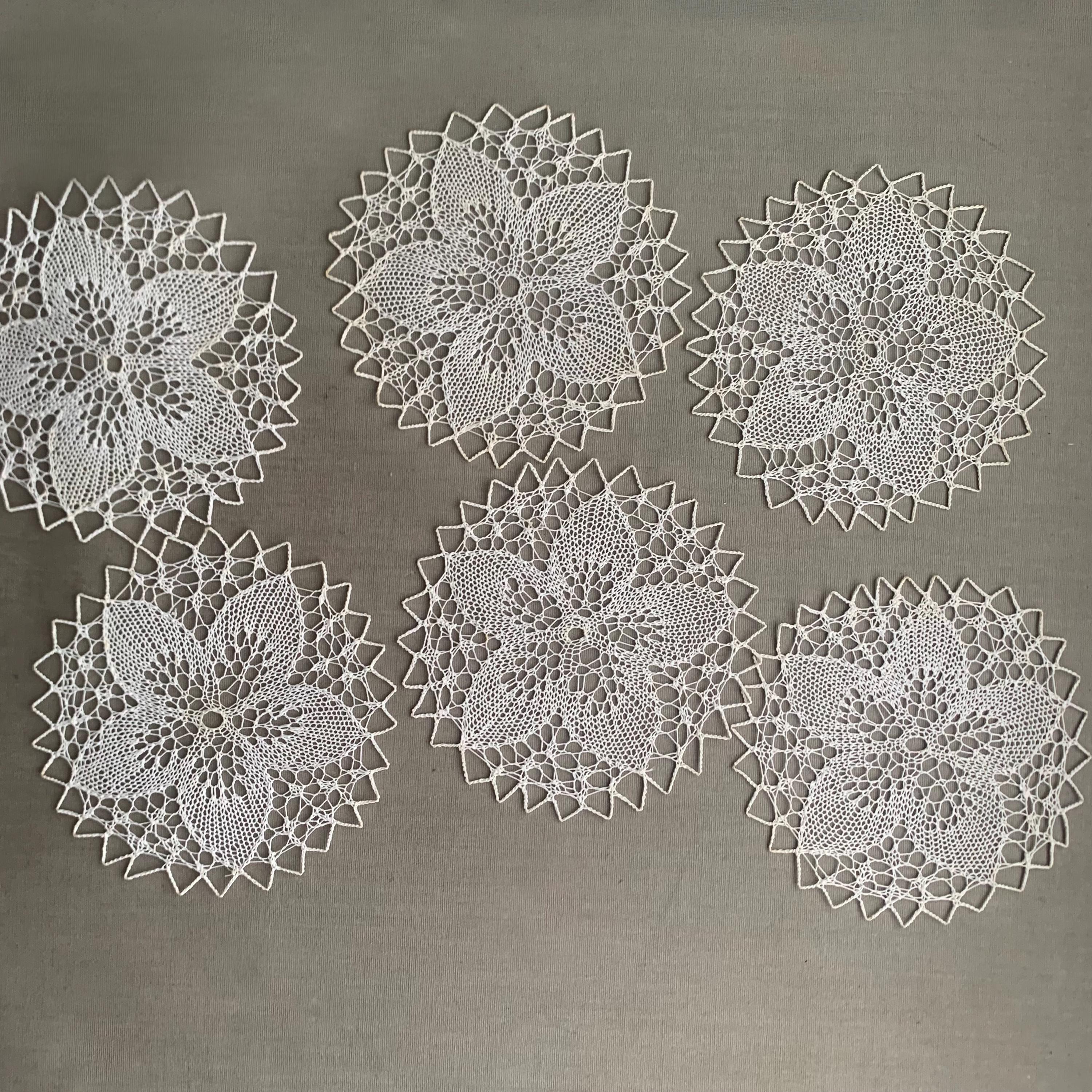 Doilies are typically made from cotton thread through techniques like crocheting or knitting.