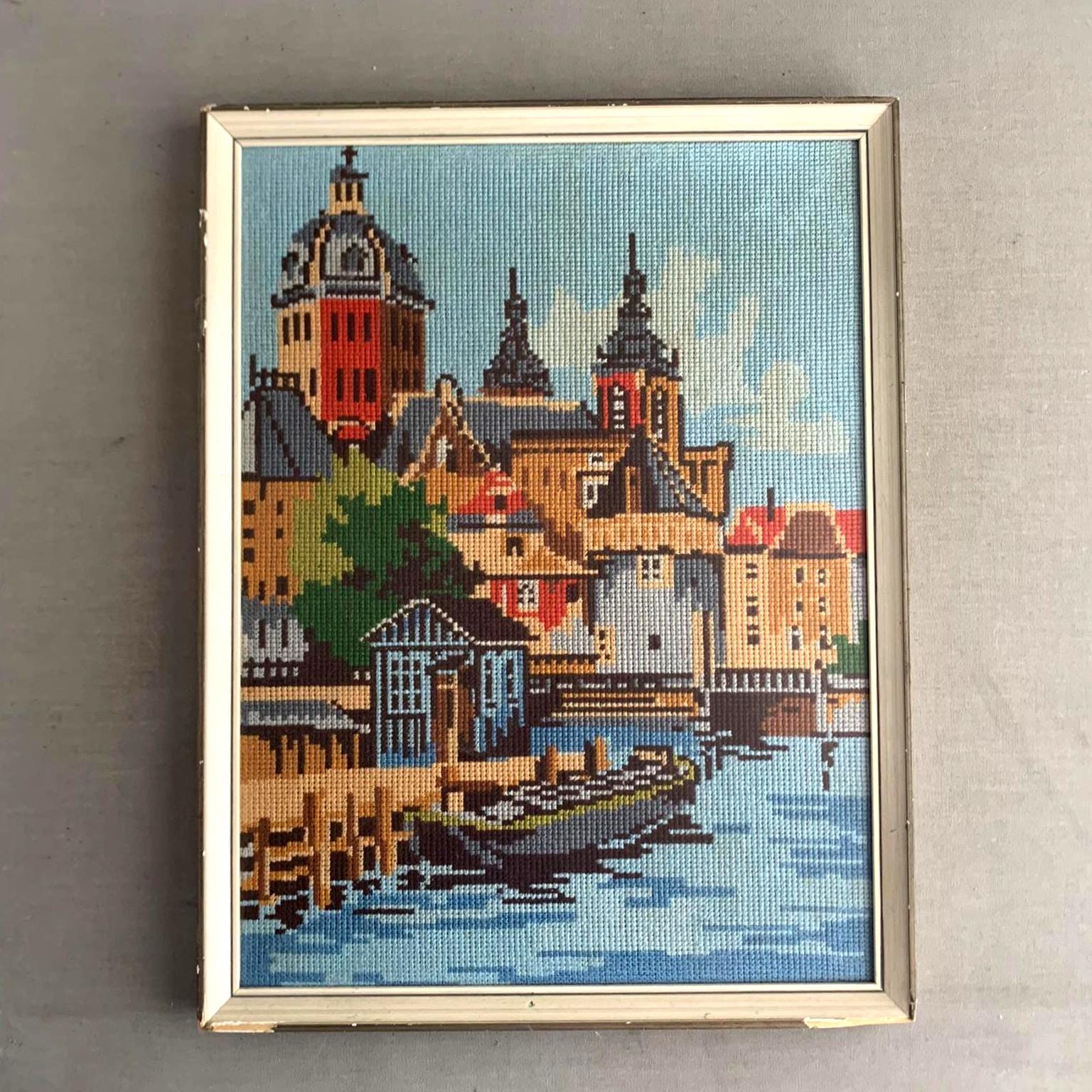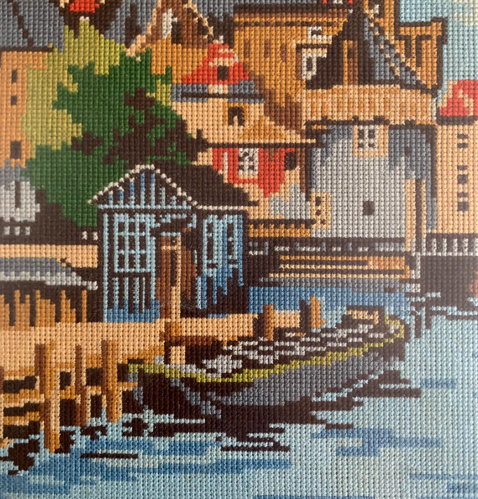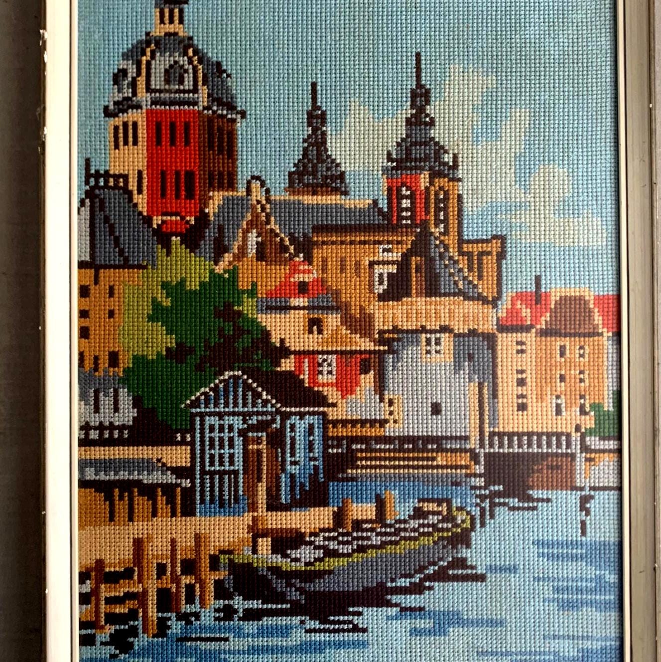 A framed needlepoint artwork .Hand-stitched/ handmade using wool . Depicting a colorful European canal cityscape. The scene features intricate architectural details, historic buildings with distinctive towers, and a boat on the water in the foreground.