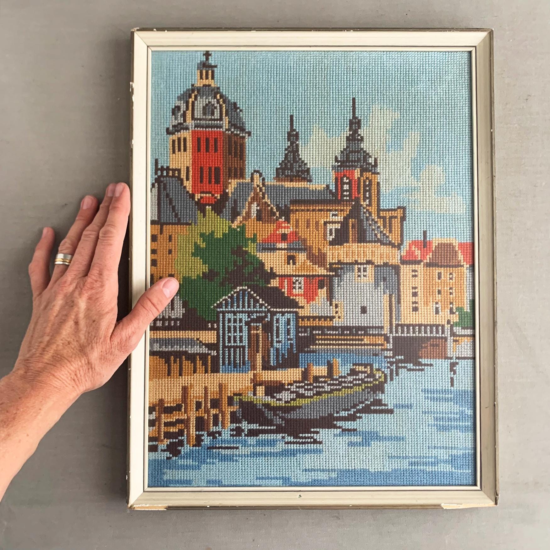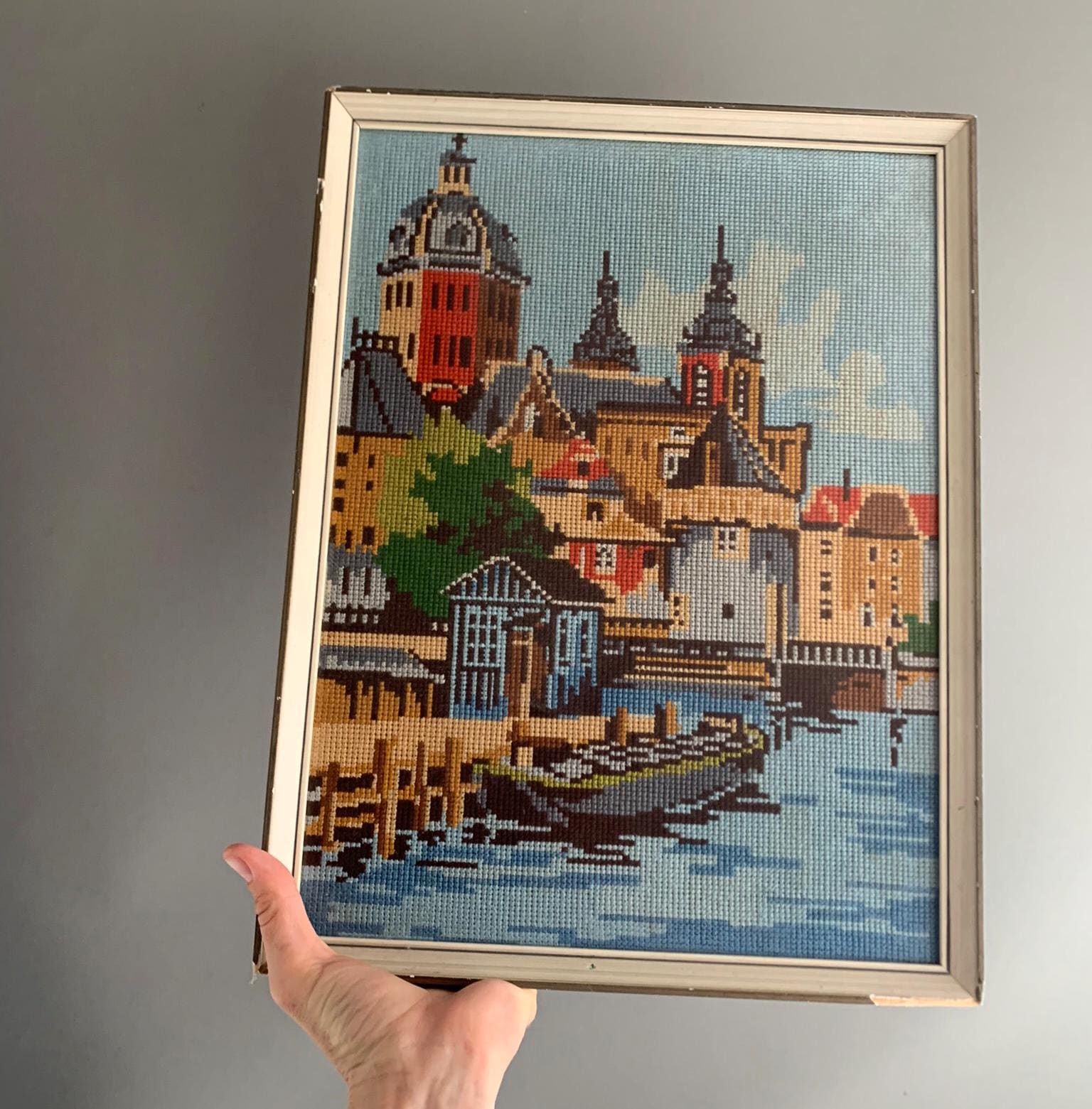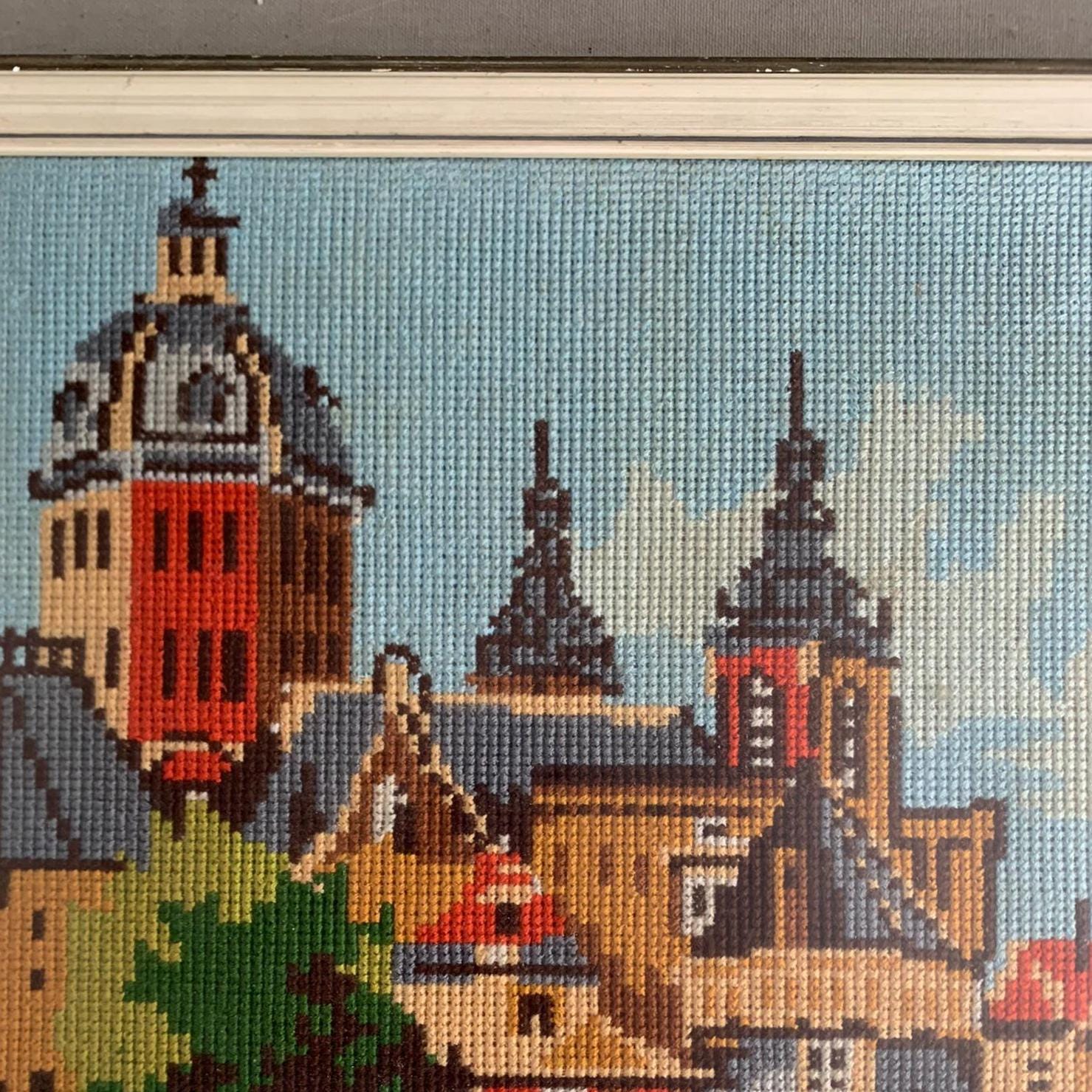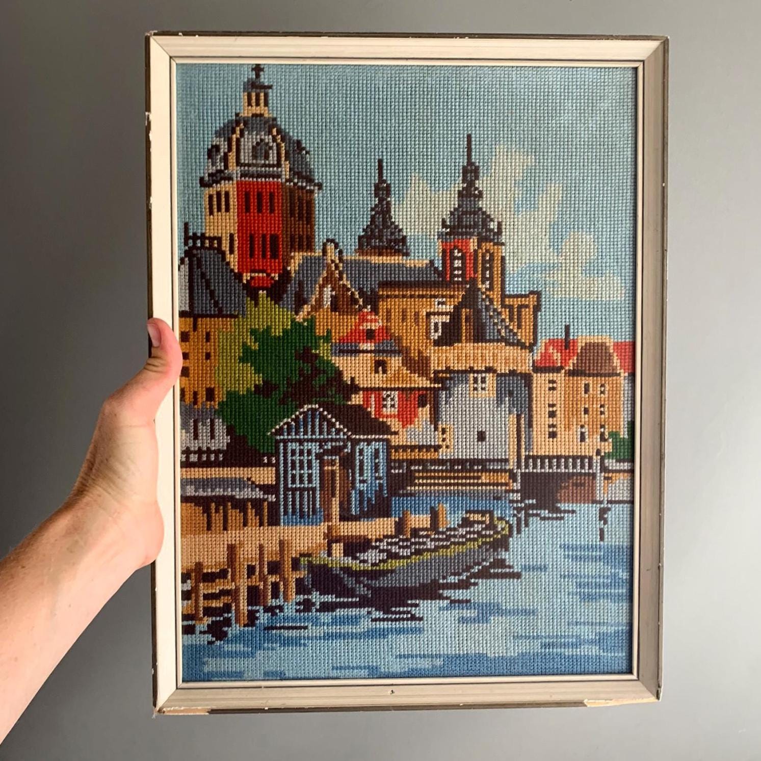 A framed needlepoint artwork .Hand-stitched/ handmade using wool . Depicting a colorful European canal cityscape. The scene features intricate architectural details, historic buildings with distinctive towers, and a boat on the water in the foreground.