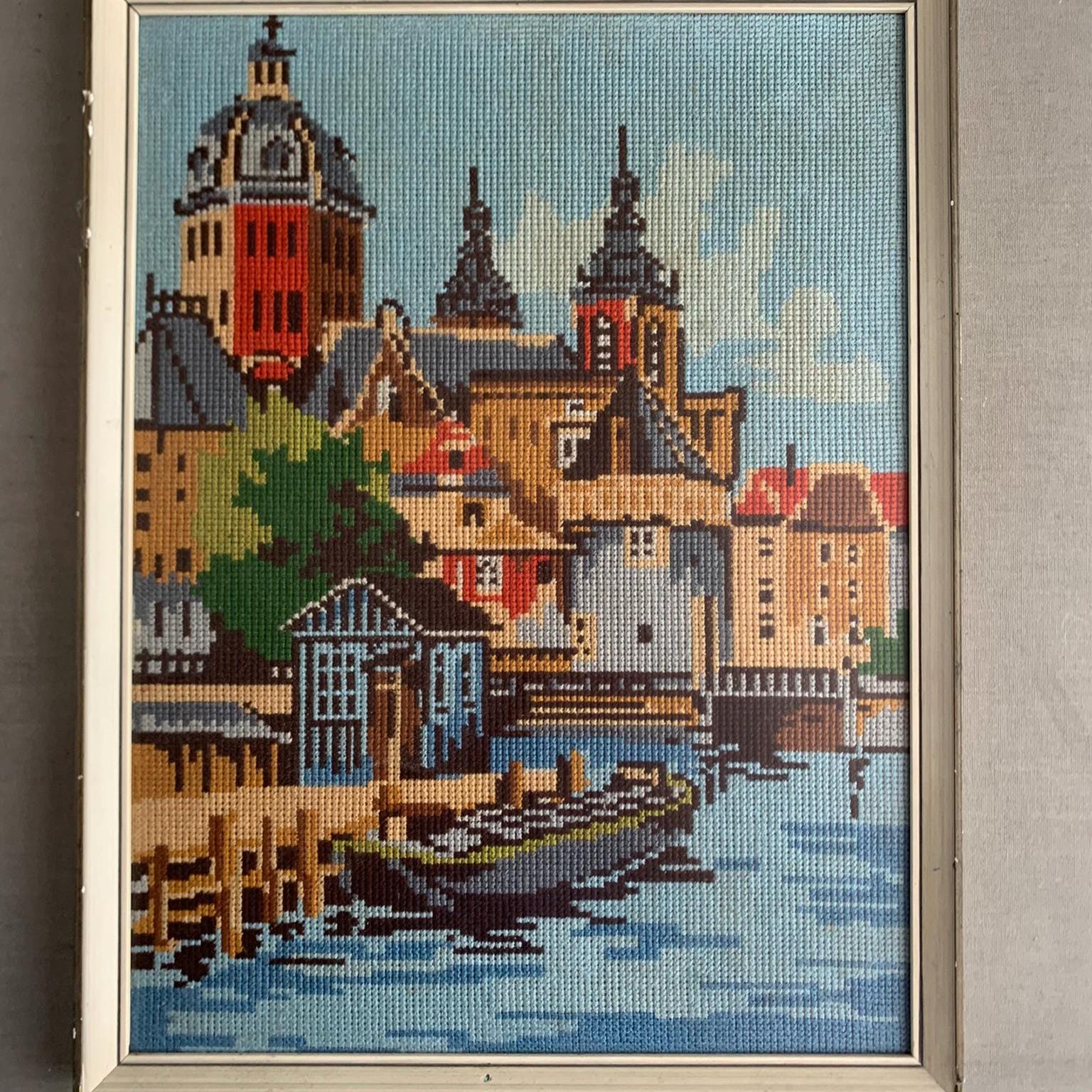 It captures a serene waterfront scene, commonly found in vintage needlework patterns that depict European cities. The exact location depicted may be a generic European-style city, or possibly based on a famous view like Copenhagen or budapest . in a simple white frame with gold details . It is glazed so in great condition