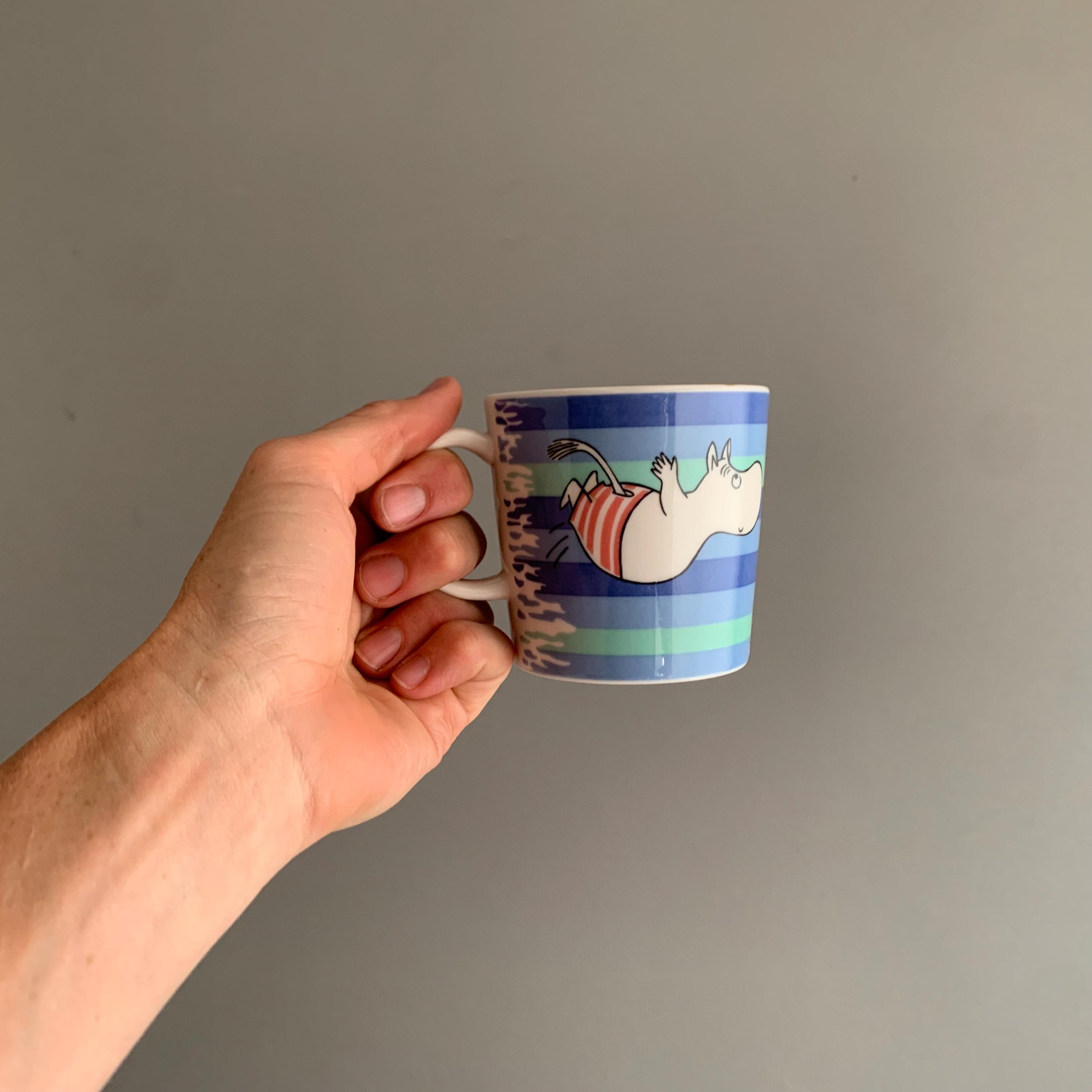 "Dive" was launched in the summer of 2006 and was the first Moomin seasonal summer mug produced .The illustration on both sides of the mug is from the comic #5 Moomin’s Winter Follies (1955) illustrated by Tove Jansson