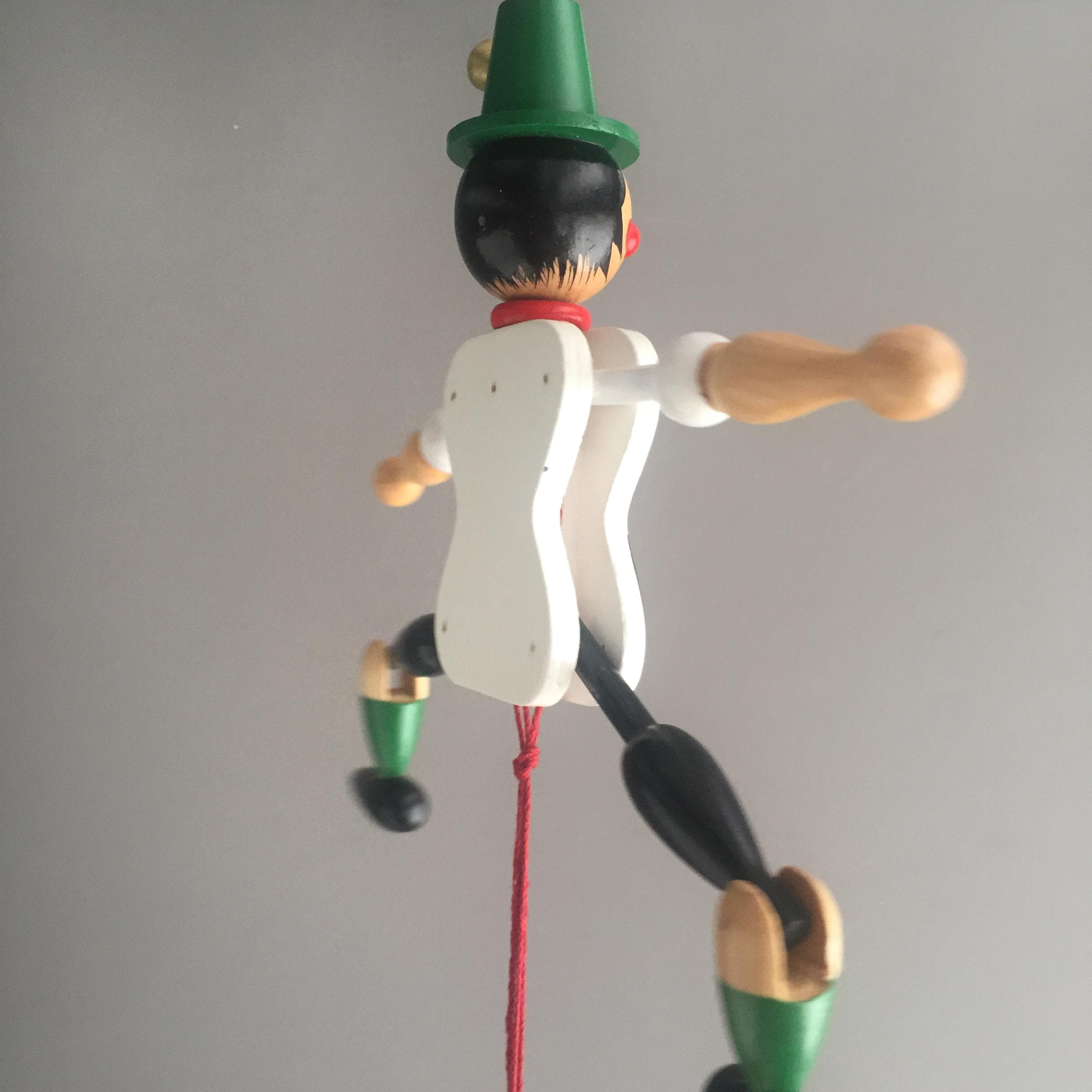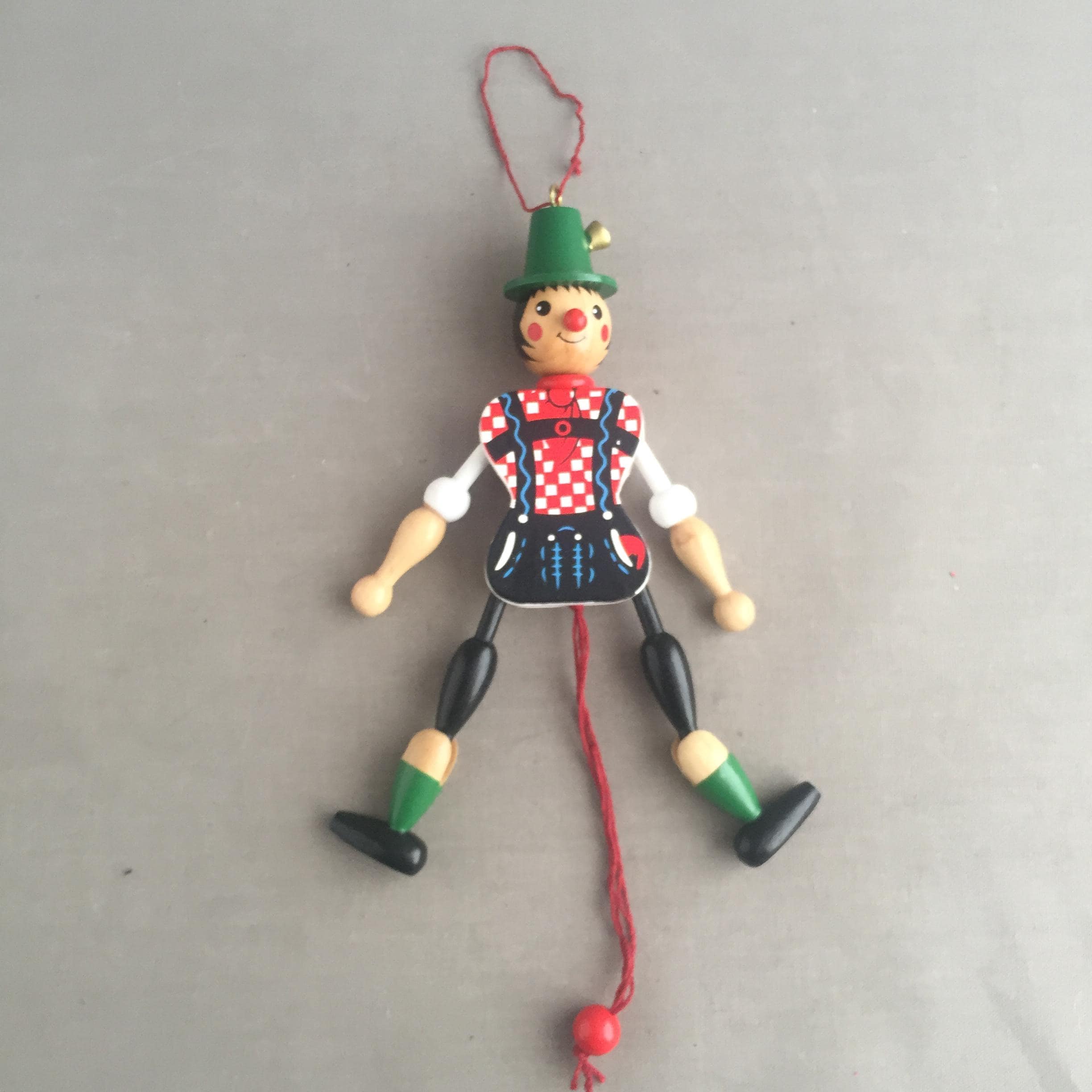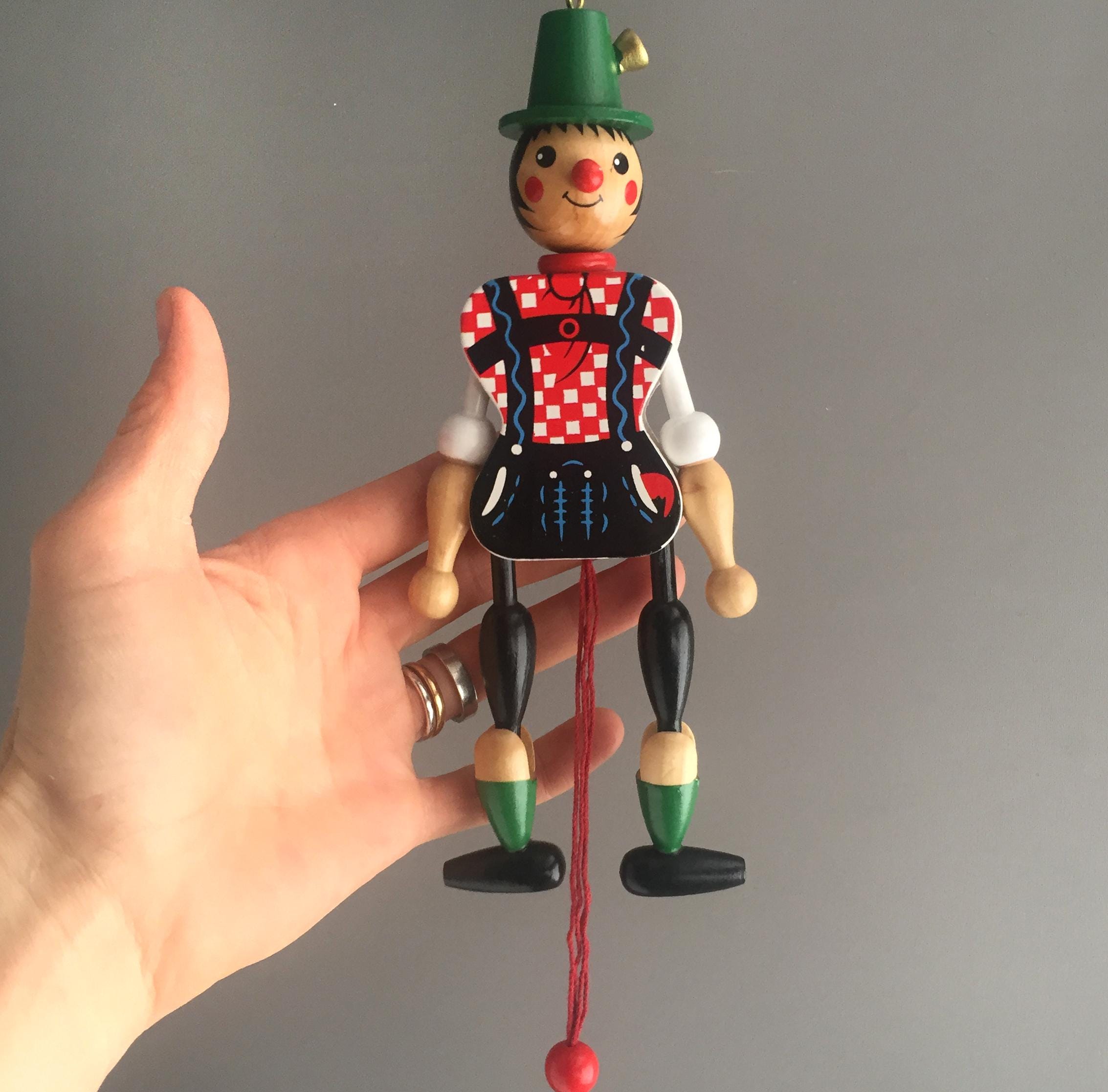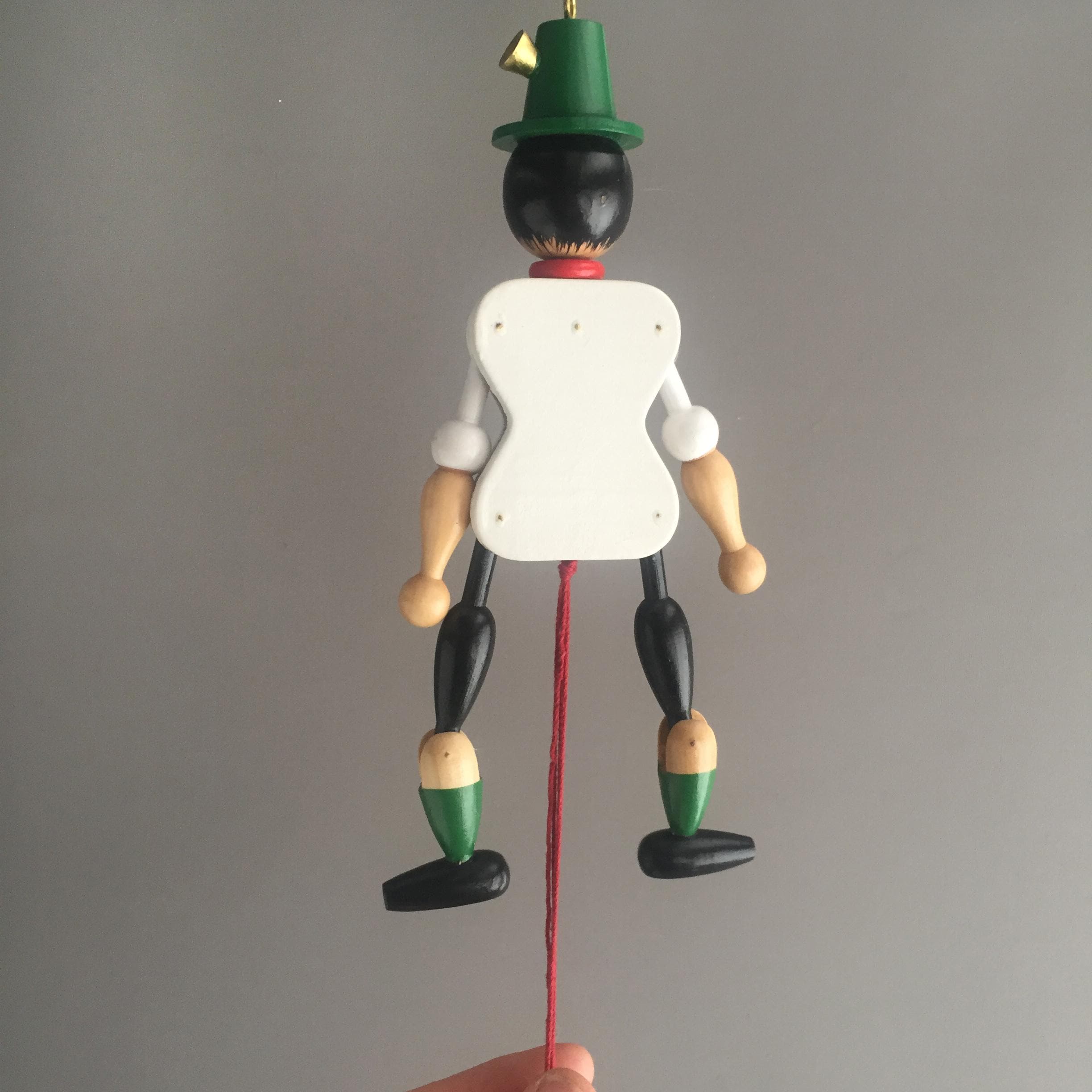 It is a jointed flat wooden figure with a pull string at the bottom.