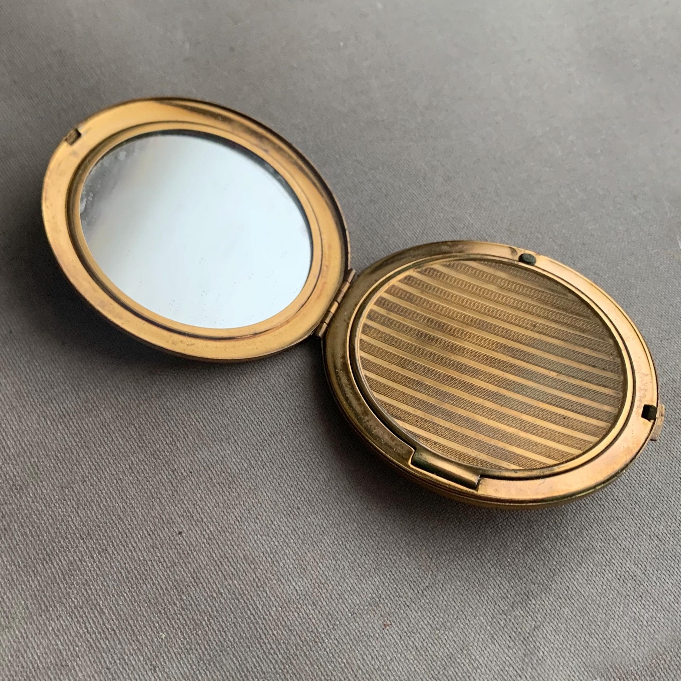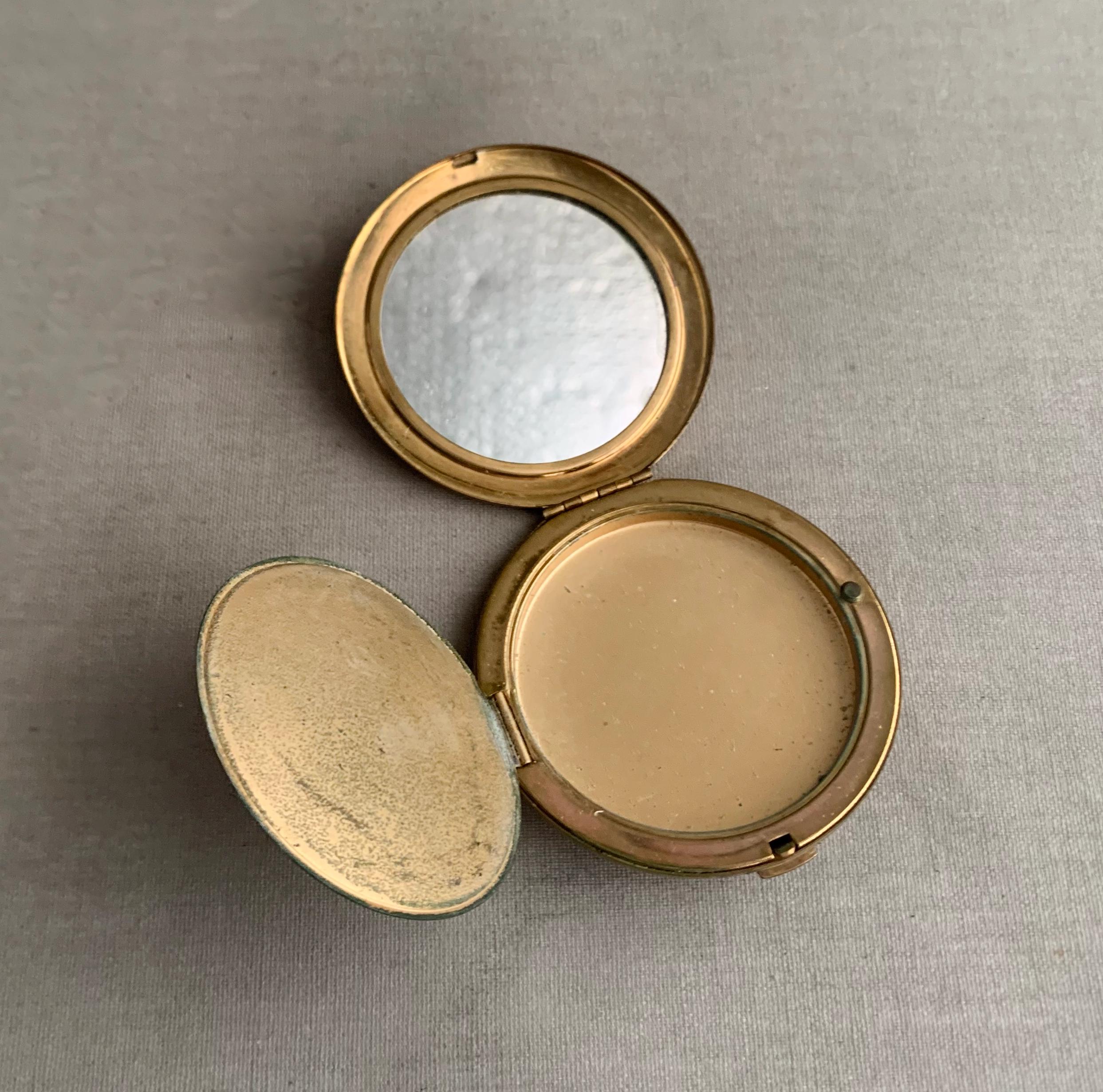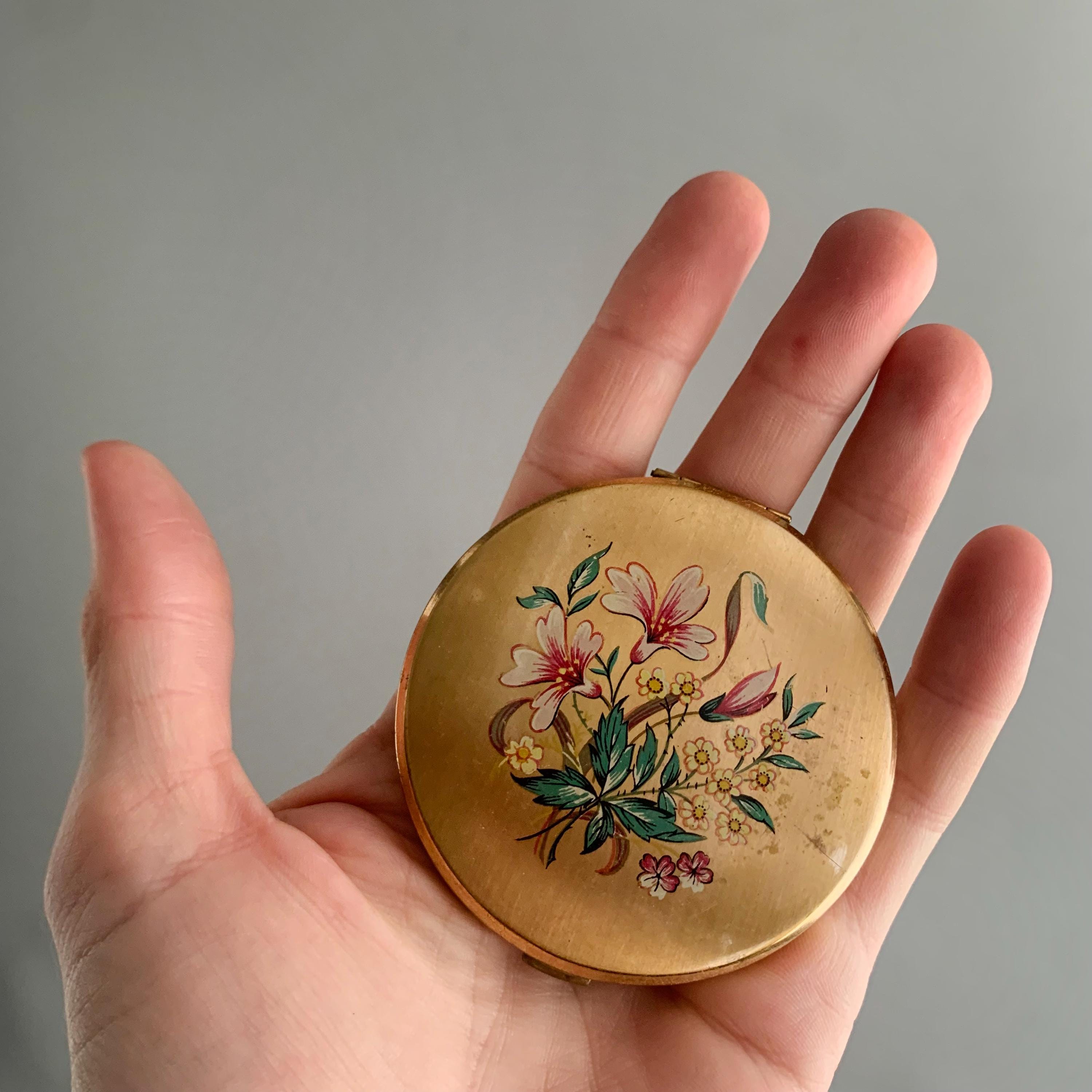 A sweet little gold coloured make up /powder compact with internal mirror. It has a very pretty floral motif on the outside. circa 1960s