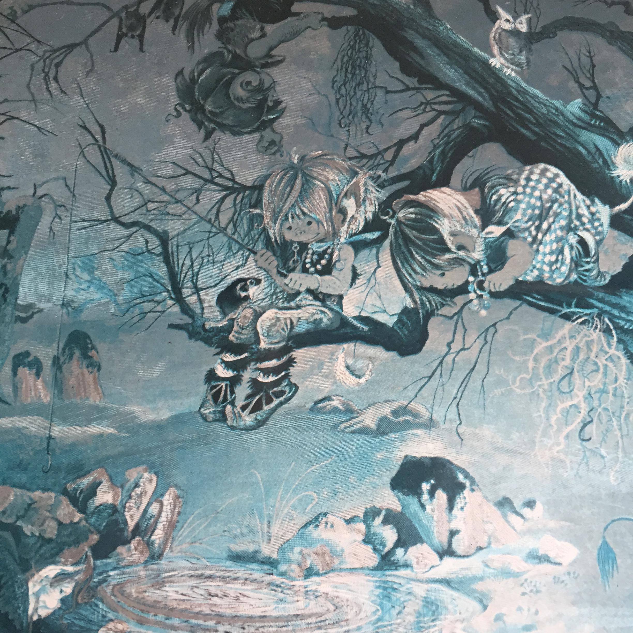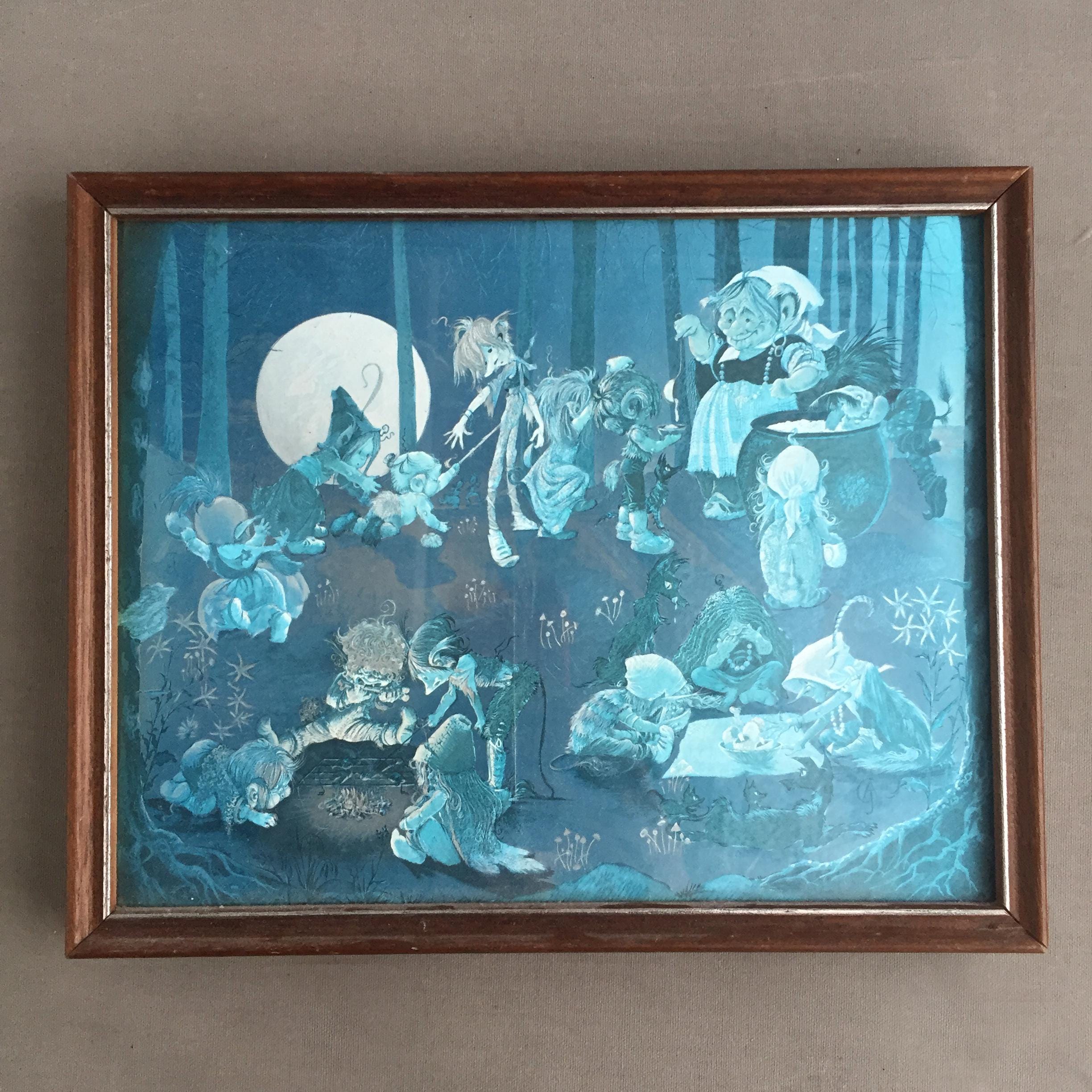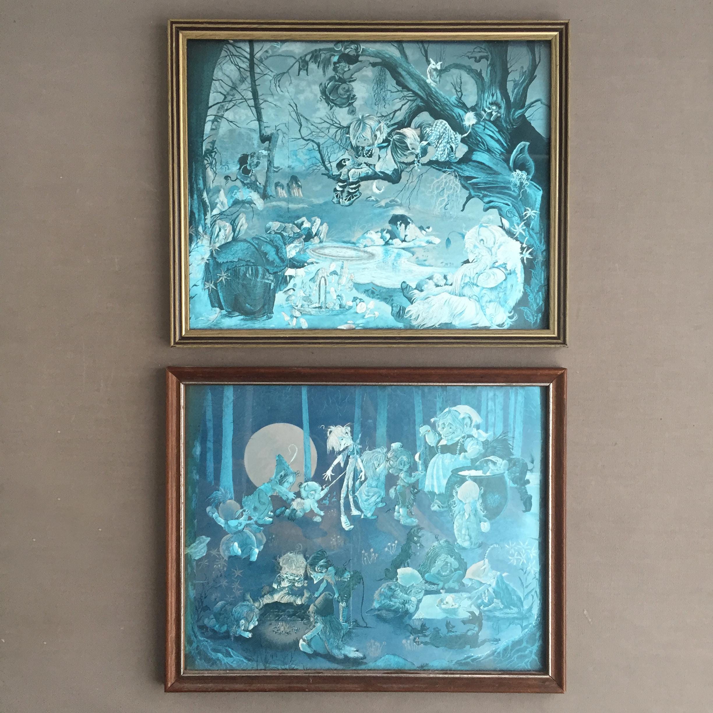The images depicts a whimsical fantasy scene with fairies and other creatures in a forest setting. The other print features a scene of witches, goblins, and elves gathering around a cauldron in a forest under a full moon.