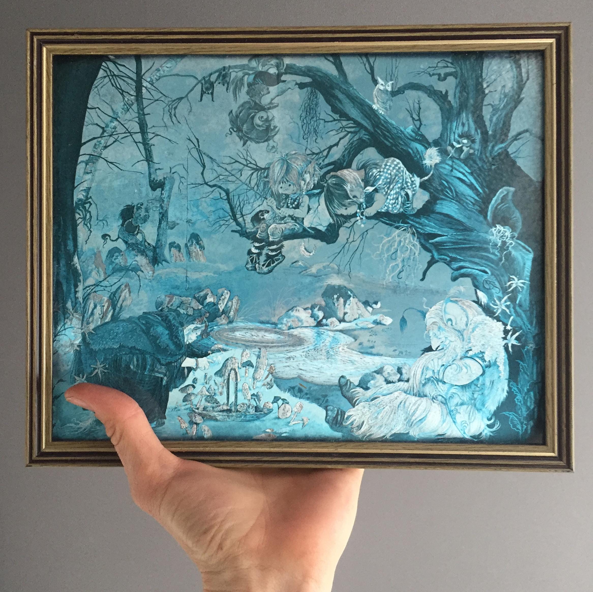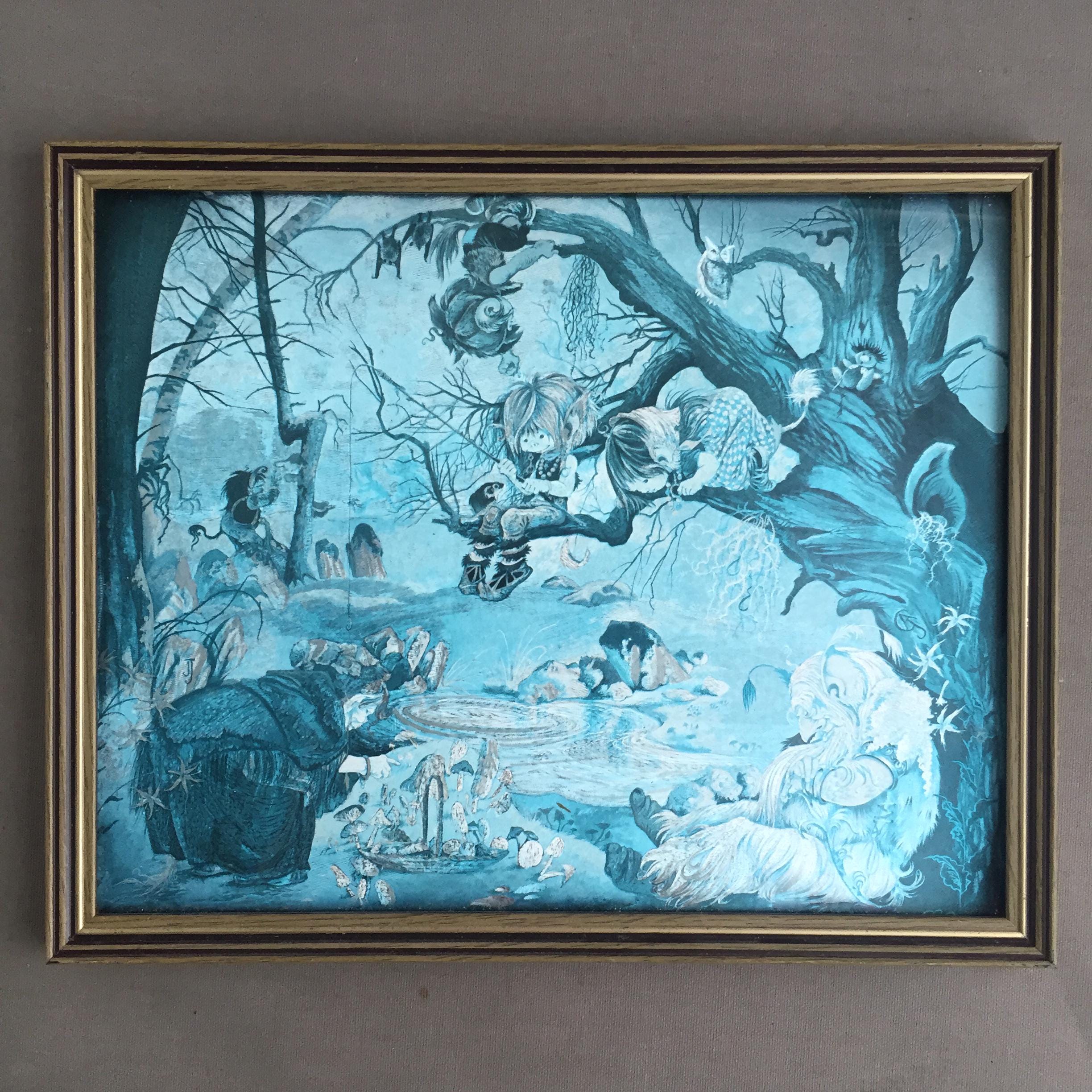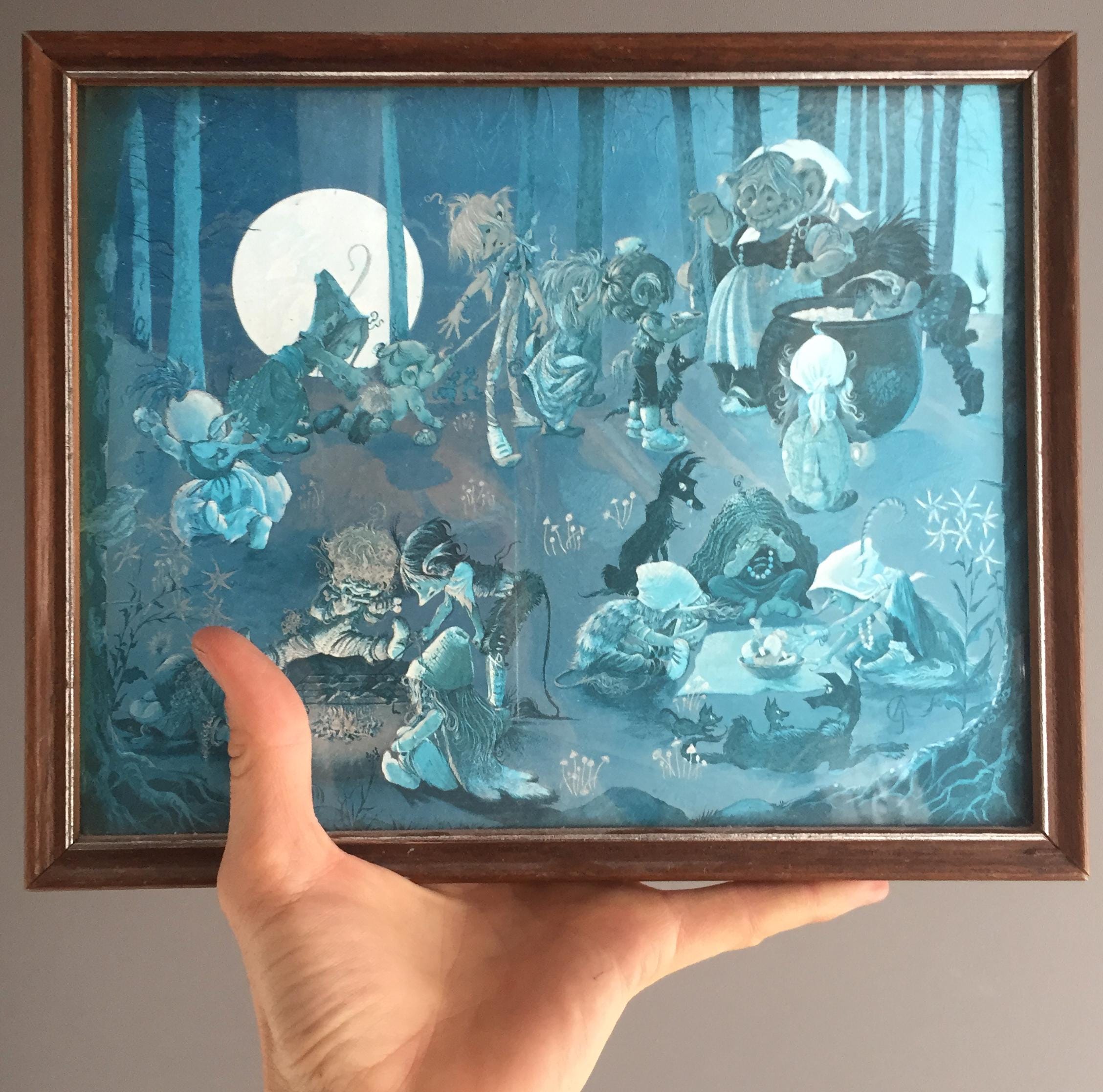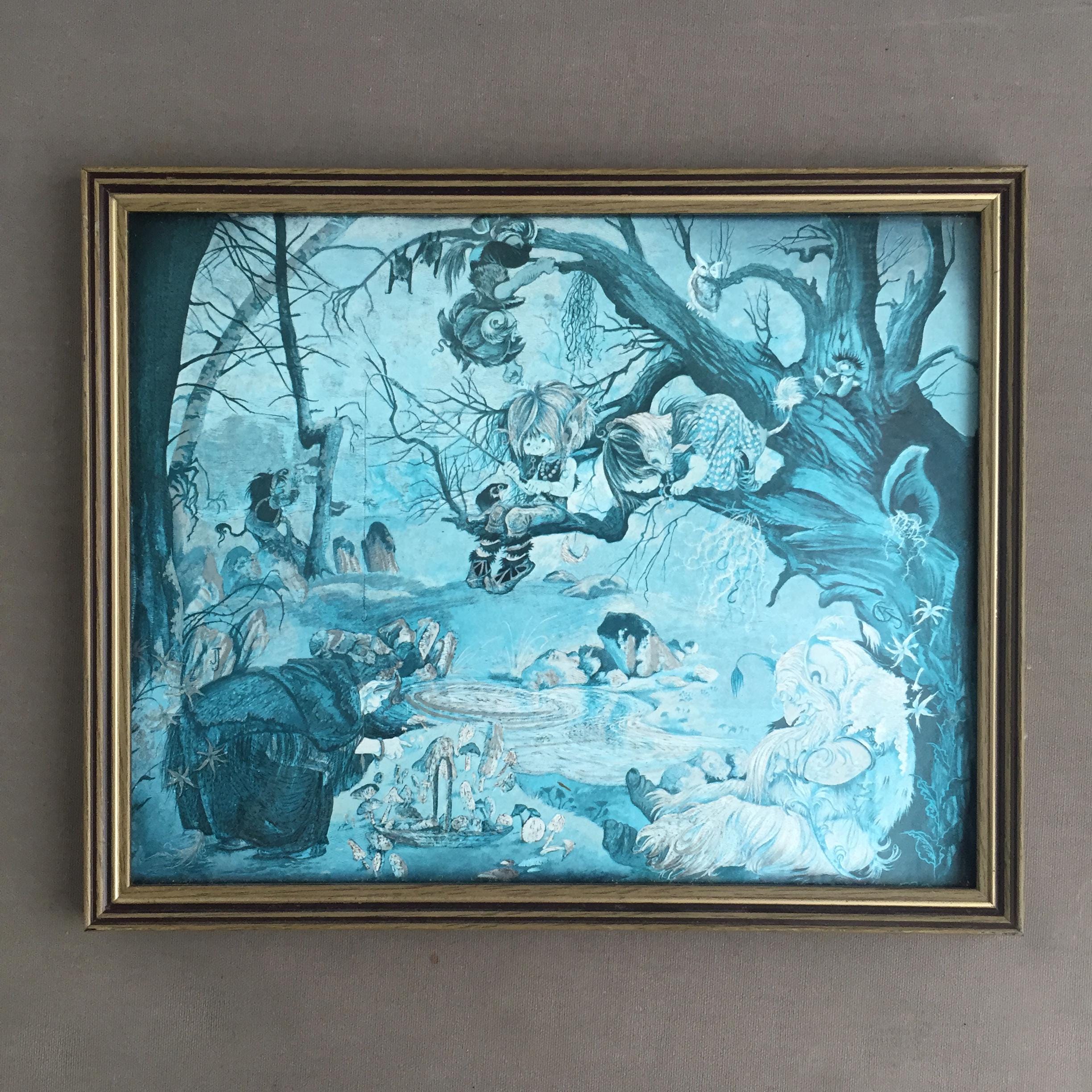 The images depicts a whimsical fantasy scene with fairies and other creatures in a forest setting. The other print features a scene of witches, goblins, and elves gathering around a cauldron in a forest under a full moon.