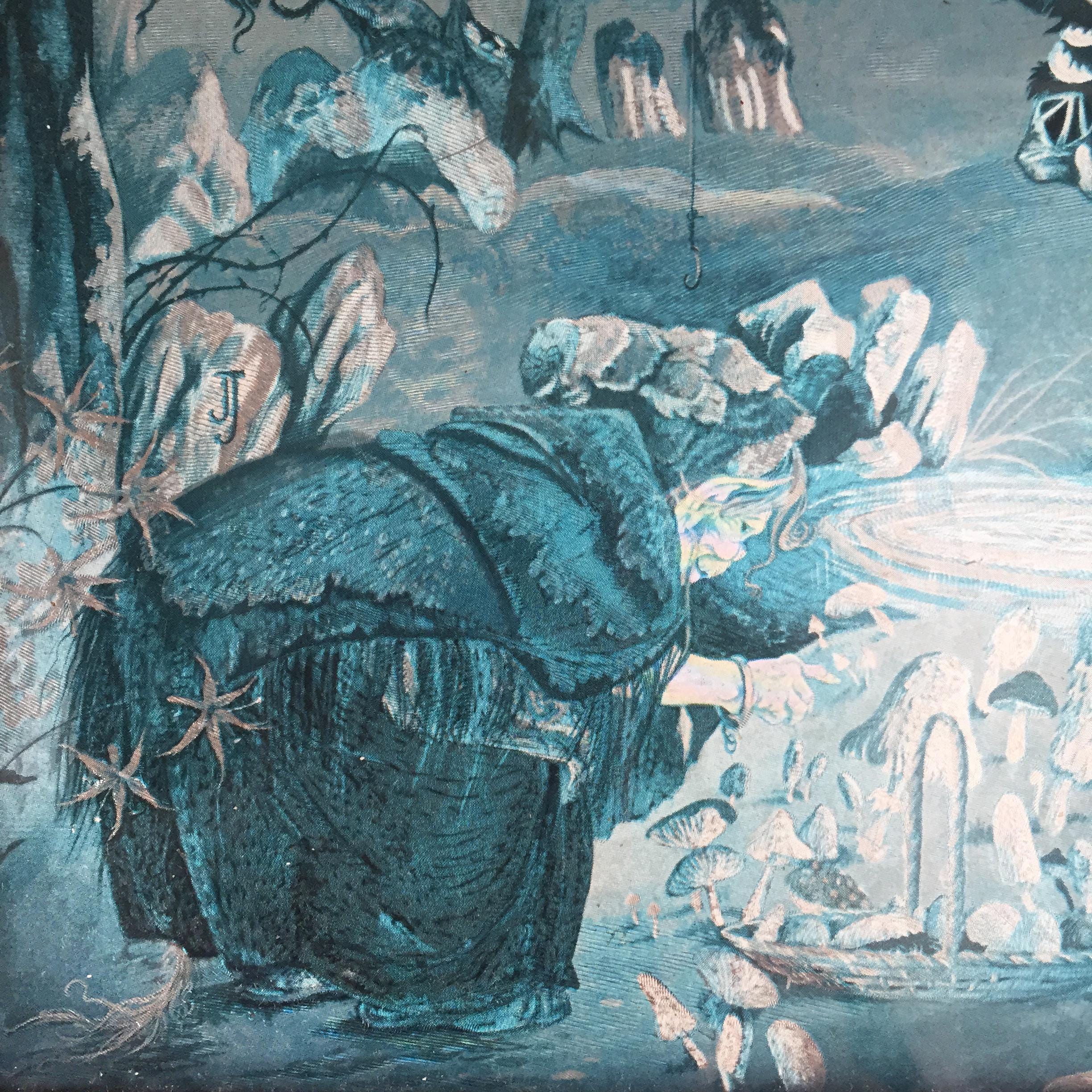 A set of vintage Dufex foil prints by the twin illustrators Janet and Anne Grahame Johnstone. The prints feature whimsical, fairy-tale-like scenes rendered in a striking blue monochrome palette on reflective foil.