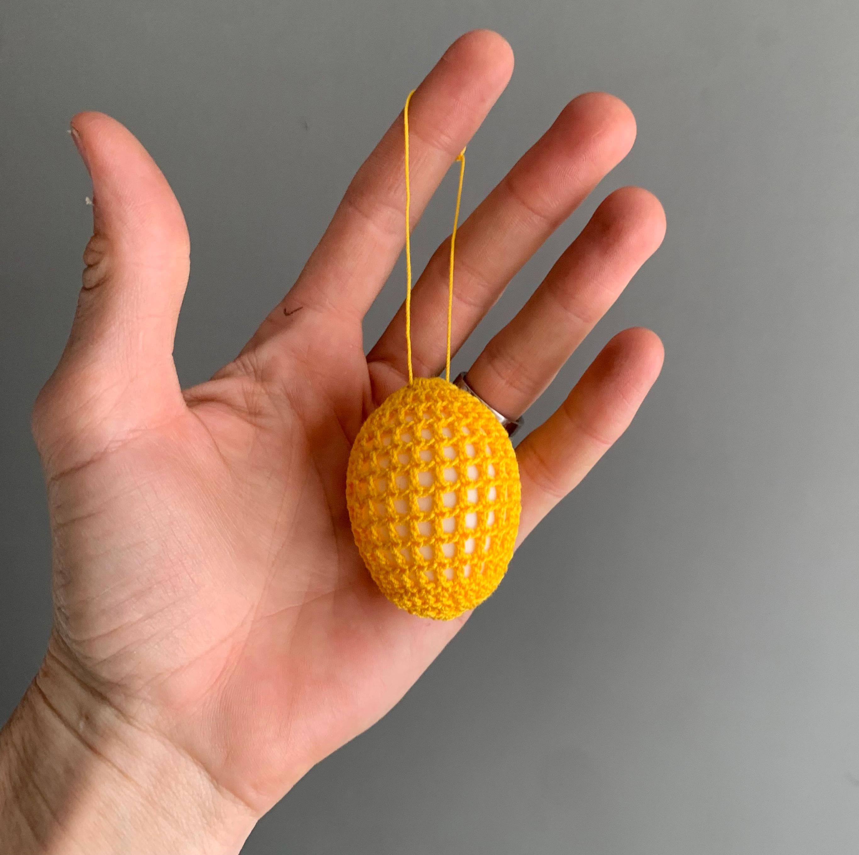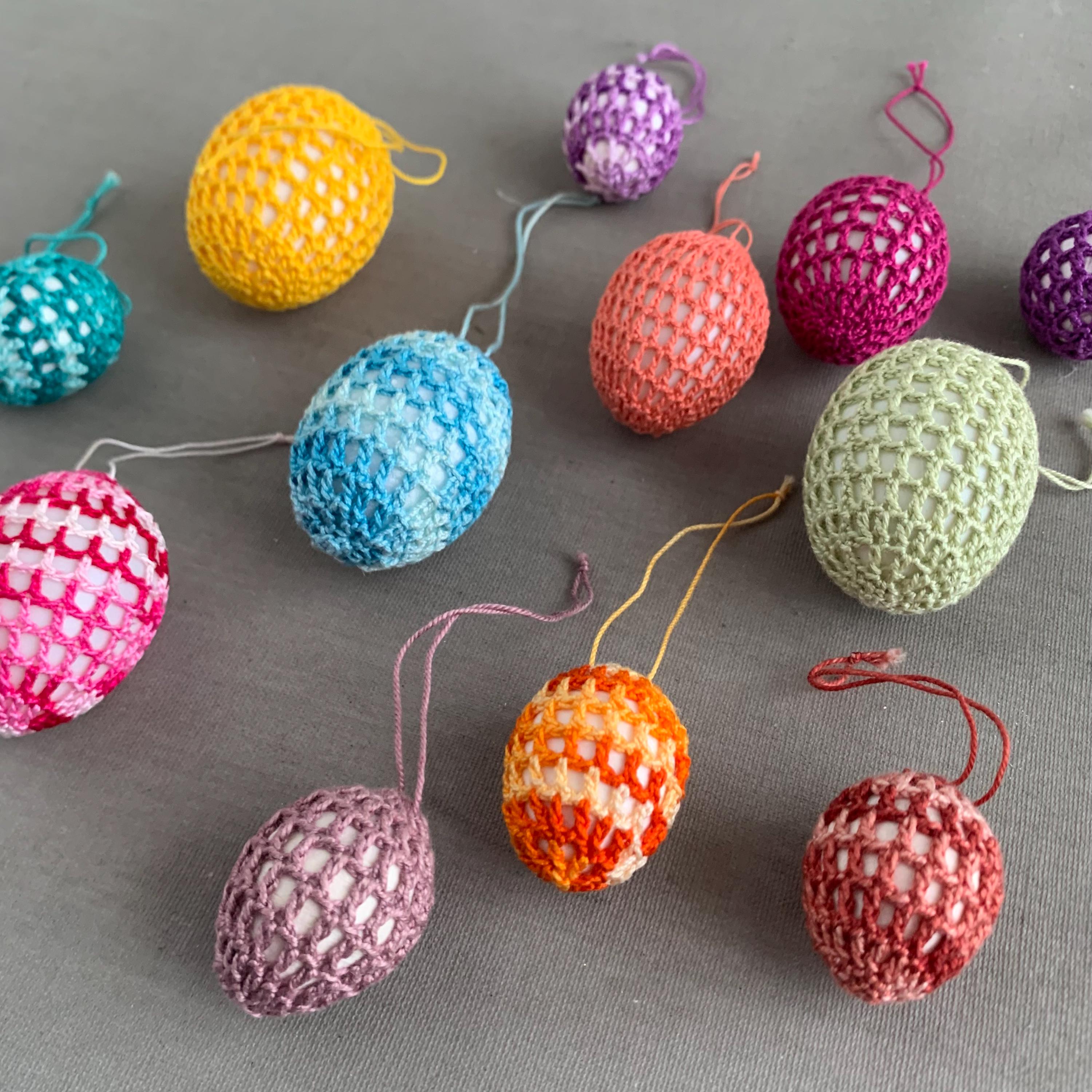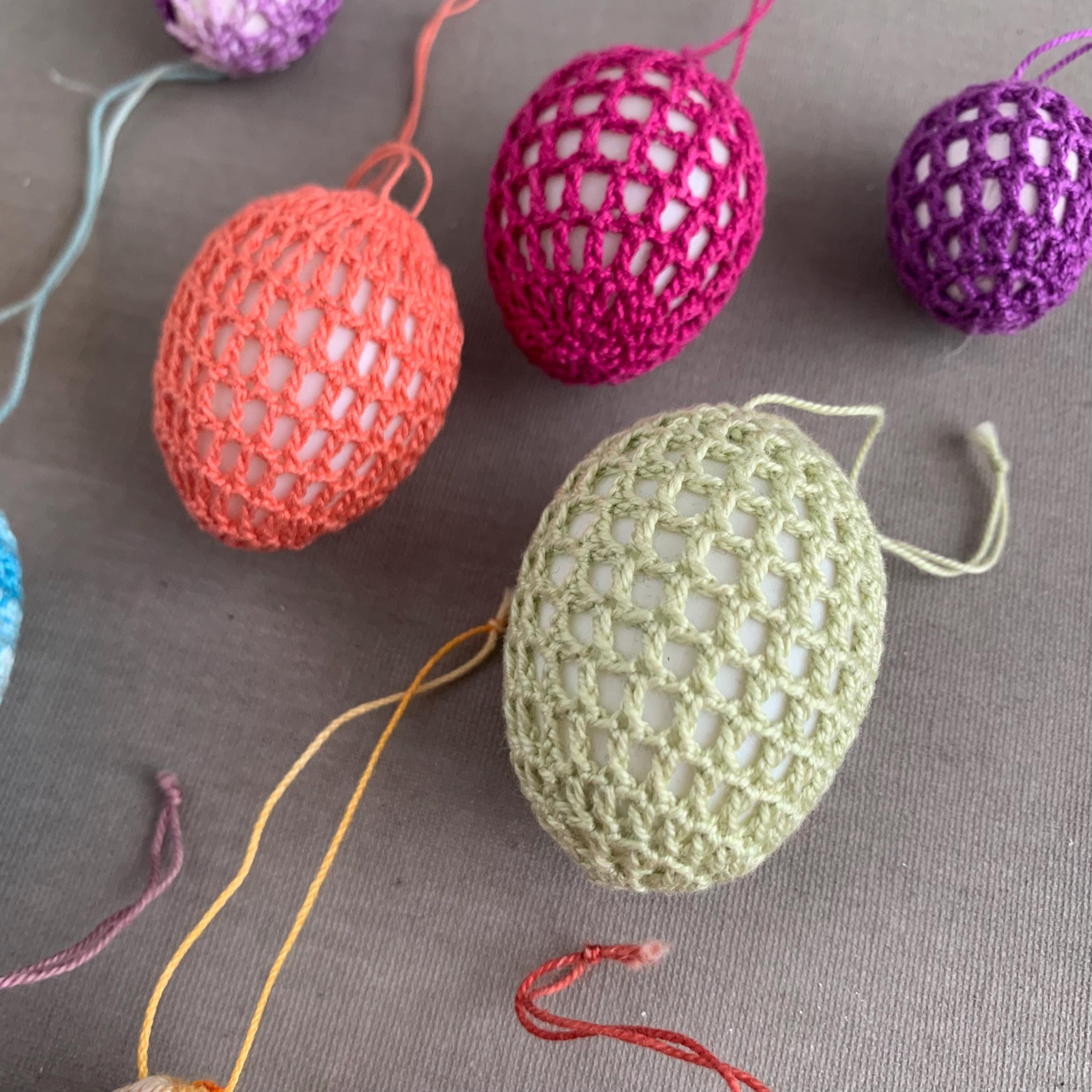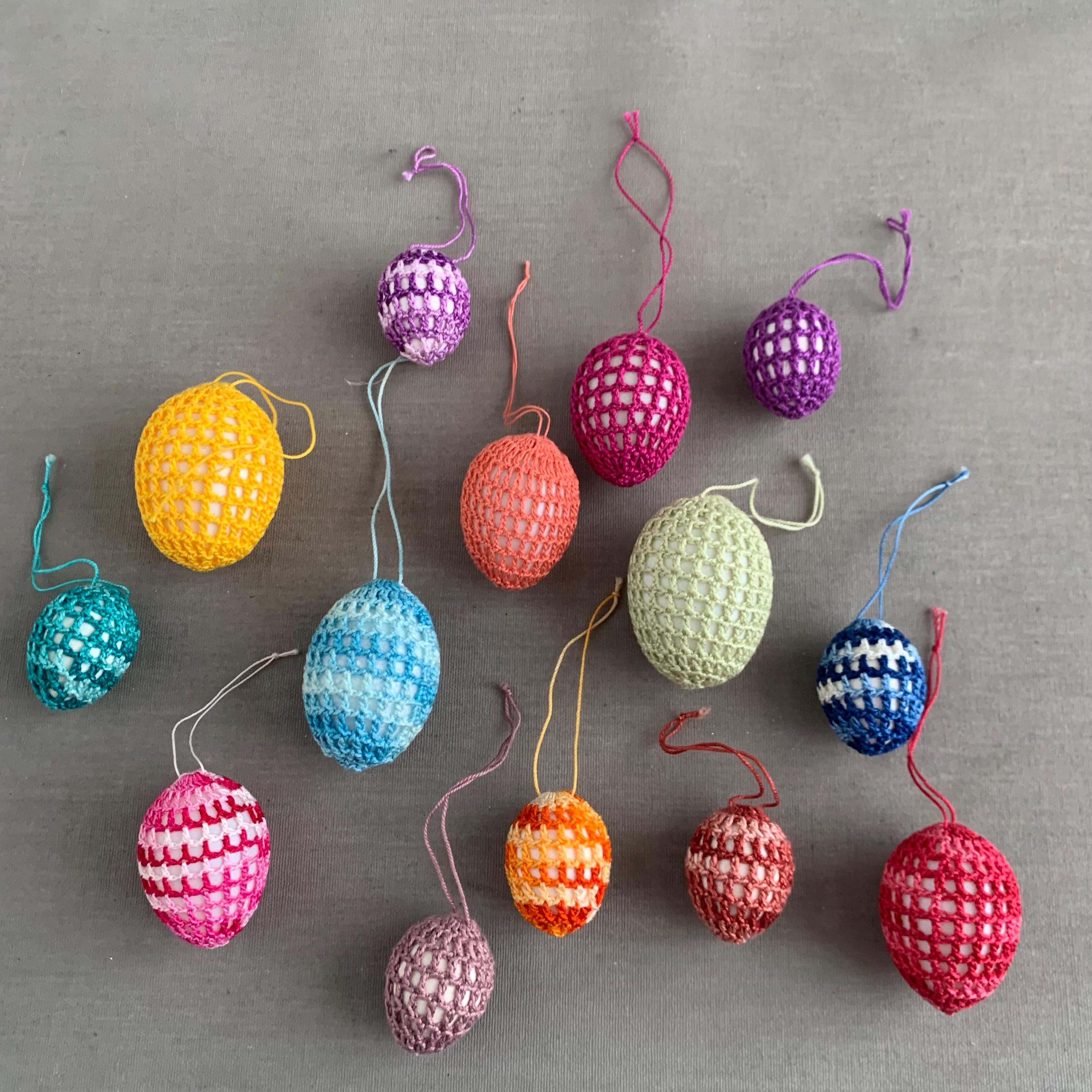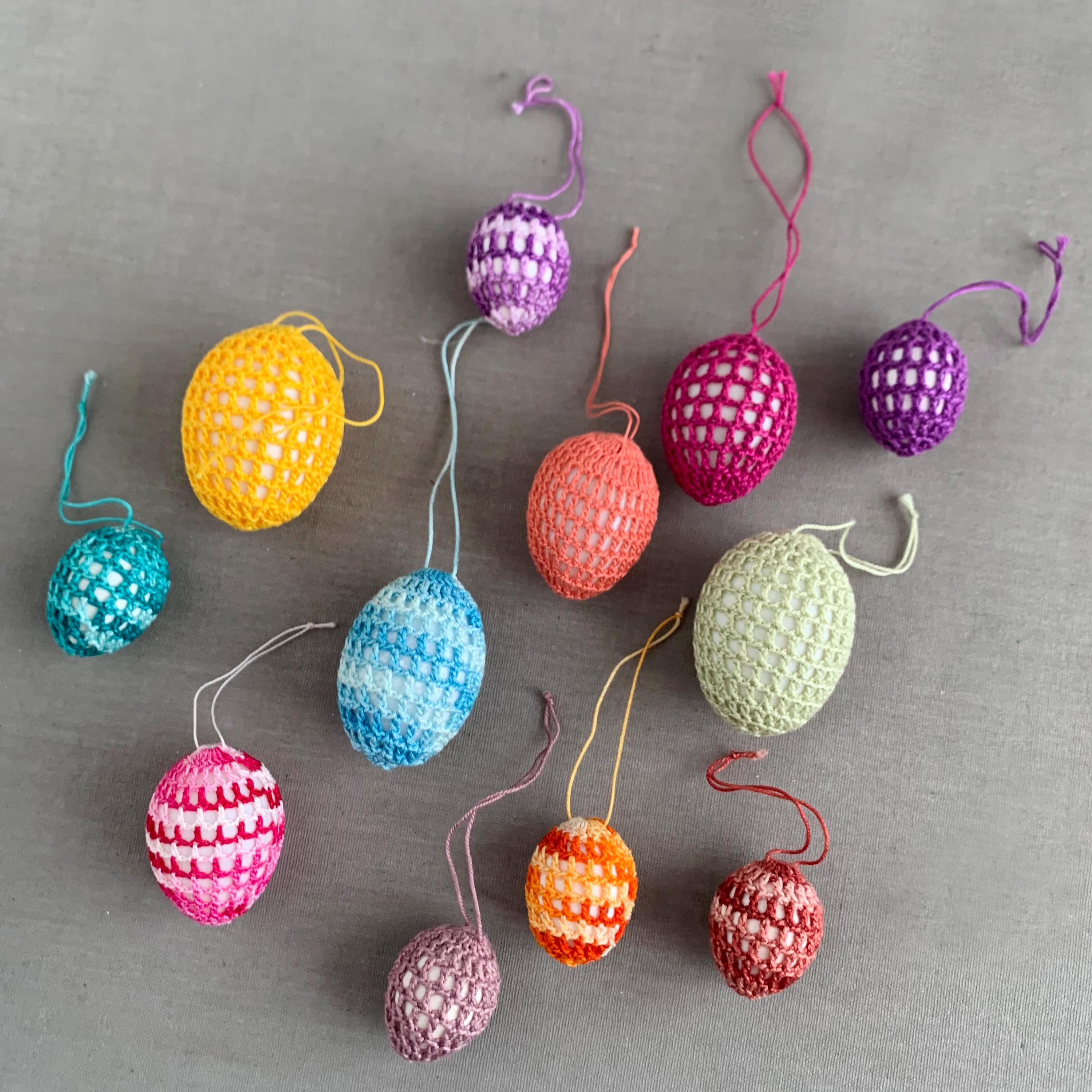 A collection of handcrafted crochet Easter egg decorations/ ornaments. Handmade in various bright colored cotton yarn.