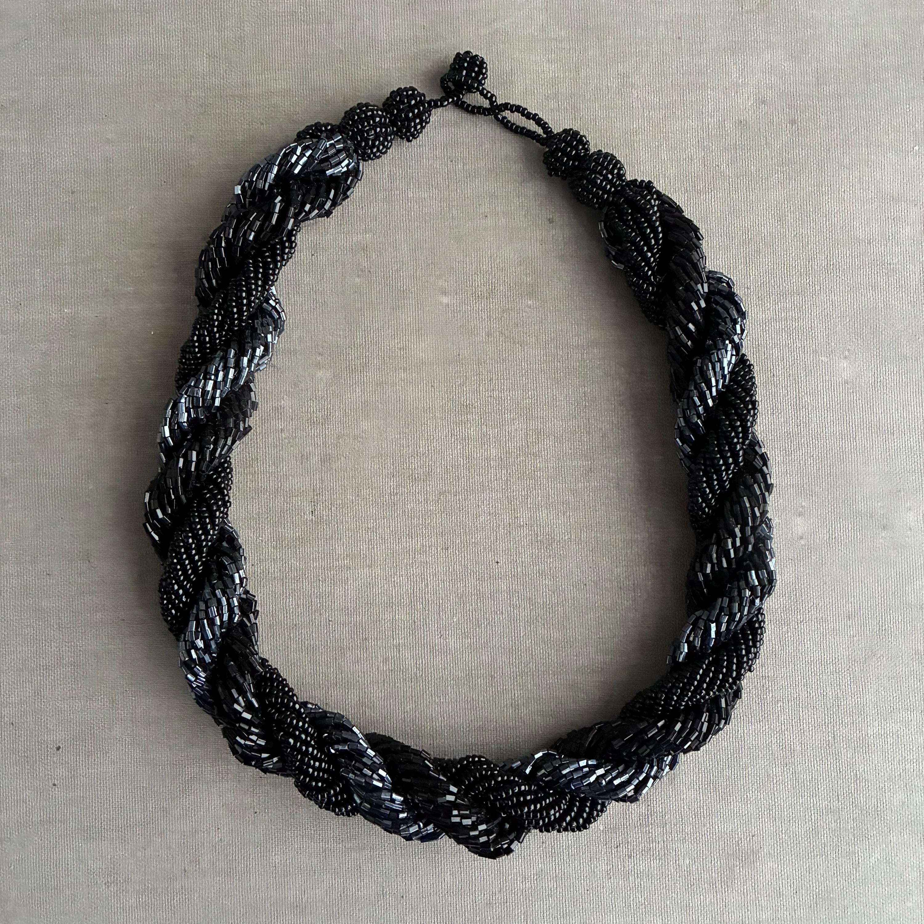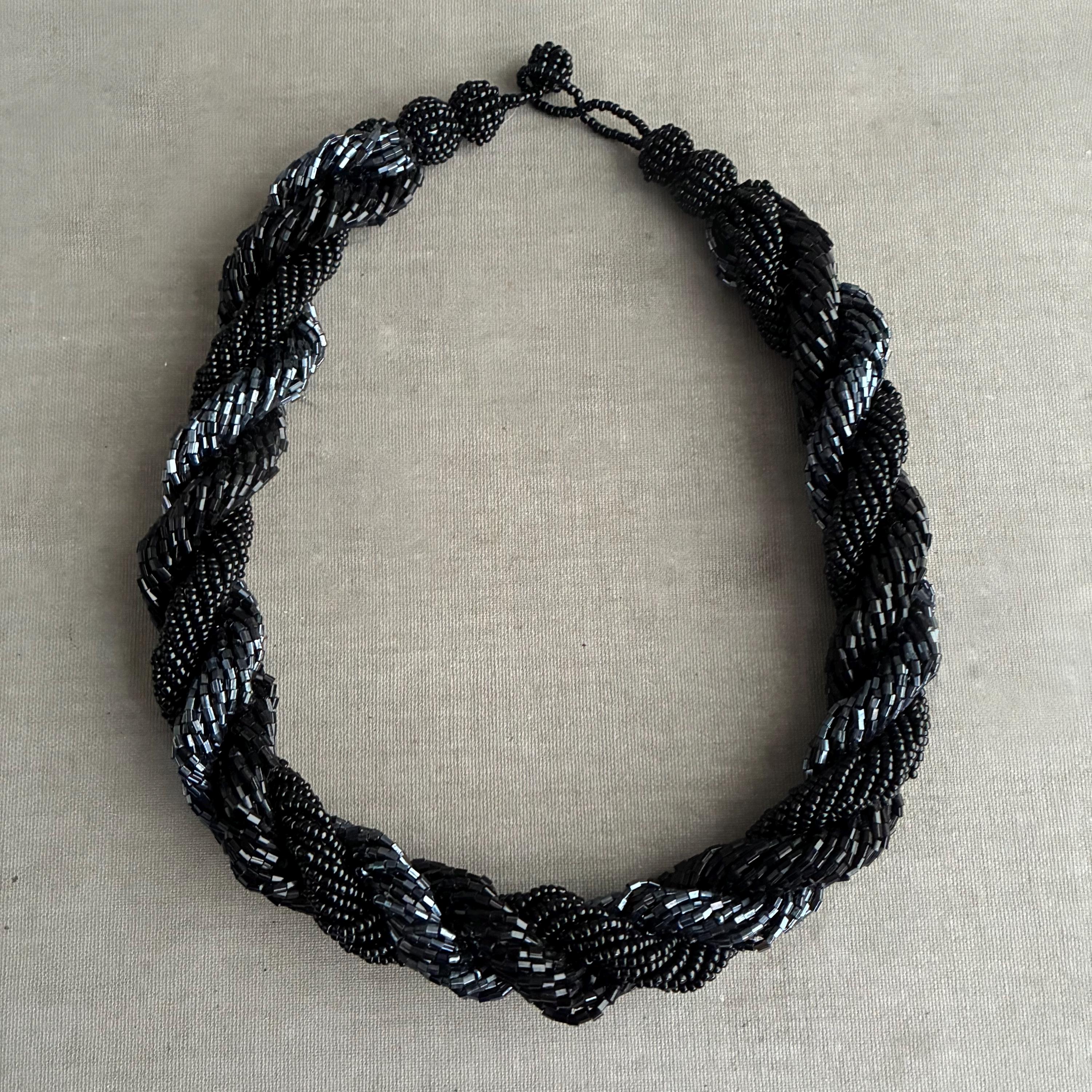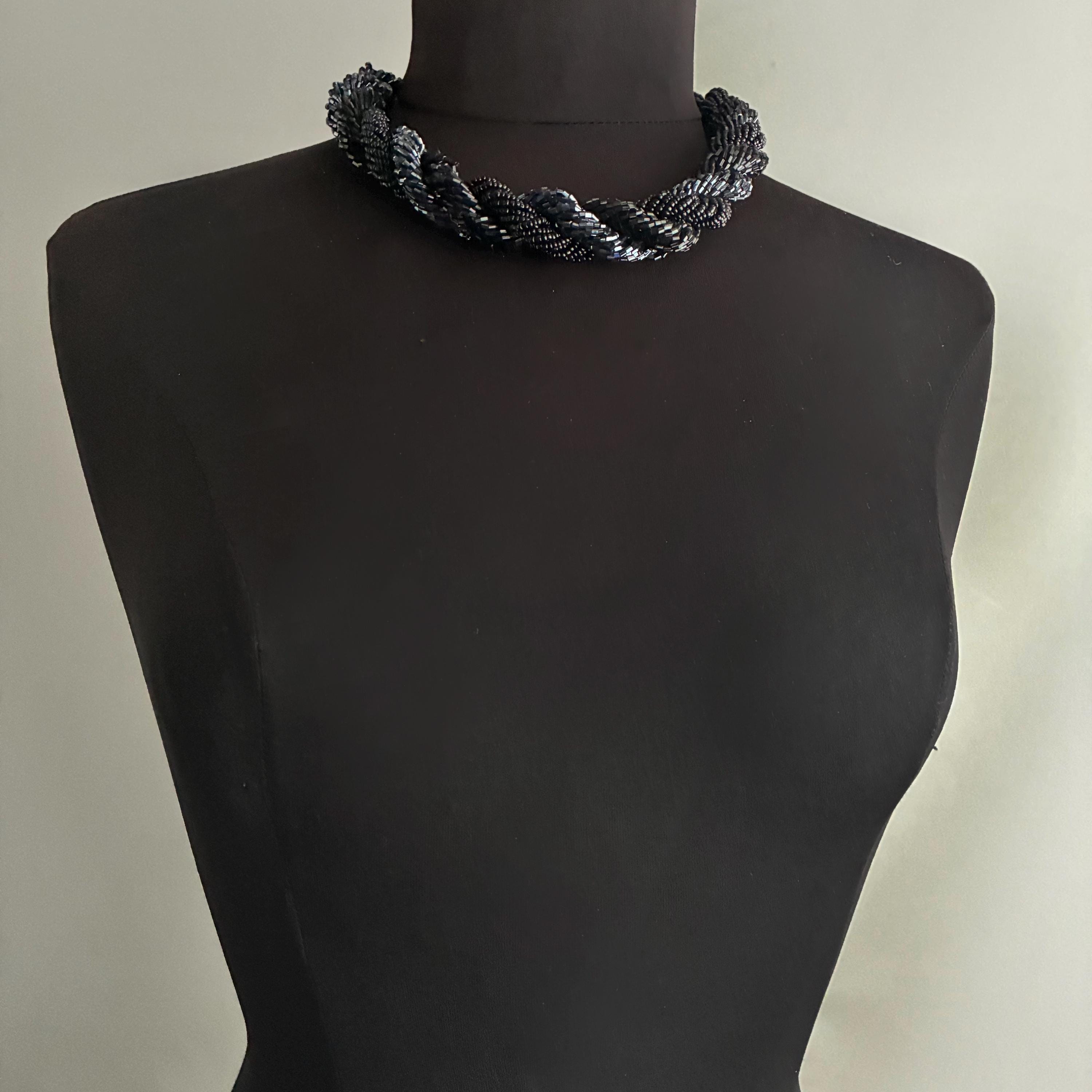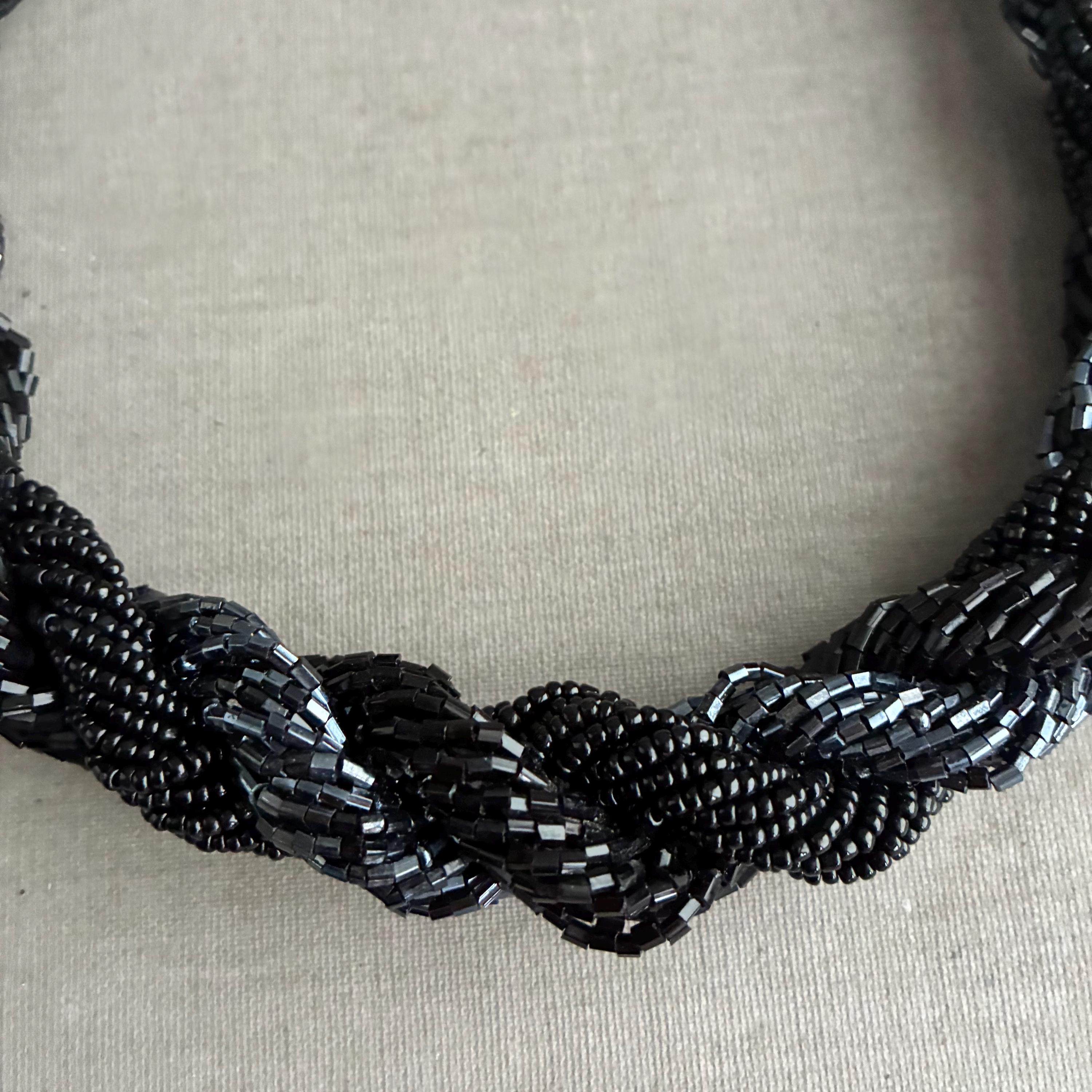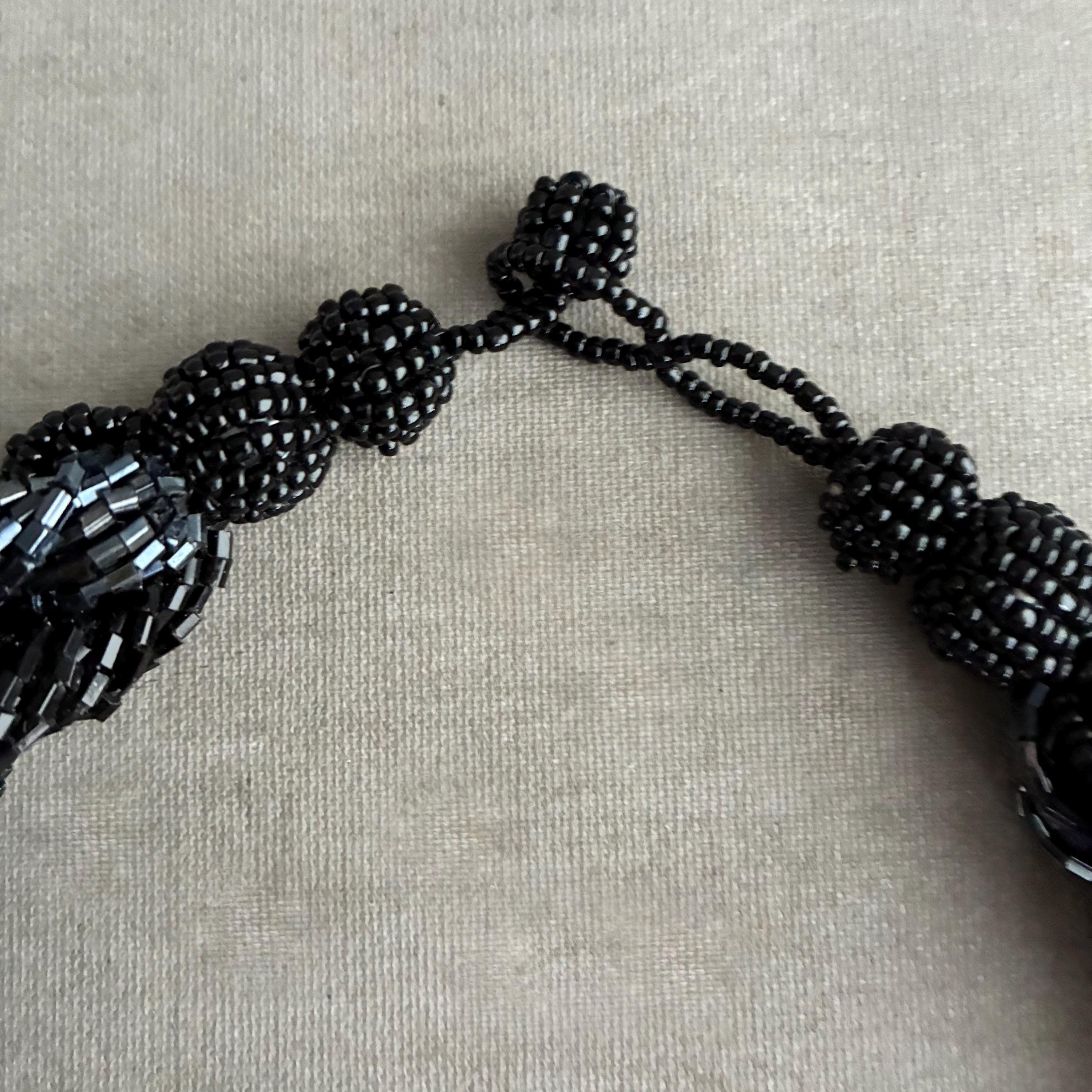 A stunning vintage 1980s black and silver glass bead Statement Choker Necklace with Loop Fastener. This necklace is quite heavy with the amount of beads used. Approximately 16”. In exellent condition