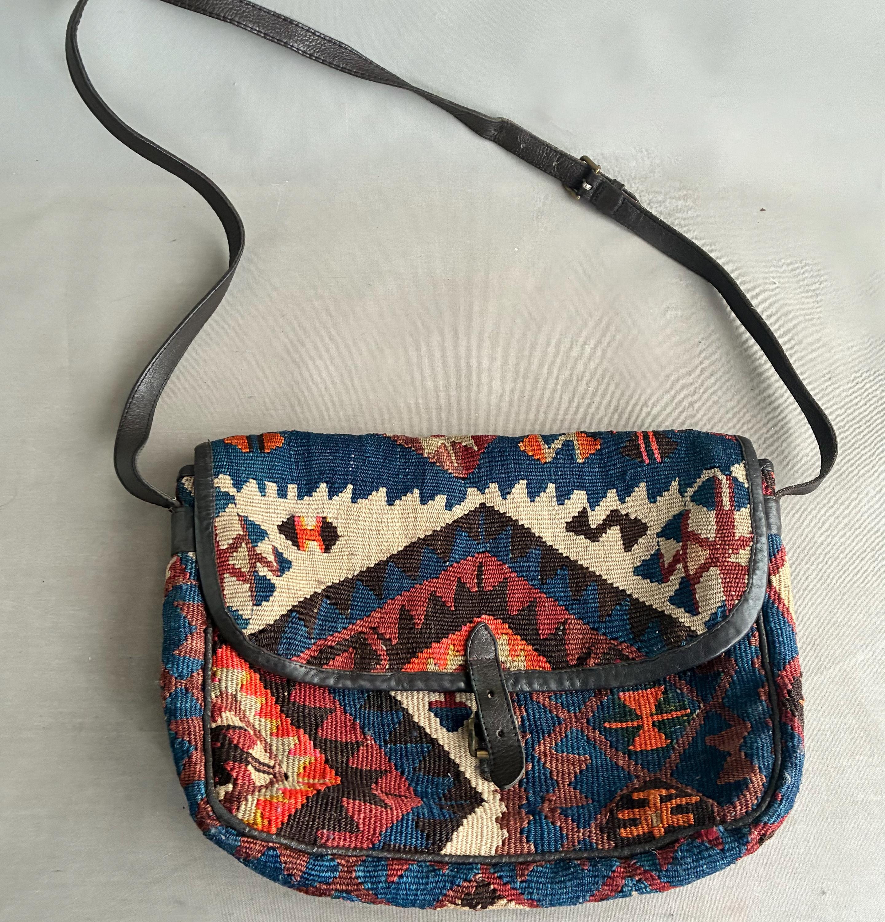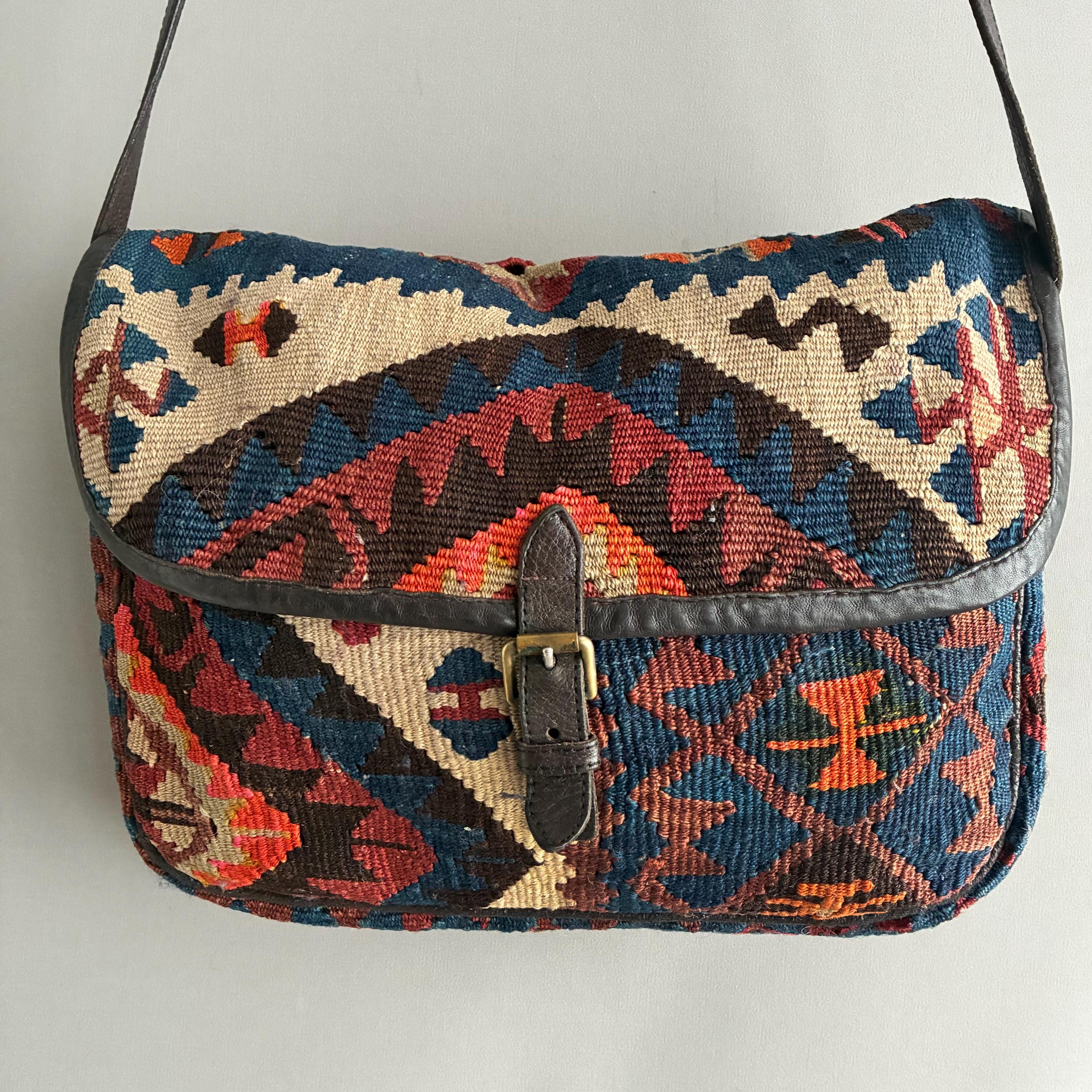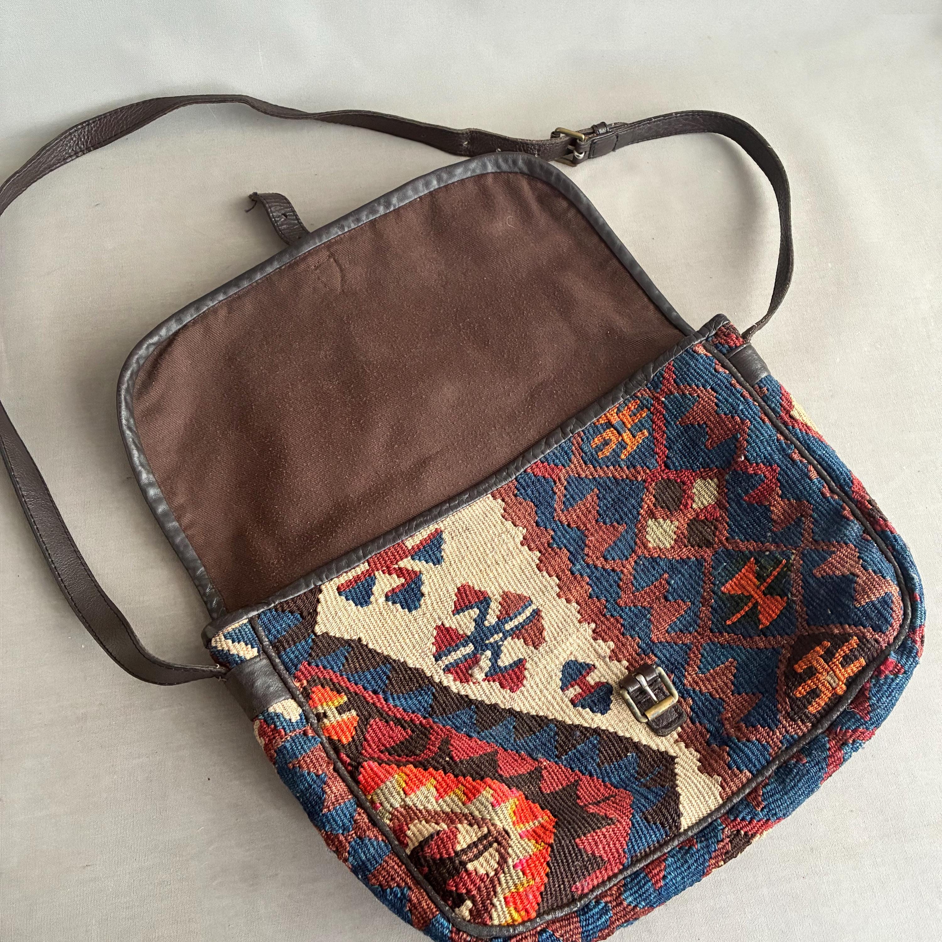 Design: Features intricate, colorful geometric patterns that vary by piece, making this bag unique. lovely muted colours include shades of red, orange, blue, and cream. Handcrafted in small workshops, often in regions like Turkey. Fully lined inside with a thick chocolate brown cotton with one patch pocket. In exellent vintage condition, the leather is nice and soft - worn over time