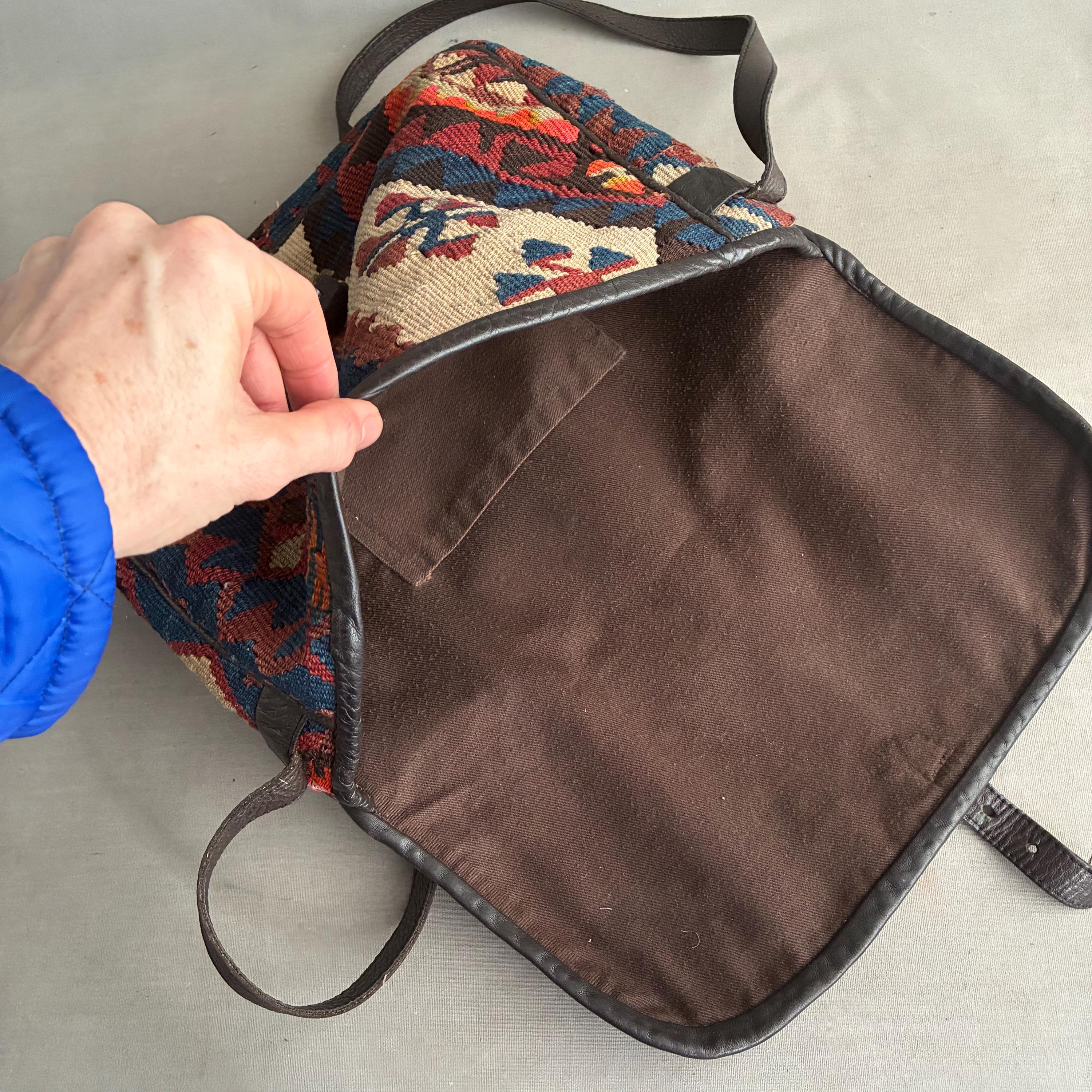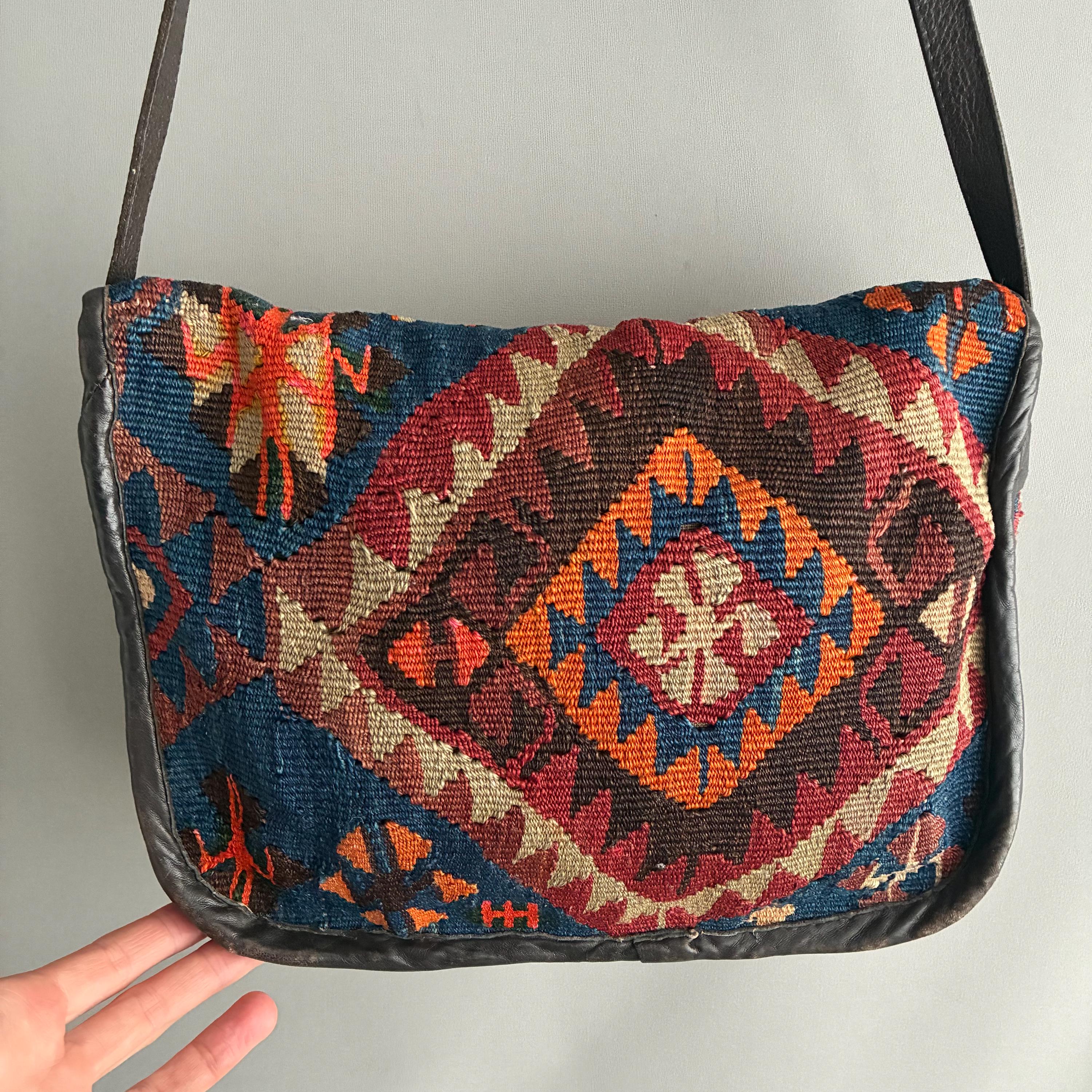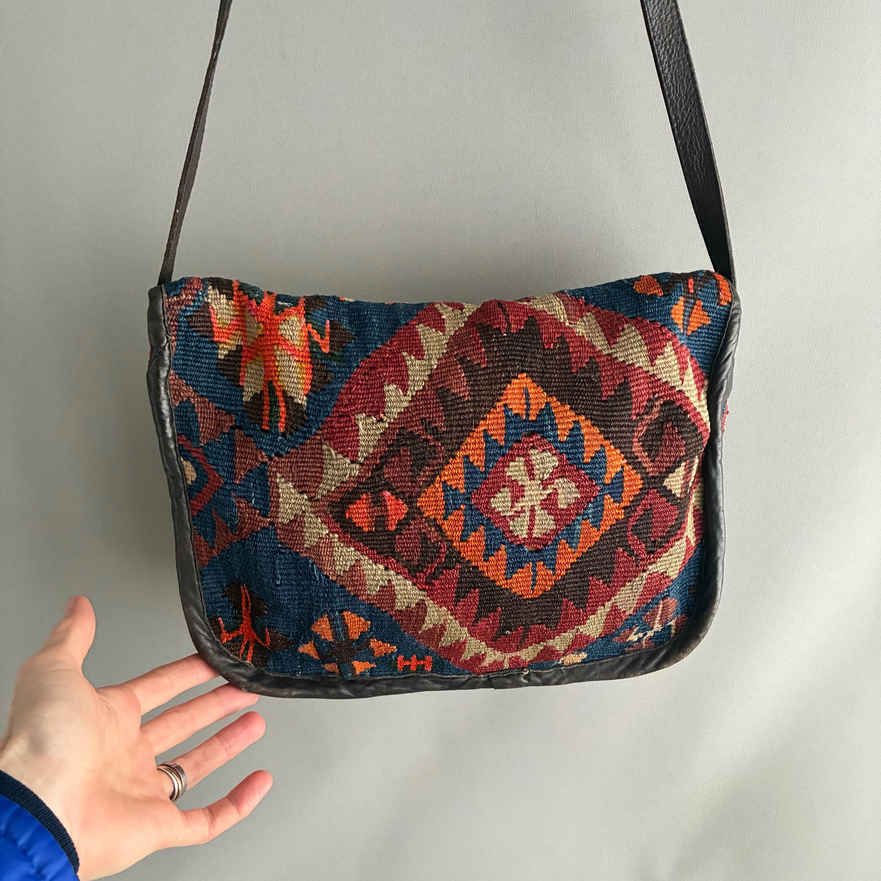 Design: Features intricate, colorful geometric patterns that vary by piece, making this bag unique. lovely muted colours include shades of red, orange, blue, and cream. Handcrafted in small workshops, often in regions like Turkey. Fully lined inside with a thick chocolate brown cotton with one patch pocket. In exellent vintage condition, the leather is nice and soft - worn over time