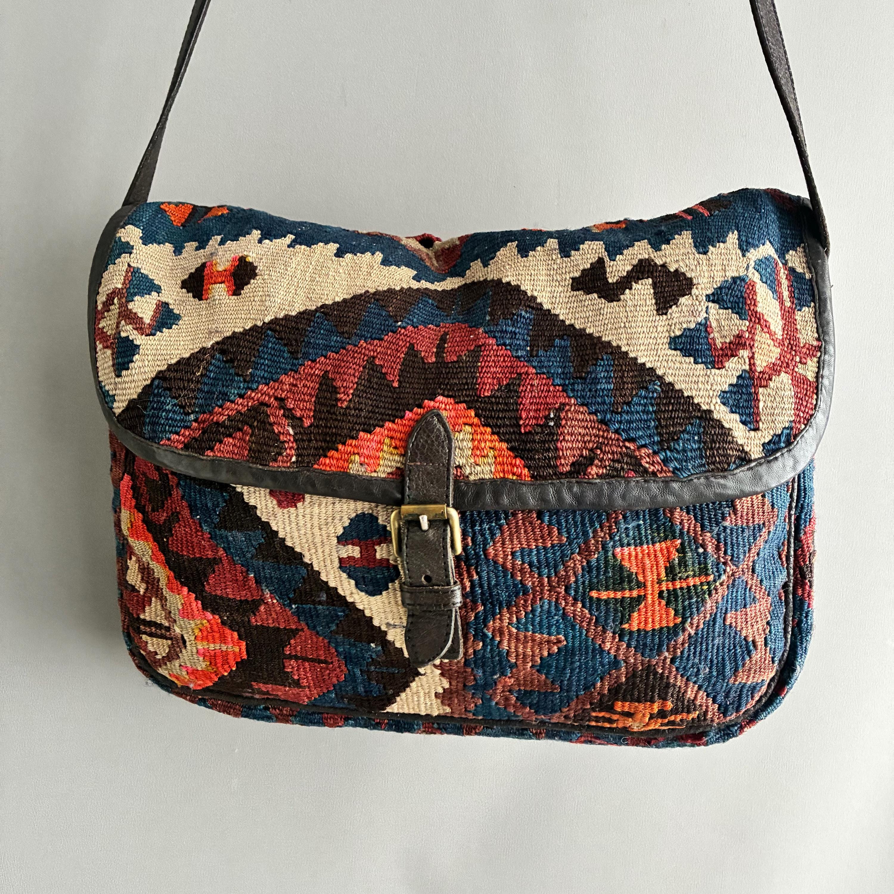 A stylish Kilim crossbody messenger bag, handcrafted using traditional woven Turkish rug textile. this bag is made from vintage wool kilims (100% hand-woven wool vintage rugs )and trimmed with genuine leather and adjustable straps and brass buckle closure